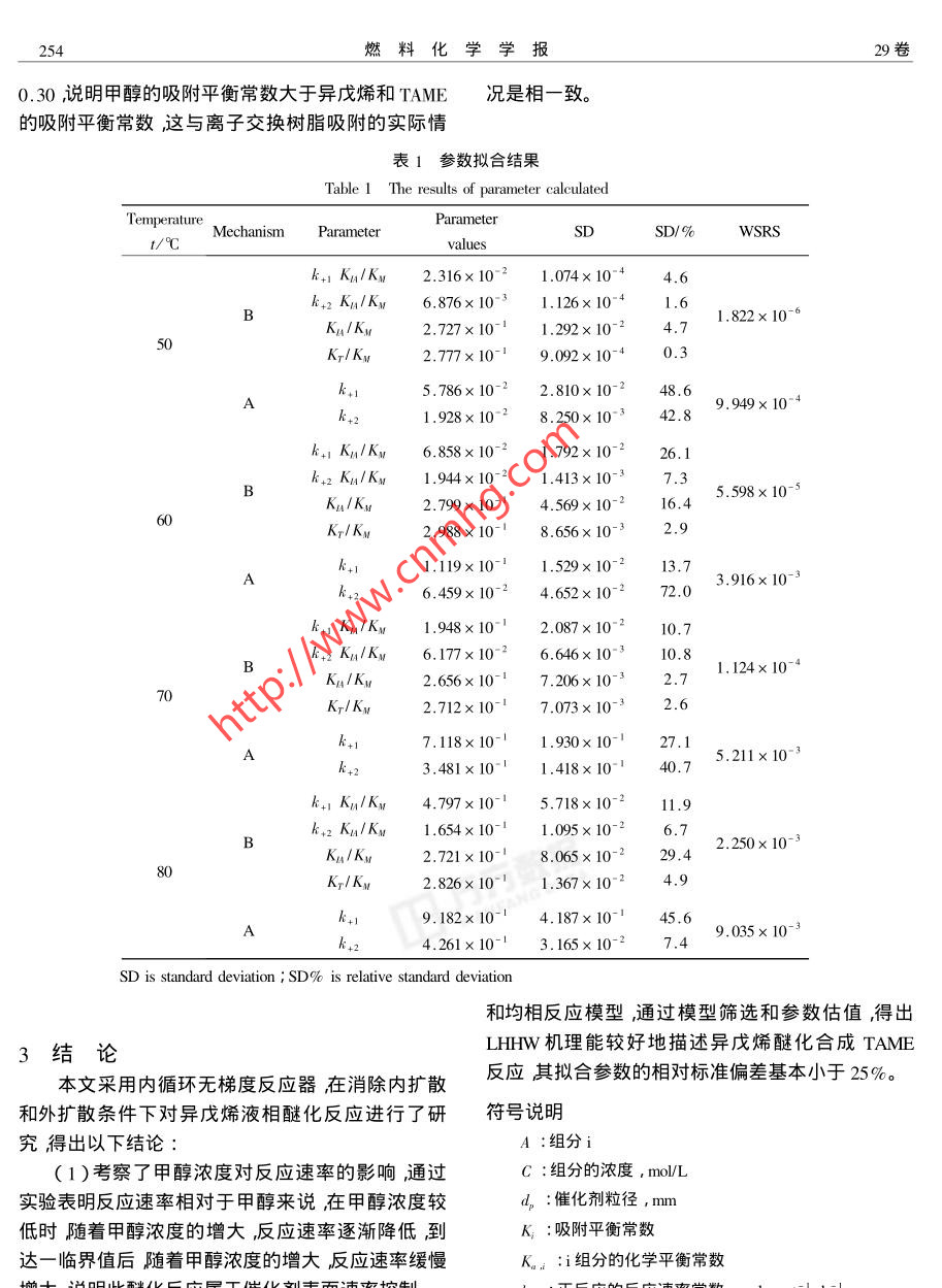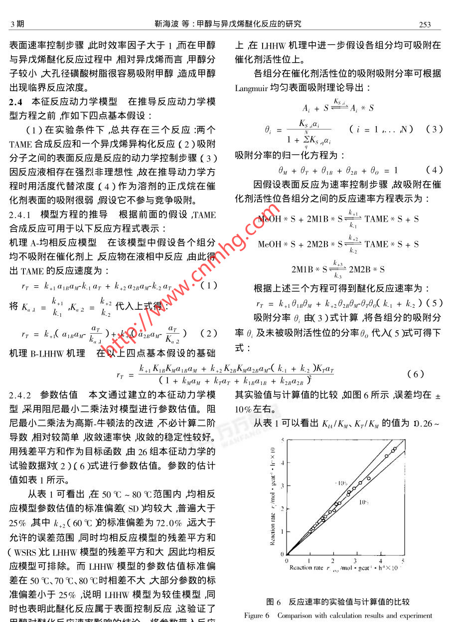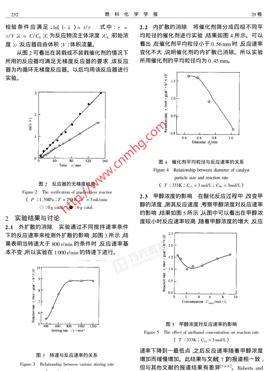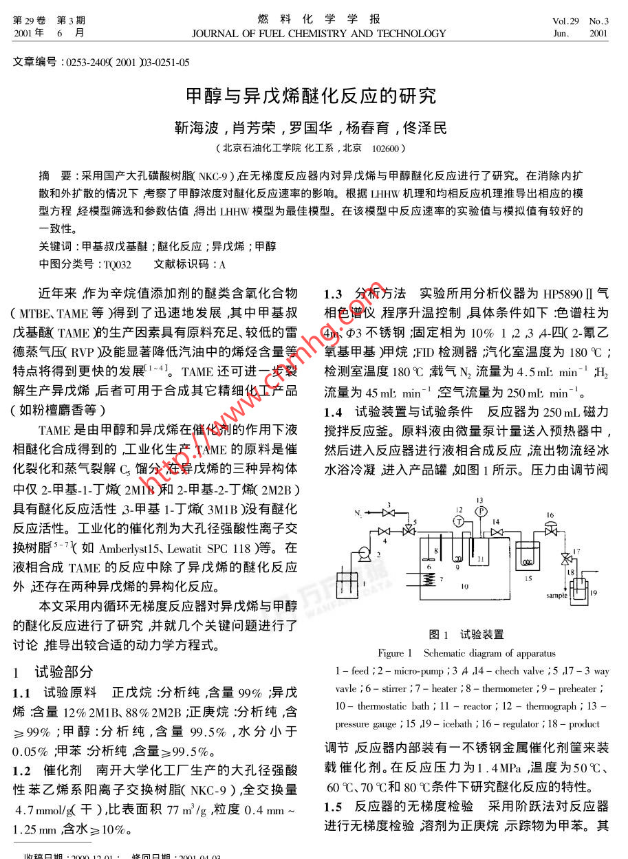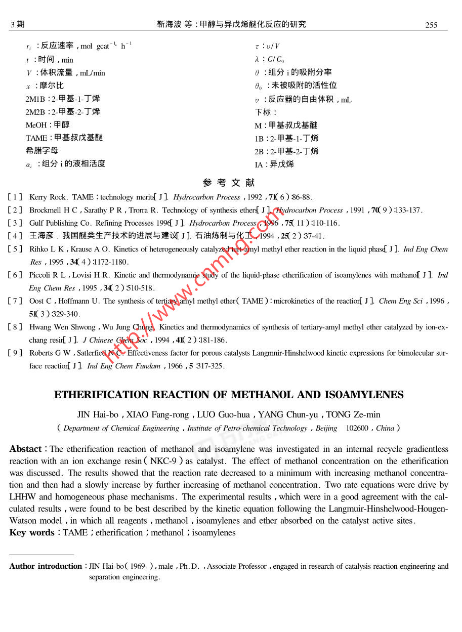 .第29卷 第3期燃料化學學報Vol.29 No.32001年6月JOURNAL OF FUEL CHEMISTRY AND TBCHNOLOGYJun. 2001文章編號:0253-2409( 2001 )03-0251-05甲醇與異戊烯醚化反應的研究靳海波,肖芳榮,羅國華,楊春育,佟澤民(北京石油化工學院化工系,北京102600)摘要:采用國產(chǎn)大孔磺酸樹脂(NKC-9)在無梯度反應器內(nèi)對異戊烯與甲醇醚化反應進行了研究。在消除內(nèi)擴散和外擴散的情況下考察了甲醇濃度對醚化反應速率的影響。根據(jù)LHHW機理和均相反應機理推導出相應的模型方程經(jīng)模型篩選和參數(shù)估值得出LHHW模型為最佳模型。在該模型中反應速率的實驗值與模擬值有較好的一致性。關鍵詞:甲基叔戊基醚;醚化反應;異戊烯;甲醇中圖分類號:TQ032文獻標識碼:A近年來,作為辛烷值添加劑的醚類含氧化合物1.3 分析方法實驗所用分析儀器為HP5890I1氣(MTBE、TAME等)得到了迅速地發(fā)展,其中甲基叔相色譜儀程序升溫控制具體條件如下:色譜柱為戊基醚TAME的生產(chǎn)因素具有原料充足、較低的雷4m、3不銹鋼;固定相為10% 1 23 A-四( 2-氰乙德蒸氣壓( RVP )及能顯著降低汽油中的烯烴含量等氧基甲基)用烷;FID 檢測器汽化室溫度為180°C ;特點將得到更快的發(fā)展1~4]。TAME還可進一步裂檢測室溫度180C載氣N2流量為4.5mL min~' ;H2解生產(chǎn)異戊烯后者可用于合成其它精細化工產(chǎn)品流量為45ml:min~1空氣流量為250mLmin~。(如粉檀麝香等)1.4 試驗裝置與試驗條件 反應器為250 mL磁力TAME是由甲醇和異戊烯在催化劑的作用下液攪拌反應釜。原料液由微量泵計量送入預熱器中,相醚化合成得到的,工業(yè)化生產(chǎn)TAME的原料是催然后進入反應器進行液相合成反應流出物流經(jīng)冰化裂化和蒸氣裂解Cs餾分在異戊烯的三種異構體水浴冷凝進入產(chǎn)品罐如圖1所示。壓力由調節(jié)閥中僅2-甲基-1.J烯( 2M1B )和2-甲基-2-丁烯( 2M2B )!具有醚化反應活性,3-甲基1-丁烯( 3M1B )沒有醚化N←X--反應活性。工業(yè)化的催化劑為大孔徑強酸性離子交14.雖換樹脂5-7<如Amberlystl5、 Lewatit SPC 118)等。在液相合成TAME的反應中除了異戊烯的醚化反應1948外還存在兩種異戊烯的異構化反應。曲sample本文采用內(nèi)循環(huán)無梯度反應器對異戊烯與甲醇的醚化反應進行了研究,并就幾個關鍵問題進行了圖1試驗裝置討論推導出較合適的動力學方程式。Figure 1 Schematic diagram of apparatus1試驗部分1- feed ;2- micro-pump;3 A ,14- chech valve ;5 ,17-3 way1.1試驗原料正戊烷:分析純,含量99% ;異戊vavle ;6- stirer ; 7- heater ;8 - thermometer ;9 - preheater ;烯:含量12% 2M1B、88%2M2B ;正庚烷:分析純,含10 - thermostatic bath; 11 - reactor ; 12 - thermograph ; 13 -pressure gauge ; 15 ,19 - icebath ; 16 - regulator ; 18 - product≥99% ;甲醇:分析純,含量99.5% ,水分小于0.05% ;甲苯分析純含量≥99.5%。調節(jié)反應器內(nèi)部裝有一不銹鋼金屬催化劑筐來裝1.2 催化劑南開大學化工廠生產(chǎn)的大孔徑強酸載催化劑。在反應壓力為1.4MPa ,溫度為50 C、性苯乙烯系陽離子交換樹脂( NKC-9),全交換量60 C、70 C和80 C條件下研究醚化反應的特性。4.7mmol!g(干),比表面積77m2/g ,粒度0.4 mm ~1.5 反應器的無梯度檢驗采用階躍法對反應器1.25 mm ,含水≥10%。.進行無梯度檢驗溶劑為正庚烷示蹤物為甲苯。其收稿日期:2000-12-01 ;修回日期 :2001-04-03作者簡介乃酶數(shù)榍_ )男吉林安圖人副教授工學博土從事反應工程與分離工程等方面的研究。252燃料化學學報29卷檢驗條件應滿足:In(1-λ)=t/τ式中:τ =2.2內(nèi)擴 散的消除將催化劑篩分成四組不同平u/V;=C/Co;C為反應物流主體濃度;C。初始濃均粒徑的催化劑進行實驗結果如圖4所示??梢远?o :反應器自由體積;V :體積流量??闯鲈诖呋瘎┢骄叫∮?.56 mm時反應速率從圖2可看出在裝載或不裝載催化劑的情況下變化不大,說明催化劑的內(nèi)擴散已消除。所以實驗所用的反應器均滿足無梯度反應器的要求,該反應所用催化劑的平均粒徑均為0.45 mm。器為內(nèi)循環(huán)無梯度反應器。以后均用該反應器進行實驗。1.0-0\臺090.8L⊥_0Dianeter d/mm40 80120160圖4催化劑平 均粒徑與反應速率的關系.Time 1/ minFigure 4 Relationship between diameter of catalystparticle size and reaction rate圖2反應器的無梯度檢驗( T :333K; C2 = 3 mol/L; Cxe = 3mol/L)Figure 2 The verification of gradientless reactior2.3甲醇濃度的影響 在醚化反應過程中 改變甲( P :1.5MPa;T =293K;F = 3mL/min醇的濃度測其反應速度考察甲醇濃度對反應速率O :0g catal. ;●:6g catal.的影響結果如圖5所示,從圖中可以看出在甲醇濃2實驗結果與討論度較小時反應速率較高隨著甲醇濃度的增大反應2.1外擴散的消除實驗通過不同攪拌速率條件下的反應速率來檢測外擴散的影響如圖3所示結果表明當轉速大于800 r/min的條件時反應速率基E 2.0本不變所以實驗在1000r/min的轉速下進行。.: 9葉80.0Concenteation Cw ,/mol ●L5400 600 800 1000 1200圖5甲醇濃度對反應速率的影響Strring rate iI . min'Figure 5 The efect of methanol concentration on reaction rate. ( T:333K; C2s = 3 mol/L)速率下降到一最低點,之后反應速率隨著甲醇濃度圖3轉速與反應速率的關系增加而緩慢增加。此結果與文獻7的報道相一致,Figure 3 Relationship between various stiring rate但與其他文獻的報道結果有差異568]。Roberts andand reaction ratec,=3 mo/L ; Cx = 3mo/L)Satterfiedf9 ]指出在球型催化劑進行氣相反應時屬于3期.靳海波等:甲醇與異戊烯醚化反應的研究表面速率控制步驟此時效率因子大于1