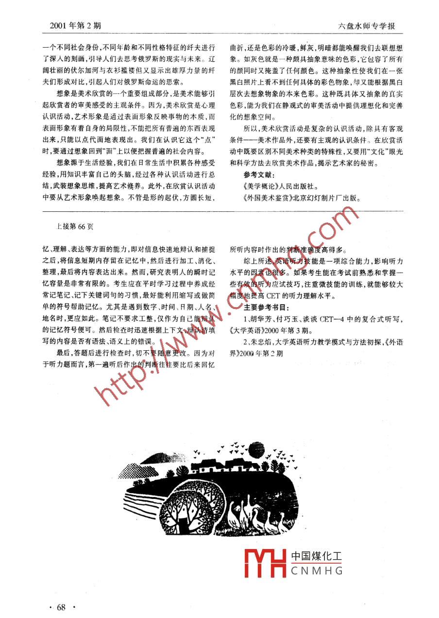 第13卷第2期六盤水師專學(xué)報(bào)Vol. 13NO.2200年6月Joumal of Liupanshui Teachers CollegeJune2001美術(shù)欣賞分析楊再偉.(六盤水師范高等專科學(xué)校藝術(shù)教研室貴州水 城553004)摘要美術(shù)欣賞與美術(shù)創(chuàng)作是兩個(gè)相反的認(rèn)識(shí)過程,相間的版畫的韻律,但不可能感知到油畫色彩的韻律,這作為欣賞者該如何去面對(duì)美術(shù)作品如何去判斷作者本來就是畫種的特殊性對(duì)欣賞者要求的特殊性。的創(chuàng)作思想。繪畫作品的欣賞首先是視覺的認(rèn)識(shí)對(duì)象過程,能夠使:關(guān)鍵詞欣賞者美術(shù)作品意識(shí)現(xiàn)實(shí)。人分辨出具體的空間特征和空間關(guān)系,如形狀,大小,方我們創(chuàng)造美的目的是為了滿足欣賞。如何去欣賞美、向,幅度,運(yùn)動(dòng),整體與部分的關(guān)系,在對(duì)作品特征及其空如何用藝術(shù)眼光去欣賞作品,這是一門學(xué)問。那么什么叫間屬性的分析和綜合的基礎(chǔ)所形成的視覺印象,不僅比較藝術(shù)欣賞呢?它是欣賞者用自己已有的體驗(yàn)和想象透過充分地反映著作品的客觀現(xiàn)象,而且還作為一種必不可少藝術(shù)作品對(duì)現(xiàn)實(shí)的間接認(rèn)識(shí),是由點(diǎn)到面的認(rèn)識(shí)活動(dòng)。作的因素來參與作品中藝術(shù)形象的感受和欣賞。為欣賞者來說,除了應(yīng)具備一定美術(shù)作品相相應(yīng)的審美能我們?cè)谛蕾p各種美術(shù)作品時(shí),不僅是用視覺去感受藝力外,同時(shí)還應(yīng)具有一定程度上感受和理解作品意義和能術(shù)形象固有的范圍,而是一切感覺都和思維相聯(lián)系。因力。如果我們沒有辨別音律和節(jié)奏的耳朵,那么最好的音此,色彩并不只引起對(duì)色彩的感受。人們可以在色彩構(gòu)成樂對(duì)我們而言也毫無意義。如果我們是色盲或盲人,那么的經(jīng)驗(yàn)和繪畫形象上感受到陽光的溫暖,雨水的潤濕,嚴(yán)最美妙的繪畫色彩和優(yōu)美的造型我們也無法感受到“幸冬的寒冷,鮮花的芳香,綠色的生機(jī)等等。所以在美術(shù)欣?!?。馬克思說:“如果你想得到藝術(shù)的享樂,你本身就必賞過程中,藝術(shù)形象必須通過欣賞者的想象活動(dòng)才能掌握須是一個(gè)有藝術(shù)修養(yǎng)的人”。也正如一-個(gè)人想對(duì)一部小說藝術(shù)形象的間接性,使有限的藝術(shù)形象在欣賞者面前展開作品有深人的理解,就必須具備- -定的文字基礎(chǔ)和獨(dú)立思由感覺的有限性通向形象的廣闊性的道路,達(dá)到揭示作品考能力。的真實(shí)的目的。審美能力的培養(yǎng),有助于藝術(shù)欣賞能力的提高。審美美術(shù)作品越是“藝術(shù)化" ,我們就得越用藝術(shù)眼光來欣能力只有在具體的審美活動(dòng)中才能得到培養(yǎng)和發(fā)展。人賞作品。美術(shù)家創(chuàng)作的作品是對(duì)生活的認(rèn)識(shí),并不是以抽們對(duì)某-種類藝術(shù)作品的高水平欣賞力是由各種不同的象概念出現(xiàn),而是體現(xiàn)在藝術(shù)形象之中的。因此,欣賞者審美能力所積極參與的結(jié)果。對(duì)繪面的高度欣賞力要依的認(rèn)識(shí)活動(dòng)直接受藝術(shù)形象的特殊性制約。藝術(shù)形象喚賴于其他各種不同藝術(shù)種類的欣賞力,如它的形的節(jié)奏起欣賞者相應(yīng)的感覺經(jīng)驗(yàn),情緒、記憶和形象記憶,并規(guī)定感,色彩的節(jié)奏感與音樂的旋律是相通的。這種能力只有欣賞者的感覺、想象、體驗(yàn)、理解等認(rèn)識(shí)活動(dòng)的基本趨向和在多種欣賞活動(dòng)中才能逐漸發(fā)展起來。經(jīng)驗(yàn)主義者休漠范園,進(jìn)而向欣賞者展示出藝術(shù)形象所包含的藝術(shù)家思想曾經(jīng)說過:“雖然人與人之間敏感程度可以差異很大,要想情感。我們?cè)谛蕾p過程中要充分發(fā)揮主觀能動(dòng)性,通過感提高或改善這方面的能力的最好辦法無過于在一門特定受想象,體驗(yàn)、理解對(duì)美術(shù)的形和色進(jìn)行盡可能深刻的認(rèn)的藝術(shù)領(lǐng)域里不斷訓(xùn)練,不斷觀察和鑒別一種特定類型的只。美。”可見,各類型的藝術(shù)欣賞能夠訓(xùn)練、培養(yǎng)、提高各種不在人們實(shí)際生活里,沒有體驗(yàn)不能進(jìn)人別人的心境,盡相同的審美能力。不能發(fā)現(xiàn)別人內(nèi)心的秘密。同樣在欣賞認(rèn)識(shí)活動(dòng)中,體驗(yàn)在藝術(shù)領(lǐng)城中,類別繁多,不同種類藝術(shù)有其不同的有極重要的作用。欣賞者的體驗(yàn)應(yīng)以自己的形象記憶和欣賞的特殊性:造型藝術(shù)通過視覺感知,音響藝術(shù)通過聽情緒記憶為主觀條件,體驗(yàn)到他自己根本沒有經(jīng)歷過的反覺感知,語言藝術(shù)通過想象感知。在每一種類中仍然存在映在中國煤化士物的生活、思想、情著各種具體形式,甚至還有更小的范圍,也還有具體形式感,從三出這樣或那樣的理差別。如繪畫中包含著油畫國畫、版畫等等,國畫又分為解和判YHcNMHG河的纖夫》中的形人物、花鳥、山水,工筆,寫意等。我們要根據(jù)不同類別的象,讓我們體驗(yàn)到炎熱的夏天,纖夫們?cè)跐L燙的沙灘上一特殊性進(jìn)行區(qū)別對(duì)待。對(duì)于色盲來說,他可以感知到黑白步一步受盡折磨地難難前進(jìn)。作者通過對(duì)伏爾加河上十672001年第2期六盤水師