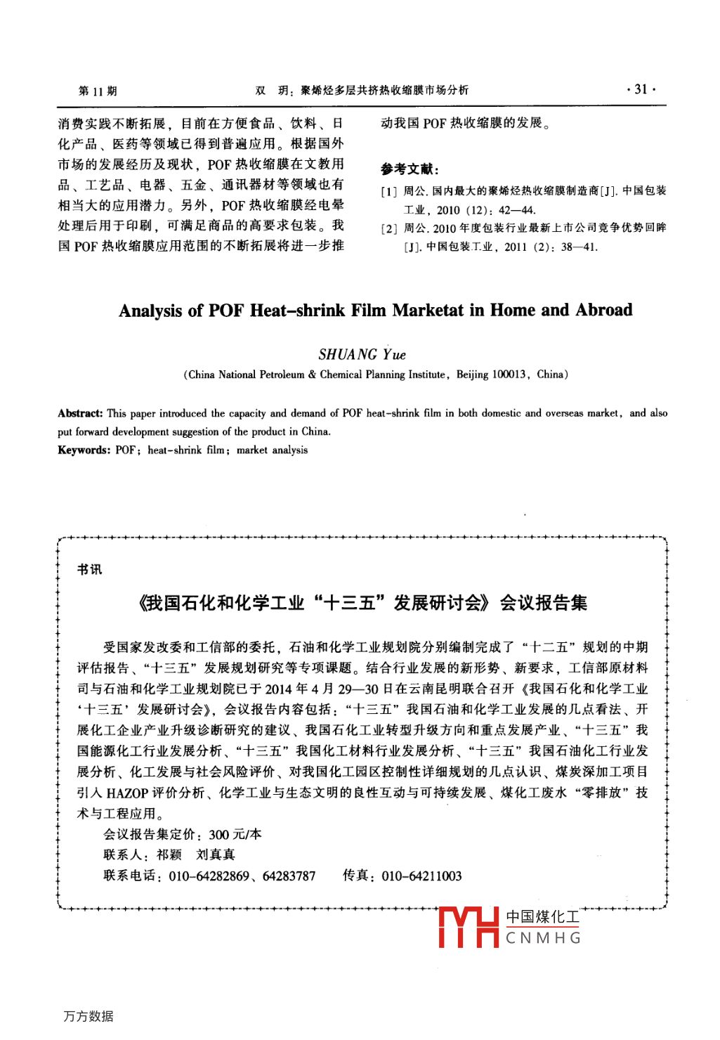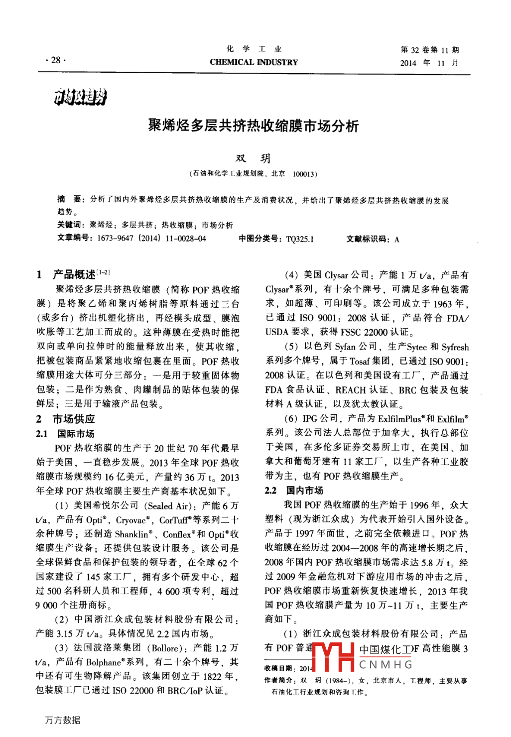 化學(xué)工業(yè)第32卷第11期28CHEMICAL INDUSTRY014年11月聚烯烴多層共擠熱收縮膜市場分析雙玥(石油和化學(xué)工業(yè)規(guī)劃院,北京10003)摘要:分析了國內(nèi)外聚烯烴多層共擠熱收縮膜的生產(chǎn)及消費(fèi)狀況,并給出了聚烯烴多層共擠熱收縮膜的發(fā)展趨勢關(guān)鍵詞:聚烯烴;多層共擠;熱收縮膜;市場分析文章編號:1673-9647(2014)11-0028-04中圖分類號:TQ3251文獻(xiàn)標(biāo)識碼:A1產(chǎn)品概述1-21(4)美國 Clysar公司:產(chǎn)能1萬t/a,產(chǎn)品有聚烯烴多層共擠熱收縮膜(簡稱POF熱收縮Cysa°系列,有十余個牌號,可滿足多種包裝需膜)是將聚乙烯和聚丙烯樹脂等原料通過三臺求,如超薄、可印刷等。該公司成立于1963年(或多臺)擠出機(jī)塑化擠出,再經(jīng)模頭成型、膜泡已通過ISO90:2008認(rèn)證,產(chǎn)品符合FDA/′吹脹等工藝加工而成的。這種薄膜在受熱時能把USDA要求,獲得FSSC22000認(rèn)證。雙向或單向拉伸時的能量釋放出來,使其收縮(5)以色列Syan公司,生產(chǎn) Stec和 Syfresh把被包裝商品緊緊地收縮包裹在里面。POF熱收系列多個牌號,屬于 Toaf集團(tuán),已通過Iso901:縮膜用途大體可分三部分:一是用于較重固體物2008認(rèn)證。在以色列和美國設(shè)有工廠,產(chǎn)品通過包裝;二是作為熟食、肉罐制品的貼體包裝的保FDA食品認(rèn)證、 REACH認(rèn)證、BRC包裝及包裝鮮層;三是用于輸液產(chǎn)品包裝。材料A級認(rèn)證,以及猶太教認(rèn)證。2市場供應(yīng)(6)IPG公司,產(chǎn)品為 ExlfilmPlus'和 Exlfilm2.1國際市場系列。該公司法人總部位于加拿大,執(zhí)行總部位POF熱收縮膜的生產(chǎn)于20世紀(jì)70年代最早于美國,在多倫多證券交易所上市,在美國、加始于美國,一直穩(wěn)步發(fā)展。2013年全球POF熱收拿大和葡萄牙建有11家工廠,以生產(chǎn)各種工業(yè)膠縮膜市場規(guī)模約16億美元,產(chǎn)量約36萬t。2013帶為主,也有POF熱收縮膜生產(chǎn)。年全球POF熱收縮膜主要生產(chǎn)商基本狀況如下。22國內(nèi)市場(1)美國希悅爾公司( Sealed Air):產(chǎn)能6萬我國POF熱收縮膜的生產(chǎn)始于1996年,眾大a,產(chǎn)品有Opt°, Cryovac°,Coru等系列二十塑料(現(xiàn)為浙江眾成)為代表開始引入國外設(shè)備。余種牌號;還制造 Shanklin、Cone·和Opu·收產(chǎn)品于1997年面世,之前完全依賴進(jìn)口。POF熱縮膜生產(chǎn)設(shè)備;還提供包裝設(shè)計服務(wù)。該公司是收縮膜在經(jīng)歷過2004-2008年的高速增長期之后全球保鮮食品和保護(hù)包裝的領(lǐng)導(dǎo)者,在全球62個2008年國內(nèi)POF熱收縮膜市場需求達(dá)58萬t。經(jīng)國家建設(shè)了145家工廠,擁有多個研發(fā)中心,超過2009年金融危機(jī)對下游應(yīng)用市場的沖擊之后過500名科研人員和工程師,4600項專利,超過POF熱收縮膜市場重新恢復(fù)快速增長,2013年我9000個注冊商標(biāo)。國POF熱收縮膜產(chǎn)量為10萬~11萬t,主要生產(chǎn)(2)中國浙江眾成包裝材料股份有限公司商如下。產(chǎn)能3.15萬ta。具體情況見22國內(nèi)市場。(1)浙江眾成包裝材料股份有限公司:產(chǎn)品(3)法國波洛菜集團(tuán)( Bollore):產(chǎn)能12萬有PoF普通VT凵中國煤化工F高性能膜3a,產(chǎn)品有 Bolphane·系列,有二十余個牌號,其收稿日期:201CNMHG中還有可生物降解產(chǎn)品。該集團(tuán)創(chuàng)立于1822年作者簡介:雙玥(1984-),女,北京市人,工程師,主要從事包裝膜工廠已通過IO22000和BRC/oP認(rèn)證石油化工行業(yè)規(guī)劃和咨詢T作第11期雙玥:聚烯烴多層共擠熱收縮膜市場分析大類8個系列,并提供包裝設(shè)計服務(wù)。該公司成立此熱收縮包裝制品與國民經(jīng)濟(jì)總體發(fā)展水平關(guān)聯(lián)度于2001年,已通過S09001:2008和ISO14001較高。隨著全球經(jīng)濟(jì)、社會的高速發(fā)展,PVC熱2004認(rèn)證,共21條生產(chǎn)線,產(chǎn)品擁有SGS檢測收縮膜逐步被替代,全球POF熱收縮膜行業(yè)將保報告。持穩(wěn)定發(fā)展的態(tài)勢。預(yù)計全球POF熱收縮膜市場(2)聚銀塑料包裝制品(深圳)有限公司(2013—2020年)年均增長率為5%~10%,2015年產(chǎn)品有聚銀POF普通型、軟性低溫型、熱滑型全球市場規(guī)模達(dá)18億美元,產(chǎn)量達(dá)40萬t;預(yù)計超薄POF收縮膜。該公司成立于1993年,總部2020年市場規(guī)模達(dá)24億美元,產(chǎn)量達(dá)55萬t設(shè)在香港,是中國最早生產(chǎn)POF五層共擠雙向拉32國內(nèi)市場伸熱收縮膜的企業(yè)之POF熱收縮膜在我國近10年才逐漸大規(guī)模生(3)義烏市望江塑料廠:產(chǎn)品有W系列熱收產(chǎn),競爭未達(dá)到其他類型熱收縮膜市場的激烈程度??s膜、薄膜、交聯(lián)膜產(chǎn)品。該廠成立于1988年,2013年我國POF熱收縮膜產(chǎn)量約10萬~1l萬t,生產(chǎn)PvC、POF熱收縮膜、POF交聯(lián)膜。擁有20出口量約2萬~3萬t,進(jìn)口量約1萬-2萬t,消費(fèi)條PvC熱收縮膜生產(chǎn)線,9條POF-5層共擠熱收量8萬~9萬t,市場規(guī)模約16億元??s膜生產(chǎn)線,已通過Iso9001:2000認(rèn)證。我國POF熱收縮膜主要用于食品行業(yè)、醫(yī)藥(4)微山縣恒瑞包裝材料有限公司:生產(chǎn)行業(yè)和日化行業(yè)等。PVC、POF、PE熱收縮薄膜/拉伸纏繞膜,產(chǎn)能共3.2.1食品行業(yè)計1600U/a。食品工業(yè)是POF熱收縮膜包裝最大的應(yīng)用市(5)浙江紹興富陵控股集團(tuán):生產(chǎn)POF高、場,主要用于熱加工烘烤類食品、冷鮮肉、冷凍