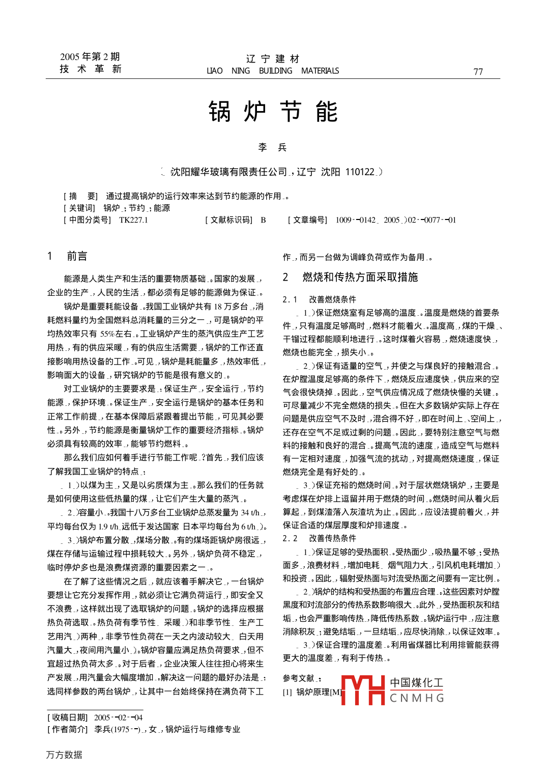 205年第2期遼寧建材技術(shù)革新LTAO NING BUILDING MATERTALS鍋爐節(jié)能李兵沈陽耀華玻璃有限責(zé)任公司,遼寧沈陽110122)摘要]通過提高鍋爐的運(yùn)行效率來達(dá)到節(jié)約能源的作用.。關(guān)鍵詞]鍋爐;節(jié)約;能源[中圖分類號]TK227.1[文獻(xiàn)標(biāo)識碼]B[文章編號]1009-01422005)02-0077-011前言作,而另一臺做為調(diào)峰負(fù)荷或作為備用能源是人類生產(chǎn)和生活的重要物質(zhì)基礎(chǔ)。國家的發(fā)展,2燃燒和傳熱方面采取措施企業(yè)的生產(chǎn),人民的生活,都必須有足夠的能源做為保證鍋爐是重要耗能設(shè)備。我國工業(yè)鍋爐共有18萬多臺,消改善燃燒條件1)保證燃燒室有足夠高的溫度」。溫度是燃燒的首要條耗燃料量約為全國燃料總消耗量的三分之一,可是鍋爐的平件,只有溫度足夠高時,燃料才能著火。溫度高,煤的干燥均熱效率只有55%左右.。工業(yè)鍋爐產(chǎn)生的蒸汽供應(yīng)生產(chǎn)工藝干鎦過程都能順利地進(jìn)行。這時煤著火容易_,燃燒速度快用熱,有的供應(yīng)采暖,有的供應(yīng)生活需要,鍋爐的工作還直燃燒也能完全,損失小接影響用熱設(shè)備的工作可見,鍋爐是耗能量多,熱效率低2_)保證有適量的空氣,并使之與煤良好的接觸混合。影響面大的設(shè)備,研究鍋爐的節(jié)能是很有意義的。在爐膛溫度足夠高的條件下,燃燒反應(yīng)速度快,供應(yīng)來的空對工業(yè)鍋爐的主要要求是:保證生產(chǎn),安全運(yùn)行,節(jié)約氣會很快燒掉。因此,空氣供應(yīng)情況成了燃燒快慢的關(guān)鍵。能源,保護(hù)環(huán)境。保證生產(chǎn),安全運(yùn)行是鍋爐的基本任務(wù)和可盡量減少不完全燃燒的損失.。但在大多數(shù)鍋爐實(shí)際上存在正常工作前提,在基本保障后緊跟著提出節(jié)能可見其必要問題是供應(yīng)空氣不及時,混合得不好,即在時間上、空間上性。另外,節(jié)約能源是衡量鍋爐工作的重要經(jīng)濟(jì)指標(biāo)。鍋爐還存在空氣不足或過剩的問題。因此,要特別注意空氣與燃必須具有較高的效率,能夠節(jié)約燃料料的接觸和良好的混合。提高氣流的速度,造成空氣與燃料那么我們應(yīng)如何著手進(jìn)行節(jié)能工作呢?首先,我們應(yīng)該有一定相對速度,加強(qiáng)氣流的擾動,對提高燃燒速度,保證解我國工業(yè)鍋爐的特點(diǎn)燃燒完全是有好處的.。1)以煤為主,又是以劣質(zhì)煤為主。那么我們的任務(wù)就3_)保證充裕的燃燒時間。對于層狀燃燒鍋爐,主要是是如何使用這些低熱量的煤,讓它們產(chǎn)生大量的蒸汽。考慮煤在爐排上逗留并用于燃燒的時間.。燃燒時間從著火后)容量小我國十八萬多臺工業(yè)鍋爐總蒸發(fā)量為34Ⅶh,算起,到煤渣落入灰渣坑為止.。因此,應(yīng)設(shè)法提前著火,并平均每臺僅為1.9Ⅶh遠(yuǎn)低于發(fā)達(dá)國家日本平均每臺為6th)。保證合適的煤層厚度和爐排速度鍋爐布置分散,煤場分散有的煤場距鍋爐房很遠(yuǎn),2.2改善傳熱條件煤在存儲與運(yùn)輸過程中損耗較大。另外,鍋爐負(fù)荷不穩(wěn)定.,保證足夠的受熱面積。受熱面少,吸熱量不夠;受熱臨時停爐多也是浪費(fèi)煤資源的重要因素之面多,浪費(fèi)材料,增加電耗。煙氣阻力大,引風(fēng)機(jī)電耗增加)在了解了這些情況之后,就應(yīng)該著手解決它,一臺鍋爐和投資因此,輻射受熱面與對流受熱面之間要有一定比例要想讓它充分發(fā)揮作用,就必須讓它滿負(fù)荷運(yùn)行,即安全又2_)鍋爐的結(jié)構(gòu)和受熱面的布置應(yīng)合理這些因素對爐膛不浪費(fèi),這樣就岀現(xiàn)了選取鍋爐的問題。鍋爐的選擇應(yīng)根據(jù)黑度和對流部分的傳熱系數(shù)影響很大.。此外,受熱面積灰和結(jié)熱負(fù)荷選取熱負(fù)荷有季節(jié)性。采曖)和非季節(jié)性。生產(chǎn)工垢,也會嚴(yán)重影響傳熱降低傳熱系數(shù).鍋爐運(yùn)行中,應(yīng)注意藝用汽)兩種,非季節(jié)性負(fù)荷在一天之內(nèi)波動較大白天用肖除積灰;避免結(jié)垢,一旦結(jié)垢,應(yīng)盡快消除,以保證效率汽量大,夜間用汽量小)。鍋爐容量應(yīng)滿足熱負(fù)荷要求,但不3_)保證合理的溫度差。利用省煤器比利用排管能獲得宜超過熱負(fù)荷太多。對于后者,企業(yè)決策人往往擔(dān)心將來生更大的溫度差有利于傳熱產(chǎn)發(fā)展用汽量會大幅度增加_解決這一問題的最好辦法是:參考文獻(xiàn)選同樣參數(shù)的兩臺鍋爐,讓其中一臺始終保持在滿負(fù)荷下工[1]鍋爐原理[MH中國煤化工CNMHG[收稿日期]2005--02…-04[作者簡介]李兵(1975-),女,鍋爐運(yùn)行與維修專業(yè)