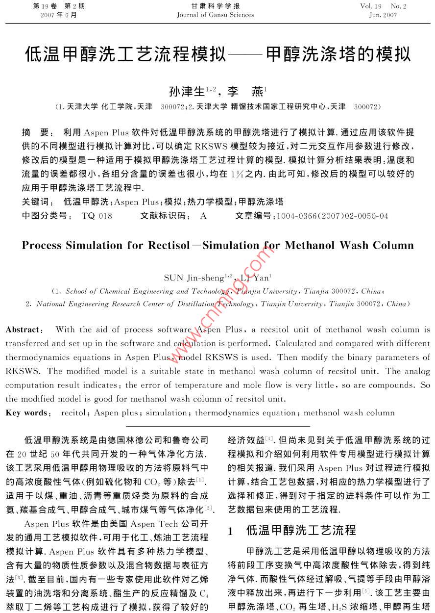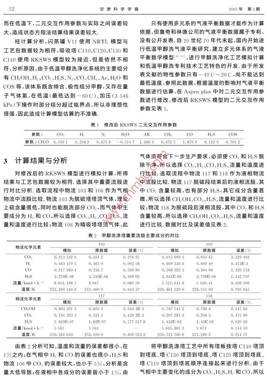 第19卷第2期甘肅科學(xué)學(xué)報(bào)Vol 19 No. 22007年6月Journal of Gansu ScienceJun.2007低溫甲醇洗工藝流程模擬——甲醇洗滌塔的模擬孫津生12,李燕(1.天津大學(xué)化工學(xué)院,天津300072;2.天津大學(xué)精餾技術(shù)國家工程研究中心,天津300072)摘要:利用 Aspen plus軟件對(duì)低溫甲醇洗系統(tǒng)的甲醇洗塔進(jìn)行了模擬計(jì)算.通過應(yīng)用該軟件提供的不同模型進(jìn)行模擬計(jì)算對(duì)比,可以確定 RKSWS模型較為接近,對(duì)二元交互作用參數(shù)進(jìn)行修改,修改后的模型是一種適用于模擬甲醇洗滌塔工藝過程計(jì)算的模型.模擬計(jì)算分析結(jié)果表明:溫度和流量的誤差都很小,各組分含量的誤差也很小,均在1%之內(nèi).由此可知,修改后的模型可以較好的應(yīng)用于甲醇洗滌塔工藝流程中關(guān)鍵詞:低溫甲醇洗;^ spen Plυs;模擬;熱力學(xué)模型;甲醇洗滌塔中圖分類號(hào):TQ018文獻(xiàn)標(biāo)識(shí)碼:A文章編號(hào):1004-0366(2007)02-0050-04Process Simulation for Rectisol -Simulation for Methanol wash ColumnSUN Jin-sheng., LI Yan(1. School of Chemical Engineering and Technology, Tianjin University, Tianjin 300072, China2. National Engineering Research Center of Distillation Technology, Tianjin University, Tianjin 300072. China)Abstract: With the aid of process software Aspen Plus, a recsitol unit of methanol wash column istransferred and set up in the software and calculation is performed Calculated and compared with differentthermodynamics equations in Aspen Plus, model RKSWS is used. Then modify the binary parameters ofRKSWS. The modified model is a suitable state in methanol wash column of recsitol unit. The analogomputation result indicates the error of temperature and mole flow is very little, so are compounds. Sothe modified model is good for methanol wash column of recsitol unitKey words: recitol; Aspen plus; simulation; thermodynamics equation; methanol wash column低溫甲醇洗系統(tǒng)是由德國林徳公司和魯奇公司經(jīng)濟(jì)效益.但尚未見到關(guān)于低溫甲醇洗系統(tǒng)的過在20世紀(jì)50年代共同開發(fā)的一種氣體凈化方法.程模擬和介紹如何利用軟件專用模型進(jìn)行模擬計(jì)算該工藝采用低溫甲醇用物理吸收的方法將原料氣中的相關(guān)報(bào)道.我們采用 Aspen Plus對(duì)過程進(jìn)行模擬的高濃度酸性氣體(例如硫化物和CO2等)除去口.計(jì)算,結(jié)合工藝包數(shù)據(jù)對(duì)相應(yīng)的熱力學(xué)模型進(jìn)行了適用于以煤、重油、瀝青等重質(zhì)烴類為原料的合成選擇和修正,得到對(duì)于指定的進(jìn)料條件可以作為工氨、羰基合成氣、甲醇合成氣、城市煤氣等氣體凈化2.藝數(shù)據(jù)包來使用的工藝流程.Aspen Plus軟件是由美國 Aspen Tech公司開發(fā)的通用工藝模擬軟件,可用于化工、煉油工藝流程1低溫甲醇洗工藝流程模擬計(jì)算. Aspen Plus軟件具有多種熱力學(xué)模型甲醇洗工藝是采用低溫甲醇以物理吸收的方法含有大量的物質(zhì)性質(zhì)參數(shù)以及混合物數(shù)據(jù)與表征方將前段工序變換氣中高濃度酸性氣體除去,得到純法.截至目前,國內(nèi)有一些專家使用此軟件對(duì)乙烯凈氣體.而酸性氣體經(jīng)過解吸、氣提等手段由甲醇溶裝置的油洗塔和分離系統(tǒng)、酯生產(chǎn)的反應(yīng)精餾及C;液中釋放出來,再進(jìn)行下一步利用.該工藝主要由萃取丁二烯等工藝構(gòu)成進(jìn)行了模擬,獲得了較好的甲醇洗滌塔、CO2再生塔、HS濃縮塔、甲醇再生塔第19卷孫津生等:低溫甲醇洗工藝流程模擬——甲醇洗滌塔旳模擬51和甲醇水分離塔五部分組成.低溫甲醇洗工藝流程見圖1aOIT.Nz區(qū)OE1O時(shí)z612SVDTIV L圖1低溫甲醇洗模擬工藝流程C110:脫硫塔;C12:粗吸塔;C130:主吸塔;Cl40:精吸塔;Cεσ0εCOε再生塔;C31θ:HS濃縮塔;C32:HS濃縮塔;C400:甲醇再生塔;C500:甲醇水分離塔;V11,V21、V22、V23、V24、V25、V31、V41皆為閃蒸罐在此工藝模擬過程中最重要、模擬難度最大的相平衡的模型. Aspen提供了計(jì)算6000多種純物就是甲醇洗滌塔.甲醇洗滌塔的主要玏能是在低溫質(zhì)的物理性能旳模型和計(jì)算混合物物性旳模型;計(jì)高壓下利用甲醇對(duì)酸性氣體良好的物理吸收性能脫算各種不同物系的氣一液、液一液兩相、氣一液一液除原料氣(即變換氣)中絕大部分的CO2和硫化物三相平衡的模型,這些模型包括計(jì)算氣相逸度的幾氣體雜質(zhì).這些氣體脫除的干凈程度制約著后繼工個(gè)氣體的狀態(tài)方程,計(jì)算液相活度的模型.因此應(yīng)序操作的好壞所以對(duì)甲醇洗滌塔進(jìn)行了模擬研究,該選擇偏差較小的模型.根據(jù)物系的性質(zhì)選擇了即塔V11、C110、C120、C130和C140.在實(shí)際工程N(yùn)RTL、SR- PLOAR、PSRK、 RKSWS4種模型進(jìn)行中,此處是一個(gè)逆流吸收塔,塔中分成5段,最底部模擬計(jì)算,對(duì)結(jié)果進(jìn)行分析的作用是將降溫后氣體中所含的微量液體分離,可(1)對(duì)于閃蒸罐Ⅴ11,NRTL模型較適合,其他以看作是閃蒸罐.分離后的氣體依次進(jìn)入塔的脫硫狀態(tài)方程無法計(jì)算.分析原因,對(duì)于低溫含水的極性段,粗吸段、主吸段和精吸段,主要作用為吸收氣體體系,狀態(tài)方程法不適合而活度系數(shù)法較為合適中的硫和CO3,皆可看作是單獨(dú)的吸收塔.為了使模2)對(duì)于脫硫塔C110,NRTL模型計(jì)算結(jié)果不擬過程簡潔和高效,易于收斂,將甲醇洗滌塔分為閃十分準(zhǔn)確,