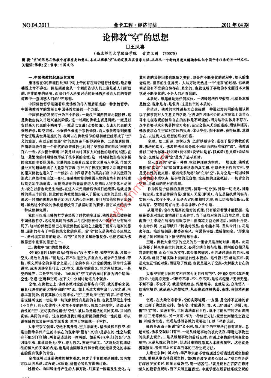 NO.04,20l1金卡工程·經(jīng)濟(jì)與法2011年04期論佛教空”的思想口王鳳喜(西北師范大學(xué)政法學(xué)院甘肅蘭州730070)摘要:“空”的思想在佛教中有很重要的意義本文從佛教”空”義的發(fā)展及其哲學(xué)內(nèi)涵從而從一個(gè)新的角度來解讀和認(rèn)識(shí)中國千年以來的另一種文化關(guān)鍵詞:佛教;空;哲學(xué);中國文化中國佛教的起源及其發(fā)展其相連的其他因素也就隨之變化,即處在不斷變化的過程中,如人的生康德曾在《純粹理性批判》中對(duì)上帝的存在與否進(jìn)行過論證,最后康老病死,世界的生住異滅。人與萬物既然是一個(gè)”無常的過程,也就說德說上帝不存在,但是康德也從一個(gè)側(cè)面告訴人們上帝是被人們所信明是沒有不變的自性存在,是空的。也就說明了事物的本來面目本來情的,并非簡單的證明。而我們今天所要討論的是佛教所帶給人們的普世狀是不斷變化的,不是人們所看到的道理中一直困感人們的空"思想本質(zhì)論。緣起就是無任何實(shí)體。一切緣起法性空假有也就是本質(zhì)中國佛教哲學(xué)是隨著印度佛教的傳入而后形成的一種宗教哲學(xué),是性空,現(xiàn)象是有,是假有,這是性空的本質(zhì)論中國佛教哲學(xué)的發(fā)展史中國佛教發(fā)展的一個(gè)方面價(jià)值論。佛教的空性說是為眾生提供一種通過對(duì)共同的實(shí)相認(rèn)識(shí)中國佛教的發(fā)展可分為三個(gè)階段:一是漢三國兩畀南北朝階段,這以了解事物對(duì)人生意義的學(xué)說它強(qiáng)調(diào)在因緣和合的無常現(xiàn)象上去苦心是佛教由傳入日趨興盛的階段,這一時(shí)期的佛教主要是兩派:派是以尋求主觀客觀的恒常自在的實(shí)體是不可能的因?yàn)檫@種實(shí)體并不存在安世高為代表的小乘禪學(xué):一派是以支謙(攴婁加讖).攴謙為代表的大眾生若要尋求和執(zhí)著性空為實(shí)有,必定會(huì)帶來無窮的迷惑煩惱和痛苦乘般若學(xué),即空宗說。小乘禪學(xué)偏重于宗教修持,而大乘般若學(xué)則側(cè)重佛教要求眾生空卻對(duì)實(shí)體的執(zhí)著,體認(rèn)空性,歸于寂靜,獲得解脫,求得于論證現(xiàn)實(shí)世界是虛幻的,我可以在佛教哲學(xué)的最初就己經(jīng)形成了空”自在,以達(dá)到人生理想的終極歸宿義的雛形,在以后的發(fā)展空的思想在不斷得到完善。二是隋唐階段空理。如上所述,龍樹認(rèn)為,之所以要講空,是在于顯示佛教的真在隋唐階段伴隨一個(gè)朝代的鼎盛佛教也達(dá)到了空前鼎盛的階段“南朝四理、佛法的真義,佛教把佛說法分成不同層面的標(biāo)準(zhǔn)稱作”諦”。佛教通百八十寺,多少樓臺(tái)煙雨中就是對(duì)當(dāng)時(shí)因家大興佛教的最好的寫照在常以三諦為標(biāo)準(zhǔn),以俗諦(世俗諦)說諸法是有以真諦(勝義諦)說諸法這一最繁榮的時(shí)期佛教形成了很多新的宗派這一時(shí)期佛教形成很多新皆空,也就是說,講空"是為了顯小真諦的宗派的主要原因是,大量的經(jīng)文隨著西域文化大量涌入中國,伴隨大顯小真諦的空"是一種理,空這種理稱為空理。一般說來,佛教真量經(jīng)文的翻譯形成了大量新的宗派在經(jīng)歷了極度的繁榮之后隨若唐朝理稱作真如”,“如即如其本來狀態(tài)的真實(shí)相,也即是無自性的實(shí)相??盏母矞绶鸾桃策M(jìn)入了一個(gè)低谷,在中國最著名的莫高石窟中從其壁畫的是無白性的寂滅相。般若經(jīng)系統(tǒng)將”如"立為空”認(rèn)為空是一切因緣和形式上也能體現(xiàn)出這一變化,在盛唐時(shí)期的壁畫人物的表情和色澤較唐合事物的本質(zhì)狀態(tài),是事物的無自性,空寂性的理論概括,一切皆空的后期吏加生動(dòng)通真,而隨著唐朝的衰落在進(jìn)入晚期后人物變化不是很空理,是最高的絕對(duì)的真理大,較之以前也缺乏生動(dòng)感在進(jìn)入末元明清后佛教趨衰落,這就是佛作為區(qū)別于俗諦的真諦空理,排除一切分別,排除一切成見,排除教的第三個(gè)階段,但此時(shí)的佛教思想?yún)s融入了儒家與道家的思想,所以一切定見,尤其是排除有見(常見),無見(斷見),有見是偏執(zhí)世間實(shí)有說這一時(shí)期的佛教思想更加關(guān)注人的心性問題,并與其他宗教更加融實(shí)體不滅,常住不變。無見是否定因果相續(xù)之理視以切法都會(huì)斷滅化通,雖然這個(gè)階段的佛教思想沒有了鼎盛時(shí)期的繁榮但它卻更趨向于成烏有空理遠(yuǎn)離有與無,非常非斷,合乎中道一種成熟和完滿。從道理看,空作為最高的絕對(duì)的真理,只有般若智慧才能把捏。這我們可以看出佛教哲學(xué)在經(jīng)歷了時(shí)代的變遷后,佛教思想以被稱做就是要求對(duì)緣起事物進(jìn)行直觀體悟,當(dāng)下證取刈象的無自性之理。史載中國佛教哲學(xué)這說明此時(shí)的佛教以與它剛剛被傳入中國時(shí)已經(jīng)有所不南唐中主李璟在與禪宗法眼宗開山祖清涼文益論禪道后,同觀牡丹花同了,這時(shí)的佛教思想已在印度佛教的基礎(chǔ)之上融進(jìn)了儒家與道家的思中主命作偈文益即賦口:“擁魂對(duì)芳叢,由來趣不同。發(fā)從今日白,花是想逐漸的帶有了中國傳統(tǒng)文化的色彩。而空僅僅是佛教眾多思想之去年紅。艷冶隨朝露,馨香逐晚風(fēng)。何需待零落然后使知空。形象地,是對(duì)現(xiàn)實(shí