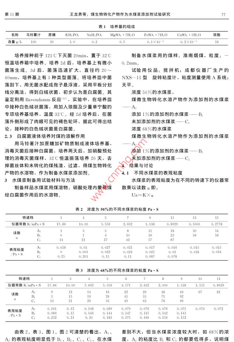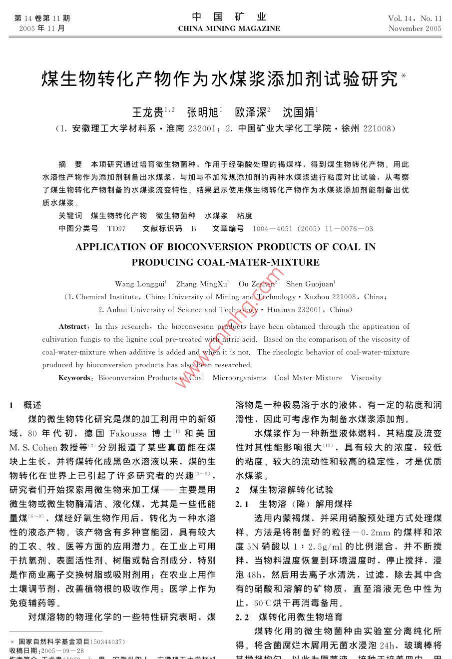 第14卷第11期中國礦業(yè)Vol 14. No, 112005年11月CHINA MINING MAGAZINENovember 2005煤生物轉(zhuǎn)化產(chǎn)物作為水煤漿添加劑試驗研究*王龍貴:2張明旭!歐澤深2沈國娟(1.安徽理工大學(xué)材料系·淮南232001;2.中國礦業(yè)大學(xué)化工學(xué)院·徐州221008)摘要本項研究通過培育微生物菌種,作用于經(jīng)硝酸處理的褐煤樣,得到煤生物轉(zhuǎn)化產(chǎn)物。用此水溶性產(chǎn)物作為添加劑制備岀水煤漿,與加與不加常規(guī)添加劑的兩種水煤漿進行粘度對比試驗,從考察了煤生物轉(zhuǎn)化產(chǎn)物制備的水煤漿流變特性。結(jié)果顯示使用煤生物轉(zhuǎn)化產(chǎn)物作為水煤漿添加劑能制備岀優(yōu)質(zhì)水煤漿關(guān)鍵詞煤生物轉(zhuǎn)化產(chǎn)物微生物菌種水煤漿粘度中圖分類號TD97文獻標(biāo)識碼B文章編號1004-4051(2005)11-0076-03APPLICATION OF BIOCON VERSION PRODUCTS OF COAL INPRODUCING COAL-MATER-MIXTUREWang Longgui Zhang Ming Xu Ou Zeshen' Shen guojuan'(1. Chemical Institute, China University of Mining and Technology.Xuzhou 221008, China;2. Anhui University of Science and Technology Huainan 232001, China)Abstract: In this research, the bioconvesion products have been obtained through the apptication ofcultivation fungis to the lignite coal pre-treated with nitric acid. Based on the comparison of the viscosity ofcoal-water-mixture when additive is added and when it is not. The rheologic behavior of coal-water-mixtureproduced by bioconversion products has also been researched.Keywords: Bioconversion Products of Coal Microorganisms Coal-Mater-Mixture Viscosity概述溶物是一種極易溶于水的液體,有一定的粘度和潤煤的微生物轉(zhuǎn)化研究是煤的加工利用中的新領(lǐng)滑性,因此可考慮作為制備水煤漿添加劑。域,80年代初,德國 Fakoussa博士和美國水煤漿作為一種新型液體燃料,其粘度及流變M.S. Cohen教授等α分別報道了某些真菌能在煤性對其性能影響很大23,具有較大的濃度,較低塊上生長,并將煤轉(zhuǎn)化成黑色水溶液以來,煤的生的粘度、較大的流動性和較高的穩(wěn)定性,才是優(yōu)質(zhì)物轉(zhuǎn)化在世界上已引起了許多研究者的興趣3~5,水煤漿研究者們開始探索用微生物來加工煤——主要是用2煤生物溶解轉(zhuǎn)化試驗微生物或微生物酶清潔、液化煤,尤其是一些低能2.Ⅰ生物溶(降)解用煤樣量煤,煤經(jīng)好氧生物作用后,轉(zhuǎn)化為一種水溶選用內(nèi)蒙褐煤,并采用硝酸預(yù)處理方式處理煤性的液態(tài)產(chǎn)物。該產(chǎn)物含有多種官能團,具有較大樣。方法是將制備好的粒徑-0.2mm的煤樣和濃的工農(nóng)、牧、醫(yī)等方面的應(yīng)用潛力。在工業(yè)上可用度5N硝酸以1:2.5g/ml的比例混合,并不斷攪于抗氧劑、表面活性劑、樹脂或黏合劑成分,特別拌,當(dāng)物料溫度恢復(fù)到環(huán)境溫度時,停止攪拌,浸是作商業(yè)離子交換樹脂或吸附劑用;在農(nóng)業(yè)上用作泡48h,然后用去離子水清洗,過濾,除去其中含土壤調(diào)節(jié)劑,改善植物根的吸收作用;醫(yī)學(xué)上作為有的硝酸和溶解的礦物質(zhì).直至溶液無色中性為免疫輔藥等。止,60℃烘干再消毒備用對煤溶物的物理化學(xué)的一些特性研究表明,煤2.2煤轉(zhuǎn)化用微生物培育煤轉(zhuǎn)化用的微生物菌種由實驗室分離純化所餐國家自然科學(xué)基金項目(50344037)收稿日期:2005-09-28得。將含菌腐爛木屑用無菌水浸泡24h、玻璃棒將第11期王龍貴等:煤生物轉(zhuǎn)化產(chǎn)物作為水煤漿添加劑試驗研究表1培養(yǎng)基的組成名稱馬鈴薯汁蔗糖KH PONaH2PO4MgSO1·7H2 O FeS(1·7H2OCuSO4·5H2O瓊脂含量g/L1000.50.1×10-30.2×10-3培養(yǎng)接種前于121C下滅菌20min,置于32℃制備水煤漿用的煤樣:淮南煙煤,粒度恒溫培養(yǎng)箱中培養(yǎng)。培養(yǎng)2d后,培養(yǎng)基上有微小菌落生成。3d后,菌落迅速擴大,直徑約20試驗用儀品:攪拌機;成都儀器廠生產(chǎn)的4σmm,培養(yǎng)基上有3種類型菌落。將培養(yǎng)皿中菌NXS-11型旋轉(zhuǎn)粘度計,粘度測量使用A系統(tǒng);落刮下,用無菌水配成孢子懸浮液,采用平板分劃天平線分離法,得到白絨狀菌,初步認(rèn)為是白腐菌。其濃度50%的水煤漿鑒定利用 Bavendamn反應(yīng),實驗中,在培養(yǎng)皿煤微生物轉(zhuǎn)化水溶產(chǎn)物作為添加劑的水煤漿中接種白色絨狀菌落,用加入瓊脂及少量單寧酸的專項培養(yǎng)基培養(yǎng),溫度32C。經(jīng)2d培養(yǎng)后,在菌添加1%的添加劑的水煤漿—B1落外側(cè)形成了肉眼可見的褐色輪環(huán),據(jù)此可得出結(jié)未加添加劑的水煤漿—C1論,接種的白色絨狀菌是白腐菌。濃度68%的水煤漿2.3白腐菌液體培養(yǎng)對煤的溶解作用煤微生物轉(zhuǎn)化水溶產(chǎn)物作為添加劑的水煤漿用馬鈴著汁加蔗糖加礦物質(zhì)制成液體培養(yǎng)基,A消毒滅菌后接種白腐菌,培養(yǎng)兩天后,加硝酸預(yù)處添加1%的添加劑的水煤漿—B2理的消毒滅菌煤樣,32℃恒溫振蕩培養(yǎng)20天,去未加添加劑的水煤漿—C掉菌絲體和未轉(zhuǎn)化的煤殘渣,過濾,得煤生物轉(zhuǎn)化4結(jié)果與討論產(chǎn)物的水溶物,作為制備水煤漿添加劑。4.1不同水煤漿的表觀粘度3水煤漿制備用試驗材料與方法水煤漿的表觀粘度為在不同的轉(zhuǎn)速下的儀器常制備樣品水煤漿用煤溶物:硝酸處理內(nèi)蒙褐煤數(shù)乘以讀數(shù)α即經(jīng)白腐菌作用后的水溶物。Ua=KX表2濃度為50%的不同水煤漿的粘度Pa·S速檔儀器常數(