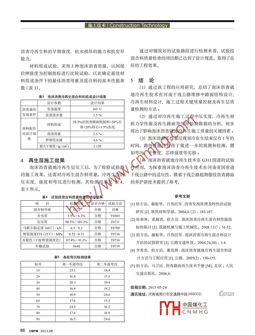 施T.技術(shù)I Construction Technology泡沫瀝青就地冷再生技術(shù)在河南省的試驗(yàn)應(yīng)用Test and Application of the Foamed A sphalt Cold RecyclingTechnology on the Spot in Henan Province河南周口市公路管理局彭大山/PENG Dashan摘要:本文介紹了河南省G311國道泡沫瀝青就地冷再生試驗(yàn)路的有關(guān)應(yīng)用成果。介紹了維修方案的選擇,冷再生材料設(shè)計(jì)方法;分析了現(xiàn)場冷再生層的施工效果,材料的力學(xué)性能及冷再生層承載力檢測結(jié)果表明各項(xiàng)指標(biāo)達(dá)到了設(shè)計(jì)要求。試驗(yàn)路的實(shí)施成果為泡沫瀝青就地冷再生技術(shù)在河南省干線公路以后的應(yīng)用提供了參考。關(guān)鍵詞:泡沫瀝青就地冷再生 試驗(yàn)應(yīng)用 路面維修近年來,泡沫瀝青冷再生技術(shù)在我國一-些省市得到術(shù)狀況評定為次等路。 路面破損主要以縱橫向裂縫為主,了推廣應(yīng)用,將該技術(shù)用于公路維修養(yǎng)護(hù)具有將廢舊路局部路段坑槽、 沉陷、松散較為普遍,全路段路面橫坡面材料大量再生利用、中斷交通時(shí)間短、具有柔性結(jié)構(gòu)較差。 從取芯情況來看,該段的瀝青碎石面層為8 cm,層的特點(diǎn),因此具有很好的經(jīng)濟(jì)和社會效益。為了探索二 _灰碎石基層21 ~ 26 cm,多數(shù)芯樣表明部分基層松散。泡沫瀝青冷再生技術(shù)在河南省國省道干線公路中的適應(yīng)該路段的代表 彎沉值為38.7 (1/100 mm)。性,摸索干線公路瀝青路面的維修養(yǎng)護(hù)新技術(shù)。2012 年在國道G311上進(jìn)行了3 km的泡沫瀝青就地冷再生技2 實(shí)驗(yàn) 路結(jié)構(gòu)方案術(shù)應(yīng)用試驗(yàn),這也是河南省首條泡沫瀝青就地冷再生試根據(jù)路況調(diào)查的結(jié)果,經(jīng)分析后認(rèn)為原有路面的驗(yàn)路,本文將對此項(xiàng)工程的有關(guān)應(yīng)用成果加以介紹。病害主要集中在瀝青面層,而基層沒有遭受損壞,病害損壞主要集中在基層的上部,如果能夠?qū)F(xiàn)在已經(jīng)1工程概況破損的瀝青面層加以再生利用,改造成具有- -定柔性,311國道鹿邑段位于河南省周口市,設(shè)計(jì)標(biāo)準(zhǔn)為-級可 以有效抑制裂縫的瀝青再生層,可以取得一-舉兩得公路,雙向4車道,設(shè)計(jì)速度90km/h。道路所處環(huán)境的效果。采用泡沫瀝青冷再生技術(shù)能夠比較好的解決為平均氣溫在14.5~15.8 C之間。年平均氣溫變差為原有 路面的病害,而且成本適中,是較好的解決方案。27C左右,年周期變化在0~28 C之間。年降水量為689維 修后路面結(jié)構(gòu)為: 4cmAC-13+14 cm泡沫瀝青冷再生~ 816 mm,夏季降水集中,平均降水量為371.9mm,占層 +18cm原水泥穩(wěn)定碎石基層+15cm原石灰穩(wěn)定土基全年降水量的50.2%,且時(shí)空分布不均,多暴雨、大雨,層, 試驗(yàn)路段維修方案如圖1所示。雨量從周口東南至西北呈遞減趨勢;冬季降雪較稀少,降雪深度平均為12 cm。本項(xiàng)目依托311國道鹿邑段樁3室內(nèi)配 合比設(shè)計(jì)號K33+450~ K36+60)道路改建工程,鋪筑的泡沫泡沫瀝青冷中國煤化工包括兩項(xiàng)內(nèi)容,瀝青就地冷再生試驗(yàn)段。瀝青發(fā)泡性能試MYHCNM HG經(jīng)現(xiàn)場勘察,結(jié)合檢測單位的檢測報(bào)告,該路段技3.1 瀝青 發(fā)泡條件84 CMTM 2013.08施工技術(shù)0 Construction Technology瀝青面層4 cm性的主車道或行車道位置。泡沫瀝青采用就地冷再生機(jī)WR2500S,在設(shè)計(jì)的銑刨深原瀝青面層10 cm再生層14cm度下,選定3種銑刨速度范圍,如5~7m/min,5~水穩(wěn)基層18 cm7 m/min 和7~ 9 m/min, 銑刨組合方式如圖2所示。為了獲取具有代表性的RAP料,所有RAP料的取樣.石灰穩(wěn)定基層15cm石灰穩(wěn)定基層IScm都禁.止在調(diào)速段和結(jié)束段進(jìn)行,并在每個(gè)速度范圍內(nèi)取料坑中間整個(gè)斷面取料,不少于100 kg。分別對各路基速度范圍的材料進(jìn)行篩分,分析比較級配的差異性,并以此確定合適的再生機(jī)工作速度,并將此速度下的銑圖1 試驗(yàn)路路面結(jié)構(gòu)維修方案刨料作為代表性試樣進(jìn)行配合比設(shè)計(jì)。通過室內(nèi)發(fā)泡試驗(yàn)設(shè)備對使用的瀝青(AH-70)進(jìn)通過對銑刨料篩分分析,發(fā)銑刨速度在5 ~ 7 m/min行發(fā)泡試驗(yàn),獲得瀝青的最佳發(fā)泡條件如表1所示。時(shí),銑刨料粒徑級配比較適宜,沒有出現(xiàn)過多的超粒表1瀝青的最佳發(fā)泡條件徑骨料和過多的細(xì)料,因此選擇該速度范圍下的銑創(chuàng)刨發(fā)泡溫度/C發(fā)泡用水量膨脹率/倍半衰期/s料用于室內(nèi)配合比設(shè)計(jì),并將此速度范圍確定為施工過162.5% .1815程中的速度控制范圍。3.2材料篩 分試驗(yàn)結(jié)果根據(jù)泡沫瀝青冷再生混合料的級配要求,考慮再為了給實(shí)驗(yàn)室混合料設(shè)計(jì)提供準(zhǔn)確、可靠的實(shí)驗(yàn)生 層的設(shè)計(jì)厚度,確定混合料的配比為58.5%舊瀝青樣品,決定采用WR2500S 再生機(jī)現(xiàn)場取樣的方法。路面銑刨料 +20%石屑+20% 碎石+1.5% 水泥,合成選取代表性的路段進(jìn)行取樣,取料坑選擇在具有代表后級配結(jié)果如 表2所示。加入1.5%水泥以增加泡沫調(diào)速段速度3~5速度5~7調(diào)速段.速度7~9結(jié)束段m/min, 4mm/min,4 m2m圖2各銑刨位 置再生機(jī)工作速度組合方案表2原材料級配及合成級配篩孔通過篩孔(方孔篩) 1 mm礦料31.5| 26.5