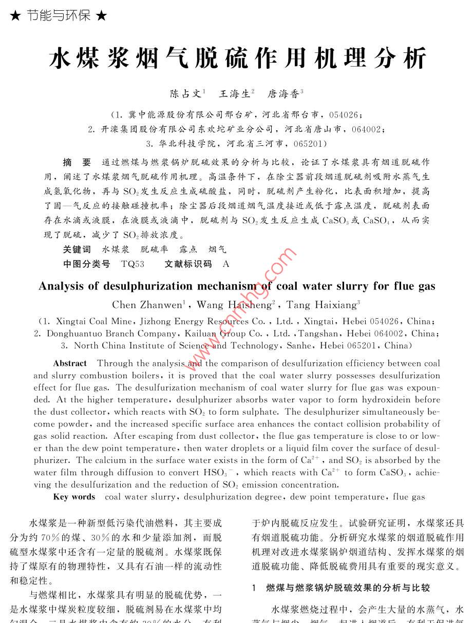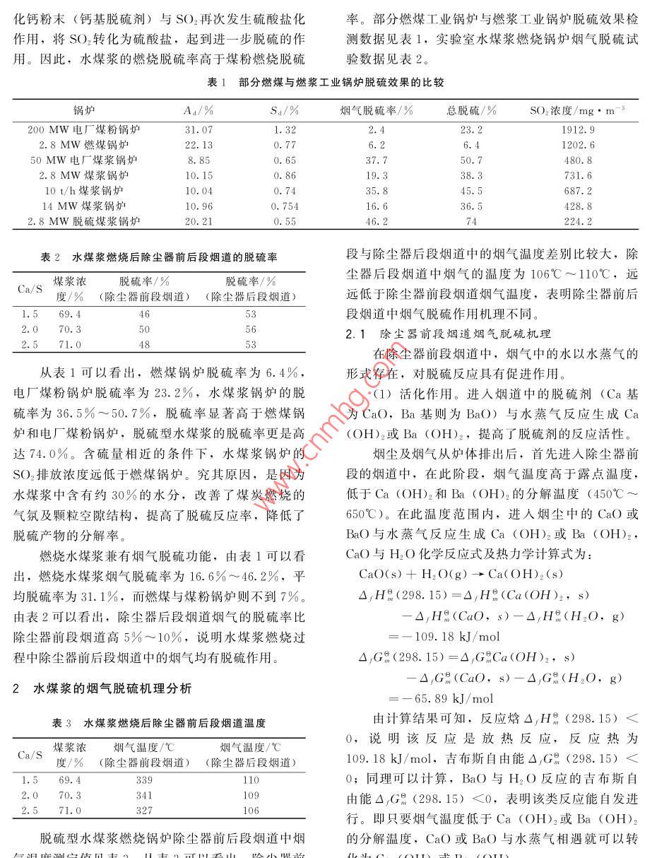 ★節(jié)能與環(huán)?!锼簼{煙氣脫硫作用機理分析陳占文1王海生2唐海香3(1.冀中能源股份有限公司邢臺礦,河北省邢臺市,054026;開灤集團股份有限公司東歡坨礦業(yè)分公司,河北省唐山市,064002;3.華北科技學院,河北省三河市,065201)摘要通過燃煤與燃漿鍋爐脫硫效果的分析與比較,論證了水煤漿具冇煙道脫硫作用,闡述了水煤漿煙氣脫硫作用機理。高溫條件下,在除塵器前段煙道脫硫劑吸附水蒸氣生成氫氧化物,再與SO2發(fā)生反應生成硫酸鹽,同時,脫硫劑產(chǎn)生粉化,比表面積增加,提高了固—氣反應的接觸碰撞杋率;除塵器后段煙道煙氣溫度接近或低于露點溫度,脫硫劑表面存在水滴或液膜,在液膜或液滴中,脫硫劑與SO2發(fā)生反應生成CaSO3或CaSO,從而實現(xiàn)了脫硫,減少了SO2排放濃度關(guān)鍵詞水煤漿脫硫率露點煙氣中圖分類號TQ53文獻標識碼Analysis of desulphurization mechanism of coal water slurry for flue gasChen Zhanwen', Wang haisheng Tang Haixiang(l. Xingtai Coal Mine, Jizhong Energy reesources coLtd, Xingtai, Hebei 054026, China;2. Donghuantuo Branch Company, Kailuan Group Co, Ltd, Tangshan, Hebei 064002, China3. North China Institute of Science and Technology, Sanhe, Hebei 065201, China)Abstract Through the analysis and the comparison of desulfurization efficiency between coaland slurry combustion boilers, it is proved that the coal water slurry possesses desulfurizationeffect for flue gas. The desulfurization mechanism of coal water slurry for flue gas was expouded. At the higher temperature, desulphurizer absorbs water vapor to form hydroxidein beforehe dust collector, which reacts with SO2 to form sulphate. The desulphurizer simultaneously become powder, and the increased specific surface area enhances the contact collision probability ofgas solid reaction. After escaping from dust collector, the flue gas temperature is close to or lower than the dew point temperature, then water droplets or a liquid film cover the surface of desulhurizer. The calcium in the surface water exists in the form of ca"t, and SO, is absorbed by thewater film through diffusion to convert HSO3, which reacts with Ca to form CaSO3, achieving the desulfurization and the reduction of SO2 emission concentration.Key words coal water slurry, desulphurization degree, dew point temperature, flue gas水煤漿是一種新型低污染代油燃料,其主要成于爐內(nèi)脫硫反應發(fā)生。試驗研究證明,水煤漿還具分為約70%的煤、30%的水和少量添加劑,而脫有煙道脫硫功能。分析研究水煤漿的煙道脫硫作用硫型水煤漿中還含有一定量的脫硫劑。水煤漿既保杋理對改進水煤漿鍋爐煙道結(jié)構(gòu)、發(fā)揮水煤漿的煙持了煤原有的物理特性,又具有石油一樣的流動性道脫硫功能、降低脫硫費用具有重要的現(xiàn)實意義。和穩(wěn)定性。與燃煤相比,水煤漿具有明顯的脫硫優(yōu)勢燃煤與燃漿鍋爐脫硫效果的分析與比較是水煤漿中煤炭粒度較細,脫硫劑易在水煤漿中均水煤漿燃燒過程中,會產(chǎn)生大量的水蒸氣,水化鈣粉末(鈣基脫硫劑〉與SO2再次發(fā)生硫酸鹽化率。部分燃煤工業(yè)鍋爐與燃漿工業(yè)鍋爐脫硫效果檢作用,將SO2轉(zhuǎn)化為硫酸鹽,起到進一步脫硫的作測數(shù)據(jù)見表1,實驗室水煤漿燃燒鍋爐煙氣脫硫試用。因此,水煤漿的燃燒脫硫率髙于煤粉燃燒脫硫驗數(shù)據(jù)見表2。表1部分燃煤與燃漿工業(yè)鍋爐脫硫效果的比較鍋爐Ad/%S/%煙氣脫硫率/%總脫硫/%SO2濃度/mg·m00MW電廠煤粉鍋爐1912.92.8MW燃煤鍋爐22,131202.650MW電廠煤漿鍋爐0.652.8MW煤漿鍋爐10.150.819.338.373110t/h煤漿鍋爐10.0435.845.5687.214MW煤漿鍋爐0,75436.5428.82.8MW脫硫煤漿鍋爐46.2表2水煤漿燃燒后除塵器前后段煙道的脫硫率段與除塵器后段煙道中的煙氣溫度差別比較大,除Ca/S煤漿濃脫硫率/%脫硫率/塵器后段煙道中煙氣的溫度為106℃~110℃,遠度/%(除塵器前段煙道)(除塵器后段煙道遠低于除塵器前段煙道煙氣溫度,表明除塵器前后569.42.070.32.571.0363段煙道中煙氣脫硫作用機理不同2.1除塵器前段煙道煙氣脫硫機理在除塵器前段煙道中,煙氣中的水以水蒸氣的從表1可以看岀,燃煤鍋爐脫硫率為6.4%,形式存在,對脫硫反應具有促進作用電廠煤粉鍋爐脫硫率為23.2%,水煤漿鍋爐的脫(1)活化作用。進入煙道中的脫硫劑(Ca基硫率為36.5%~50.7%,脫硫率顯著高于燃煤鍋為CaO,Ba基則為BaO)與水蒸氣反應生成C爐和電廠煤粉鍋爐,脫硫型水煤漿的脫硫率更是高(H2或Ba(OH),提髙了脫硫劑的反應活性」達74.0%。含硫量相近的條件下,水煤漿鍋爐的煙塵及煙氣從爐體排出后,首先進入除塵器前SO3排放濃度遠低于燃煤鍋爐。究其原因,是因為段的煙道中,在此階段,煙氣溫度高于露點溫度水煤漿中含有約30%的水分,改善了煤炭燃燒的低于Ca(OH2和Ba(OH2的分解溫度(450℃氣氛及顆??障督Y(jié)構(gòu),提高了脫硫反應率,降低了650℃)。在此溫度范圍內(nèi),進人煙塵中的CaO或脫硫產(chǎn)物的分解率。BaO與水蒸氣反應生成Ca(OH)2或Ba(OH)2,燃燒水煤漿兼有煙氣脫硫功能,由表1可以看CaO與H2O化學反應式及熱力學計算式為:出,燃燒水煤漿煙氣脫硫率為16.6%~46.2%,平Cao(s)+ h2 o()-Ca(OH)2(s)均脫硫率為31.1%,而燃煤與煤粉鍋爐則不到7%,△/Hm(298.15)=△Hm(Ca(OH)2,s)由表2可以看出,除塵器后段煙道煙氣的脫硫率比△Hm(CaO,s)-△Hm(H2O,g)除塵器前段煙道高5%~10%,說明水煤漿燃燒過109. 18 kJ/mol程中除塵器前后段煙道中的煙氣均有脫硫作用?!?Gm(298.15)=△GCa(OH)2,s)2水煤漿的煙氣脫硫機理分析△,Gm(CaO,s)-△Gm(H2O,g)表3水煤漿燃燒后