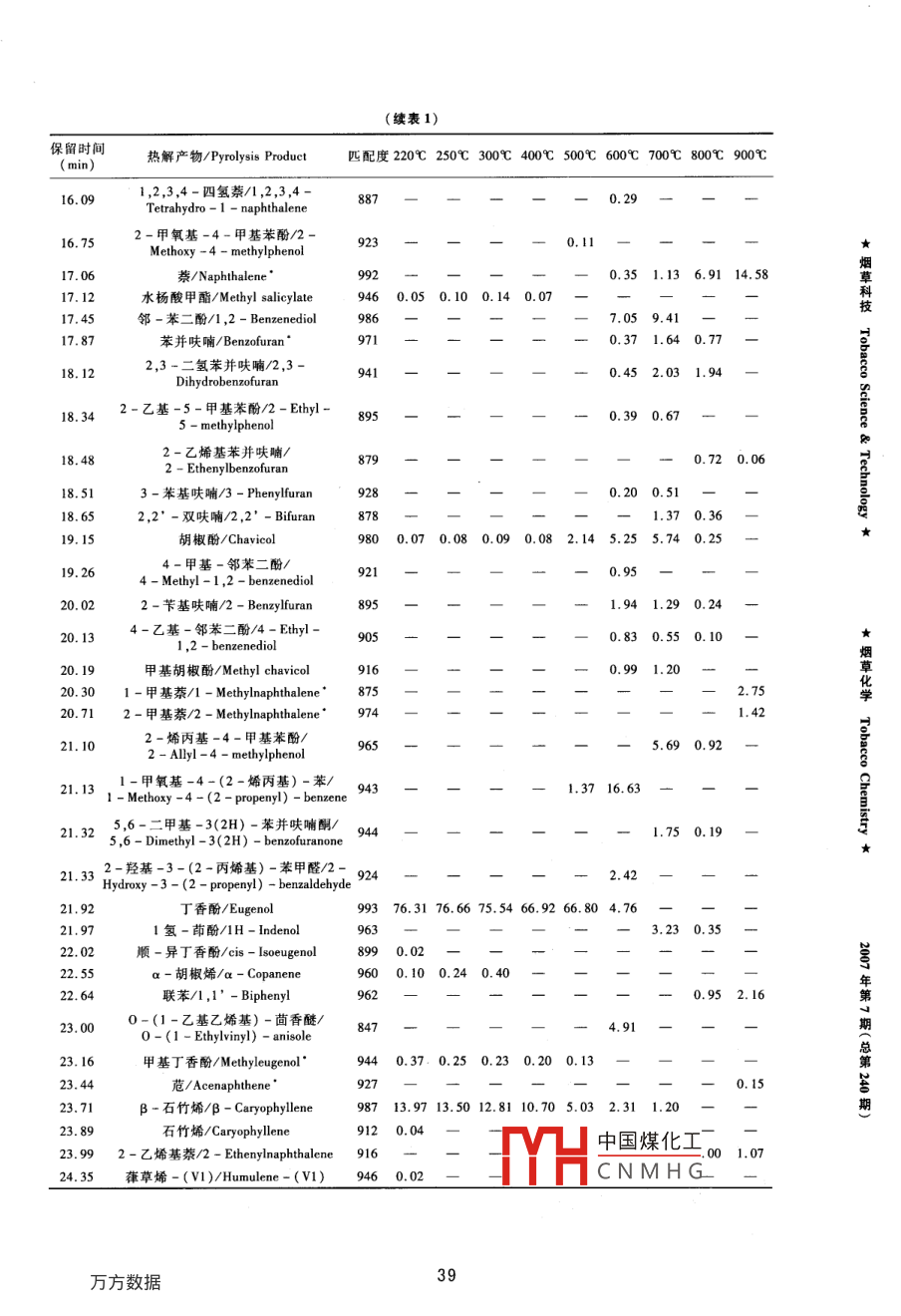 桂葉油熱解產(chǎn)物的GC/MS分析煙草科技→98吳億勤2,楊柳,孟昭宇,陸舍銘,緡明明,朱洪友21.紅塔煙草(集團(tuán))有限責(zé)任公司技術(shù)中心,云南省玉溪市紅塔大道118號6531002.云南大學(xué)化學(xué)科學(xué)與工程學(xué)院,昆明市翠湖北路2號650091關(guān)鍵詞:桂葉油;熱解;氣相色譜/質(zhì)譜摘要:采用GC/MS法分析了在250、300、400、500、600700、800和900℃下桂葉油的熱解產(chǎn)物并用歸一化法進(jìn)行了定量。結(jié)果表明:①桂葉油在250℃以下不熱解,丁香酚、β一石竹烯和乙酰丁香酚是桂葉油的主要致香成分;②600℃以下桂葉油主要釋放出丁香酚和乙酰丁香酚等52種化合物;③00℃以上桂葉油不釋放致香物質(zhì),而釋放芳烴和稠環(huán)芳烴等有害物質(zhì),且其種類及相對含量均隨著熱解溫度的升高而增大;④桂葉油的熱解產(chǎn)物可能主要是丁香酚裂解形成的中圖分類號:TS264.3文獻(xiàn)標(biāo)識碼:B文章編號:1002-0861(2007)07-0036-06Analysis of Pyrolysis Products of Cinnamon Leaf Oil by Gas Chromatography/Mass Spec.trometerWU YI-QIN(1, 2),YANG LIU(1), MENG ZHAO-YU(), LU SHE- MING(1), MIAO MINGMING(1), and ZHU HONG-YOU(2)1. R&D Center of Hongta Tobacco( Group) Co., Ltd, Yuxi 653100, Yunnan, China2. College of Chemical Science and Engineering, Yunnan University, Kunming 650091, ChinaKeywords: Cinnamon leaf oil; Pyrolysis; GC/MSAbstract: At 250, 300, 400, 500, 600, 700, 800 and 900C, the pyrolysis products of cinnamonleaf oil were analyzed by gas chromatography/mass spectrometry, and the relative content of thepyrolysis products were also calculated by normalization method. The results indicated that:I)cinnamon leaf oil was not pyrolysised at 250C, and released out of flavor substances, such aseugenol, B-caryophyllene and aceteugenol; 2 )under 600C, 52 pyrolysis products were releasedfrom the essence; 3 )above 700C, no flavor was found in the pyrolysis products. Furthermore, withthe raise of pyrolysis temperature, harmful substances were released, such as aromatic, polycyclic年第期⌒總第aromatic hydrocarbons; and the category and relative content of them increased with the tempera-ture; 4)the pyrolysis products of cinnamon leaf oil were mainly possible came from eugenol期作者簡介:吳億勤(1980-),云南大學(xué)化學(xué)科學(xué)與工程學(xué)院在讀碩士研究生,研究方向:香精香料品控技術(shù)體系。Emai:wuyin-5l7@tom.com電話:0877-2968271收稿日期:2006-12-28責(zé)任編輯:劉立全E-mail:llq@tobaccoinfo.com.cn電話:037167672637中國煤化工CNMHG桂葉油具有典型的桂葉特征香氣,在煙草行溫程序:50℃(5mi0°C/mn,900(5mim);分流業(yè)中常用作煙用添加劑。俞志雄2等分析了比:100:1;接口溫度:250℃;電離(EI)能量:70eV;桂葉油的化學(xué)成分,發(fā)現(xiàn)其主要成分為丁香酚離子源溫度:190℃;質(zhì)量掃描范圍:40~400amu。孫漢董(、崔建國“、 JAYATILAKA等也都對桂采用NST02和 WILEY7標(biāo)準(zhǔn)質(zhì)譜庫檢索法葉油進(jìn)行了研究,但將熱解氣相色譜/質(zhì)譜法(PyCC/MS)用于桂葉油熱解產(chǎn)物分析尚未見報道。定性,峰面積歸一化法定量。因此,采用PyGC/Ms法分析了桂葉油在不同溫2結(jié)果與討論度下的熱解產(chǎn)物,旨在為桂葉油在卷煙中的應(yīng)用2.1熱解溫度對桂葉油熱解產(chǎn)物的影響提供參考。由圖1和表1看出:①桂葉油在220℃直接1材料與方法進(jìn)樣與其在250℃、300℃下的熱解產(chǎn)物的總離子★煙草科技流圖(TC)和鑒定結(jié)果基本一致,在這3種溫度1.1材料Clarus500氣相色譜質(zhì)譜聯(lián)用儀(美國下,出現(xiàn)最大峰的保留時間(RT)為21.92min,質(zhì)PerkinElmer公司),配備NS02和WEY7標(biāo)準(zhǔn)譜檢測為丁香酚,其相對含量高達(dá)76.66%,加上質(zhì)譜庫; Projector Il熱裂解儀(澳大利亞SGE公阝-石竹烯(RT23.7lmin)和乙酰丁香酚(Rr司);桂葉油(華寶香精香料有限公司)。26.04min),共約占95.44%,只有丁香酚甲醚為1.2熱解與分析Hoffman名單6中的有害物質(zhì)。說明在250和用液體進(jìn)樣器吸取0.5L桂葉油,加入已調(diào)300℃下桂葉油沒有發(fā)生明顯的熱解,丁香酚、B好預(yù)定溫度的裂解爐中,于He中分別在250石竹烯和乙酰丁香酚是其主要成分;②400和300400500600700800和900℃下進(jìn)行熱裂500℃下熱解產(chǎn)物中的主要組分仍是丁香酚,裂解解,裂解產(chǎn)物直接導(dǎo)入氣相色譜/質(zhì)譜聯(lián)用儀成分不復(fù)雜,400℃下丁香酚和β-石竹烯開始明(GC/MS)中進(jìn)行分離鑒定。另取0.5μL桂葉油顯減少但直至500℃,其熱解產(chǎn)物增加不多;③直接進(jìn)行CC/MS分析,進(jìn)樣口溫度20℃,其它600℃下丁香酚的相對含量由50℃下的680%煙草化條件同下降為4.76%,說明該成分在600℃時發(fā)生大量裂裂解爐壓力:1.10MPa;色譜柱: PE-Elite 5-MS解,另外2種主要成分β-石竹烯和乙酰丁香酚(30mx0.25mmi.d.x0.25μmd.f.)熔融石英毛也所剩無幾,而RT為21.13min的最大峰經(jīng)檢細(xì)管柱;進(jìn)樣口溫度:250℃;載氣:He(純度索為1-甲氧基-4-烯丙基苯,其相對含量為99.999%,1mL/min(起始柱頭壓624kPa);升16.63%,可能是由丁香酚(2-甲氧基-4-烯丙00副噸灰要⊥年第期⌒總第保留時間(min)TH中國煤化工CNMHG圖1桂葉油在220℃直接進(jìn)樣(a)、250(b)、600(c)和900℃37基苯酚)脫甲氧基后再獲得一個甲基而形成的。外,還出現(xiàn)了4種稠環(huán)芳烴:菲、4,5-亞甲基菲、苯除異戊二烯和丁香酚甲醚外,從600℃開始出現(xiàn)并[ghi]熒蒽和苯并[j熒蒽;⑥900℃下基本上無苯及其衍生物,但其相對含量較低,最高僅為致香物質(zhì),其熱解產(