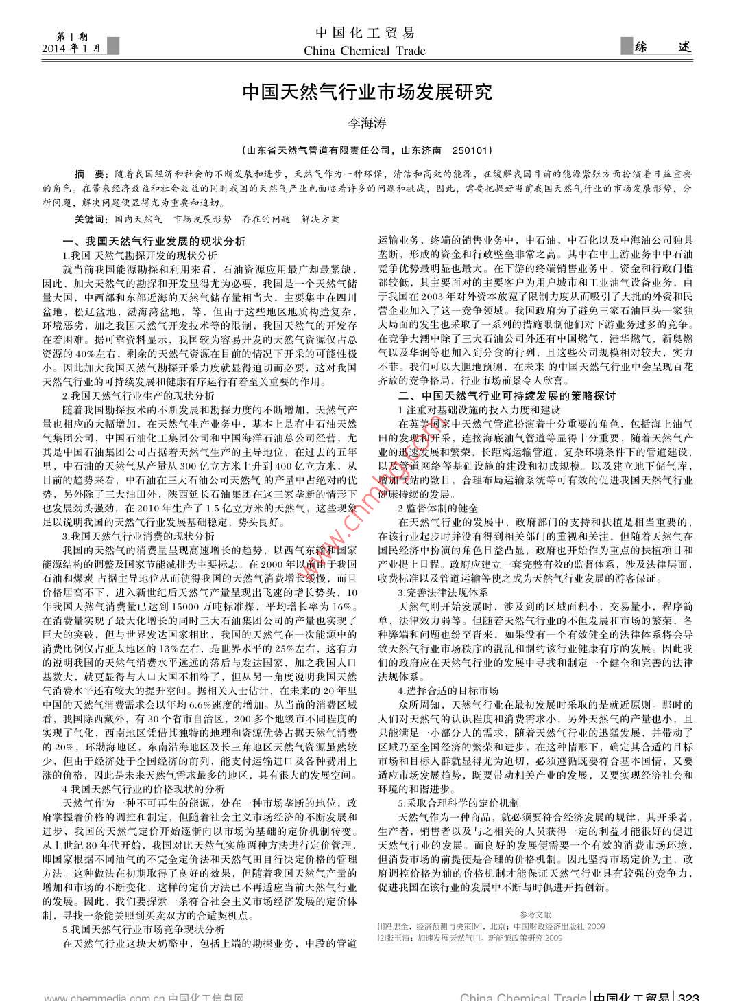 第1期中國化工貿(mào)易2014年1月China Chemical Trade綜述中國天然氣行業(yè)市場發(fā)展研究李海濤(山東省天然氣管道有限責(zé)任公司,山東濟(jì)南250101)摘要: 隨著我國經(jīng)濟(jì)和社會的不斷發(fā)展和進(jìn)步,天然氣作為一種環(huán)保,清潔和高效的能源,在緩解我國目前的能源緊張方面扮演著日益重要的角色。在帶來經(jīng)濟(jì)效益和社會效益的同時(shí)我國的天然氣產(chǎn)業(yè)也面臨著許多的問題和挑戰(zhàn),因此,需要把握好當(dāng)前我國天然氣行業(yè)的市場發(fā)展形勢,分析問題,解決問題便顯得尤為重要和迫切。關(guān)鍵詞:國內(nèi)天然氣市場發(fā)展形勢 存在的問題 解決方案一、我國天然氣行業(yè)發(fā)展的現(xiàn)狀分析運(yùn)輸業(yè)務(wù),終端的銷售業(yè)務(wù)中,中石油,中石化以及中海油公司獨(dú)具:1.我國天然氣勘探開發(fā)的現(xiàn)狀分析壟斷,形成的資金和行政壁壘非常之高。其中在中上游業(yè)務(wù)中中石油就當(dāng)前我國能源勘探和利用來看,石油資源應(yīng)用最廣卻最緊缺,競 爭優(yōu)勢最明顯也最大。在下游的終端銷售業(yè)務(wù)中,資金和行政門檻因此,加大天然氣的勘探和開發(fā)顯得尤為必要,我國是一一個(gè)天然氣儲 都較低,其主要面對的主要客戶為用戶城市和工業(yè)油氣設(shè)備業(yè)務(wù),由量大國,中西部和東部近海的天然氣儲存量相當(dāng)大,主要集中在四川于我國在2003年對外資本放寬了限制力度從而吸引了大批的外資和民盆地,松遼盆地,渤海灣盆地,等,但由于這些地區(qū)地質(zhì)構(gòu)造復(fù)雜, 營企業(yè)加入了這一 -競爭領(lǐng)域。我國政府為了避免三家石油巨頭一家獨(dú)環(huán)境惡劣,加之我國天然氣開發(fā)技術(shù)等的限制,我國天然氣的開發(fā)存大局面的發(fā)生也采取了-一系列的措施限制他們對下游業(yè)務(wù)過多的競爭。在著困難。據(jù)可靠資料顯示,我國較為容易開發(fā)的天然氣資源僅占總在競爭 大潮中除了三大石油公司外還有中國燃?xì)?,港華燃?xì)?,新奧燃資源的40%左右,剩余的天然氣資源在目前的情況下開采的可能性極氣以及 華潤等也加入到分食的行列,且這些公司規(guī)模相對較大,實(shí)力小。因此加大我國天然氣勘探開采力度就顯得迫切而必要,這對我國不菲。 我們可以大膽地預(yù)測,在未來的中國天然氣行業(yè)中會呈現(xiàn)百花天然氣行業(yè)的可持續(xù)發(fā)展和健康有序運(yùn)行有著至關(guān)重要的作用。齊放的競爭格局,行業(yè)市場前景令人欣喜。2.我國天然氣行業(yè)生產(chǎn)的現(xiàn)狀分析二、中國天然氣行業(yè)可持續(xù)發(fā)展的策略探討隨著我國勘探技術(shù)的不斷發(fā)展和勘探力度的不斷增加,天然氣產(chǎn)1.注重對基礎(chǔ)設(shè)施的投入力度和建設(shè)量也相應(yīng)的大幅增加,在天然氣生產(chǎn)業(yè)務(wù)中,基本上是有中石油天然在英美國家中天然氣管道扮演著十分重要的角色,包括海上油氣氣集團(tuán)公司,中國石油化工集團(tuán)公司和中國海洋石油總公司經(jīng)營,尤田的發(fā) 現(xiàn)和開采,連接海底油氣管道等顯得十分重要,隨著天然氣產(chǎn)其是中國石油集團(tuán)公司占據(jù)著天然氣生產(chǎn)的主導(dǎo)地位,在過去的五年業(yè)的迅速發(fā)展和繁榮,長距離運(yùn)輸管道,復(fù)雜環(huán)境條件下的管道建設(shè),里,中石油的天然氣從產(chǎn)量從300億立方米上升到400億立方米,從以及 管道網(wǎng)絡(luò)等基礎(chǔ)設(shè)施的建設(shè)和初成規(guī)模。以及建立地下儲氣庫,目前的趨勢來看,中石油在三大石油公司天然氣的產(chǎn)量中占絕對的優(yōu)增加氣站的數(shù)目,合理布局運(yùn)輸系統(tǒng)等可有效的促進(jìn)我國天然氣行業(yè)勢,另外除了三大油田外,陜西延長石油集團(tuán)在這三家壟斷的情形下健康持續(xù)的發(fā)展。也發(fā)展勁頭強(qiáng)勁,在2010年生產(chǎn)了1.5 億立方米的天然氣,這些現(xiàn)象2.監(jiān)督體制的健全足以說明我國的天然氣行業(yè)發(fā)展基礎(chǔ)穩(wěn)定,勢頭良好。在天然氣行業(yè)的發(fā)展中,政府部門的支持和扶植是相當(dāng)重要的,3.我國天然氣行業(yè)消費(fèi)的現(xiàn)狀分析在該行業(yè)起步時(shí)并沒有得到相關(guān)部門]的重視和關(guān)注,但隨著天然氣在我國的天然氣的消費(fèi)量呈現(xiàn)高速增長的趨勢,以西氣東輸和國家國民經(jīng)濟(jì)中扮演的角色日益凸顯,政府也開始作為重點(diǎn)的扶植項(xiàng)目和能源結(jié)構(gòu)的調(diào)整及國家節(jié)能減排為主要標(biāo)志。在2000年以前由于我國產(chǎn)業(yè)提上日程。政府應(yīng)建立一套完整有效的監(jiān)督體系,涉及法律層面,石油和煤炭占據(jù)主導(dǎo)地位從而使得我國的天然氣消費(fèi)增長緩慢,而且收費(fèi)標(biāo)準(zhǔn)以及管道運(yùn)輸?shù)仁怪蔀樘烊粴庑袠I(yè)發(fā)展的游客保證。價(jià)格居高不下,進(jìn)入新世紀(jì)后天然氣產(chǎn)量呈現(xiàn)出飛速的增長勢頭,103.完善法律法規(guī)體系年我國天然氣消費(fèi)量已達(dá)到15000萬噸標(biāo)準(zhǔn)煤,平均增長率為16%。天然氣剛開始發(fā)展時(shí),涉及到的區(qū)域面積小,交易量小,程序簡在消費(fèi)量實(shí)現(xiàn)了最大化增長的同時(shí)三大石油集團(t