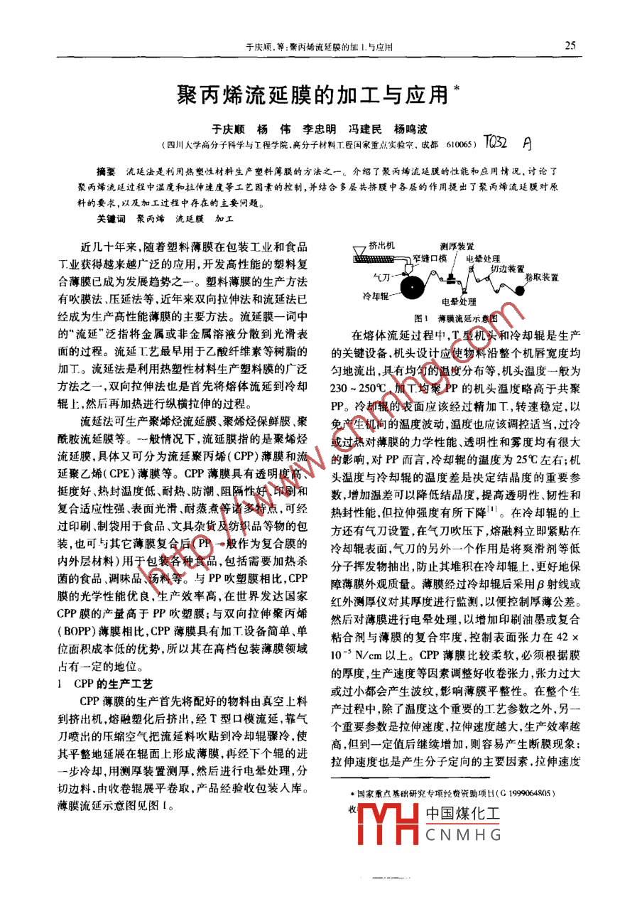于慶順.等:聚丙烯流延膜的加L與應(yīng)用聚丙烯流延膜的加工與應(yīng)用于慶順楊偉李忠明馮建民楊鳴波(四川大學(xué)高分子科學(xué)與工程學(xué)院高分子材料工程國家重點(diǎn)實(shí)驗(yàn)空,成都610065)擴(kuò)要流延法是利用熱塑性材料生產(chǎn)塑料薄膜的方法之一。介紹了聚丙烯流延?xùn)V的性能和應(yīng)用情況,討論了聚丙烯流延過程中溫度和拄忡速度等工藝因素的控剌,并結(jié)合多層共擠膜中各層的作用提出了聚丙烯流延膜對(duì)原料的要求,以及加工過程中存在的主要問題。關(guān)鍵詞聚丙烯流延膜加工近幾十年來,隨著塑料薄膜在包裝工業(yè)和食品擠出機(jī)測(cè)厚裝置丁業(yè)獲得越來越廣泛的應(yīng)用,開發(fā)高性能的塑料復(fù)窄縫口模!電暈處理合薄膜已成為發(fā)展趨勢(shì)之一。塑料薄膜的生產(chǎn)方法卷取裝置有吹膜法壓延法等,近年來雙向拉伸法和流延法已冷卻輥電暈處理經(jīng)成為生產(chǎn)高性能薄膜的主要方法。流延膜一詞中圖1薄膜流延示意圖的“流延”泛指將金屬或非金屬溶液分散到光滑表在熔體流延過程中,T型機(jī)頭和冷卻輥是生產(chǎn)面的過程。流延工藝最早用于乙酸纖維素等樹脂的的關(guān)鍵設(shè)備,機(jī)頭設(shè)計(jì)應(yīng)使物料沿整個(gè)機(jī)唇寬度均加工。流延法是利用熱塑性材料生產(chǎn)塑料膜的廣泛勻地流出,具有均勻的溫度分布等,機(jī)頭溫度一般為方法之一,雙向拉伸法也是首先將熔體流延到冷卻230-250℃,加T均聚P的機(jī)頭溫度略高于共聚輥上,然后再加熱進(jìn)行縱橫拉伸的過程。PP。冷卻輥的表面應(yīng)該經(jīng)過精加τ,轉(zhuǎn)速穩(wěn)定,以流延法可生產(chǎn)聚烯烴流延膜、聚烯烴保鮮膜聚免產(chǎn)生機(jī)向的溫度波動(dòng),溫度也應(yīng)該調(diào)控適當(dāng),過冷酰胺流延膜等。一般情況下,流延膜指的是聚烯烴或過熱對(duì)薄膜的力學(xué)性能、透明性和霧度均有很大流延膜,具體又可分為流延聚丙烯(CPP)薄膜和流的影響,對(duì)PP而言冷卻輥的溫度為25℃左右;機(jī)延聚乙烯(CPE)薄膜等。CP薄膜具有透明度高、頭溫度與冷卻輥的溫度差是決定結(jié)晶度的重要參挺度好、熱封溫度低、耐熱、防潮、阻隔性好、印刷和數(shù),增加溫差可以降低結(jié)晶度,提高透明性、韌性和復(fù)合適應(yīng)性強(qiáng)表面光滑耐蒸煮等諸多特點(diǎn),可經(jīng)熱封性能但拉伸強(qiáng)度有所下降1。在冷卻輥的上過印刷制袋用于食品、文具雜貨及紡織品等物的包方還有氣刀設(shè)置在氣刀吹壓下,熔融料立即緊貼在裝,也可與其它薄膜復(fù)合后(P般作為復(fù)合膜的冷卻輥表面氣刀的另外一個(gè)作用是將爽滑劑等低內(nèi)外層材料)用于包裝各種食品,包括需要加熱殺分子揮發(fā)物抽出,防止其堆積在冷卻輥上,更好地保菌的食品、調(diào)味品、湯料等。與PP吹塑膜相比,CP障薄膜外觀質(zhì)量。薄膜經(jīng)過冷卻輥后采用β射線或膜的光學(xué)性能優(yōu)良,生產(chǎn)效率高,在世界發(fā)達(dá)國家紅外測(cè)厚儀對(duì)其厚度進(jìn)行監(jiān)測(cè),以便控制厚薄公差。CP膜的產(chǎn)量高于P吹塑膜;與雙向拉伸丙烯然后對(duì)薄膜進(jìn)行電暈處理,以增加印刷油墨或復(fù)合(BOPP)薄膜相比,CPP薄膜具有加T設(shè)備簡(jiǎn)單、單粘合劑與薄膜的復(fù)合牢度,控制表面張力在42位面積成本低的優(yōu)勢(shì),所以其在高檔包裝薄膜領(lǐng)域10-3N/cm以上。CPP薄膜比較柔軟,必須根據(jù)膜占有一定的地位。的厚度,生產(chǎn)速度等因素調(diào)整好收卷張力張力過大1CPP的生產(chǎn)工藝CPP薄膜的生產(chǎn)首先將配好的物料由真空上料或過小都會(huì)產(chǎn)生波紋,影響薄膜平整性。在整個(gè)生到擠出機(jī),熔融塑化后擠出,經(jīng)T型口模流延,靠氣產(chǎn)過程中,除了溫度這個(gè)重要的工藝參數(shù)之外,另一個(gè)重要參數(shù)是拉伸速度,拉伸速度越大,生產(chǎn)效率越刀噴出的壓編空氣把流延料吹貼到冷卻輥驟冷,使高,但到一定值后繼續(xù)增加,則容易產(chǎn)生斷膜現(xiàn)象其平整地延展在輥面上形成薄膜,冉經(jīng)下個(gè)輥的進(jìn)步冷卻,用測(cè)厚裝置測(cè)厚然后進(jìn)行電暈處理,分拉伸速度也是產(chǎn)生分子定向的主要因素,拉伸速度切邊料,由收卷輥展平卷取,產(chǎn)品經(jīng)驗(yàn)收包裝入庫。國家重點(diǎn)基礎(chǔ)研究專項(xiàng)經(jīng)費(fèi)資助項(xiàng)(G19990485薄膜流延示意圖見圖I。TH中國煤化工CNMHG程塑料應(yīng)用2002年第30卷第11期越大、分子沿機(jī)向方向的取向程度越大,通過調(diào)節(jié)拉國 MONTELL公司、日本窒素公司及新加坡TPC公伸速度的大小還可以調(diào)節(jié)薄膜的厚度司等。國內(nèi)CPP膜的開發(fā)和研究起步較晚,牌號(hào)種2(PP膜的生產(chǎn)原料類少,產(chǎn)量低,加工和使用性能與進(jìn)口原料相比都還20世紀(jì)80年代,PP流延膜多為單層,進(jìn)人90有相當(dāng)?shù)牟罹?。年?多層復(fù)合擠出逐漸成為主流,現(xiàn)在已經(jīng)向5層3CPP膜加工中存在的主要問題和7層共擠流延方向發(fā)展。多層共擠復(fù)合薄膜采用在CPP的生產(chǎn)和應(yīng)用中,主要存在兩大問題了性質(zhì)不同的材料,具有單層流延膜無法比擬的優(yōu)其一為拉伸速度小,增大拉伸速度則容易斷膜,國產(chǎn)點(diǎn)
