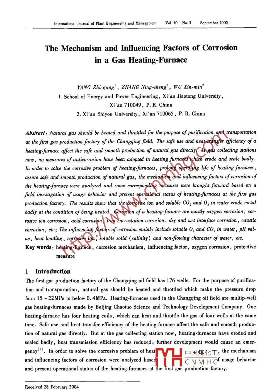 Intemational Jourmal of Plant Engineering and Management Vol 10 No. 3 September 2005The Mechanism and Influencing Factors of Corrosionin a gas Heating-furnaceYANG Zhi-gang, ZHANG Ning-sheng, WU Xin-min1. School of Energy and Power Engineering, Xi'an Jiaotong UniversityXi'an 710049. P. R. China2. Xi'an Shiyou University, Xi'an 710065, P.R. ChinaAbstract: Natural gas should be heated and throttled for the purpose of purification and transportationat the first gas production factory of the Changqing field. The safe use and heat-transfer efficiency of aheating-furnace affect the safe and smooth production of natural gas directly. At gas collecting stationsnow, no measures of anticorrosion have been adopted in heating furnaces which erode and scale badly.In order to solve the corrosive problem of heating-furnaces, prolong operating life of heating-furnacesassure safe and smooth production of natural gas, the mechanism and influencing factors of corrosion ofthe heating-furnace were analyzed and some corresponding measures were brought forward based on afield investigation ofbehavior and present operational status of heating-furnaces at the first gasproduction factory. The results show that the corrosive ion and soluble Co2 and 0, in water erode metalbadly at the condition of being heated. Corrosion of a heating furnace are mostly oxygen corrosion, cor-rosie ion corrosion, acid corrosion, iron encrustation corrosion, dry and wet interface corrosion, causticcorrosion, etc; The influencing factors of corrosion mainly include soluble 02 and CO2 in water, pH val-ue, heat loading, corrosive ion, soluble solid (salinity )and non-flowing character of water,etc.Key words: heating-furnace, corrosion mechanism, influencing factor, oxygen corrosion, protective1 IntroductionThe first gas production factory of the Changqing oil field has 176 wells. For the purpose of purification and transportation, natural gas should be heated and throttled which make the pressure dropform 15-22MPa to below 0. 4MPa. Heating-furnaces used in the Changqing oil field are multip-wellgas heating-furnaces made by Beijing Chaotuo Science and Technology Development Company. Oneheating-furnace has four heating coils, which can heat and throttle the gas of four wells at the sametime. Safe use and heat-transfer efficiency of the heating-furnace affect the safe and smooth produetion of natural gas directly. But at the gas collecting station now, heating-furmaces have eroded andscaled badly, heat transmission efficiency has reduced; further development would cause an emer-gency(] In order to solve the corrosive problem of heat山中國煤化工, the mechanismd influencing factors of corrosion were analyzed baseCNMHGf usage behaviorand present operational status of the heating-furnaces at the first gas production factorReceived 28 February 2004184International Journal of Plant Engineering and Management Vol. 10 No. 3 September 20052 Field investigationFume outlet Makeup water2. 1 Usage behavior of the heating-furnace Gas inlet /t-Source gasHeating-furnaces use gas as the fuel and use waPre-throttle gaster as heat carrier to heat pre-throttle gas. In theheating-furnace, gas goes in inner pipes and wa.HearthFurnace mantleter is in the furnace mantle. The structure ofFigure 1 Structure of heating-furnaceheating-furnace is shown in Figure 1Processing parameter of the heating-furnace( case of the heating-furnace at middle 13 gas collectingstation is as followsRated load is 400k W; inner pipe pressure is 25 Mpa; heat efficiency is 82% operating pressure isnormal atmosphere; material of furnace is mainly carbon steel; volume of the furnace mantle is about8.5 m: operating temperature is about 90C; makeup water is about 17.0 m per year; enrichedmultiple is 2.0-3.0(estimation); temperature of the gas inter station taken is 0-60C,mean annual temperature is 30C. After being heated, the temperature is more than 50c before beingthrottled)and 15-25 C( after being throttled)2.2 Corrosion status of the heating-furnaceHeating-furnaces were checked after they had operated for a long time, it found that (1)Corrosicwas serious at the upper part of waterside of the wall; (2)Corrosion was inside of the heating coil(gas side), but corrosion was serious outside of the heating coil; a thick reddish and black rustyscale attached on the pipe wall; (3)Some of the deposit appears on the whole wall of the furnacemantle and the coil pipe was black burr; some was black, rusty and knotty. The waterside of thefume pipe has attached scale layered corrosion products and some granular black viscositybuildup; ( 4) The surface of metal under deposit buildup appeared pitted with a rut and groove ofcorrosion after it was cleanedAfter observing the corrosion shape of heating-fumaces, it was found that the main corrosion of heating-furnaces were general corrosion( uniform corrosion), ulcer corrosion, dot etching,etc.Ulcercorrosion and dot etching were mainly factors of generation burr rust. The damage of ulcer corrosionto the metal surface was deeper, and the wound was bigger. Dot etching made the surface of themetal produce round pitting corrosion, which depth was inequable and closeness was unequal. Thesetwo kinds of corrosion belong to local corrosion, by comparison; the damage of them to equipmentand the hazard degree of them are far heavier than uniform corrosion3 Mechanism and influencing factors of corrosion of heating-furnaceCorrosion and its form were different with different parts of the waterside of the heating-furnaces. Themajor reason of these phenomena relates to many factors such as different heat engineering state and difaferent corrosion reason, etc. The water for the heating-fuml中國煤化工 on factory is lifewater(groundwater)of the Jingbian base station. The qualitCNMH Gty and low hardness. The corrosive ion and soluble CO, and 0, are in the water, which could erode metal badly at thecondition of being heated. By study of the corrosion form of different par