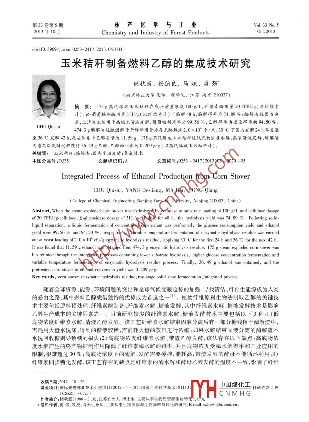 第33卷第5期林產(chǎn)化學(xué)與工業(yè)Vol 33 No 52013年10月Chemistry and Industry of Forest ProductsOct.2013di:10.3969/j.isn.0253-2417.2013.05.004玉米秸稈制備燃料乙醇的集成技術(shù)研究儲秋露,楊德良,馬斌,勇強(南京林業(yè)大學(xué)化學(xué)工程學(xué)院,江蘇南京210037)摘要:175g蒸汽爆破玉米秸稈在底物質(zhì)量濃度100gL,纖維素酶用量20FUg(以纖維素計)、β-葡萄糖苷酶用量3πU/g(以纖維素計)下酶解48h,酶解得率為74.89%;酶解液經(jīng)固液分離,上清液濃縮用于髙糖濃淸液發(fā)酵,葡萄糖利用率為99.56%,乙醇得率為理論得率的94.50%;CHU Oiu-lu474.3g酶解渣經(jīng)釀酒酵母于酵母用量為每克酶解渣2.0×10°個/克、30℃下固態(tài)發(fā)酵24h再變溫至36℃發(fā)酵42h,反應(yīng)體系中乙醇質(zhì)量為1.59g。175g蒸汽爆破玉米秸稈經(jīng)低底物濃度水解、高濃清液發(fā)酵、酶解渣固態(tài)變溫發(fā)酵過程獲得36.49g醇,乙醇轉(zhuǎn)化率為θ.209g/g(以蒸汽爆破玉米秸稈計)。關(guān)鍵詞:玉米秸稈;酶解渣;固態(tài)變溫發(fā)酵;集成技術(shù)中圖分類號:TQ35文獻標(biāo)識碼:A文章編號:0253-2417(2013)05-0020-05Integrated Process of ethanol production from Corn stoverCHU Qiu-lu, YANG De-liang, MA Bin, YONG QiangCollege of Chemical Engineering, Nanjing Forestry University, Nanjing 210037, China)Abstract: When the steam exploded corn stover was hydrolyzed by cellulase at substrate loading of 100 g/L and cellulase dosageof 20 FPIU/ g-cellulose, B-glucosidase dosage of 31U/g-cellulose for 48 h, the hydrolysis yield was 74. 89 % Following solidliquid separation, a liquid fermentation of concentrated supernatant was performed, the glucose consumption yield and ethanolyield were 99. 56 and 94. 50 % respectively. Variable temperature fermentation of enzymatic hydrolysis residue was carrieout at yeast loading of 2.0 x 10 cfu/g enzymatic hydrolysis residue, applying 30 C for the first 24 h and 36 C for the next 42 h.It was found that 11. 59 g ethanol was obtained from 474. 3 g enzymatic hydrolysis residue. 175 g steam exploded corn stover wasbio-refinied through the intergrated processes containing lower substrate hydrolysis, higher glucose concentration fermentation andvariable temperature fermentation of enzymatic hydrolysis residue process. Finally, 36. 49 g ethanol was obtained, and thepretreated corn stover-to-ethanol conversion yield was 0. 209 g/gKey words: corn stover; enzymatic hydrolysis residue; two-stage solid state fermentation; integrated process隨著全球資源、能源、環(huán)境問題的突出和全球氣候變暖趨勢的加強,尋找清潔、可再生能源成為人類的必由之路,其中燃料乙醇憑借獨特的優(yōu)勢成為首選之一。植物纖維原料生物法制取乙醇的關(guān)鍵技術(shù)主要包括原料預(yù)處理、纖維素酶制備、纖維素水解、糖液發(fā)酵,其中纖維素水解、糖液發(fā)酵技術(shù)是影響乙醇生產(chǎn)成本的關(guān)鍵因素之一。目前研究較多的纖維素水解、糖液發(fā)酵技術(shù)主要包括以下3種:1)低底物濃度纖維素水解、清液乙醇發(fā)酵。該工藝?yán)w維素水解結(jié)朿固液分離后有一部分糖殘留于酶解渣中,需耗用大量水洗滌,得到的糖液較稀,需消耗大量的蒸汽進行濃縮;如果水解結(jié)束固液分離的酶解渣不水洗回收糖則導(dǎo)致糖的損失;2)高底物濃度纖維素水解、帶渣乙醇發(fā)酵,該法存在以下缺點:高底物濃度水解產(chǎn)生的終產(chǎn)物抑制作用降低了纖維素酶水解的得率,并且底物濃度受酶水解得率和工業(yè)應(yīng)用的限制,很難超過30%;高底物濃度下的酶解、發(fā)酵需要攪拌,能耗高;帶渣發(fā)酵的酵母不能循環(huán)利用;3)纖維素同步糖化發(fā)酵,該工藝存在的缺點是纖維素的酶水解和酵母乙醇發(fā)酵的溫度不一致,影響了纖維收稿日期:2012-10-26基金項目:國際先進林業(yè)技術(shù)引進項目(2012-4-18);國家自然科學(xué)基金項目(31中國煤化工科研創(chuàng)新計劃(CXZZ1-0527)CNMHG作者簡介:儲秋露(1986-),女,江蘇宜興人,博士生,主要從事生物質(zhì)資源生物轉(zhuǎn)化的硎究*通訊作者:勇強,教授,博士生導(dǎo)師,主要從事生物質(zhì)資源生物降解與轉(zhuǎn)化的研究;E-mail:swhx@njfu,com.cn第5期儲秋露,等:玉米秸稈制備燃料乙醇的集成技術(shù)研究素的酶水解過程和乙醇發(fā)酵過程,從而限制了該法在工業(yè)上的應(yīng)用。綜上所述,從生產(chǎn)成本角度出發(fā),目前研究的主要幾種植物纖維原料纖維素酶水解、糖液發(fā)酵工藝均存在著一些問題,有待于進一步優(yōu)化。本研究探討了玉米秸稈制取燃料乙醇的集成技術(shù),包括低底物濃度酶水解,高糖濃清液發(fā)酵和酶解渣固態(tài)變溫發(fā)酵,可為提高纖維素乙醇生產(chǎn)效率、降低纖維素生物煉制燃料乙醇的成本提供依據(jù)。1實驗1.1菌種釀酒酵母( Saccharomyces cerevisiae)NLH3,乙醇發(fā)酵菌株,于4℃保存在葡萄糖瓊脂斜面培養(yǎng)基上,由南京林業(yè)大學(xué)生物化工研究所保存。1.2纖維素酶和B-葡萄糖苷酶纖維素酶購于 Sigma公司濾紙酶活力l02FPUg,B-葡萄糖苷酶活力2.50U/g;β-葡萄糖苷酶,購于 Sigma公司,B-葡萄糖苷酶酶活力504IU/g1.3原料預(yù)處理玉*秸稈粉碎至3-5cm,在3.5L蒸汽爆破裝置中于1.5~2.2MPa、停留時間2-6min下進行預(yù)處理。預(yù)處理后的物料用蒸餾水(總料液比1:10(g:mL))分3次洗滌、抽濾后得到的濾渣,即為蒸汽爆破玉米秸稈。蒸汽爆破玉米秸稈儲存于密封袋中,于4℃冰箱中平衡水分2d,備用。蒸汽爆破玉米秸稈中