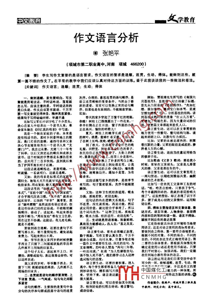 中文數(shù)目作文語(yǔ)言分析回張艷平(項(xiàng)城市第二職業(yè)高中,河南項(xiàng)城466200 )[摘要]學(xué)生寫作文重要的是語(yǔ)言要求,作文語(yǔ)言的要求是通順,連貫,生動(dòng),得體。能做到這些,就算- -篇不錯(cuò)的作文了。在平常的教學(xué)中我們應(yīng)該認(rèn)真對(duì)待這方面的訓(xùn)練。鑒于此我談?wù)勎业囊恍┳龇ê涂捶?。[關(guān)鍵詞]作文語(yǔ)言; 通順;連貫;生動(dòng);得體-.做到通順,首先要明白,寫文次序.合理的,意思連貫的語(yǔ)句順序,是例如:賈祖璋先生所寫的《南國(guó)六章就是用筆說(shuō)話,平時(shí)話咋說(shuō),落筆就語(yǔ)言連貫順暢的重要條件。當(dāng)然由于修月荔枝丹》,直接用- -句古詩(shī)做了標(biāo)題,怎么寫。應(yīng)該注意的是,平時(shí)說(shuō)話用的辭的需要,常??梢宰儞Q正常的語(yǔ)句順首先從白居易的《荔枝圖序》,“殼如紅是口頭語(yǔ),作文應(yīng)該是書面語(yǔ)。千萬(wàn)不序,但那也是有原則的,不能隨意穿插。著,膜如紫綃,氟肉瑩臼]如冰雪,漿液寫文章就覺得神圣,精神高度緊張,比如:甘酸如醴酪”引入,分析荔枝的結(jié)構(gòu),講結(jié)果句子寫得磕磕絆絆,半通不通春天的家鄉(xiāng)穿起了萬(wàn)紫千紅的艷裝。到荔枝成熟時(shí)候的景象“紅云幾萬(wàn)重",你瞧!樹枝上已微微露出了一些花來(lái)。一更增加了絢麗色彩。因?yàn)榇罅吭?shī)詞的引決心在家人中培養(yǎng)出一個(gè)讀書人來(lái),革串串杜鵑花正在開放,窗子外面的小鳥用,使整篇文章都起來(lái)膾炙人口。命家朱德在《回憶我的母親》中寫道:正在高興、愉快的唱歌兒!語(yǔ)言要生動(dòng),還可以在文章需要的我是一個(gè)佃農(nóng)家庭的子弟,本來(lái)是夏天,樹枝上的嫩芽長(zhǎng)成了一片片地方使用一些整句,整句結(jié)構(gòu)勻稱,讀沒(méi)有錢讀書的。那時(shí)鄉(xiāng)間豪紳地主的欺的樹葉。清晨,蜜蜂憶著采蜜。午后,匆起來(lái)朗朗上口,比散句有力深沉.壓,衙門差役的蠻機(jī),過(guò)得母親和父親了在樹上長(zhǎng)鳴.夜晚,蟋蟀在草叢上高歌。比如:父輩的血液是滾熱的,積聚決心節(jié)衣縮食培養(yǎng)出一個(gè)讀書人來(lái)“支到了秋天,全部都穿著金紅色的晚著沉默的力量:父輩的眼淚是咸澀的,摻撐門戶”。我念過(guò)私塾,光緒三十一年考禮服,田野里,到處都是金紅色的果子,拌著人生的心酸。了科舉,以后又到更遠(yuǎn)的順慶和成都去農(nóng)民伯伯正在彎腰割麥子。大街上的樹語(yǔ)言要生動(dòng), 還應(yīng)當(dāng)注意運(yùn)用恰當(dāng)讀書。這個(gè)時(shí)候的學(xué)費(fèi)都是東攥西借來(lái)葉,蕭蕭的落下,地上、房頂1.全是落葉.的,總共用了二百多快錢,直到我后來(lái)冬天的家鄉(xiāng)換上了樸素的雪白上袍。比如歌曲《父親》歌詞:那是我小當(dāng)了護(hù)國(guó)軍旅長(zhǎng)時(shí)才還清.在家鄉(xiāng)小鎮(zhèn)的街道上到處都是雪。讓我時(shí)候, 常坐在父親肩頭,父親是兒那登這段話就通順練達(dá),表意明確,一想起了以前學(xué)過(guò)的古詩(shī)《梅花:墻角數(shù)天的梯,父親是那拉車的牛。昕就懂,懂,一看看就明白,這就是通順。枝梅,凌寒獨(dú)自開.遇知不是雪,為有語(yǔ)言要生動(dòng),還可以在文章里用上又如:我的母親是標(biāo)準(zhǔn)式的家庭中暗香來(lái)。一兩句俚語(yǔ),以期收到雅俗共賞,幽默國(guó)婦女,她每天天不亮就早早起來(lái)做飯, .這段話描寫家鄉(xiāng)的四季,是按季節(jié)詼諧的藝術(shù)效果。收拾家務(wù),周而復(fù)始,整天累得腿疼腰酸。來(lái)寫的,句子緊密聯(lián)系,次序不能隨便比如寫一位農(nóng)民工父親和工友的對(duì)這段話里的“標(biāo)準(zhǔn)式”應(yīng)改為“標(biāo)顛倒。話,“唉,咱苦點(diǎn)怕噙,只要孩子爭(zhēng)氣,本式”,“家庭中國(guó)”應(yīng)改為“中國(guó)家庭”,又如:這種衛(wèi)生紙經(jīng)濟(jì)適用,吸水考個(gè)半戴圓圖磚的,我就拍著屁股唱大才合乎現(xiàn)代漢語(yǔ)習(xí)慣?!疤觳涣?就表示力強(qiáng),質(zhì)地柔軟,歡迎選購(gòu)。戲了”。話雖然俚俗,卻正表現(xiàn)了識(shí)字不起床很早,后面的“早早”屬重復(fù)。表這句話的內(nèi)在邏輯關(guān)系混亂,句子多,望子成龍心切的父親情懷,運(yùn)用貼示“腿疼腰酸”雖然說(shuō)沒(méi)有語(yǔ)法錯(cuò)誤,但不連貫,應(yīng)先談質(zhì)地,再說(shuō)功能, 然后是這些俗語(yǔ)已經(jīng)約定俗成,不能隨便顛說(shuō)實(shí)用價(jià)值,就比較合乎事理了。所以四、得體主要指語(yǔ)言和文章體裁.囊倒順序,移動(dòng)了,讀起來(lái),聽起來(lái)都會(huì)這個(gè)詞應(yīng)改為:“這種衛(wèi)生紙,質(zhì)地柔達(dá)方式,語(yǔ)言環(huán)境,人物身份,表現(xiàn)得覺得不順當(dāng)。“周而復(fù)始”帶有文言色彩,軟,吸水力強(qiáng),經(jīng)濟(jì)適用,歡迎選購(gòu)"。內(nèi)容和目的等的和諧-致,語(yǔ)言不得體,用在這里不協(xié)謂。這段話,有幾處毛病,三、生動(dòng)就是用語(yǔ)準(zhǔn)確,形象鮮明,就收不到應(yīng)有的表達(dá)效果就是不通順。具有活力能感動(dòng)人.古人云:“言之無(wú)文,它是指根據(jù)具體語(yǔ)言環(huán)境恰當(dāng)?shù)厥挂龅秸Z(yǔ)言通順,還要注意句子不行而不遠(yuǎn)”用語(yǔ)言,這是對(duì)語(yǔ)言使用的高標(biāo)準(zhǔn)