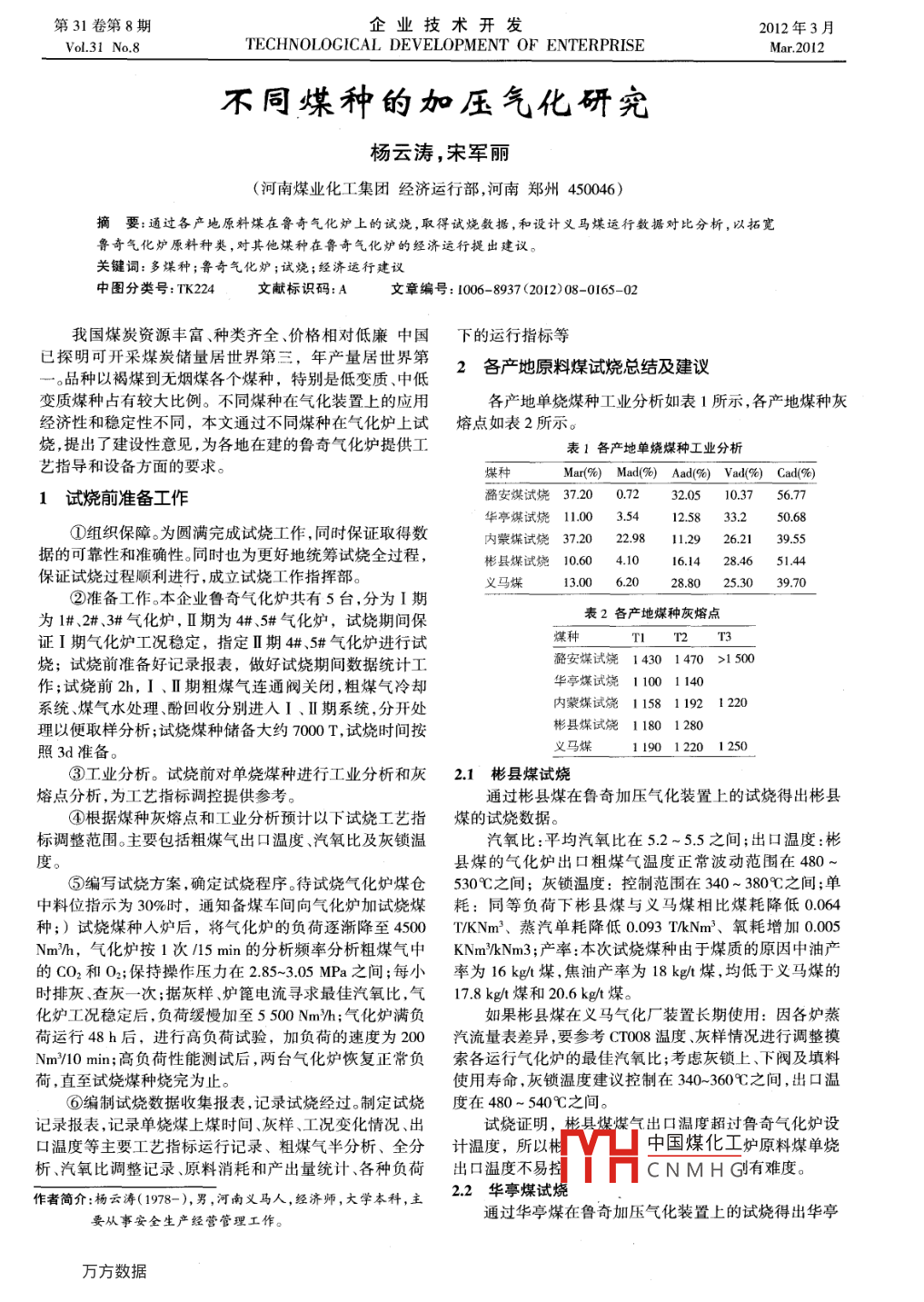 第31卷第8期企業(yè)技術(shù)開發(fā)2012年3月Vol 31 No 8TECHNOLOGICAL DEVELOPMENT OF ENTERPRISEMar.2012不同媒種的加壓氣化研究楊云濤,宋軍麗(河南煤業(yè)化工集團經(jīng)濟運行部,河南鄭州450046)摘要:通過各產(chǎn)地原料煤在魯奇氣化爐上的試燒,取得試燒敫據(jù),和設(shè)計義馬煤運行數(shù)據(jù)對比分析,以拓寬魯奇氣化爐原料種類,對其他煤種在魯奇氣化爐的經(jīng)濟運行提出建議。關(guān)鍵詞:多煤種;魯奇氣化爐;試燒;經(jīng)濟運行建議中圖分類號:TK224文獻標識碼:A文章編號:1006-8937(2012)08-0165-02我國煤炭資源豐富、種類齊全、價格相對低廉中國下的運行指標等已探明可開采煤炭儲量居世界第三,年產(chǎn)量居世界第。品種以褐煤到無煙煤各個煤種,特別是低變質(zhì)、中紙2各產(chǎn)她原料煤試燒總結(jié)及建議變質(zhì)煤種占有較大比例。不同煤種在氣化裝置上的應(yīng)用各產(chǎn)地單燒煤種工業(yè)分析如表1所示,各產(chǎn)地煤種灰經(jīng)濟性和穩(wěn)定性不同,本文通過不同煤種在氣化爐上試熔點如表2所示。燒,提出了建設(shè)性意見,為各地在建的魯奇氣化爐提供工表1各產(chǎn)地單燒媒種工業(yè)分析藝指導(dǎo)和設(shè)備方面的要求煤種Mar(%) Mad(%) Aad(%) Vad(%)Cad(%)1試燒前準備工作酪安煤試燒37200.72320510.375677華亭煤試燒11.003.54125833.250.68①組織保障。為圓滿完成試燒工作,同時保證取得數(shù)內(nèi)紫煤試燒3720229811.2926.213955據(jù)的可靠性和準確性。同時也為更好地統(tǒng)籌試燒全過程,彬縣煤試燒10604.1016.14284651保證試燒過程順利進行,成立試燒工作指揮部。義馬煤13.006.20288025.3039.70②準備工作。本企業(yè)魯奇氣化爐共有5臺,分為I期為1#、2#、3#氣化爐,Ⅱ期為4#、5#氣化爐,試燒期間保表2各產(chǎn)地煤種灰熔點證Ⅰ期氣化爐工況穩(wěn)定,指定Ⅱ期4#、5#氣化爐進行試TI T2T3燒;試燒前準備好記錄報表,做好試燒期間數(shù)據(jù)統(tǒng)計工酪安煤試燒14301470>1500作;試燒前2h,Ⅰ、Ⅱ期粗煤氣連通閥關(guān)閉,粗煤氣冷卻華亭煤試燒11001140系統(tǒng)、煤氣水處理、酚回收分別進人Ⅰ、Ⅱ期系統(tǒng),分開處內(nèi)蒙煤試燒115811921220理以便取樣分析;試燒煤種儲備大約7000T,試燒時間按彬縣煤試燒11801280照3d準備義馬煤11901220I250③工業(yè)分析。試燒前對單燒煤種進行工業(yè)分析和灰2.1彬縣煤試燒熔點分析,為工藝指標調(diào)控提供參考。通過彬縣煤在魯奇加壓氣化裝置上的試燒得出彬縣④根據(jù)煤種灰熔點和工業(yè)分析預(yù)計以下試燒工藝指煤的試燒數(shù)據(jù)。標調(diào)整范圍。主要包括粗煤氣出口溫度、汽氧比及灰鎖溫汽氧比:平均汽氧比在52~55之間;出口溫度:彬度縣煤的氣化爐出口粗煤氣溫度正常波動范圍在480⑤編寫試燒方案,確定試燒程序。待試燒氣化爐煤倉530℃之間;灰鎖溫度:控制范圍在340~380℃之間;單中料位指示為30%時,通知備煤車間向氣化爐加試燒煤耗:同等負荷下彬縣煤與義馬煤相比煤耗降低0.064種;)試燒煤種入爐后,將氣化爐的負荷逐漸降至4500T/KNm3、蒸汽單耗降低0.093Tk№m'、氧耗增加0.005Nmh,氣化爐按1次/5min的分析頻率分析粗煤氣中 KNm/k Nn3;產(chǎn)率:本次試燒煤種由于煤質(zhì)的原因中油產(chǎn)的CO2和O2;保持操作壓力在2.85~305MPa之間;每小率為16k煤,焦油產(chǎn)率為18kg煤,均低于義馬煤的時排灰、查灰一次;據(jù)灰樣、爐篦電流尋求最佳汽氧比,氣17.8kg煤和20.6kg煤?;癄t工況穩(wěn)定后,負荷緩慢加至5500Nm沿h;氣化爐滿負如果彬縣煤在義馬氣化廠裝置長期使用:因各爐蒸荷運行48h后,進行高負荷試驗,加負荷的速度為200汽流量表差異,要參考CT8溫度、灰樣情況進行調(diào)整摸Nm0min;高負荷性能測試后,兩臺氣化爐恢復(fù)正常負索各運行氣化爐的最佳汽氧比;考慮灰鎖上、下閥及填料荷,直至試燒煤種燒完為止。使用壽命,灰鎖溫度建議控制在340-360℃之間,出口溫⑥編制試燒數(shù)據(jù)收集報表,記錄試燒經(jīng)過。制定試燒度在480~540℃之間記錄報表,記錄單燒煤上煤時間、灰樣、工況變化情況、出試燒證明,彬具煤煤氣出口溫度超過魯奇氣化爐設(shè)口溫度等主要工藝指標運行記錄、粗煤氣半分析、全分計溫度,所以村中國煤化工爐原料煤單燒析、汽氧比調(diào)整記錄、原料消耗和產(chǎn)出量統(tǒng)計、各種負荷出口溫度不易CNMH有難度。作者簡介:楊云濤(1978-),男,河南義馬人,經(jīng)濟師,大學本科,主2.2華亭煤試燒要從事安全生產(chǎn)經(jīng)營管理工作。通過華亭煤在魯奇加壓氣化裝置上的試燒得出華亭企業(yè)技術(shù)并發(fā)2012年3月煤的試燒數(shù)據(jù)低爐出口溫度,增加氣化爐操作彈性,建議適當增加氣化汽氧比:平均汽氧比在55~59之間;出口溫度:華爐的高度。亭煤的氣化爐出口粗煤氣溫度正常波動范圍在400~24內(nèi)蒙煤試燒450℃之間;灰鎖溫度:控制范圍在310~340℃之間;單通過內(nèi)蒙煤在魯奇加壓氣化裝置上的試燒得出內(nèi)蒙耗:同等負荷下華亭煤與義馬煤相比煤耗降低O.146煤試燒數(shù)據(jù)TkNm3、蒸汽單耗降低0.14T/KNm3、氧耗增加0.005汽氧比:平均汽氧比在7.0~7.1;出口溫度:內(nèi)蒙煤TNm3;產(chǎn)率:本次試燒煤種由于煤質(zhì)的原因中油產(chǎn)率為的氣化爐出口粗煤氣溫度正常波動范圍在200-230℃之23.28k歐煤,焦油產(chǎn)率為32.8kg煤,均高于義馬煤的間;灰鎖溫度:控制范圍在300~350℃之間;