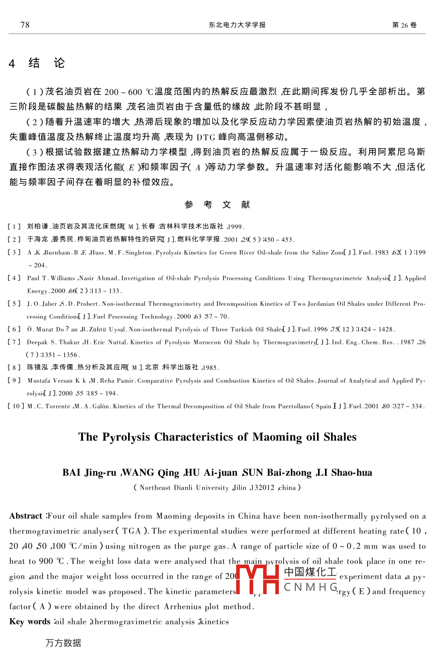東北電力大學(xué)學(xué)報(bào)第26卷第2期Journal Of Northeast Dianli UniversityVol 26, No. 22006年4月Natural Science editionApr.2006文章編號(hào):1005-299X(2006)2-0073-06茂名油頁(yè)巖的熱解特性柏靜儒王擎胡愛(ài)娟孫佰仲李少華東北電力大學(xué)能源與機(jī)械工程學(xué)院吉林吉林132012摘利用熱重分析儀在非等溫條件下對(duì)茂名兩個(gè)礦區(qū)的四種油頁(yè)巖進(jìn)行了熱解試驗(yàn)研究試中以高純氮?dú)庾鳛檩d氣采用不同的升溫速率(10、20、40、50、100℃/min)加熱到900℃。粒徑范圍00.2mm。由失重曲線可知油頁(yè)巖的熱解主要集中在200~600℃的溫度區(qū)間。最后根據(jù)試驗(yàn)數(shù)據(jù)建立了熱解動(dòng)力學(xué)模型利用阿累尼烏斯直接作圖法求得表觀活化能E廂和頻率因子(A)等動(dòng)力學(xué)參數(shù)關(guān)鍵詞油頁(yè)巖重分析動(dòng)力學(xué)中圖分類(lèi)號(hào):TQ533.6文獻(xiàn)標(biāo)識(shí)碼:A油頁(yè)巖是礦物機(jī)體中含有固體可燃有機(jī)質(zhì)的細(xì)粒沉積巖屬于腐泥類(lèi)煤,由水生物等浮游植物、低等浮游動(dòng)物經(jīng)腐敗作用和煤化作用而生成1中國(guó)是世界上油頁(yè)巖資源豐富的國(guó)家之一約為2萬(wàn)億噸已探明的油頁(yè)巖儲(chǔ)量為315.67億噸僅次于美國(guó)、俄羅斯、巴西、愛(ài)沙尼亞、扎伊爾列世界第六位且主要集中于茂名、樺甸和撫順等地的55個(gè)礦區(qū)2。本文在非等溫條件下對(duì)茂名油頁(yè)巖的熱解特性進(jìn)行了試驗(yàn)硏究為油頁(yè)巖的干餾和直接燃燒提供了理論依據(jù)。在世界能源需求不斷增長(zhǎng)的今天油頁(yè)巖作為一種替代的能源資源尋求其有效開(kāi)發(fā)與經(jīng)濟(jì)利用的途徑對(duì)于緩解能源供需矛盾推動(dòng)社會(huì)的發(fā)展具有重大的現(xiàn)實(shí)意義。試驗(yàn)部分1.1試驗(yàn)樣品樣品采用廣東茂名金塘礦區(qū)一層、二層、三層、舊營(yíng)礦區(qū)五層的油頁(yè)巖分別記以S1、S2、S3、S4試樣經(jīng)磨煤機(jī)研曆后再經(jīng)瑪瑙硏缽研磨而成粒徑范圍為0~0.2mm。期間對(duì)油頁(yè)巖未進(jìn)行仼何篩分處理以保證油頁(yè)巖的原始特性。其工業(yè)分析及元素分析的結(jié)果如表1所示。油頁(yè)巖具有含碳量低、灰份高、發(fā)熱值低的特性屬高灰份低熱值燃料宜就地就近綜合利用。表1油頁(yè)巖的工業(yè)分析和元素分析工業(yè)分析元素分析M/%V/%73388012.6022.1668.03580316.230.75l1.164774中國(guó)煤化工69641.231.2試驗(yàn)設(shè)備和試驗(yàn)條件CNMHG試驗(yàn)采用美國(guó) Perkin elmer公司生產(chǎn)的 Pyris I TGa熱重分析儀以99.99%的高純氮?dú)庾鳛檩d收稿日期2006-01-08基金項(xiàng)且家科技部十五"重點(diǎn)科技攻關(guān)項(xiàng)目(2004BA907A24)凊林省高??萍寂c社科十五”科技項(xiàng)目作者簡(jiǎn)癤葙鷸#1973-)女東北電力大學(xué)能源與機(jī)械工程學(xué)院講師中國(guó)石油大學(xué)在讀博土研究生74東北電力大學(xué)學(xué)報(bào)第26卷氣流量80mL/min。氮?dú)庵饕脕?lái)維持爐內(nèi)的惰性氣氛同時(shí)及時(shí)將油頁(yè)巖熱解產(chǎn)生的揮發(fā)性產(chǎn)物帶離樣品從而盡可能降低二次反應(yīng)的影響樣品重量控制在10mg左右。升溫速率(β)分別采用10℃/min20℃/ min 40℃/min50℃/min,100℃/min熱解終溫為900℃2結(jié)果和分析2.1熱解特性圖1~4分別給出了試樣S1、S2、S3、S4在不同升溫速率下的熱解失重(TG及微商失重(DTG)線。油頁(yè)巖的熱解經(jīng)歷了以下幾個(gè)不同的階段從室溫至200℃左右為低溫區(qū)的失重主要是水分的析出其中包括內(nèi)部水、粘土礦物的層間水3通常在該段的質(zhì)量損失被用來(lái)測(cè)量樣品的含水率。這階段的曲線表現(xiàn)為T(mén)G曲線下滑,DTG曲線出現(xiàn)一個(gè)峰。在200~600℃的失重區(qū)間這一階段的熱解是油頁(yè)巖熱解的主要部分主要是碳?xì)浠衔锏姆纸鈱?dǎo)致TG曲線大的滑坡和DTG曲線上的尖峰。一般認(rèn)為油母巖質(zhì)裂解為油、氣和半焦產(chǎn)物的過(guò)程是分兩步進(jìn)行的即油母巖質(zhì)先裂解為焦油焦油再裂解獲得最終的產(chǎn)物。但由圖1~4上看油頁(yè)巖兩步反應(yīng)不明顯,其與巴基斯坦4和約旦5油頁(yè)巖的熱解有相似的結(jié)果。其他的學(xué)者對(duì)土耳其61和摩洛哥7油頁(yè)巖進(jìn)行試驗(yàn)得到兩步反應(yīng)結(jié)果。也許是與油頁(yè)巖的種類(lèi)有關(guān)。不管曲線的形狀表現(xiàn)的是步反應(yīng)還是兩步反應(yīng)油頁(yè)巖熱解的真實(shí)機(jī)理是相當(dāng)復(fù)雜的它包含了一系列的串行和并行反應(yīng)。600℃以上油頁(yè)巖S1、S2失重約3~5%而油頁(yè)巖S3、S4只發(fā)生了輕微的失重。一般認(rèn)為此溫度階段是由于諸如方解石、白云石和富鐵白云石等碳酸鹽的裂解。同時(shí)由于CO3(碳酸鹽熱解產(chǎn)物)的存在在高溫下其與剩余碳發(fā)生反應(yīng)如+CO2→CO)產(chǎn)生一氧化碳,也使油頁(yè)巖產(chǎn)生一定的失重油頁(yè)巖S3、SA在這一階段的熱解量不明顯可能是由于碳酸鹽礦物質(zhì)含量低的緣故2--20C/min3-40℃/min54-50℃/min5-100℃/min2--20C/mip3---40c/mit(a)TG曲線(b)DTG曲線圖1油頁(yè)巖S1在不同升溫速率下的TG和DTG曲線1-10C/min3--40C/min4-50℃/min5-100℃/min中國(guó)煤化工34thmnCNMHG 4--50C/min501002003004005006007008009000100200300400500600700800900