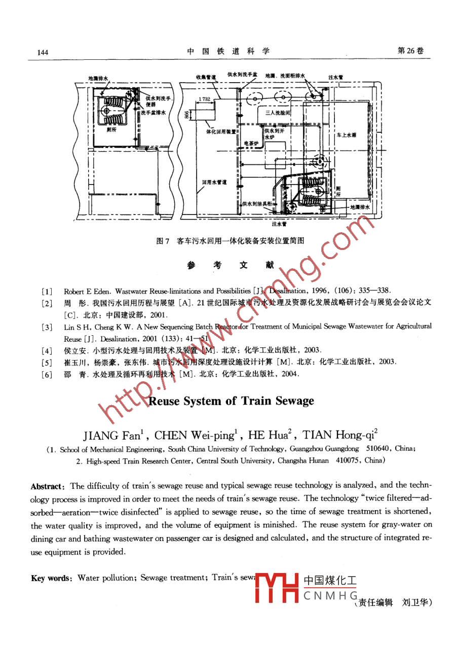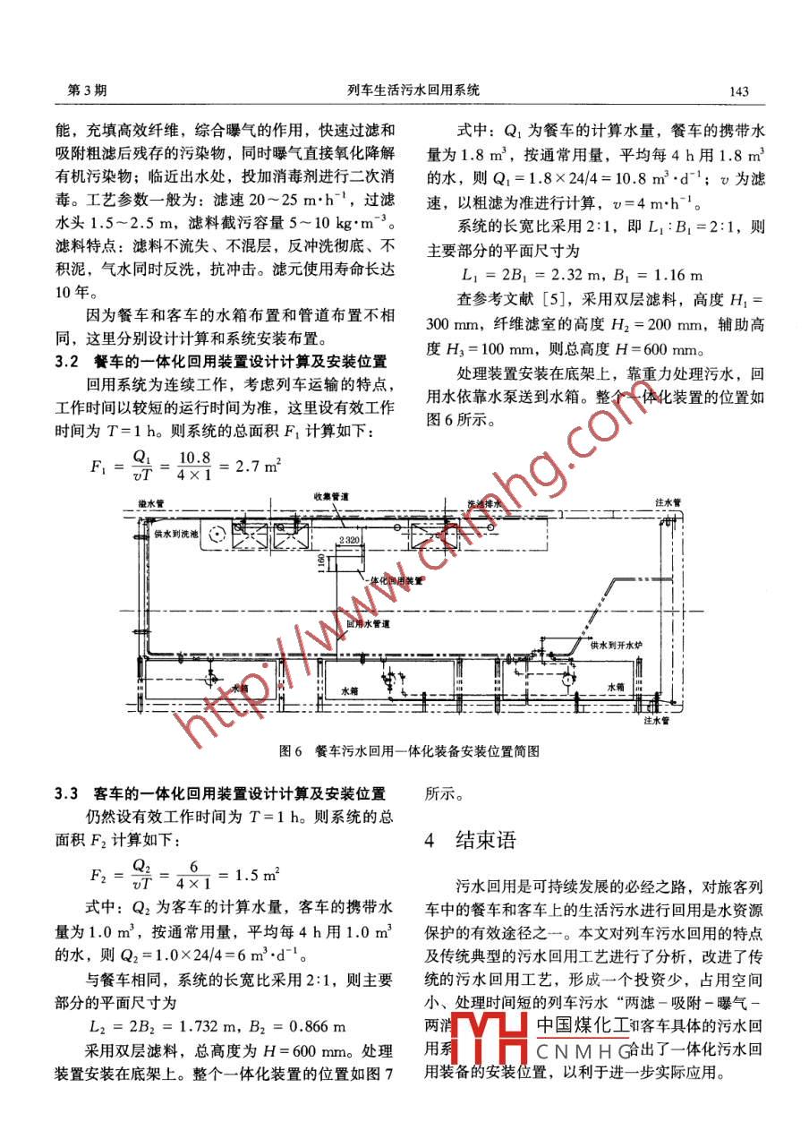 第26卷,第3期中國鐵道科學(xué)Vol.26 No.32005年5月CHINA RAILWAY SCIENCEMay, 2005文章編號: 1001-4632 (2005) 03-0141-04●成果簡報.列車生活污水回用系統(tǒng)江帆',陳維平',何華2,田紅旗2(1.華南理工大學(xué)機械工程學(xué)院,廣東廣州510640; 2. 中南大學(xué)高速列車研究中心,湖南長沙410075)摘要: 分析列車生活污水回用的難點及典型的污水回用工藝,對污水回用典型工藝進行改進。采用“兩濾-吸附一曝氣-兩消毒”污水回用工藝,使得污水處理時間縮短、出水水質(zhì)提高、占有空間減小。并就餐車的雜排水和客車的洗浴排水回用系統(tǒng)分別進行設(shè)計計算,給出一體化回用裝置結(jié)構(gòu)。關(guān)鍵詞:水污染;污水處理;列車生活污水;回用系統(tǒng)中團分類號: X731 .031文獻標識碼: B在長途旅行列車上,旅客使用過的水,污染雜于列車車輛的制造成本,設(shè)計污水回用系統(tǒng)時應(yīng)平質(zhì)只占0.1%左右,比海水的3.5%少得多。污水.衡處理效果和制造費用的矛盾,達到污水回用與運經(jīng)過適當再生處理,可以重復(fù)利用“"。列車上供水行消耗的統(tǒng)一量的約80%變?yōu)樯钗鬯懦?,如果收集起來?.2列車生活污水回用水質(zhì)指標生處理后70%可以安全回用,就有列車上供水量2000年3月20日國務(wù)院令頒布了水污染防治的一半以上可以變成再生水。本文根據(jù)列車運行本法實施細則,其第21條明確規(guī)定:“生活飲用水地身的特點及用水的要求,研究適合列車應(yīng)用的生活表水源一級保護區(qū)內(nèi)的水質(zhì)適用國家‘地表水環(huán)境污水回用工藝及裝備系統(tǒng),以節(jié)約珍貴的水資源。質(zhì)量標準’I類標準,二級保護區(qū)內(nèi)的水質(zhì)適用國家皿類標準?!盜類標準中關(guān)于有機物綜合性指標1列車生活污水回用系統(tǒng)特點及技術(shù)有CODa,BOD3與高錳酸鹽指數(shù)(即耗氧量指標0OD),相應(yīng)的限值是15, 3, 4 mg'L1。1.1 列車生活污水回用系統(tǒng)特點2列車生活污水回用工藝列車在鐵道線路.上不停地運行,受空間結(jié)構(gòu)、運行時間、制造成本的影響,使得列車生活污水回2.1污水回用典型工藝用具有一-定的難度,因此,設(shè)計合理的列車生活污.列車.上生活污水有三種形式:餐車上的雜排水回用系統(tǒng)應(yīng)具有如下特點。水,旅客洗浴排水,大小便沖洗排水。針對這三類1)整個回用系統(tǒng)應(yīng)緊湊。列車是-一個狹長體,污水回用的典型工藝[4)為:雜排水回用工藝流程如大部分空間用來承載旅客,而設(shè)備安裝空間很小,圖1所示;洗浴排水回用工藝流程如圖2所示;便必須采用處理空間小、質(zhì)量輕的設(shè)備體系。沖洗排水回用工藝流程如圖3所示。2)處理時間短。列車運行時間有限,為能及. 上述回用水處理工藝處理效果及出水水質(zhì)典型時迅速地將車上的生活污水進行回用處理,要選用值如表1所示。(或設(shè)計)工藝流程短的污水回用工藝。2.2列車生活污水回用工藝3)處理效益高。列車上污水回用的使用對象中國煤化工點,對污水回用系統(tǒng)是旅客,要求處理效果好、處理水質(zhì)高,另外,限的,MYHCN MH C面的改進:因為便收稿日期: 2004-06-04作者簡介:江帆(1974-),男,湖南慈利人,博士研究生?;痦椖?廣東省科技攻關(guān)計劃(2003C34504)142中國鐵道科學(xué)第26卷沖洗排水回用處理工藝復(fù)雜,回用周期長,暫不對用同-套設(shè)施進行回用處理,使系統(tǒng)結(jié)構(gòu)緊湊。工其進行處理;而將雜排水與洗浴排水工藝合一,采藝流程如圖4所示。[凝聚劑C接觸氧化[雜排水了一最浮物過路著一砂也一[話性炭了便沖洗排水了一[接觸氧化了一[沉淀了一過雄C發(fā)聚劑[國用水]--- 加壓]←一[水池]國用水←C加壓]←水池[消毒劑]圖1雜排水回用工藝流程圖圖3便沖排水回用工藝流程圖| ,凝聚劑凝聚劑雜排水| 洗浴排水毛發(fā)過濾器矽雄一活性炭[粗過雄器纖維精館「洗俗排水FL[ 消毒劑清毒劑.圓用水 ]C 加壓上口水箱國用水加壓t水池圖4列車污水回用工藝流程圖圖2洗浴排水回用工藝流程圖表1處理效果及 出水水質(zhì)指標CODBOD3 .ABS色度細菌總數(shù)總大腸菌群水酒水質(zhì)/(mgLI) /(mg"L~1) /(mg*L"I) /(mg*L-I)度pH值1(個.mL-1) 1(個.mL-")原污水水質(zhì)8358432.87.62.1x 1051.8X 10*回用水水質(zhì)5.20.40.17.55<3處理效果/%94999)687722.77.72.2x 1061.7x 10%優(yōu)年回用水水質(zhì)3.800.27.8排水98)3002981481192.0527.0105~ 10610* ~107便沖洗21.31.20.05.67.2排才采用圖4所示的“兩濾一吸附一曝氣- -兩消進水粗罅查殼體毒”污水回用工藝:采用粗濾方式去除毛發(fā)、懸浮物等雜質(zhì);采用高效纖維快濾工藝實現(xiàn)過濾- -吸附疑聚劑消毒劑一體化,去除膠體有機物和部分溶解性有機物;并反洗管事氣在粗濾前和回用前實施消毒。對比改進前的工藝,整個回用工藝流程短,投資少,空間小??斓率叶蜗?列車生活 污水回用裝備系統(tǒng)構(gòu)造水圖5列車污水回用- -體化裝備系統(tǒng)簡圖3.1 列車生活污水回用裝備系統(tǒng)設(shè)計計算中國煤化工根據(jù)_上述列車污水回用工藝流程,結(jié)合列車的水箱及管道布置,設(shè)計出適合列車生活污水回用的MHCNMHG,濾去毛發(fā)及一-些懸-體化裝備系統(tǒng),如圖5所示。系統(tǒng)主要由粗濾浮雜質(zhì);投加凝聚劑加速污水膠體的混凝,以便被室、高效纖維快濾室、加凝聚劑和加消毒劑裝置、無煙煤粗濾掉,同時投加