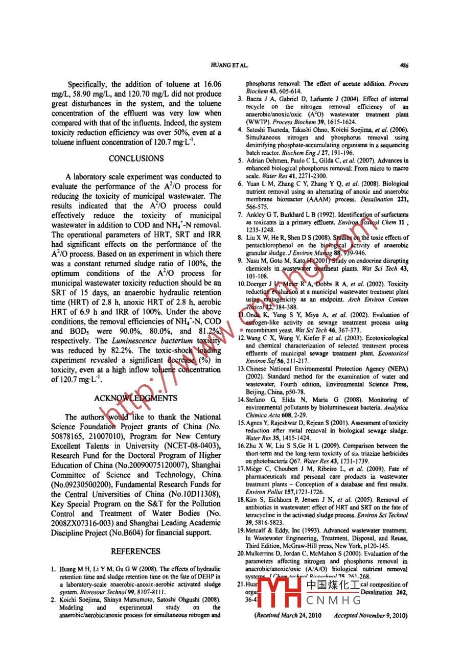 BIOMEDICAL AND ENVIRONMENTAL SCIENCES 23, 481-486 (2010)www.besjoural.comToxicity Reduction of Municipal Wastewater byAnaerobic-anoxic-oxic Process'MAN-HONG HUANGt, YONG-MEI LI*,AND Guo-WeIGU*"State Key Laboratory of Pollution Control and Resources Reuse, College of EnvironmentalScience and Engineering, Tongji Universiy, Shanghai 200092, China;* College of Environmental Science and Engineering,Donghua University, Shanghai 201620, ChinaObjeetive This study was conducted to optimize the operational parameters of anaerobic anoxic-oxic (A7/O) processesto reduce the toxicity of municipal wastewater and evaluate its ability to reduce toxicity. Methods A lumincscent bacteriumtoxicity bioassay was employed to assess the toxicity of infuent and efluent of each reactor in the A/0 system. ResultsThe optimum operational parameters for toxicity reduction were as fllows: anacrobic hydraulic retention time (HRT)-2.8 h,anoxic HRT = 2.8 h, aerobic HRT = 6.9 h, sludge retention time (SRT) = 1S days and intemnal recyele ratio (IRR) = 100% Animportant toxicity reduction (%) was observed in the optimized A7/O process, even when the toluene concentration of theinfluent was 120.7 mg:L" . Conclusions The toxicity of municipal wastewater was reduced significantly during the A/Oprocess. A/0 process can be used for toxicity reduction of municipal wastewater under toxi-shock loading.Key words: A/O process; Municipal wastewater, Toxicity reduction; Process opimizaion; Toxic-shock loadingINTRODUCTIONachievedl+dl. However, few studies have focused onthe ability of the A/O process to reduce the toxicityAssessment and optimization of wastewaterof municipal wastewater.treatment processes are often based on the polutantIt is well known that municipal wastewaterremoval efficiency. Wastewater treatment wascontains many types of toxicants with the potential tooriginally developed with the primary goal of ham humans'However, analyses forreducing odor in receiving waters; therefore, BODsconventional indices, such as COD and singleand SS were the primary evaluation indices. Later, intoxicant analysis, cannot enable a complete responsethe 1970s, nitrogen and phosphorus removal wereto the potential adverse effects of wastewater onrequired to protect the reeiving waters fromwildlife and humans due to the different interactionseutrophication. As a result, many existing wastewaterand biological activities found in municipaltreatment facilities were upgraded to accomplish thiswastewater' 4. With the development of wastewatergoal. Among the available advanced biologicalreuse, there has been increased community concemwastewater treatment processes, A/O was often usedover the ecotoxicicology and environmental safety offor simultaneous nitrogen and phosphorus removal.wastewater. Thus, there has been great demand forIndeed, this method has been applied widely duringevaluation of the ability of curently availablethe last three decades in municipal wastewaterwastewater treatment processes to reduce toxicity.treatment plants (MWWTPs). Witb the developmentAccordingly, the present study was conducted toof reactor kinetics and a better knowledge ofoptimize the operational parameters of the A/Omicrobiology ecosystems, many advances in theprocess and evaluate its toxicity reduction ability. Theremoval of conventional items by A7/0 have beenA/O process was conducted at the laboratory-scale'This study was supported by the National Science Foundation Project grants of China (No. 50878165, No.21007010), the Program forNew Century Excellent Talents in University (NCET-08 0403), the Research Fund for the Doctoral Program of Higher Education of China(No. 20090075120007), the Shanghai Commitee of Science and Technology, China (No.09230500200), the Fundamental Research Funds forthe Central Universities of China (No.10D1 1308), the Key Special Program on the S&T for the Pollution Control and Treatment of WaterBodies (No.2008ZX07316-003) and the Shanghai Leading Academic Discipline Project (No.B604)."Correspondence should be adressed to Yong-Mei LI. Tel: 86-21-65982693; Fax: 86-21-65986313; E mail: liyongmei@#edu.cnBiographical note of the flrst author;: Dr. Man-Hong HUANG, is an associate professor and fellow at the Collge of EnviromentalScience and Engineering, Donghua University, majoring in water pollution and b中國(guó)煤化工TYHCNMH Gb0Copyright o 2010by China CDC481HUANG ET AL.48o investigate the toxicity reduction potential in thissystem was operated in a room with a constantsystem. The effects of the hydraulic retention timetemperature of25 C.(HRT), sludge retention time(SRT) and intermalrecycle ratio (IRR) on both toxicity and nutientCalculationsremoval were investigated. In addition, toluene wasThe pollutant concentrations in anaerobic, anoxic,added to assess the toxic-shock resistance of theand aerobic reactors were calculated according to Eq.biological treatment process.(1)-(3):MATERIALS AND METHODS,= C+RxCa(11+RLuminescence Bacterium Toxicity BioassayCa= 1+R)xC+rxC(21+R+rA 15-min standard luminescence bacteriumCg=C2(3toxicity bioassay was conducted according to theThe overall pollutant removal efficiency of thestandard methods of national environmentalA7/0 system was calculated according to Eq. (4).protection agency (NEPA)"3]. The freeze driedOverall pollutant removal efficiencymarine bacterium (Photobacterium phosphoreum)(%)=. Cx2-(Q -QJ)xC.-Q.xC,100% (4)and the testing instrument (toxicity analyzer modelCxQDXY-2) were purchased from the Institute of SoilScience, Academic Sciences, Nanjing PRC. ToxicityThe total percentage of pollutant removed fromwas measured using the DXY-2 instrument bythe influent was obtained by taking the sum of thequantifying the decrease in light emission from thepercentage of the pollutants removed by the anaerobic,bacteria that occurred in response to exposure of theanoxic, aerobic and settling reactors. These percentageswastewater to 3% NaCl solution for 15 min. Thewere calculated using Eq. (5)-(8), respective