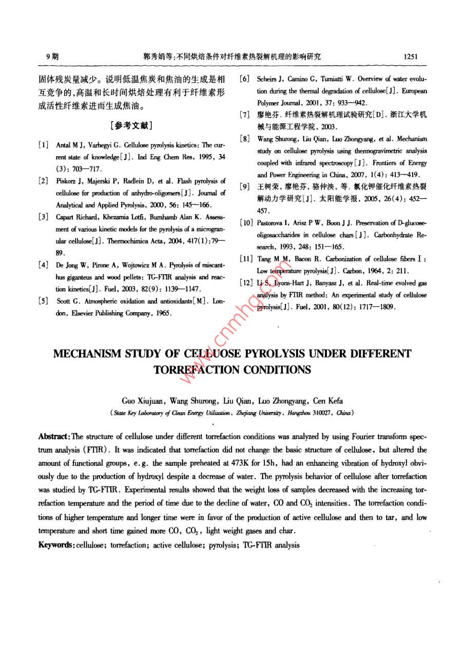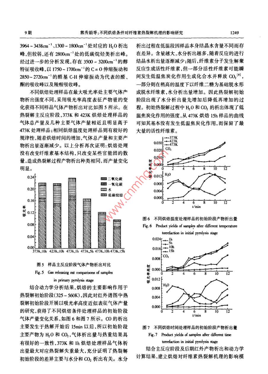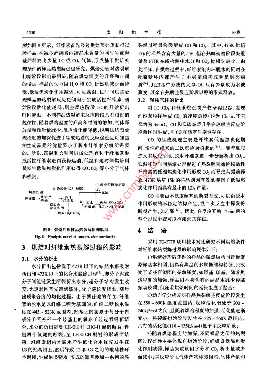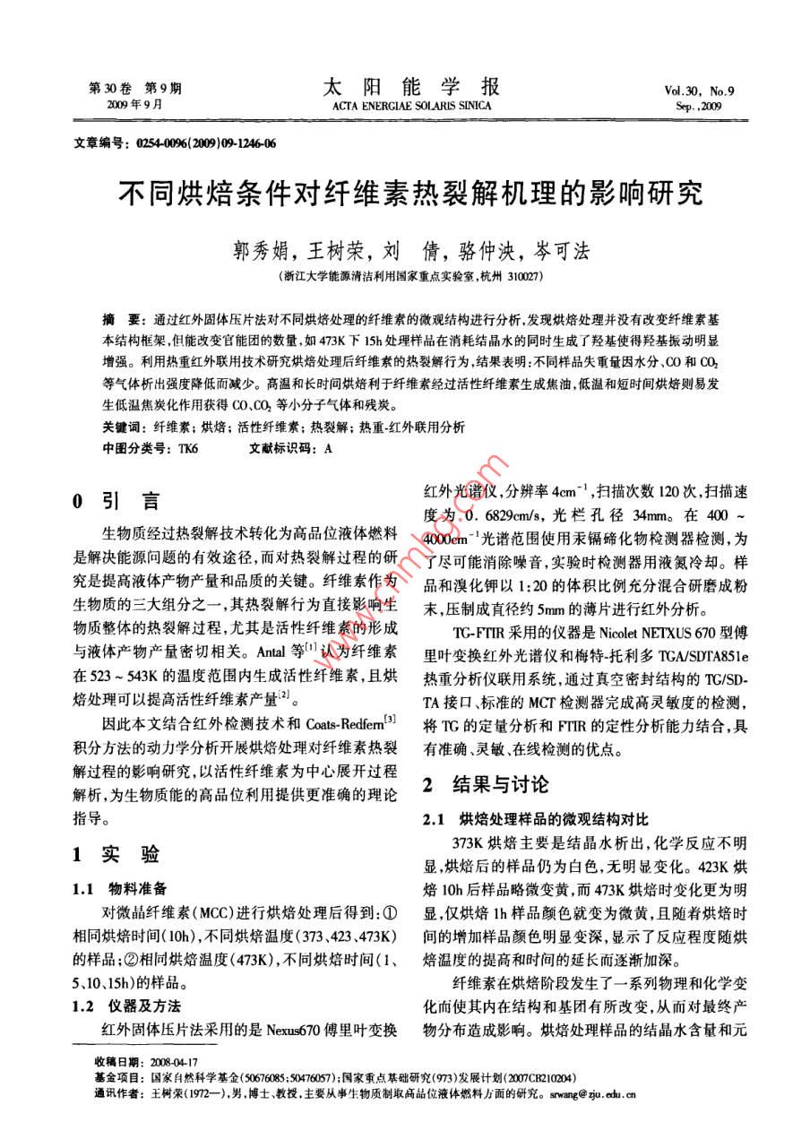 第30卷第9期太陽能學報Vol.30, No.92009年9月ACTA ENERGIAE SOLARIS SINICASep. ,2009文章編號: 02540002009)09124606不同烘焙條件對纖維素熱裂解機理的影響研究郭秀娟,王樹榮,劉倩,駱仲泱,岑可法(浙江大學能源清潔利用國家重點實驗室,杭州310027)摘要: 通過紅外固體壓片法對不同烘焙處理的纖維素的微觀結構進行分析,發(fā)現(xiàn)烘焙處理并沒有改變纖維素基本結構框架,但能改變官能團的數(shù)量,如473K下15h處理樣品在消耗結晶水的同時生成了羥基使得羥基振動明顯增強。利用熱重紅外聯(lián)用技術研究烘焙處理后纖維索的熱裂解行為,結果表明:不同樣品失重量因水分.CO和CO2等氣體析出強度降低而減少。高溫和長時間烘焙利于纖維素經過活性纖維素生成焦油,低溫和短時間烘焙則易發(fā)生低溫焦炭化作用獲得COCO2等小分子氣體和殘?zhí)俊jP鍵詞:纖維素;烘焙;活性纖維索;熱裂解;熱重.紅外聯(lián)用分析中圖分類號: TK6文獻標識碼: A紅外光譜儀,分辨率4em~',掃描次數(shù)120次,掃描速0引言度為0. 6829cm/s,光欄孔徑34mm。 在400 ~生物質經過熱裂解技術轉化為高品位液體燃料4000cm='光譜范圍使用汞鎘碲化物檢測器檢測,為是解決能源問題的有效途徑,而對熱裂解過程的研了盡可能消除噪音,實驗時檢測器用液氮冷卻。樣究是提高液體產物產量和品質的關鍵。纖維素作為品和溴化鉀以1:20的體積比例充分混合研磨成粉生物質的三大組分之- - ,其熱裂解行為直接影響生末,壓制成直徑約5mm的薄片進行紅外分析。物質整體的熱裂解過程,尤其是活性纖維素的形成TC-FTIR采用的儀器是Nicolet NETXUS 670型傅與液體產物產量密切相關。Antal 等[1]認為纖維素里葉變換紅外光譜儀和梅特~托利多TGA/SDTA851e在523 ~ 543K的溫度范圍內生成活性纖維索,且烘熱重分析儀聯(lián)用系統(tǒng),通過真空密封結構的TC/SD-焙處理可以提高活性纖維素產量2。TA接口、標準的MCT檢測器完成高靈敏度的檢測,因此本文結合紅外檢測技術和CoatsRedfem[3將TG的定量分析和FTIR的定性分析能力結合,具積分方法的動力學分析開展烘焙處理對纖維素熱裂有準確、靈敏、在線檢測的優(yōu)點。解過程的影響研究,以活性纖維索為中心展開過程2結果與討論解析,為生物質能的高品位利用提供更準確的理論指導。2.1烘焙處理樣 品的微觀結構對比373K烘焙主要是結晶水析出,化學反應不明1實驗顯,烘焙后的樣品仍為白色,無明顯變化。423K 烘1.1物料準備焙l0h后樣品略微變黃,而473K烘焙時變化更為明對微晶纖維素(MCC)進行烘焙處理后得到:①顯,僅烘焙1h樣品顏色就變?yōu)槲ⅫS,且隨著烘焙時相同烘焙時間( 10h) ,不同烘焙溫度(373.423 .473K)間的增加樣品顏色明顯變深,顯示了反應程度隨烘的樣品;②相同烘焙溫度(473K) ,不同烘焙時間(1、焙溫度的提高和時間的延長而逐漸加深。5、10、15h)的樣品。纖維素在烘焙階段發(fā)生了一系列物理和化學變.2 儀器及方法化而使其內在結構和基團有所改變,從而對最終產紅外固體壓片法采用的是Nexus670傅里葉變換物分布造成影響。烘焙處理樣品的結晶水含量和元收稿日期: 2008-04-17基金項目:國家自然科學基金(50676085:50476057);國家重點基礎研究(973)發(fā)展計劃(007CB210204)通訊作者:王樹榮(1972- -),男,博士、教授,主要從事生物質制取高品位液體燃料方面的研究。snwang@ zju. edu. cn9期郭秀娟等:不同烘焙條件對纖維索熱裂解機理的影響研究1247素組成如表1所示。隨著烘焙時間的延長和溫度的多聚糖特性,整體結構沒有發(fā)生根本改變,但峰強卻提高,樣品中結晶水含量明顯減少,同時分子中C和存 在差異,隨著烘焙溫度的提高,3350cmn^'處的成氫H及C和0比率增加,說明烘焙在促進結晶水釋放鍵的0-H振動逐漸減弱,對應于其元素分析中結晶過程可能伴隨有CO或CO2的析出。結合樣品的紅水的變化規(guī)律,說明羥基主要來源于樣品中的結晶外壓片譜圖1和圖2及表2所示的樣品紅外光譜官水;113cm~'處的C-0-H振動和1638cm" '處C= 0振能團歸屬判斷分析烘焙對樣品內部結構產生的影動強度也有所變化。隨著烘焙時間的延長,變化最響。為明顯的0-H振動增強,表明在-定溫度下長時間表1元素分析的烘焙處理生成了羥基,且羥基生成量高于因結晶Table 1 Elemental analysis of seumples水蒸發(fā)而減少的羥基量,使得羥基總體含量增加。樣品M./%分子式在低于393K時,結晶水首先蒸發(fā)出來,隨后在長時MCC6.94CH.20%間或較高溫度下加熱時纖維素分子發(fā)生斷裂,聚合373K, 10h6.11CH,xQ.o度均化,同時發(fā)生水解.氧化、脫氫和脫碳等作用形423K, 10h5.54CH.3O.成自由基,羰基和羥基等主要官能團也逐步產生,形1473K, I0h4.98CH2O3成活性纖維索“。樣品的紅外譜圖中0-H、C-H、473K,1h5.96CH, z1b.g473K,5h5.16CH,O.g3C0-H和C= 0等官能團都有不同程度的變化,證明473K, 10hCH.xOg在烘焙過程中經歷了這些反應。473K,15h4.85CH xOs__表2樣品的紅外光譜官能團分析Table 2 Functional goup analysis of samples by FTIR波數(shù)/em~'官能團.93350成氫鍵的0H伸縮2960- 2900CH伸縮振動孤立的C=C或C= 0雙鍵1465C-0-H變形1431C-H不對稱彎曲0.3.1375CH對稱彎曲10000 2000 3000 40001372,1368,1355C-C-H 變形波長/em'1299,1285CH2-0-H變形圖1不同溫度烘焙 10h樣品的紅外結構譜圖1236COC不對稱變形1200~ 1150CH和COH變形Fig.1 FTR spectrums of trefaction samples for l0h1113, 1069, 1033C-O-H變形1.2F897異化區(qū)β鍵的吸收1.670~ 550cC伸縮振動,2.2 TG-FTIR 結果分析茶0.2.2.1動力學分析