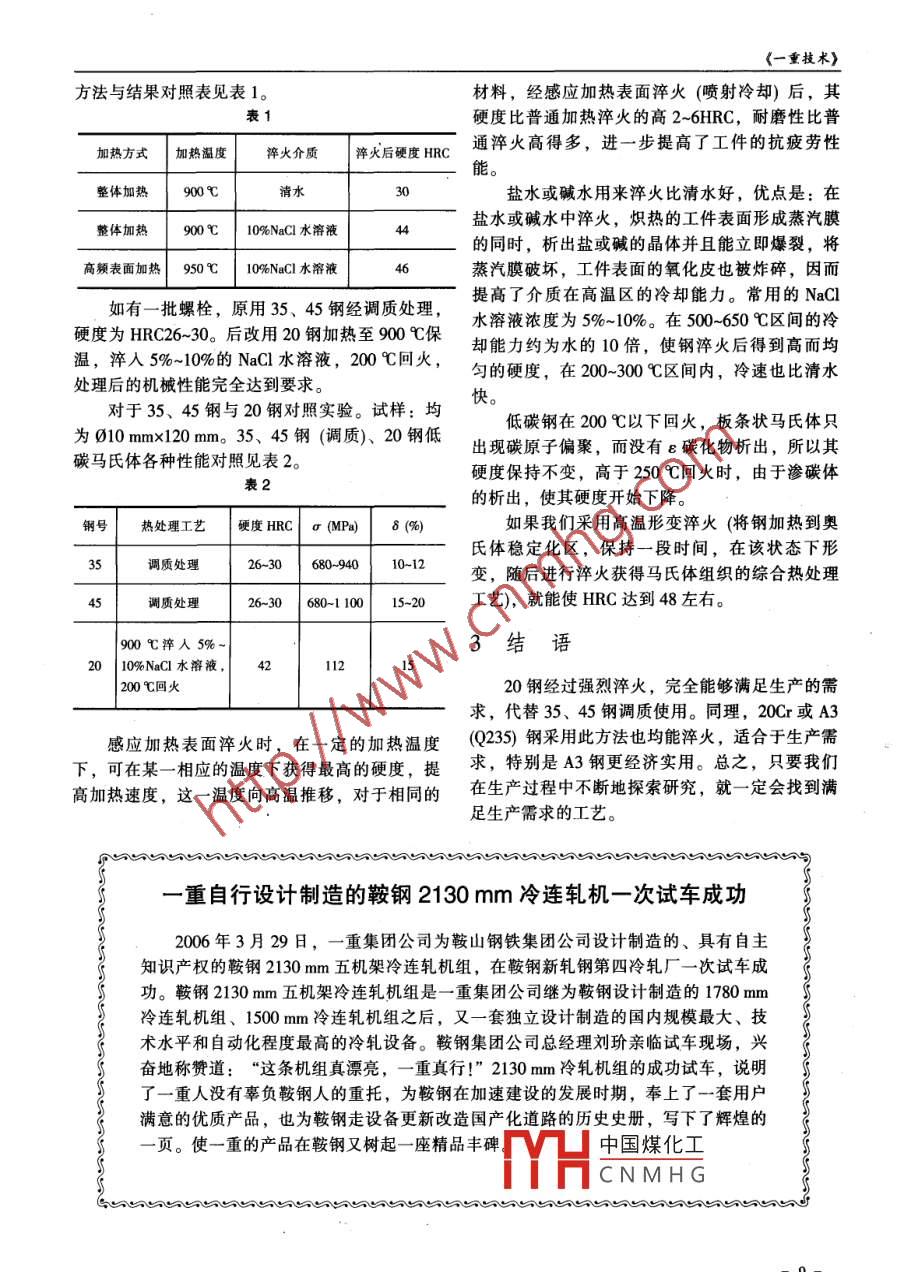2006年第2期(總110期)20鋼淬火工藝陳忠軍1,李峰2(1.黑化集團(tuán)有限公司硝銨廠助理工程師,黑龍江富拉爾基1610412.一重集團(tuán)有限公司工具分廠工程師,黑龍江富拉爾基161041)摘要:研究20鋼的淬火工藝,代替35、45等一些調(diào)質(zhì)鋼。關(guān)鍵詞:低碳馬氏體;調(diào)質(zhì);表面淬火中圖分類號(hào):TG5631文獻(xiàn)標(biāo)識(shí)碼:B文章編號(hào):1673-3355(2006)02-0004-0220-grade Steel Quenching ProcessChen ZhonLi FengAbstract: The quenching process for 20-grade steel is studied in order to substitute some steel QT-treated, suchas 35-grade and 45-grade steelKey words: low-carbon martensite; quenching and tempering treatment(QD); case harden工程中為了滿足使用的需要,對(duì)材料性能提代替調(diào)質(zhì)鋼制造零件。出了的不同要求。而在實(shí)際生產(chǎn)中,有時(shí)也會(huì)遇到材料的代用,如能否用20鋼代替35、45的調(diào)2實(shí)驗(yàn)與分析質(zhì)鋼?這就要求我們對(duì)其熱處理工藝進(jìn)行研究尋求一種合適的工藝來滿足生產(chǎn)需要。普通淬火溫度選擇在AC+30~50℃,而對(duì)于20鋼,屬于低碳鋼,淬火后不容易得到馬氏體組1理論分析織,所以淬火加熱溫度可選擇AC2+40~70℃,較高的溫度可增加鋼的淬透性,但同時(shí)會(huì)降低韌低碳鋼(C<0.25%)或低碳合金鋼在強(qiáng)烈淬火性、增大變形。如果采用表面淬火,由于AC1、水淬,或5%~10%NaCl或10%NaOH水溶液)AC3等的臨界點(diǎn)均隨著加熱速度的增大而增高;后,可得到板條狀低碳馬氏體。這種組織具有板又由于感應(yīng)加熱沒有保溫時(shí)間,要完成奧氏體中條狀形態(tài)及位錯(cuò)型亞結(jié)構(gòu),具有較高的強(qiáng)度,良碳濃度的均勻化,只有依靠升高溫度,因此淬火好的塑性和韌性,在淬火或低溫回火(150~200溫度比已經(jīng)提高了的AC3還要高(AC3+70~100℃)狀態(tài),強(qiáng)度高而塑性、韌性良好。在靜載荷、℃)。這樣形成的奧氏體晶粒更加細(xì)小。感應(yīng)加熱交變載荷及多次沖擊載荷下,缺口敏感性及過載不適用于高硬度、高耐磨和高的接觸疲勞強(qiáng)度的敏感性都較低。此外,低碳鋼在制作零部件的過零件,也不適用于工模具零件。程中還具有獨(dú)特的工藝性能,而且又保持了低碳淬火冷卻時(shí)應(yīng)盡可能地采用強(qiáng)烈冷卻,獲得鋼優(yōu)良的冷成形性和可焊性,具有較小的熱處理最佳的強(qiáng)化效果。一般采用5%~10%NaCl或變形及脫碳傾向等。因此,低碳鋼及低碳合金鋼NaOH水溶液作為冷卻介質(zhì)。水溫不得超過40強(qiáng)烈淬火或低碳馬氏體得到了人們的重視,應(yīng)用℃。中國(guó)煤化工若回火溫度超過日益廣泛,成為發(fā)揮鋼材強(qiáng)韌化潛力、延長(zhǎng)機(jī)器300零件壽命的一個(gè)重要途徑。在某些方面可以用來CNMHG×50m。實(shí)驗(yàn)收稿日期:2005-12-21;修回日期:2006-01-10方數(shù)據(jù)技術(shù)方法與結(jié)果對(duì)照表見表1。材料,經(jīng)感應(yīng)加熱表面淬火(噴射冷卻)后,其表1硬度比普通加熱淬火的高2-6HRC,耐磨性比普加熱方式加熱溫度淬火介質(zhì)淬火后硬度HRC通淬火高得多,進(jìn)一步提高了工件的抗疲勞性能。整體加熱900℃清水鹽水或堿水用來淬火比清水好,優(yōu)點(diǎn)是:在鹽水或堿水中淬火,熾熱的工件表面形成蒸汽膜整體加熱900℃|10%NaC水溶液的同時(shí),析出鹽或堿的晶體并且能立即爆裂,將高頻表面加熱950℃10%NaCl水溶液蒸汽膜破壞,工件表面的氧化皮也被炸碎,因而提高了介質(zhì)在高溫區(qū)的冷卻能力。常用的NaCl如有一批螺栓,原用35、45鋼經(jīng)調(diào)質(zhì)處理,水溶液濃度為5%~10%。在500-650℃區(qū)間的冷硬度為HRC26-30。后改用20鋼加熱至900℃保卻能力約為水的10倍,使鋼淬火后得到高而均溫,淬入5%~10%的NaCl水溶液,200℃回火,勻的硬度,在200~300℃區(qū)間內(nèi),冷速也比清水處理后的機(jī)械性能完全達(dá)到要求。對(duì)于35、45鋼與20鋼對(duì)照實(shí)驗(yàn)。試樣:均快。低碳鋼在200℃以下回火,板條狀馬氏體只為10mm×120mm。35、45鋼(調(diào)質(zhì))、20鋼低碳馬氏體各種性能對(duì)照見表2。出現(xiàn)碳原子偏聚,而沒有ε碳化物析出,所以其硬度保持不變,高于250℃回火時(shí),由于滲碳體表2的析出,使其硬度開始下降鋼號(hào)熱處理工藝硬度 HRC(MPa)8(%)如果我們采用高溫形變淬火(將鋼加熱到奧氏體穩(wěn)定化區(qū),保持一段時(shí)間,在該狀態(tài)下形調(diào)質(zhì)處理680-910-12變,隨后進(jìn)行淬火獲得馬氏體組織的綜合熱處理調(diào)質(zhì)處理26-306801015-20工藝,就能使HRC達(dá)到48左右。900℃淬人5%3結(jié)語2010%NaC水溶液,42112200℃回火20鋼經(jīng)過強(qiáng)烈淬火,完全能夠滿足生產(chǎn)的需求,代替35、45鋼調(diào)質(zhì)使用。同理,20Cr或A3感應(yīng)加熱表面淬火時(shí),在一定的加熱溫度(Q235)鋼采用此方法也均能淬火,適合于生產(chǎn)需下,可在某一相應(yīng)的溫度下獲得最高的硬度,提求,特別是A3鋼更經(jīng)濟(jì)實(shí)用??傊?只要我們高加熱速度,這一溫度向高溫推移,對(duì)于相同的在生產(chǎn)過程中不斷地探索研究,就一定會(huì)找到滿足生產(chǎn)需求的工藝。重自行設(shè)計(jì)制造的鞍鋼2130mm冷連軋機(jī)一次試車成功2003月29日,一重集團(tuán)公司為鞍山鋼鐵集團(tuán)公司設(shè)計(jì)制造的、具有自主知識(shí)產(chǎn)權(quán)的鞍鋼2130mm五機(jī)架冷連軋機(