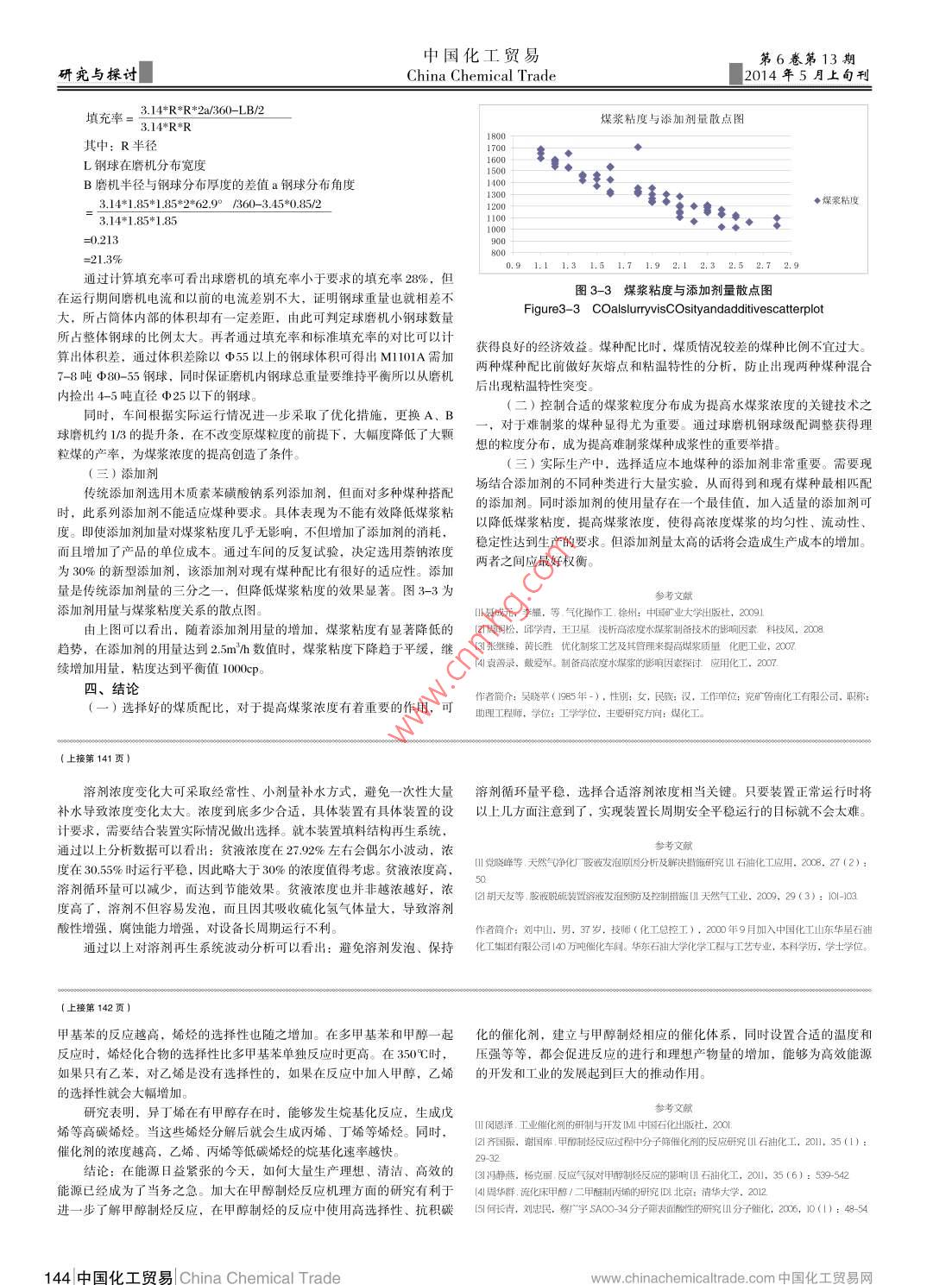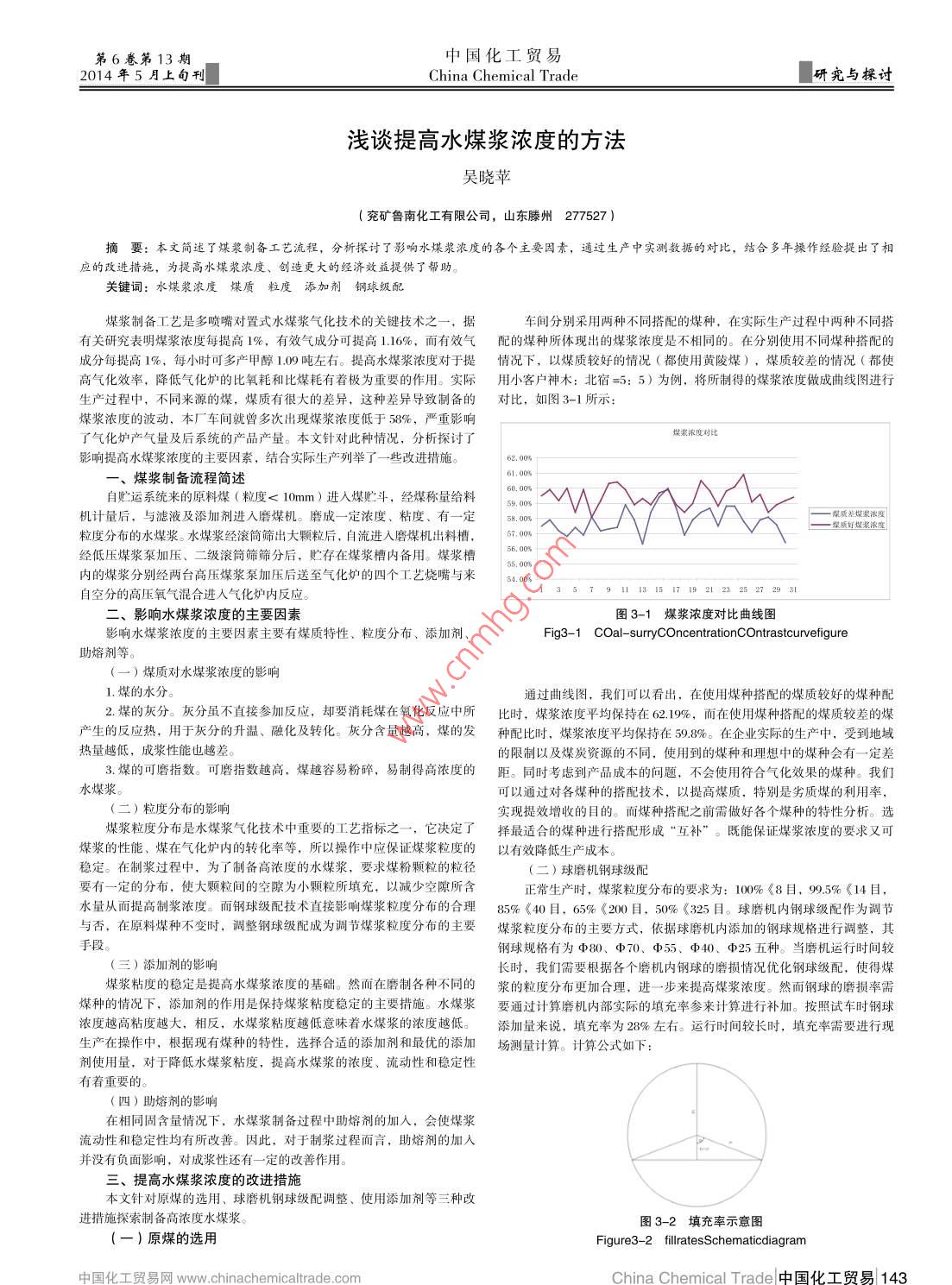 第6卷第13期中國化工貿(mào)易2014年5月上句刊China chemical trade研究與探討淺談提高水煤漿濃度的方法吳曉蘋(兗礦魯南化工有限公司,山東滕州277527)摘要:本文簡述了煤漿制備工藝流程,分析探討了影響水煤漿濃度的各饣主要因素,通過生產(chǎn)中實(shí)測欻據(jù)的對(duì)比,結(jié)合多年操作經(jīng)驗(yàn)提出了相應(yīng)的改進(jìn)措施,為提高水煤漿濃度、創(chuàng)造更大的經(jīng)濟(jì)效益提供了幫助。關(guān)鍵詞:水煤漿濃度煤質(zhì)粒度添加劑鋼球級(jí)配煤漿制備工藝是多噴嘴對(duì)置式水煤漿氣化技術(shù)的關(guān)鍵技術(shù)之一,據(jù)車間分別采用兩種不同搭配的煤種,在實(shí)際生產(chǎn)過程中兩種不同搭有關(guān)研究表明煤漿濃度毎提高1%,有效氣成分可提高1.16%,而有效氣配的煤種所體現(xiàn)出的煤漿濃度是不相同的。在分別使用不同煤種搭配的成分每提高1%,每小時(shí)可多產(chǎn)甲醇l.0噸左右。提高水煤漿濃度對(duì)于提情況下,以煤質(zhì)較好的情況(都使用黃陵煤),煤質(zhì)較差的情況(都使高氣化效率,降低氣化爐的比氧耗和比煤耗有著極為重要的作用。實(shí)際用小客戶神木:北宿=5:5)為例,將所制得的煤漿濃度做成曲線圖進(jìn)行生產(chǎn)過程中,不同來源的煤,煤質(zhì)有很大的差異,這種差異導(dǎo)致制備的對(duì)比,如圖3-1所示:煤漿濃度的波動(dòng),本廠車間就曾多次出現(xiàn)煤漿濃度低于58%,嚴(yán)重影響了氣化爐產(chǎn)氣量及后系統(tǒng)的產(chǎn)品產(chǎn)量。本文針對(duì)此種情況,分析探討了煤槳濃度對(duì)比影響提高水煤漿濃度的主要因素,結(jié)合實(shí)際生產(chǎn)列舉了一些改進(jìn)措施。62.00%、煤漿制備流程簡述自貯運(yùn)系統(tǒng)來的原料煤(粒度<1m)進(jìn)入煤貯斗,經(jīng)煤稱量給料機(jī)計(jì)量后,與濾液及添加劑進(jìn)入磨煤機(jī)。磨成一定濃度、粘度、有一定5煤質(zhì)好煤漿濃粒度分布的水煤漿。水煤漿經(jīng)滾筒篩岀大顆粒后,自流進(jìn)入磨煤機(jī)岀料槽,經(jīng)低壓煤漿泵加壓、二級(jí)滾筒篩篩分后,貯存在煤漿槽內(nèi)備用。煤漿槽內(nèi)的煤漿分別經(jīng)兩臺(tái)高壓煤漿泵加壓后送至氣化爐的四個(gè)工藝燒嘴與來自空分的高壓氧氣混合進(jìn)入氣化爐內(nèi)反應(yīng)357935719212325二、影響水煤漿濃度的主要因素圖3-1煤漿濃度對(duì)比曲線圖影響水煤漿濃度的主要因素主要有煤質(zhì)特性、粒度分布、添加劑Fig3-1 COal-surry COncentrationCOntrastcurvefigure熔劑等。(一)煤質(zhì)對(duì)水煤漿濃度的影響1.煤的水分通過曲線圖,我們可以看出,在使用煤種搭配的煤質(zhì)較好的煤種配2煤的灰分。灰分雖不直接參加反應(yīng),卻要消耗煤在氧化反應(yīng)中所比時(shí),煤漿濃度平均保持在62.1%,而在使用煤種搭配的煤質(zhì)較差的煤產(chǎn)生的反應(yīng)熱,用于灰分的升溫、融化及轉(zhuǎn)化。灰分含量越高,煤的發(fā)種配比時(shí),煤漿濃度平均保持在598%。在企業(yè)實(shí)際的生產(chǎn)中,受到地域熱量越低,成漿性能也越差的限制以及煤炭資源的不同,使用到的煤種和理想中的煤種會(huì)有一定差3煤的可磨指數(shù)??赡ブ笖?shù)越高,煤越容易粉碎,易制得高濃度的距。同時(shí)考慮到產(chǎn)品成本的問題,不會(huì)使用符合氣化效果的煤種。我們水煤漿可以通過對(duì)各煤種的搭配技術(shù),以提高煤質(zhì),特別是劣質(zhì)煤的利用率,(二)粒度分布的影響實(shí)現(xiàn)提效增收的目的。而煤種搭配之前需做好各個(gè)煤種的特性分析。選煤漿粒度分布是水煤漿氣化技術(shù)中重要的工藝指標(biāo)之一,它決定了擇最適合的煤種進(jìn)行搭配形成“互補(bǔ)”。既能保證煤漿濃度的要求又可煤漿的性能、煤在氣化爐內(nèi)的轉(zhuǎn)化率等,所以操作中應(yīng)保證煤漿粒度的以有效降低生產(chǎn)成本穩(wěn)定。在制漿過程中,為了制備高濃度的水煤漿,要求煤粉顆粒的粒徑(二)球磨機(jī)鋼球級(jí)配要有一定的分布,使大顆粒間的空隙為小顆粒所填充,以減少空隙所含正常生產(chǎn)時(shí),煤漿粒度分布的要求為:100%《8目,99.5%《14目,水量從而提高制漿濃度。而鋼球級(jí)配技術(shù)直接影響煤漿粒度分布的合理85%《40目,65%《200目,50%《325目。球磨機(jī)內(nèi)鋼球級(jí)配作為調(diào)節(jié)與否,在原料煤種不變時(shí),調(diào)整鋼球級(jí)配成為跼節(jié)煤漿粒度分布的主要煤漿粒度分布的主要方式,依據(jù)球磨機(jī)內(nèi)添加的鋼球規(guī)格進(jìn)行調(diào)整,其手段。鋼球規(guī)格有為Φ80、Φ70、Φ55、Φ40、Φ25五種。當(dāng)磨機(jī)運(yùn)行時(shí)間較(三)添加劑的影響長時(shí),我們需要根據(jù)各個(gè)磨機(jī)內(nèi)鋼球的磨損情況優(yōu)化鋼球級(jí)配,使得煤煤漿粘度的穩(wěn)定是提高水煤漿濃度的基礎(chǔ)。然而在磨制各種不同的漿的粒度分布更加合理,進(jìn)一步來提高煤漿濃度。然而鋼球的磨損率需煤種的情況下,添加劑的作用是保持煤漿粘度穩(wěn)定的主要措施。水煤漿要通過計(jì)算磨機(jī)內(nèi)部實(shí)際的填充率參來計(jì)算進(jìn)行補(bǔ)加。按照試車時(shí)鋼球濃度越高粘度越大,相反,水煤漿粘度越低意味著水煤漿的濃度越低。添加量來說,填充率為28%左右。運(yùn)行時(shí)間較長時(shí),填充率需要進(jìn)