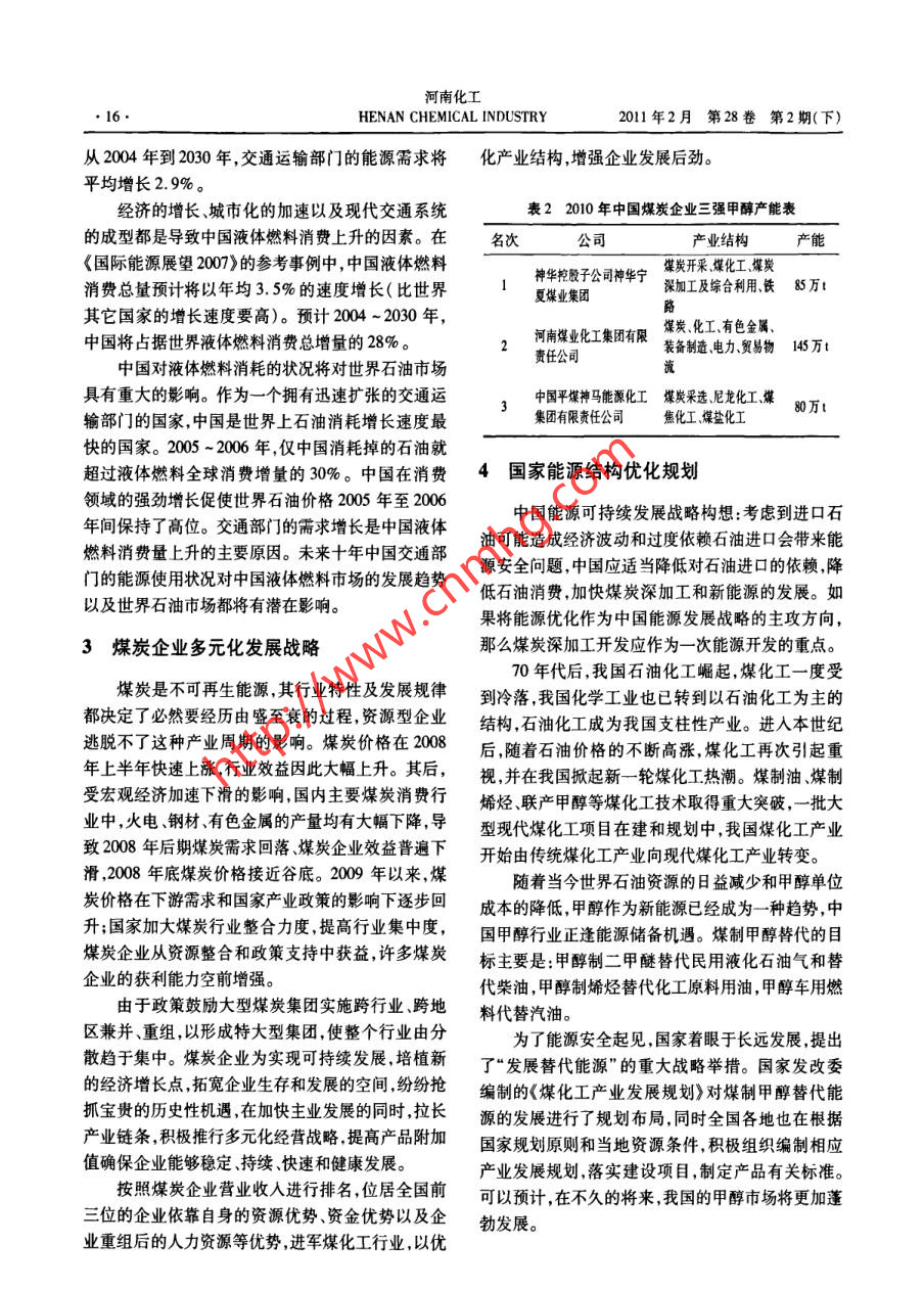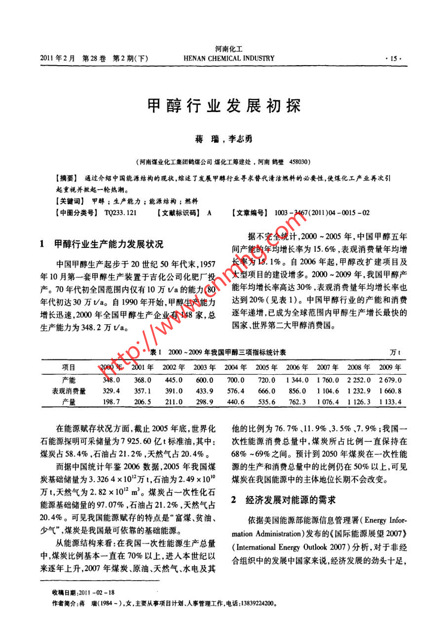 河南化工2011年2月第28卷 第2期(下)HENAN CHEMICAL INDUSTRY●15.甲醇行業(yè)發(fā)展初探蔣瑙,李志勇(河南煤業(yè)化工集團鶴煤公司媒化工籌建處.河南鶴壁458030)[摘要]通過介紹 中國能源結(jié)構(gòu)的現(xiàn)狀,綜述了發(fā)展甲醇行業(yè)尋求替代清潔燃料的必要性,使煤化工產(chǎn)業(yè)再次引起重視并掀起- - 輪熱潮。[關(guān)鍵詞]甲醇; 生產(chǎn)能力;能源結(jié)構(gòu);燃料[中圖分類號] TQ233. 121[文獻標(biāo)識碼] A[文章編號] 1003 -3467(2011)04 -0015 -02據(jù)不完全統(tǒng)計,2000~2005年,中國甲醇五年1甲醇行業(yè)生產(chǎn) 能力發(fā)展?fàn)顩r間產(chǎn)能的年均增長率為15. 6% ,表觀消費量年均增中國甲醇生產(chǎn)起步于20世紀(jì)50年代末, 1957長率為15.1%。自2006年起,甲醇改擴建項目及年10月第-套甲醇生產(chǎn)裝置于吉化公司化肥廠投大型項目的建設(shè)增多。2000~2009年,我國甲醇產(chǎn)產(chǎn)。70年代初全國范圍內(nèi)僅有10萬V/a 的能力,80能年均增長率高達30%,表觀消費量年均增長率也年代初達30萬Va。自1990年開始,甲醇生產(chǎn)能力達到20%(見表1)。中國甲醇行業(yè)的產(chǎn)能和消費增長迅速,2000年全國甲醇生產(chǎn)企業(yè)有148家,總逐年遞增,已成為全球范圍內(nèi)甲醇生產(chǎn)增長最快的生產(chǎn)能力為348.2萬Va。國家、世界第二大甲醇消費國。表12000~2009 年我國甲醇三項指標(biāo)統(tǒng)計表項2000年2001年 2002年 2003年 2004年 2005年 2006年 2007年 2008年 2009 年產(chǎn)能348.0368.0 445.0600.0700.0 720.0 1344.0 1 760.02252.0 2 679.0表觀消費量329. 4357.1391.0433.9576.4 ,666.0856.01 104.6 1 232.9 1 660.8產(chǎn)量198.7206.5 211.0298. 9.440.6 535. 6762. 31 076.4 1 126.3 1 133.4在能源賦存狀況方面,截止2005年底,世界化他的比例為76. 7%、11. 9% 3.5%、7. 9%;我國一石能源探明可采儲量為7925.60億t標(biāo)準(zhǔn)油,其中:次性能源消費總量中,煤炭所占比例一直保持在.煤炭占58. 4% ,石油占21.2% ,天然氣占20.4%。68% ~69%之間。預(yù)計到2050年煤炭在一次性能而據(jù)中國統(tǒng)計年鑒2006數(shù)據(jù),2005年我國煤源的生產(chǎn)和消費總量中的比例仍在50%以上,可見炭基礎(chǔ)儲量為3.326 4 x 10"萬t,石油為2.49 x 101'0煤炭在我國能源中的主體地位長期不會改變。萬t,天然氣為2.82x10'2 m'。煤炭占一次性化石2經(jīng)濟發(fā)展對能 源的需求能源基礎(chǔ)儲量的97. 07% ,石油占21.2% ,天然氣占20.4%。可見我國能源賦存的特點是“富煤、貧油、依據(jù)美國能源部能源信息管理署( Energy Inor-少氣" ,煤炭是我國最可依靠的基礎(chǔ)能源。mation Administration)發(fā)布的《國際能源展望2007》從能源結(jié)構(gòu)來看:在我國一次性能源生產(chǎn)總量(Intermational Energy Outlook 2007) 分析,對于非經(jīng)中,煤炭比例基本-直在70%以上,進人本世紀(jì)以合組織中的發(fā)展中國家來說,經(jīng)濟發(fā)展的勁頭十足,來逐年上升,2007年煤炭、原油、天然氣、水電及其收稿日期:2011 -02-18作者簡介:蔣瑞(1984-),女,主要從事項目計劃 、人事管理工作.電話:13839224200河南化工HENAN CHEMICAL INDUSTRY2011年2月第28卷 第2期(下)●16.從2004年到2030年,交通運輸部門的能源需求將化產(chǎn)業(yè)結(jié)構(gòu),增強企業(yè)發(fā)展后勁。平均增長2.9%。表2 2010 年中國煤炭企業(yè)三強甲醇產(chǎn)能表經(jīng)濟的增長城市化的加速以及現(xiàn)代交通系統(tǒng)的成型都是導(dǎo)致中國液體燃料消費上升的因素。在名次產(chǎn)業(yè)結(jié)構(gòu)產(chǎn)能《國際能源展望200》>的參考事例中,中國液體燃料神華控股子公司神華寧煤炭開采、煤化工、煤炭消費總量預(yù)計將以年均3. 5%的速度增長(比世界1夏煤業(yè)集團深加工及綜合利用、鐵85萬l其它國家的增長速度要高)。預(yù)計2004 ~2030年,河南煤業(yè)化工集團有限煤炭、化工、有色金屬、裝備制造.電力、貿(mào)易物14萬1中國將占據(jù)世界液體燃料消費總增量的28%。責(zé)任公司中國對液體燃料消耗的狀況將對世界石油市場具有重大的影響。作為一個擁有迅速擴張的交通運中國平煤神馬能源化工煤炭采選、尼龍化工、煤80萬l集團有限責(zé)任公司焦化工、煤鹽化工輸部門的國家,中國是世界上石油消耗增長速度最快的國家。2005~2006年,僅中國消耗掉的石油就4國家能源結(jié)構(gòu)優(yōu)化規(guī)劃超過液體燃料全球消費增量的30%。中國在消費領(lǐng)域的強勁增長促使世界石油價格2005年至2006中國能源可持續(xù)發(fā)展戰(zhàn)略構(gòu)想:考慮到進口石年間保持了高位。交通部[ ]的需求增長是中國液體油可能造成經(jīng)濟波動和過度依賴石油進口會帶來能燃料消費量上升的主要原因。未來十年中國交通部源安全問題,中國應(yīng)適當(dāng)降低對石油進口的依賴,降門的能源使用狀況對中國液體燃料市場的發(fā)展趨勢低石油消費,加快煤炭深加工和新能源的發(fā)展。如以及世界石油市場都將有潛在影響。果將能源優(yōu)化作為中國能源發(fā)展戰(zhàn)略的主攻方向,那么煤炭深加工開發(fā)應(yīng)作為一次能源開發(fā)的重點。3煤炭企業(yè)多元化發(fā) 展戰(zhàn)賂70年代后,我國石油化工崛起,煤化工- -度受煤炭是不可再生能源,其行業(yè)特性及發(fā)展規(guī)律到冷落,我國化學(xué)工業(yè)也已轉(zhuǎn)到以石油化工為主的都決定了必然要經(jīng)歷由盛至衰的過程,資源型企