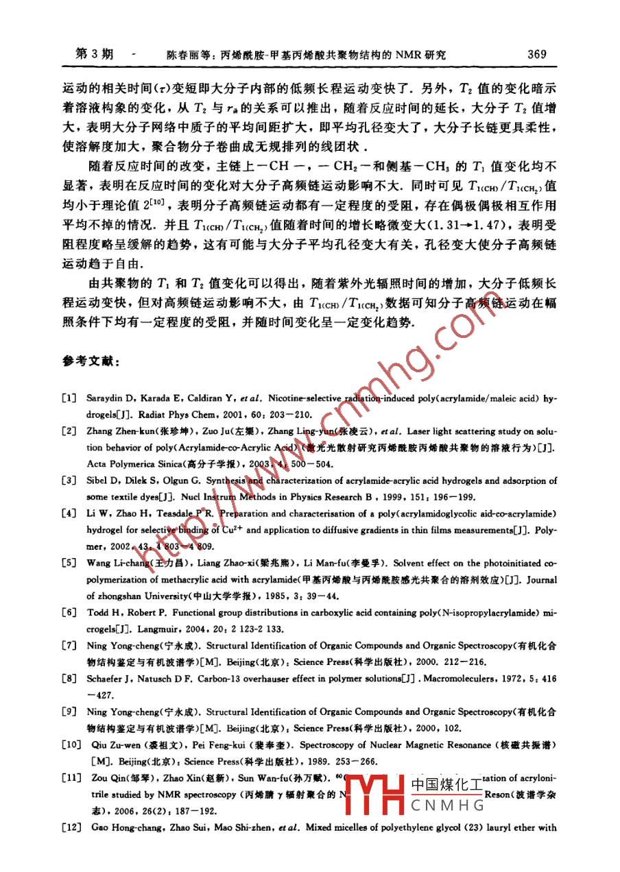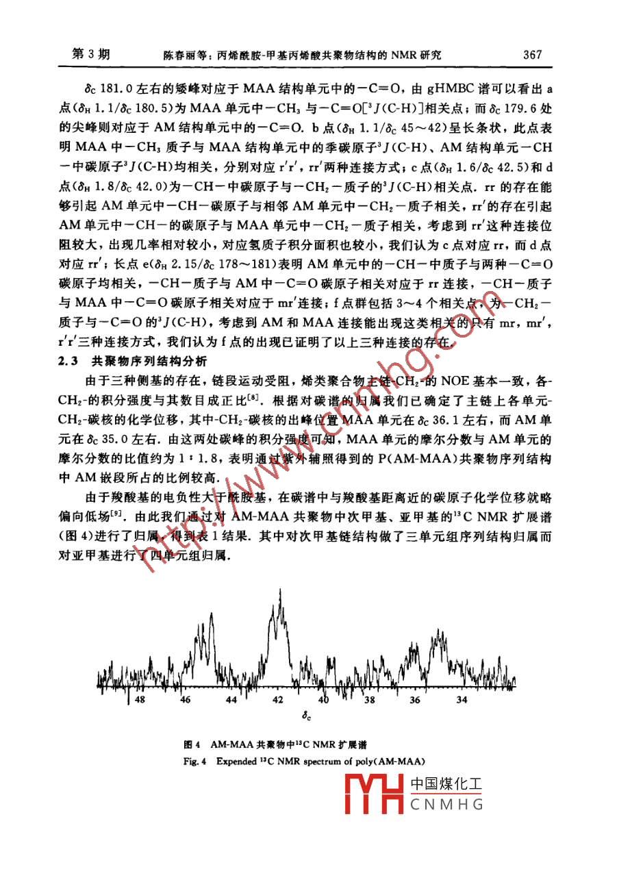 波譜學雜志第25卷第3期o.25No.32008年9月Chinese Journal of Magnetic ResonanceSep.2008文章編號:1000-4556(2008)03-0363-08丙烯酰胺-甲基丙烯酸共聚物結(jié)構的NMR研究陳春麗,趙新2,孫萬賦1,王強1,唐軍1[1新疆大學理化測試中心烏魯木齊830046;2.波譜與原子分子物理國家重點實驗室(中國科學院武漢物理與數(shù)學研究所),湖北武漢430071]摘要:用HNMR譜,cNMR譜,DEPT譜, gHMQC, gHMBC二維譜和質(zhì)子弛豫時間等方法研究了在紫外光輻照條件下丙烯酰胺(AM)-甲基丙烯酸(MAA)共聚合反應,討論了AM-MAA共聚合反應時間與轉(zhuǎn)化率的關系、共聚單體的連接方式、共聚物序列結(jié)構以及不同輻照時間下形成的共聚物鏈運動.結(jié)果表明在紫外光輻照條件下, AM-MAA共聚物鏈節(jié)中同時存在多種連接方式,當反應時間為45min時,共豪合轉(zhuǎn)化率可達100%.從自旋晶格弛豫時間(T1)和自旋-自旋弛豫時間(T2)測定中得出,在輻照1小時范圍內(nèi),時間越長聚合物長鏈分子運動速度越快,但主鏈的鏈段運動變化不明顯關鍵詞:NMR;序列結(jié)構;分子運動;弛豫時間中圖分類號:0641文獻標識碼:A丙烯酰胺均聚物及其共聚物是一類用途廣泛的功能高分子化合物,是較重要的水溶性高分子品種,國內(nèi)外關于丙烯酰胺與有機不飽和酸的共聚已有一些報道. Sibel duran等人研究了在Coy輻照條件下合成丙烯酰胺一丙烯酸水凝膠,討論了pH值、單體配比對溶漲行為的影響,并把聚合物應用到紡織業(yè);張珍坤等人用激光光散射技術討論了丙烯酰胺-丙烯酸共聚物的溶液行為2; Saraydin D等人在y輻照條件下合成了丙烯酰胺一馬來酸共聚物,得出此聚合物對煙堿可進行選擇性吸收3;LiW等人合成并表征了聚丙烯酰胺丙烯脒乙醇酸水凝膠,發(fā)現(xiàn)其對銅離子有較好的吸附性能.但關于丙收稿日期:2007-12-05:收修改稿日期:200803-14基金項目:波譜與原子分子物理國家重點實驗室資助課題(T15270中國煤化工者簡介:陳春圈(1981),女,碩士研究生,從事廉合物輻照效YHCNMHG人:趙新,電話:0991-8582137, E-mail: zhaoxin@xiu. edu.波譜學雜志第25卷烯酰胺(AM)甲基丙烯酸(MAA)二元共聚合的報道相對較少,用紫外光輻射共聚合的研究尚未見報道,運用核磁共振方法討論P( AM-MAA)微觀結(jié)構較少.本文在紫外光輻照條件下合成了 AM-MAA水溶性共聚物,用核磁共振方法探討了共聚反應及其微觀結(jié)構.討論了共聚合反應的轉(zhuǎn)化率、共聚單體連接方式、共聚合物序列結(jié)構以及不同輻照時間下形成的共聚物鏈運動情況1實驗部分1.1試劑甲基丙烯酸(MAA),分析純,天津市河東區(qū)紅巖試劑廠丙烯酰胺(AM),分析純,天津市化學試劑研究所1.2共聚物的制備首先配制1mol·L的丙烯酰胺水溶液,與不同體積的甲基丙烯酸混合,配制成含單體AM:MAA物質(zhì)的量之比為1:1的混合溶液,把配好的溶液倒入表面皿中,置于功率1000W,365mm的Uv燈輻照箱內(nèi),距燈管20cm處,輻照時間分別為15,30,45,60min.待共聚合反應完畢后,在40℃真空烘箱中干燥后得到所需樣品.1.3NMR譜圖的測定所有NMR實驗均在 ARIAN INOVA400超導核磁共振儀上進行.1HNMR譜質(zhì)子觀察頻率為400MHz,譜寬6002Hz,數(shù)據(jù)點為44928,脈沖寬度為135s,延遲時間5s;1CNMR譜,質(zhì)子觀察頻率為100MHz,譜寬25000Hz,數(shù)據(jù)點為59968,脈沖寬度為10.2ps,延遲時間5s,累加次數(shù)20100;DEPT譜,譜寬25000Hz,脈沖寬度為10.2ps,延遲時間4s,分別做DEPT90°、DEPT-135°兩個譜; gHMQC和gHMBC譜的測定使用5mmID反式探頭,采樣數(shù)據(jù)點陣為2048×2048,延遲時間為5s,采樣時間為0.171s, gHSQC譜累加次數(shù)16, gHMBC譜累加次數(shù)為80;自旋晶格弛豫時間(T1)采用反轉(zhuǎn)恢復法測定,累加次數(shù)為16;自旋-自旋弛豫時間(T2)用CPMG自旋回波法測定,累加次數(shù)為16,脈沖延遲大于5T1.試樣經(jīng)反復充氮脫氧5min,測試誤差<5%2結(jié)果與討論2.1共聚合反應時間分析為了探討共聚反應時間與轉(zhuǎn)化率的關系,我們對輻照不同時間后形成的 AM-MAA共聚物做了1HNMR譜,結(jié)果如圖1所示由圖1可見,AM和MAA單體的烯氫質(zhì)子峰位于5.6~6.4之間,MAA單體中的甲基質(zhì)子峰位于δ1.88.共聚物的質(zhì)子峰位于δ0.8~3.0.另外,♂4.81處的峰為水質(zhì)子信號,由于共聚物中-OH和一NH2基團中的活潑質(zhì)子與重水發(fā)生了快速交換反應且并入水峰中,故未觀察到該質(zhì)子峰的存在.輻照時間為15min時,騫合物的質(zhì)子峰未出現(xiàn)隨著反應時間的增加,單體質(zhì)子峰峰面積迅中國煤化工聽占比例相應增加,表明聚合轉(zhuǎn)化率增大.輻照45min后,在譜CNMH氫質(zhì)子峰,表明了單體完全共聚,共聚合轉(zhuǎn)化率已達到100%.從轉(zhuǎn)化率的角度考慮,紫外光引發(fā)AM第3期陳春麗等:丙烯酰胺甲基丙烯酸共聚物結(jié)構的NMR研究365和MAA共聚合反應時間應控制在45min為宜109876543210圖1在不同輻照時間下形成的 AM-MAA共聚物在D2O溶劑中的HNMR譜Fig 1 H NMR spectra of poly( AM-MAA)in D2O at different reaction time(a)15 min;(b)30 min:(c)45 min(d)60 min2.2共聚合中單體連接方式分析二元單體聚合的組成和構造比較復雜,既要考慮連接方式的問題,又要顧及序列結(jié)構的不同.若設有取代基的一端為“尾”,另一端為“頭”,AM結(jié)構單元中頭、尾分別用m、r表示,MAA結(jié)構單元中頭、尾分別用m、r表示,理論上可能存在的連接方式就有很多.為了進一步確定紫外輻照條件下AM和MAA的共聚物結(jié)構,我們用DEPT譜和二維譜對輻