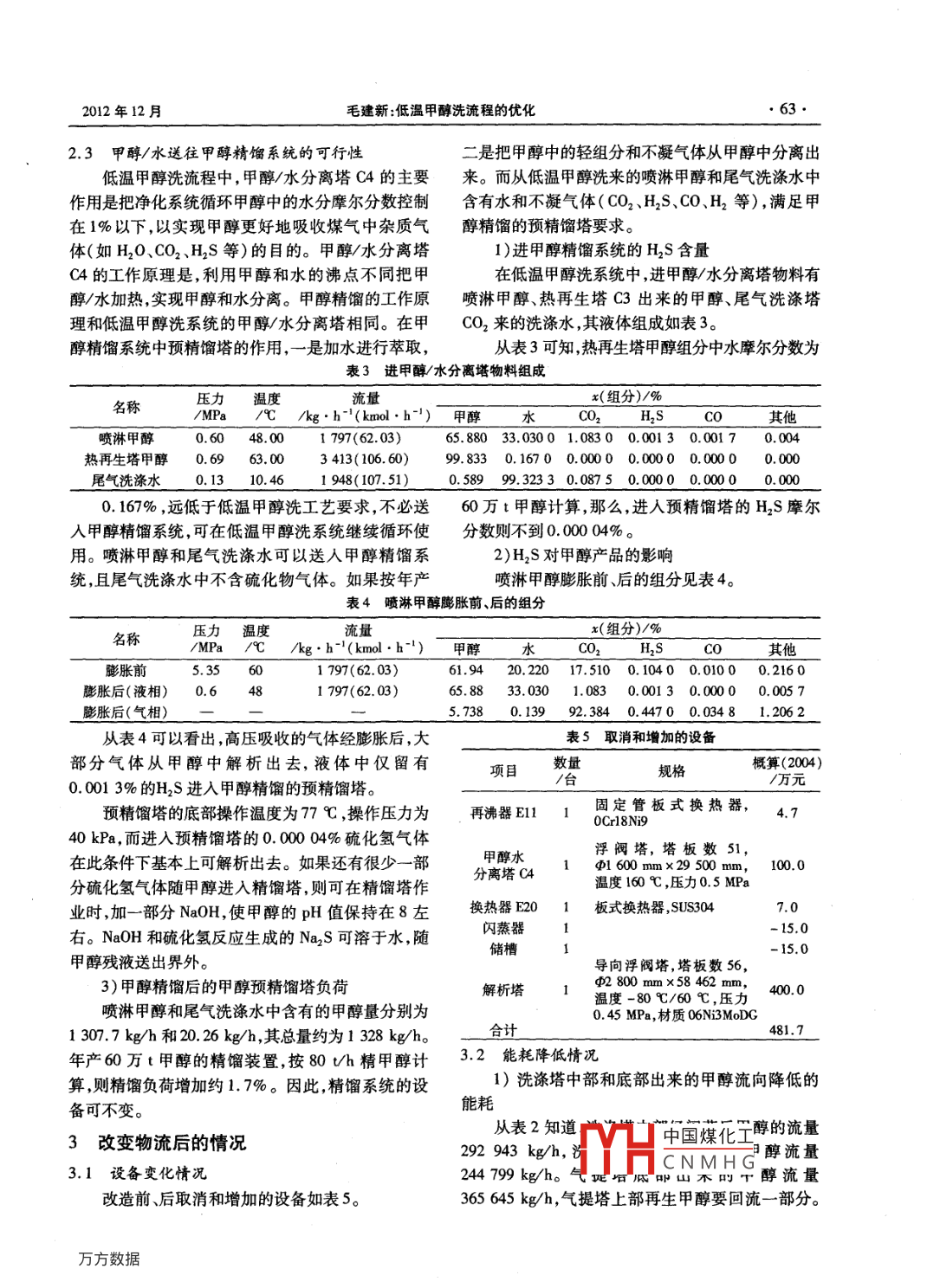 第32卷第6期山西化工Vol 32 No 62012年12月SHANXI CHEMICAL INDUSTRYDec.2012生產(chǎn)與應(yīng)用低溫甲醇洗流程的優(yōu)化毛建新山西原平化學(xué)工業(yè)集團(tuán)有服責(zé)任公司,山西原平034100)摘要:介紹了低溫甲醇洗工藝流程,提出了改變物料甲醇流向的優(yōu)化改造,并對(duì)改造前、后進(jìn)行了分析比較。改造后凈化度不變,能耗降低,投資減少,經(jīng)濟(jì)效益提高關(guān)鍵詞:低溫甲醇洗工藝;甲醇;能耗;凈化度中圖分類號(hào):TQ522.6文獻(xiàn)標(biāo)識(shí)碼:A文章編號(hào):1004-7050(2012)06-0061-04引言程因CO2氣體作為原料氣而使用六塔流程;煤制甲煤制甲醇技術(shù)一般包括煤清潔氣化技術(shù)(水煤醇一般可以取消解析塔使用五塔流程。本文以五漿、CSP和謝爾粉煤氣化技術(shù))、低溫分餾空分技塔流程為例,其工作原理是,利用煤氣中各種氣體術(shù)、寬溫耐硫變換技術(shù)、低溫甲醇洗脫硫脫碳技術(shù)、(相同條件下)在低溫、高壓甲醇中的溶解度不同除恒溫甲醇合成技術(shù)、三塔甲醇精餾技術(shù)等。這些技去二氧化碳和硫化物氣體,把煤氣中一氧化碳和氫術(shù)都是專利技術(shù)需要獨(dú)立購買又各自獨(dú)成一套系氣含量調(diào)整到合成甲醇的適合比例。統(tǒng),不能從整體煤制甲醇工藝出發(fā)進(jìn)行整體流程優(yōu)工藝中洗滌塔和氣提塔的規(guī)格見表1化。本文從整體流程考慮,著重優(yōu)化60萬t/a煤制表1洗滌塔和氣提塔的規(guī)格甲醇的低溫甲醇洗流程,以降低投資,提高效益。名稱規(guī)格材質(zhì)溫度/℃壓力MPa1流程簡述洗滌塔導(dǎo)向浮閥塔塔板數(shù)79,CI 200 mm/p3 800 mm, 06NI3MoDG-80760 6.81.1低溫甲醇洗工藝(見圖1)氣提塔導(dǎo)向浮閥塔塔板數(shù)75,64 200 mm06N3MoDC-80600.5氧氣少收高50266mm氮?dú)舛?.2冷凍站工藝氣化低溫甲醇洗醇合成由于低溫甲醇洗是物理吸收法,溫度越低,吸收效果越好,且一般在-40℃下操作,因此,運(yùn)用低溫冷凍站甲酬甲精餾甲醇洗技術(shù)必須有合適的冷量提供。冷凍站的設(shè)置渣水處理是為了給低溫甲醇洗工序提供必需的冷量,一般生圖1低溫甲醇洗工藝產(chǎn)廠家使用氨作為制冷劑。而氨冷器設(shè)置主要考慮低溫甲醇洗流程有六塔和五塔流程。氨加工過的問題是,在系統(tǒng)提供冷量的同時(shí)盡可能減少氣體中的甲醇量。收稿日期:201209-10冷凍站為低溫甲醇洗系統(tǒng)提供-40℃的冷量,學(xué)工程與工藝專業(yè),主要從事合放復(fù).尿素焦護(hù)氣甲靜工藝生產(chǎn)冷凍介質(zhì)為刻中國煤化工要的冷量為管理工作。5000kW。低CNMHG器后進(jìn)入壓山西化工2012年12月縮機(jī)進(jìn)行增壓,增壓后的氣氨經(jīng)過冷卻、膨脹使氣氨活性下降甚至失活而無法生產(chǎn)。甲醇合成過程要變成液氨,送往低溫甲醇洗對(duì)甲醇降溫,保證低溫甲求原料氣中w(硫化物)≤1.0×10,即進(jìn)洗滌塔的醇洗工藝的正常運(yùn)行。其設(shè)備有汽輪機(jī)、冰機(jī)、一段甲醇中硫化物含量甚微,或者測不到。表2為原流出口冷卻器、二段出口冷卻器、防喘振冷卻器、氨冷程的物流分析。從表2可知,洗滌塔中部經(jīng)閃蒸后卻器、凝汽器、一段進(jìn)口分離器、二段進(jìn)口分離器液甲醇中硫化物含量測不到,符合洗滌塔的要求。洗氨儲(chǔ)罐、中間氨罐、省功器、惰氣分離器、高位油箱、滌塔底部經(jīng)閃蒸后的富含硫化物的甲醇占總循環(huán)量蓄能器、潤滑油站、消音器、氨泵凝結(jié)水泵。的45%。在氣提塔中,只有不將硫化物帶入富含3空分工藝CO2氣體的甲醇中,才能實(shí)現(xiàn)洗滌塔中部經(jīng)閃蒸后空分的原理為,利用空氣中各種成分的沸點(diǎn)不甲醇的循環(huán)使用。冋,同一種氣體的沸點(diǎn)隨壓力的升髙而升髙,通過加2.2改變洗滌塔中部和底部甲醇流向壓降溫、膨脹節(jié)流等措施把空氣變?yōu)橐后w,再通過精洗滌塔中部富含CO2氣體的甲醇經(jīng)閃蒸進(jìn)入餾的方法把氧氣、氨氮?dú)鈿鍤夥蛛x出來。氣提塔上部解析CO2氣體后從氣提塔中部出來,2改變物流流程一部分返回下塔吸收硫化物,另一部分經(jīng)換熱循環(huán)使用。洗滌塔底部富含H2S氣體的甲醇經(jīng)閃蒸進(jìn)2.1物流分析入氣提塔下部解析CO2氣體,濃縮H2S氣體后送入低溫甲醇洗技術(shù)主要是脫除原料氣中的CO2熱再生塔解析H2S氣體。熱再生的甲醇經(jīng)換熱后和H2S氣體。硫化物會(huì)造成催化劑中毒,使催化劑循環(huán)使用。流程如圖2表2原流程的物流分析名稱壓力溫度流量x(組分)/%/MPa℃/kg:h-( kmol . h)甲醇水其他洗滌塔中部閃蒸后甲醇1.8533.0292943(8347.7)73.7750.12325.8540.0000.1780.070洗滌塔底部閃蒸后甲醇1.85-33.0244799(6947.8)72.4610.12227.0210.1380.1850.073氣提塔底部甲醇0.23-43.5365645(11384.5)98.52101650.7580.5070.0000.049凈化氣送往甲醇1目液氮脫鹽水放空尾氣洗滌水中國煤化工CNMHG圖2物流改變后的流程2012年12月毛建新:低溫甲醇洗流程的優(yōu)化63·2.3甲醇/水送往甲醇精餾系統(tǒng)的可行性二是把甲醇中的輕組分和不凝氣體從甲醇中分離出低溫甲醇洗流程中,甲醇/水分離塔C4的主要來。而從低溫甲醇洗來的噴淋甲醇和尾氣洗滌水中作用是把凈化系統(tǒng)循環(huán)甲醇中的水分摩爾分?jǐn)?shù)控制含有水和不凝氣體(CO2、H2S、CO、H2等),滿足甲在1%以下,以實(shí)現(xiàn)甲醇更好地吸收煤氣中雜質(zhì)氣醇精餾的預(yù)