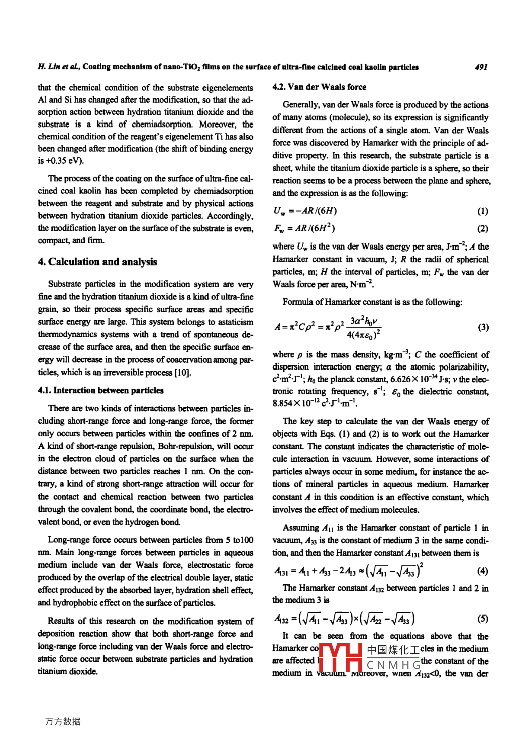 International Journal of Minerals, Metallurgy and MaterialsVolume 18, Number 4, August 2011, Page 487Do:10.1007/8126130110467-0Coating mechanism of nano-TiO2 films on the surface of ultra-finecalcined coal kaolin particlesHai Lin and ying-bo DongSchool of Civil and Environmental Engineering, University of Science and Technology Beijing, Beijing 100083, China(Received: 19 July 2010; revised: 5 August 2010; accepted: 23 August 2010)Abstract: a new type of mineral composite was made by calcined coal kaolin. The interaction mechanism of an inorganic modification reagent TiOSO with the surface of ultra-fine calcined coal kaolin particles(substrate)was studied by X-ray photoelectron spectroscopy. Theresults show that chemisorption exists in the phase boundary between the modification agent and the substrate surface while physical ad-sorption occurs on the modification layers of hydrate titanium dioxide. The interaction force was calculated and analyzed according toDLvO theory between ultra-fine calcined coal kaolin particles and hydrate titanium dioxide nano-particles in the modification system. It isshown that the both electrostatic force and van der Waals force are attractive and the coacervation between ultra-fine calcined coal kaolinparticles and hydrate titanium dioxide nano-particles leads to the coating of hydrate titanium dioxide on the surface of ultra-fine calcined coalkaolin particles.Keywords: calcined coal kaolin; titanium dioxide; coatings; modification; mechanist1 IntroductionOn the basis of the above results, this paper has studiedthe interaction mechanism between ultra-fine calcined coalIndustrial mineral resources are abundant in China, the kaolin and titanium dioxide films by means of moden testvalue of which will be greatly increased by the processes of methods and theoretical analysis. The research providesultra-fine grinding and surface modification. a lot of func- measures and theoretical basis to reveal the mechanism oftional mineral materials and fillers have appeared; however inorganic coatings on the surface of ultra-fine industrialmost of the studies are still focused on the development and mineral particles, which is very important to the preparationapplication of industrial minerals, ignoring the study on theof new types of mineral composites with industrial mineralmechanism[1]. On the contrary, there are a large number of particles and the guidance for modification methodsreports about organic modification on the surface of mineral2. Experimental procedureparticles, such as calcium carbonate, kaolin, and quartz,while there are few reports on the inorganic modification 2. 1. Materials and apparatusmechanism [2-5]The sample was coal kaolin made in the laboratory [7], ofCoal kaolin is a kind of important industrial mineral re which the main component is 2SiO2 Al2O3 2H2O. Thesource. A new type of mineral composite, substituting for whiteness of the sample is 88.50%(blue-ray brightness), thetitanium dioxide, has been made successfully with ultra-fine particle size of-2 um is 91.88%, dso is 0.95 um, the specificcalcined coal kaolin as a substrate and TiOSO4 as a modifi- surface area is 3. 35 m/g, the oil absorption value is 35. 20 gcation reagent. The results of transmission electron micros- per 100 g, and the hiding power is 146. g/m. The appa-copy show that an even and compact nano-TiO2 film has ratuses of surface analysis were TEM and an XSAM800been coated on the surface of kaolin particles [6]multifunctional surface analysis system produced by中國(guó)煤化工Correspondingauthor:HaiLinE-mail:linhai@cesustb.odu.cnSpringerc Univerity of Science and Technology Beijing and Springer-Verlag Berlin Heidelberg 2011CNMHGInt J. Miner. Metall. Mater., VoL 18, No 4, Aug 2011KRATOS Co in England; the test condition is Al Ka(12 kv15mA)2. 2. MethodsThe test was operated in a self-modified reactor withonstant temperature control. A certain amount of coal kao-lin(substrate)and water were added in the reactor; the substrate was made fully dispersed in water. After heating thereaction mixture to the required modified temperature in arater-bath. some titanium salt solution was added as amodification reagent. The final modified products were obtained by centrifugation, filtration, and drying [8Fig 1. TEM image of the modified product.The technology of coating a TiO2 film on the surface ofultra-fine calcined coal kaolin particles was studied. It wasshown that temperature, time, amount of surface modifica-tion agent, pulp density, and stirring velocity were importantfactors influencing the effect of the coating. The optimumcondition determined by experiments were the temperatureof 85%C. the time of 3 h. the amount of surface modificationagent of 0. 75 g/g, the pulp density of 5 g/L, the modificationH value of 8.0, and the stirring velocity of 375 r/min. Thefinal coating product, which was acquired using the opti-mum condition, was tested and analyzed by SEM and TEMThe coating mechanism of the modification reagent and Fig. 2. Enlarge drawing of the substrate and film at the in-substrate was studied by X-ray photoelectron spectroscopy terface.(XPS). By XPS, not only surface information but also deepdistribution data can be obtained. therefore it is a useful energy produced by an ion gun to bombard the samplesmethod in sorption study. Accurate detection information surface, then surface atoms absorbing enough energy canalso can be obtained on the electron binding energy of escape from the samples surface because of energy transferatomic orbitals by XPS, so that whether the change of After that, the escaped ions are examined by mass spectro-chemical environment occurs can be judged by the shift of graphy, and then the secondary ion mass spectrum will bebinding energy. Therefore, we can get the information about obtained. If the spattered surface is examined by XPs,themodification particles from both the surface and interiorep anatoly result will be observed. The main function of3. Result