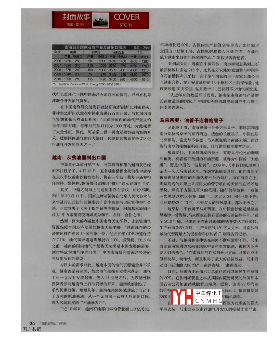 封面故事COVER南海!南海STORY●P22誰在開采中國南?!馪27中國更需務(wù)實行動●P30“981”開鉆帶來希望10Y中國煤化工CNMH船巡南海,卻發(fā)現(xiàn)爭議區(qū)布滿了外國的鉆并平臺供圖中新社在中國南海爭議區(qū)每年流失的石油超過5000萬噸,相當(dāng)于個大慶油田。對于南海油氣開發(fā),我們不僅需要善意的呼吁,而且需要理性的思考、務(wù)實的行動。“海洋石油91”的開鈷讓人們看到了希望的曙光。南海!南海!盤AY已煤化工MHG2012/05591021萬數(shù)據(jù)封面故事網(wǎng) COVER南海!南海!STORY誰在開采中國南海目前,在中國南海爭議區(qū)有100多個鉆并平臺,但是它們都不屬于中國,每年流失的石油約5000萬噸,相當(dāng)于一個大慶油田◎文/本刊記者侯瑞寧中國在南海深水油氣開發(fā)中邁出了實質(zhì)性的步伐,成為第一個在南海自營勘探開發(fā)深水油氣資源的國家。南海,黃巖島,中菲對峙正在升級,截至5月9日,不論是否巧合,黃巖島事件讓“海洋981”具有了一已滿一月。份特殊的意義?!?81鉆井平臺選擇此時開鉆,其宣示主權(quán)同一天,距黃巖島西北方向約600海里的荔灣6-1區(qū)強(qiáng)勢介入南海油氣資源競爭的姿態(tài)意義甚至大于其技術(shù)上塊,同樣吸引了國人乃至世界的目光。當(dāng)“海洋石油981”的實際意義?!睂<疫@樣評價的鉆頭順利挺進(jìn)1500米水域時,國人歡欣難抑。至此座鉆井平臺為何被賦予這么大的意義?∥是要中國煤化工CNMHG兒反美,一會兒反華,對于南海周邊某些國家來說,不管抱誰的大腿,最終目的都是為了南海的資供圖/CFP22中石油石化·半月刊國內(nèi)知名南海研究專家、廈門大學(xué)南洋研究院教授李為“肩并肩”的軍事演習(xí),地點巴拉望島附近海域。據(jù)稱,金明表示:“菲律賓蓄意挑起的黃巖島對峙事件,背后有兩軍的主要演習(xí)科目包括在巴拉望島等舉行實戰(zhàn)訓(xùn)練。其著極大的利益考量,不僅為了竊取中國島嶼,而且為了攫中一項演習(xí)是從恐怖分子手中奪回鉆井平臺。取南海油氣資源?!睋?jù)稱,南海蘊(yùn)藏著280億噸~300億巴拉望島非常靠近中菲爭議的黃巖島海域。中國南海噸的油氣資源,有著1萬億美元的經(jīng)濟(jì)價值。研究院康霖博士告訴記者,菲律賓在南海的石油勘探活動答案由此揭曉。南海之爭在能源,能源之爭在南沙。主要集中在兩個陣地,一個是在西北巴拉望海域,第二個而南沙油氣資源多為深水,“海洋981”之前,中國并不具陣地就是中國的禮樂灘備深水油氣開發(fā)能力,廣闊的南海尤其是南沙便成為了菲禮樂灘,中國南沙群島中的島礁,坐落于巴拉望島律賓等他國魚肉的西邊,菲方稱為勒道灘。近日,菲國政府宣稱,這里有除了菲律賓之外,“他國”還包括越南、馬來西亞、文萊、16.6萬億立方英尺天然氣和416億桶原油,其中天然氣足印尼。不僅如此,這里還集結(jié)著殼牌等近200家國際能源夠用100年,儲量大大超過了預(yù)期。得知這一消息后,公司。截至2009年,中國南海爭議區(qū)有1700多座鉆井平臺,位菲律賓軍方人員大喜過望:“菲律賓就像一個坐在金山上周邊國家在爭議區(qū)每年采油約5000萬噸,相當(dāng)于一個大的盲眼乞丐。在菲律賓200海里的專屬經(jīng)濟(jì)區(qū),有價值高慶油田,而中國在爭議區(qū)滴油未采。達(dá)263萬億美元的石油儲量,這足以使菲律賓擺脫貧困和不發(fā)達(dá)狀態(tài)?!狈坡少e:咬定“金山”此外,中國石化石油勘探開發(fā)研究院能源規(guī)劃研究中菲黃巖島對峙第六天,美國與菲律賓發(fā)起了一場名所研究員羅佐縣為本刊提供的資料顯示,菲律賓目前在產(chǎn)的最大油氣田——馬蘭帕亞氣田位于南海巴拉望島北部的卡拉延群島”附近。所謂的“卡拉延群島”是我國南沙群島的島礁。菲律賓于1978年6月11日,發(fā)布由總統(tǒng)馬科斯簽署的第1596號總統(tǒng)法令,把南沙群島的33個島、礁沙、洲,面積達(dá)64976平方海里的海域聲稱為“菲律賓領(lǐng)土的一部分”,命名為“卡拉延群島”,并把此地區(qū)作為勘探的主要目標(biāo)在占領(lǐng)了如此豐富的油氣資源之后,菲律賓卻并沒有實力實現(xiàn)自主開發(fā)。于是,引進(jìn)國外公司進(jìn)行合作成為其實現(xiàn)油氣資源供給的主要手段。早在1976年,菲律賓就已邀請一些外國石油公司,其中包括埃克森、殼牌和印第安納標(biāo)準(zhǔn)石油公司,在卡拉延周圍勘探近海石油。1994年7月,菲律賓再次宣布一家美國子公司— Alcorn石油公司將在卡拉揚(yáng)地區(qū)做石油勘探試驗。面對禮樂灘這座金山,菲律賓仍然采取了與國外公司CHINA合作。2011年6月,非律賓啟動其第四輪能源承包項目時M+: HINA, STOPL★: DEFENDPOACHING INg."PHILIPPINE就允許外資勘探油氣資源公司參與包括禮樂灘在內(nèi)的15AN PARTY PHIL. WATERSIL-SOVEREIGNT個油氣區(qū)的合作開發(fā),其中第三區(qū)塊和第四區(qū)塊在中國南YAN PARTBAYANPARTY海。今年4月27日,該國能源部接受了5個石油天然氣開采合同的投標(biāo),并計劃在7月再對3個區(qū)域的油氣開發(fā)進(jìn)行招標(biāo),其中2個區(qū)域位于禮樂灘附近此舉立即招致中國外交部的抗議。中國外交部發(fā)言人洪磊曾多次表示,任何中國煤化工中國管轄海域從事油氣活CNMHG據(jù)菲律賓“ ABS--Cr、H賓最大的礦產(chǎn)開發(fā)商——菲利克斯礦業(yè)公司董事長兼首席2012/05/15第10期23封面故