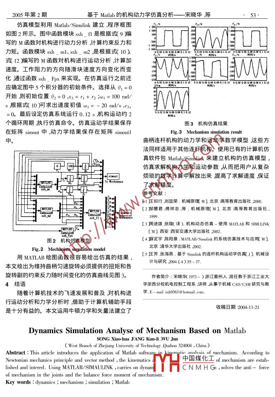 205年第2期煤礦機(jī)械文章編號:1003-079(2005m2-0051-03基于 Matlab的機(jī)構(gòu)動力學(xué)仿真分析宋曉華,方坤禮,吳軍浙江工業(yè)大學(xué)浙西分校,浙江衢州324004)摘要:介紹了 Matlak在機(jī)構(gòu)動力學(xué)分析中的應(yīng)用。根據(jù)牛頓力學(xué)原理和矢量法建立和推導(dǎo)機(jī)構(gòu)的運(yùn)動學(xué)和動力學(xué)矩陣方程。使用 Matlab/Simulink對方程進(jìn)行動力學(xué)仿真來求解機(jī)構(gòu)運(yùn)動副中的反力及機(jī)構(gòu)中的平衡力矩關(guān)鍵詞:動力學(xué);機(jī)構(gòu);仿真; Matlab中圖號:TH122文獻(xiàn)標(biāo)識碼:B引言約束反力和為保證原動件按給定規(guī)律運(yùn)動時(shí)需加于在機(jī)構(gòu)運(yùn)動過程中其構(gòu)件受到各種力的作用,杋械上的平衡力或平衡力矩。力分析有2類一類機(jī)構(gòu)的運(yùn)動過程也是機(jī)構(gòu)傳力和作功的過程。作用適用于低速輕載機(jī)械稱之為機(jī)構(gòu)的靜力分析即在在機(jī)械上的力不僅是影響杋械旳運(yùn)動和動力性能不計(jì)慣性力所產(chǎn)生旳動載荷而僅考慮靜載荷的條件的重要參數(shù)而且也是決定相應(yīng)構(gòu)件尺寸及結(jié)構(gòu)形下對機(jī)構(gòu)進(jìn)行的力分析;男一類適用于高速重載機(jī)狀等的重要依據(jù)。所以不論是設(shè)計(jì)新的機(jī)械還是構(gòu)稱之為機(jī)構(gòu)的動力分析,即同時(shí)計(jì)及靜載荷和慣為了合理地使用現(xiàn)有機(jī)械都應(yīng)當(dāng)對杋構(gòu)進(jìn)行力分性慣性力矩所引起的動載荷對機(jī)構(gòu)進(jìn)行的力析。機(jī)構(gòu)力分析的主要目的是確定杋構(gòu)運(yùn)動副中的分析。杋構(gòu)的動力分析是建立在機(jī)構(gòu)運(yùn)動學(xué)分析的技術(shù)委員會認(rèn)證并在17個(gè)部委推廣使用的分析軟4結(jié)語件。目前全球有70%以上的高校及研究單位采用液壓支架設(shè)計(jì)階段綜合運(yùn)用CAE借助于三維ANSYS作為分析軟件。較之于rrC公司 Parametric造型對液壓支架進(jìn)行有限元分析運(yùn)動仿真動力學(xué)Technology( Lorporation舶的Po/ Engineer自帶的有限元分析避免運(yùn)動中的機(jī)構(gòu)干涉現(xiàn)象能夠使設(shè)計(jì)中的分析部分和 Solidωks的 cosmos模塊其功能完善,〃虛擬樣機(jī)'"檢驗(yàn)發(fā)揮強(qiáng)大作用,確保液壓支架安全界面清晰可以實(shí)現(xiàn)這二者無法實(shí)現(xiàn)的約束、加載邊可靠結(jié)構(gòu)優(yōu)化合理探索液壓支架設(shè)計(jì)的新思路界工況。它功能強(qiáng)大適用領(lǐng)域非常廣泛。提高液壓支架設(shè)計(jì)水平。由于所要進(jìn)行分析的千斤頂和立柱模型載荷施參考文獻(xiàn)加表面和邊界條件復(fù)雜雙伸縮立柱外缸為球形缸[趙慧設(shè)停.基于 Intermet的三維模型協(xié)同瀏覽與批注系統(tǒng)J底活柱端為球形柱頭這種結(jié)構(gòu)立體形狀不規(guī)則,【2健海,基于網(wǎng)絡(luò)的協(xié)同設(shè)計(jì)方法研究J]1清華大學(xué)學(xué)報(bào)自而模型分析要求邊界條件和載荷要和實(shí)際工況然科學(xué)版)200409)93-96致這樣的計(jì)算結(jié)果才有參考價(jià)值,另外在雙伸縮[3磚川金燁倪國龍.基于wd的異地集成協(xié)同環(huán)境的設(shè)計(jì)與實(shí)現(xiàn)J]機(jī)楲設(shè)計(jì)與制造2003x(1立柱的外缸、中缸和小柱相接觸的部分以及千斤頂[4葉先磊簿AN)S工程分析軟件應(yīng)用實(shí)例M]北京清華大學(xué)的缸體和活塞相接觸的部分作用面之間通過密封裝置和導(dǎo)向環(huán)等結(jié)構(gòu)發(fā)生相互作用在此處創(chuàng)建面[51皓月ANYS工程計(jì)算應(yīng)用教翟M]北京中國鐵道出版面接觸單元進(jìn)行模擬其相互作用力;采用耦合自由度的方法限定節(jié)點(diǎn)自由度并且在建模過程中進(jìn)作者簡介:寧桂峰1973-),山東泰安人頑士主要從事機(jī)械行了多種處理方法創(chuàng)建了局部坐標(biāo)系以完成邊界CAD/CAE和ANYS有限元分析等方面的研究,Td00-8426298條件的定義最大限度地與實(shí)體工況相一致同時(shí)不ngguifeng 163產(chǎn)生附加應(yīng)力。中國煤化工收稿日期200807Research on the Applications of CaECNMHGwer suppportNING Gui-feng, Man Cui-hua(1. China Coal Research Institute Beijing 100013 China i 2. China University of Mining and Technology Beijing 100083.ChAbstract This article concentrates mostly on the foundation of hydraulic power support model and its dynamic simulationanalysis. The article also introduces nonlinear simulation analysis on eccentricity load of leg using ANSYS softwareKey words CAE i hydraulic power support dynamic simulation analysis finite element method基于 Matlab的機(jī)構(gòu)動力學(xué)仿真分析——宋曉華等200年第2期基礎(chǔ)上機(jī)構(gòu)的速度分析是機(jī)構(gòu)加速度分析和受力分析的基礎(chǔ)而機(jī)構(gòu)的加速度又是計(jì)算慣性力不可或缺的前提條件。本文以典型的曲柄滑塊機(jī)構(gòu)為J例根據(jù)牛頓力學(xué)推導(dǎo)岀機(jī)構(gòu)的動力學(xué)矩陣數(shù)學(xué)模型根據(jù)矢量法推導(dǎo)出機(jī)構(gòu)的運(yùn)動學(xué)矩陣數(shù)學(xué)模型(9)利用 Matlab強(qiáng)大的矩陣運(yùn)算功能,使用 Matlab/Simulink對機(jī)構(gòu)進(jìn)行動力學(xué)仿真。2機(jī)構(gòu)數(shù)學(xué)模型的建立2.1力分析及矩陣數(shù)學(xué)模型的建立如圖1所示對于曲柄AB向量AB的模為r1,其