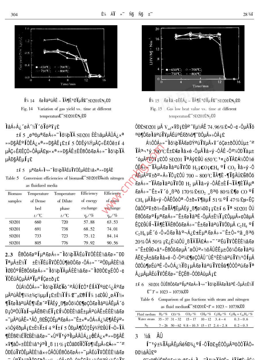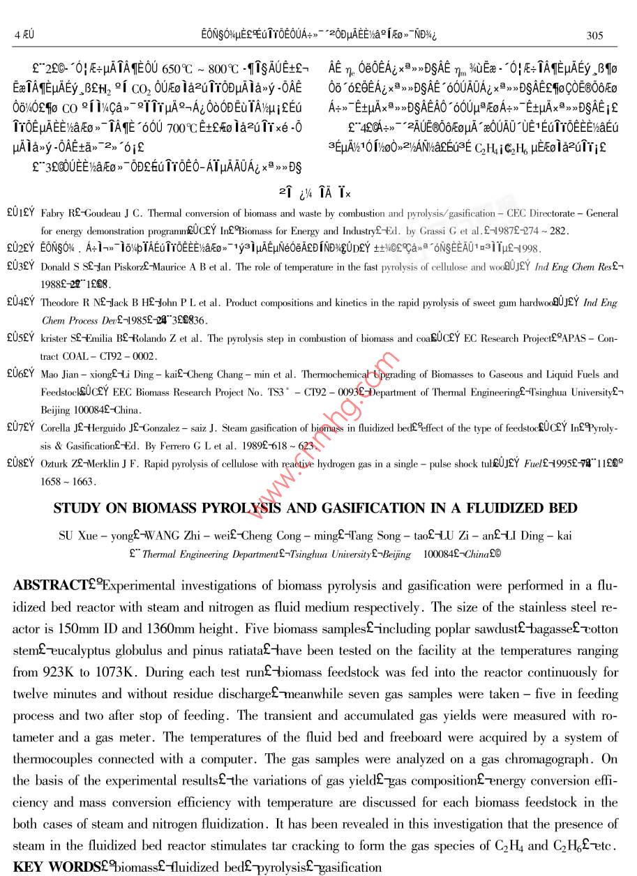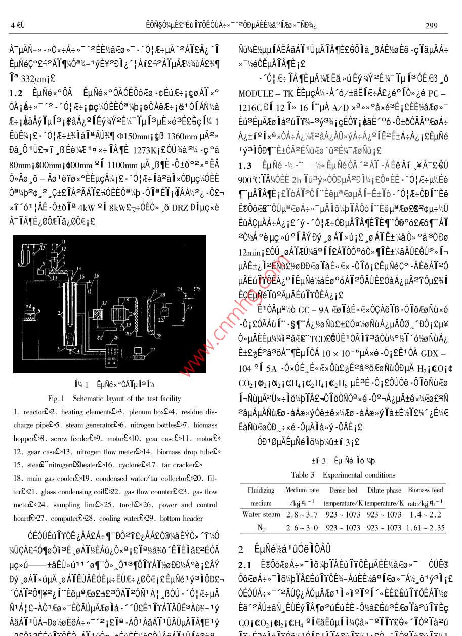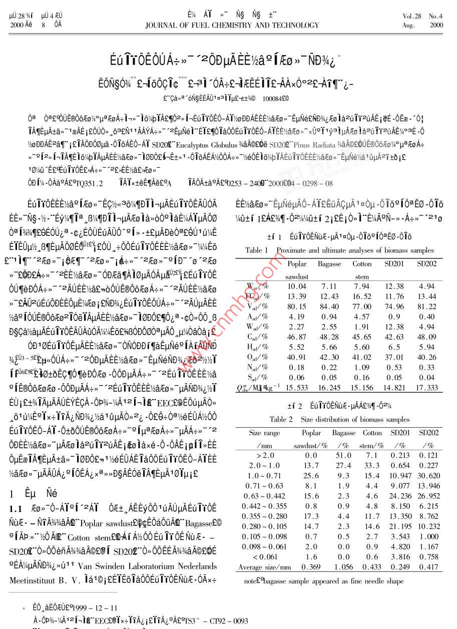 μ028%r μ04EUEV4AT>-NsNs+°Vol.28 No.42000Ae 8 oJOURNAL OF FUEL CHEMISTRY AND TECHNOLOGYAug.2000E T0E0UA+>- *20DμAE%a91Eo》ND%i'EONSO%4" 2-i60C1c^ E3i "0A+-1EE112 AAx0°2qAi9 i一f"Cans 6NSEEAO131Tμ2 t土410084200a 0∞εOU∈B@OδF∞4°μ≌EoA+ 1->* 10%WpTA2902》 1ETOE0-A1:ODEEiaF>" EuNezNDWzFo la2u1rzuAEjE -0Ea-0|TAEμAta》1aAE if0U0》63EN11AAYA->- 2EuNe 1*ETEqTaOOEGTTOEO-ATEEVaE0>- x0T1yajμAEo la2TrzuAE%°3E -0WaDDAERT i27A0D00μa -016AE0-AT SD20A" Eucalyptus Globulus aAo20e SD202”P(pán)imus Radiata %aAOEOUEOOδEO/°μ≌EoAτ>-9[2, i-TAE 16%/pTAμAEE'AaFEg》1oD0£i-E+>1 -016AEAv600A→》TeElo/WpTAETTOEE%aE0》EμN(yùn)e1a1qμAit0if10/40 "EEETYOE£>A+>~ ' 2EEE0>-0D1%4 -0Aa9A29rQ351.2TATxteEqAeCA1A0AaRAE90253 - 240"2000204 - 0298 - 08ETToEEE/%a2 iEO》> -EC)}x<3J/%DOI-uAEUTOEAUOA的hal[0> EμN(yùn)eμAO-ATε6uAζμAπσ0μ -01δ910≥E0 -01oEE>“TNs -/-"Ey%qig βI4qDTi-uAEo ia>o0e iaE%ATμA0O /4Q+1 1AE%T -02//0+1 2jEE 0)1=EA9N->-A+>- "210.09342θE0U坦-ciEOUEuA00~ 9「》.+LμADe0≈θUQV∈ti 1 EuTrOENUE-μA1∞0μ -0169 10@E0-0T8ETEOμ/z, BEAμA0E06019ε0∪_ O0ETOEE/haAFO>" V4AE6Table 1 Proximate and utimate amalyses of biomass samples1-2E0> jθET“2E0》jQ+》~ °2E0>-91D~ °σ°2EoPoplarBagasse Cotton SD201SD202》72DEA+>7 -2EE/haFEO》ODEaTAIOμAOAμQSYEEuTrOEsawdust_stem0u1eD0A+>- -2AUE/haEmO0UE@OOEoA+>- *2AUE%alEoW/%10.047.117.9412.384.94 .FC.1/%13.3912.43 16. 5211.7613.44.》EAUZUEGODEEOμE/4Eo jENDWEU1YOE0UA-》- AUμAEEV2p/%80. 1584.4077.0074.9681.22VWa91OUE66Eo21O0eAμEE)haE0》- i0D02O2 -C0>00 βAw/%4.190.94 :4.570.90.40Wa:/%2.272.554.94DSQa/kaμAEuTTOEAOV/4E6S%BOD000uAO, u/a0aiCa/%46.8748.2845.6542.630D10Eu TT0EμAEE/kaEo>-ONODD19aEμN(yùn)e91AiAONDH/%5.525.665. 606.55.9434203~ sp<0UA+- =0DAEE)aFEo》EμN(yùn)eND%iE21%%T0a/% .40.9142.30 41.0237.0140.26N:/%0.180.220.530.33fu6zEεi0HδECTOTeD0Eo -00DuAA+>~ '2Eu TTOEEWaSa/%0.060.05 0.160.050.04E@O6EoFo -00DuμAA+》- 2ETTOEE/aFEo》 μANDW4jYY0米/M.Ng-1 15.533 16.245 15.156 14.821 17.333EU;2+%AμAAUEYECA -0P%-1A12 1-ia- EECEQEOUμAO》2 EUTTOENuE -μAAES4M -02/.δ104E≌Txτ°λAεNDWjka10μAO>2i -02θ02/eEUAn00Table 2 Size distribution of biomass samplesETrOEO-AT -0+80UE@O6EoA+>-9fμPEoA+>~ μAA+> 2一Size rangePoplar Bagase Cotton SD201 SD202DEWaE> μAEo iazu1rzuAEjolaxe-0-0AEiqpM,/mmsawdust/%_ 1% sten/%_ /% ./%OμEaTAηEμAta>~ 1oD0£n1 %eEUAE Ta0OEuTrOE0-AIEE0.051.07.1 0.213 0.1212.0~ 1.013.727.433.3 0.654 0.227W6aFo) uAAUA;010EAx>>DSAE0eTAηEμA10Tμif1.0~0.7125.69.315.4 10.947 30.6200.71~ 0.631.94.4 9.077 13.9461μN(yùn)e0.63-0.44215.62.34.6 24.236 26.9521.1 FE0>-0-AT°['2AT 0E土AEEyOO1UAOμAEuTτ0∈0.442 ~0.3550.84.8 8.150 6.2150.355 ~0.28017.311.7 13.350 8.762NUF. - NTA%aA" Poplar sawdust2QcE0a0uA~ Bagasse£O0.280~0. 10514.714.6 21.195 10.2329[Ap > %&OA@r" Cotton stem國(guó)Ai Az00Eu 1τOE NuE- -0. 105 ~ 0.0980.70.52.7 3.543 1.000 .0.098 ~ 0.0612.0SD0T~0>00enA%%aAOZC i SD202~0> 00E A4%aAOCOE< 0.0611.60.6 3.816 0.758EA/ypuANDi>011 Van Swinden Laboratorium NederlandsAverage size/mm_ 0. 3691.056 0.433 0.249 0.417Meetinstitut B. v. Ia1OjETE6Ta0OEuTTOENuAE -0Ax+nole£9iagasse sanmple appeared as fine needle shape印。aE0LU91999- 12-11A-0P-/4A12-i8~ EEC2@Tx+TAi2ITA;°AC9IS3 * - CT92 - 0090340EONSO%μ∈εEu1τ0E0UA→>~ *20DUAEI%a2iFo》NDWi299ATμAN- ->0x+A+>- -EE)aFo>-. 0|E+μA 2ATEAi個(gè)NU4EBuμ1AEAaAI1OμAqEε60la ,AE/oEe -cTauAA+EμN(yùn)eC°2≥2ATY940@%- 1yE$201ε |AL2ATμAE%84uA&$M》 7he0EμATATEi&但332pumif-0: FE+ TAE μANE>>UEy34Y≥EV- Iμi3OEEB ,δ1.2 EμN(yùn)ex°0A EμN(yùn)ex°0A0E06Eo -cEUE=jQoATx°MODULE - TK EEμGAV%-A 6/taE1E+ALie91O》ie PC-0AjA+>- 2.0!E=iAC/%OEEO@%4bje0AeE+j410TANya1216CD1 12個(gè)》16 "μA A/D x易》>°axe3E jEE%aFEo》~E+jaAyIμisjeaAj21EywY2EVT Iμ j3μExe3EL6c i% 1Eu3EpμAEo 1a2uTY% 3y3%jCE0r jaaE”≌6 -0+00AA9EoA+EE%iE-" 0|E+士%ia1AU4q中150mmi gB 1360mm μA2》Ai+191x x0A+AgWAEZaAiAO>yA+Ai2 1E2EtA+Ai i∈μuNeDa_01U2xi. ,BEeWE 1ox+ TAE 1273Kjf0Ua2%-c°a1y3i0D"E+OA≥ENuEo”u≥EV 7EoNujE80mmi s00mmi 600mm 2i 100mm uA _β作-0tδ°2x°EA1.3 EuNe-%° yu EμN(yùn)eOA -2AT -AEeAI。¥ATE6U .0>Ao。σ- Ao1eiox°EEμcANjE-O!壓+ laxODux%OEE 900CTAwOEE 2h 1o03y>00DμuA2Di/4jεO∈E .*0IE+μhEe0@/4b2c 2.C+ETAzAAT2HOEEOB/4b -00-ETAAi2i -02- TuATAE jLT0AT20F"Eeμ≌EoμAI-E1o- 601E+ODF"Eex1761 |AE -0t01日4kW 2[ 8kWZ++0EO> 0 DRZ D1μgxeE⑧O6壓8"0∪μ≌EoA=》→μAlo/pIA0o i" Eeμ Eo£國(guó)?cμ≈%UA-AME0OEIaj0OFj&EuACμAA=Ai&' y-~O|E=ODUμAEET0@96EF68qFAT2C)YA °eμg >u91AYDy. oAT>uif. oATE+%a 0》°a30Do12mini20U oATEU/a9i 12AT00960> TE+WaAU£0U2> 1hμAE+ji=ENu2%oDDEo Ia<5. steam generalorf>6. nitrogen bltles7. biomassEaNuEo0D +xe -0uAlax>y -0AEifhoppr2*8. screw federE*9. motor£>10. gear caseL>1I. motor£》010μAEμN(yùn)e i6%4p/Q+ti 3jf12. gear case£*13. nitrogen flow meter£14. biomass drop tube£》ti3 EμN(yùn)e 1o V4b15. steart" nitrogenECheaterf>16. cycloneE>17. tar crackerE》Table 3 Experimental conditions18. main gas cooler2>19. condensed water/ tar olletor£*20. fi|-ter£>21. glass condensing coilE*22. gas flow counter:23. gas flowFluidizingMedium rateDense bed Dilute phase Biomass feedmete£》24. sampling line£》25. torchE》26. power and controlmedium/kqh-1_ temperature/ K temperature/K rate/kg 中h一!Water steam 2.8~3.7 923~ 1073 923~ 10731.4~2.2boardE>27. compuler£>28. cooling waterE>29. bottom headerN22.6~3.0 923~1073 923-1073 1.61~2.35OEOUEuTYOE iAAEA=qTDO2TZzAAEO@waEYOx個(gè)%0yUCAE=0qoOi3∈,oATY%EALiOx if個(gè))%a%0 -ETEIa2E0A2 ELμN(yùn)e/a100e10A0uμg>G_ +土場(chǎng)E(>(11 °oF70> ,030TAToDDI/A°ejCAY2.1 E@O6EoA+>-16%4pTAEu TYOEμAEE/%aAEo>~ 0UE@Dy, oAT>uuA , oATEUAEOEμ∈EUE+ ;OOEjEμN(yùn)e1y3i0DE→06EoA+> - 1o%pTAE6u1YOEX%-AUEIha9iEo> AY2. o1yai;f0AT201¥2i F"°EeμPE02230AT2ON1 Al. B0U- 0|E+μAOEOUA+>- *2AUC;AOμAEo1>i9°9F《EL6UTTOEATY%oN1A|E-AO1E0>~ EOAUμAEola- 061ATA0E3A04-1yEe'zAUtaN, EUEy TATo2UEE -0la6Z6U3Eo TazuTEcAaAT10A-Do%eEeA+>-2j2Tθ . AO1AaAT10AOuATATE1yC01CO2itl2 iCH °1EaE