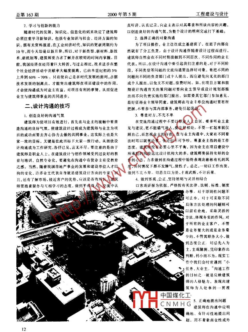 工程建設(shè)與設(shè)計2000年第5期總第163期溝通與設(shè)計丁建(機械工業(yè)部設(shè)計研究院,北京100089)提要]. 建筑師、業(yè)主兩者之間的溝通是設(shè)計的基礎(chǔ),建筑師要想使自己的創(chuàng)作理念得到社會認(rèn)可,必須重視設(shè)計溝通,學(xué)會設(shè)計溝通,把溝通作為設(shè)計過程的一條直線來貫穿把握:要努力提高建筑師自身素質(zhì).掌握溝通技巧,認(rèn)清溝通目的。|關(guān)鍵詞]建筑師與業(yè)主;溝通 與設(shè)計;素質(zhì);技巧.[中圖分類號} B825 ;TL201[文獻標(biāo)識碼] A[文章編號| 1007 - 9467(2000)05-001 -03對于任何-項真正意義上的建設(shè)工程,必然有建設(shè)方,不開本單位同事之間的配合與支持,離不開業(yè)主及項目相關(guān).即業(yè)主.當(dāng)然也離不開工程設(shè)計人員,即建筑師。這樣也就必單位的合作,,并尋求理解,互相促進,互相推動、建筑師的T然帶來了業(yè)主與建筑師之間的相互交流與合作問題。對于那作成效很大程度上.取決于這種合作能力,所以。工作中做好種所謂“業(yè)主怎樣說,建筑師就應(yīng)該怎樣做”和“建筑帥叮以協(xié)調(diào)。發(fā)揮集體優(yōu)勢。善于處理人際關(guān)系是建筑師應(yīng)有的基.把工程設(shè)計看作是純個人的建筑創(chuàng)作,想怎樣設(shè)計那是自己本能力。的事"的想法.都是行不通的,面對復(fù)雜多變的現(xiàn)實世界也是3. 分析判斷能力不合時宜的。為了做好設(shè)計.兩者之間的溝通便成了橋梁。成建筑師在設(shè)計溝通的過程中。公遇到許多隨機問題.需了設(shè)計的基礎(chǔ)。要在較短的時間內(nèi)作出分析與判斷。故要善于“聽”。曹于理設(shè)計溝通的意義就在于業(yè)主可以向建筑師全面介紹所解對方所表達(dá)的思想與意圖.以便綜臺、引納.并做出相應(yīng)的掌握的項目建設(shè)背景、設(shè)計任務(wù)要求以及希蜞和所要采取的結(jié)論,還要肯“聽”.對來自于內(nèi)部或外部的不同意見.不要拒模式,對市場的定位。而建筑師在全面、準(zhǔn)確理解業(yè)主意圖和絕.要判斷。這種能力建立在建筑帥本人的知識和經(jīng)驗之上,環(huán)境的條件下,更容易發(fā)揮發(fā)揮白己的聰明才智和專業(yè)技.也有賴于正確的思想和工作方法。能,創(chuàng)造出使業(yè)主認(rèn)可符實現(xiàn)實市場條件的作品.使大家共4. 表達(dá)能力同的夢想成真。建筑師除了要肯“聽”以外.還要辦“談".共有較強的表面對競爭日益激烈的設(shè)計市場,建筑師要想獲得成功,達(dá)能力,而且不僅停留在"口頭”,還有“筆頭”。這也是體現(xiàn)建并使自已的創(chuàng)作理念轉(zhuǎn)化為實際,必須重視溝通,學(xué)會溝能.筑師綜合素質(zhì)的一一個重要方面,只有善于表達(dá),才能真正建把溝通作為貫穿設(shè)計全過程的- -條主線來把握。有效的設(shè)計立與業(yè)土的相應(yīng)理解與信任關(guān)系,才能發(fā)揮建筑師在項目決溝通主要體現(xiàn)在提高自身素質(zhì),掌握溝通技巧,認(rèn)清溝通目策中的作用。的等幾個方面。5.獨立工作能力一、建筑師做好設(shè)計溝通應(yīng)具備的基本建筑師在與業(yè)主的交往過程中,往往需要獨當(dāng)一面,在某一范圍內(nèi)獨立完成某項配合任務(wù)。所以。作為建筑師要擺素質(zhì)脫依賴心理,收于工作.不僅接收業(yè)主的設(shè)計意圖,更多的是1.良好的專業(yè)基礎(chǔ)與業(yè)主切磋.使設(shè)計與開發(fā)理念不斷創(chuàng)新.建筑師是職業(yè)人十,業(yè)主上項目與設(shè)計機構(gòu)和建筑師合6.應(yīng)變能力作的目的是尋求技術(shù)支撐與服務(wù),建筑師做上述上作的必備設(shè)計是-項漫長的工作,伴隨著工作溝通也是-貫的.條件就是有良好的專業(yè)技能及較寬閣的知識面。若建筑師不這樣許多時候客觀突發(fā)性事情甚多,許多情況不符合預(yù)先制.具備這一基本素質(zhì),設(shè)計溝通也就無從談起。所以建筑師應(yīng)定中國煤化工善于應(yīng)付情況的變化采努力使自己成為真正意義(某一方面)上的專家.并得到業(yè)主取MHCNMH G變的月的是始終控制主的認(rèn)知。動村力的培養(yǎng)--是靠日常處2.協(xié)調(diào)合作能力理工作中的經(jīng)驗積累,也需在再研究工作計劃時,對各種可建筑師是在群體中工作的,在上程項目的設(shè)計過程中離能發(fā)生的情況多加設(shè)想,I1總第163期。2000年第5期工程建設(shè)與設(shè)計7.學(xué)習(xí)與創(chuàng)新的能力真聽講.認(rèn)真記錄,向業(yè)土表示對其尊重和所談內(nèi)容的興趣,隨著時代的發(fā)展,知識化、信息化的到來決定了建筑師以創(chuàng)造良好的溝通氣氛,為整個設(shè)計的順利完成打下基礎(chǔ)。必須注重學(xué)習(xí)新知識,包括專業(yè)知識與社會.經(jīng)濟方面的知2.選擇正確的對象溝通識。據(jù)有關(guān)資料報道,在工業(yè)經(jīng)濟時代,知識的更新周期約為為了項日操作,業(yè)主往往成立基建班子。在班子內(nèi)部自10年,而今天卻是日新月異,所以.對干新類型、新材料、新技然就有了分工負(fù)責(zé)。由于設(shè)計溝通伴隨者設(shè)計過程而進行,術(shù)新機制等,建筑師要力求了解并在較短的時間內(nèi)掌握。目建筑師自然會在不同時期接觸到不同層次、不同作用的業(yè)米前,我國經(jīng)濟在經(jīng)歷著巨大
