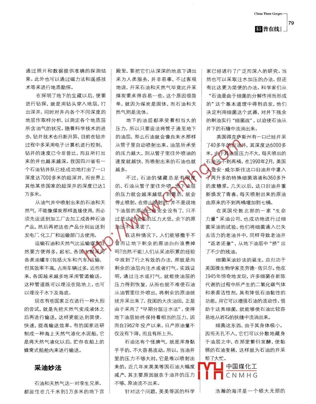 China Three Gorges7科普在線|通過照片和數(shù)據(jù)提供準確的探測結(jié)殿里,要把它們從深深的地底下請出家已經(jīng)進行了廣泛而深入的研究。當(dāng)果。此外也可以通過磁力法和遙感技來為人類服務(wù),并非易事,不過客觀然也可以采取注水加壓的辦法,但還術(shù)等來進行地質(zhì)勘探。地說,開采石油和天然氣畢竟比開采有比這更為簡便的辦法。科學(xué)家們從在探明了地下的寶藏以后,便要煤炭要來得容易一些。這個原因很簡“石油是由于細菌的分解作用而形成進行鉆探,就是用鉆頭穿入地層,打.單,就因為煤炭是固體,而石油和天的”這個基本道理中得到啟發(fā),他們出深井,同時對井內(nèi)各個不同深度的然氣則是流體。決定利用細菌這個武器,對井下殘余地層作取樣分析,以測定各個地質(zhì)層地下的油層都承受著相當(dāng)大的的剩油實行“細菌戰(zhàn)”,以迫使石油從所含油氣的狀況。隨著科學(xué)技術(shù)的進壓力,所以只要設(shè)法將管子通至地下井下的石縫中流淌出來。步鉆井技術(shù)也日新月異,目前在鉆井的油層,那么石油就會像自來水那樣美國得克薩斯州有一口已經(jīng)開采過程中多采用電子計算機進行控制,從管子里自動噴射出來。油層所承受了40多年的舊油井,其深度達6000多鉆井的速度已今非昔比,而且所打出的壓力越大,則從管子里往外噴油的米,由于其油層壓力不大,每天噴出的來的井也越來越深。我國四川省有一速度就越快,而噴射出來的石油也就石油還不到兩桶。在1990年2月,美國個石油鉆井隊已經(jīng)成功地打出了一口越多。人迪安.威爾斯往這口舊油井中灌入深度達7000多米的超深井,而世界上不過,石油的儲藏總是有限度了兩升多的特殊細菌溶液和360多升其他某些國家的超深井的深度已達1的,石油從管子里往外噴,地下油層的廢糖漿,幾天以后,這口舊油井重萬多米。的壓力就會越來越低,到最后,就會新煥發(fā)了青春,每天噴射出來的原油從油氣井中噴射出來的石油和天停止噴射。在停止噴射時,并不是說地由原來的不到兩桶增加到七桶。然氣,不能像煤炭那樣直接使用,而必下油層的原油已經(jīng)完全沒有了,只不在英國倫敦北部的一家“生命須先運送到加工廠去加工成各種石油過是這時油層的壓力太低,余下的原力量”采油公司,也成功地進行過細產(chǎn)品,然后再把這些產(chǎn)品分別運送到油壓不上來罷了。菌采油的試驗。他們將細菌通入已失發(fā)電廠化工廠和運輸部門去使用。在這種情況下,人們能夠撒手不去活力的老油井中,同樣導(dǎo)致老油井運輸石油和天然氣比運輸煤炭自管而讓地下剩余的原油白白浪費掉“返老還童”,從地下油層中“擠”出然要方便得多。起初,各國大都采用嗎?當(dāng)然不能!人們從采油積累的經(jīng)驗了不少的殘油。各類油罐車(包括火車和汽車)運輸,中找到了行之有效的辦法,那就是向細菌采油妙法的誕生,應(yīng)歸功于但其效率不高,占用車輛過多。近些年剩余的油層內(nèi)注水或者打氣。實踐證美國微生物學(xué)家克勞德.佐貝爾。他在來,各國越來越多地采用管道輸送。明,通過注水或打氣,就能使油層的1945年驚奇地發(fā)現(xiàn),許多細菌在新陳這種管道既可以埋沒在陸地上,也可壓力得到恢復(fù),從而也就不難使石油代謝的過程中所產(chǎn)生的二氧化碳氣體以埋沒于水下及海底。從油管里往外噴出,將剩余的原油統(tǒng)和表面活性劑,具有降低石油黏性的現(xiàn)在有些國家正在進行-種大膽統(tǒng)開采出來了。我國的大慶油田,正是功能,用它可以增強石油的流動性。借的嘗試,就是先把天然氣變成液體之由于采用了“早期分層注水法”,使得助于這類細菌,就能夠使石油比較容后再進行輸送,這樣更能達到簡便、地下油層始終保持著相當(dāng)?shù)膲毫?因易地從巖石的狹縫中流淌出來??焖?,提高輸送效率。有的國家還研而自1962年投產(chǎn)以來,日產(chǎn)原油量不細菌這東西,由于其身體極小,制成一種海上天然氣液化水泥船,它僅沒有下降,而且有所上升。因而無孔不入,它們可以分散地藏身是將天然氣液化以后,貯存在船上的石油還有個怪脾氣,就是渾身黏于油層之中,在那里繁衍發(fā)酵,使黏蜂窩式船艙內(nèi)來進行輸送。乎乎的,不大容易流動。所以,當(dāng)油井稠的石油變稀,這樣就為石油的開采里的壓力不夠大時,它是難以噴射出幫了大忙。采油妙法來的。近幾年來英美等國石油大幅度中國煤化工減產(chǎn),其主要原因就在于油井的壓力HCNMH G石油和天然氣這一對孿生兄弟,不夠,原油流不出來。都居住在幾千米到1萬多米的地下宮針對這個問題,英美等國的科學(xué)浩瀚的海洋是-個碩大無朋的.|中國3三峽|8天然聚寶盆,在那里蘊藏極其豐富的物,加之江河入海時常將大量的泥沙學(xué)技術(shù)的發(fā)展,后來出現(xiàn)了類似于大生物資源、礦物資源、化學(xué)資源和動力帶到這里,這就為石油和天然氣的形型水壓機的立柱式平臺。這種在技術(shù)資源。僅以礦物資源而論,海底蘊藏成創(chuàng)造了極為有利的條件。因此,在.上較為先進的平臺,可以自由地豎立的金屬礦藏相當(dāng)于陸地儲量的幾十倍大陸架和大陸坡的海底蘊藏著極其豐在海上。到幾百倍。據(jù)有關(guān)資料介紹,海底蘊富的石油和天然氣資源,其數(shù)量達全現(xiàn)在已經(jī