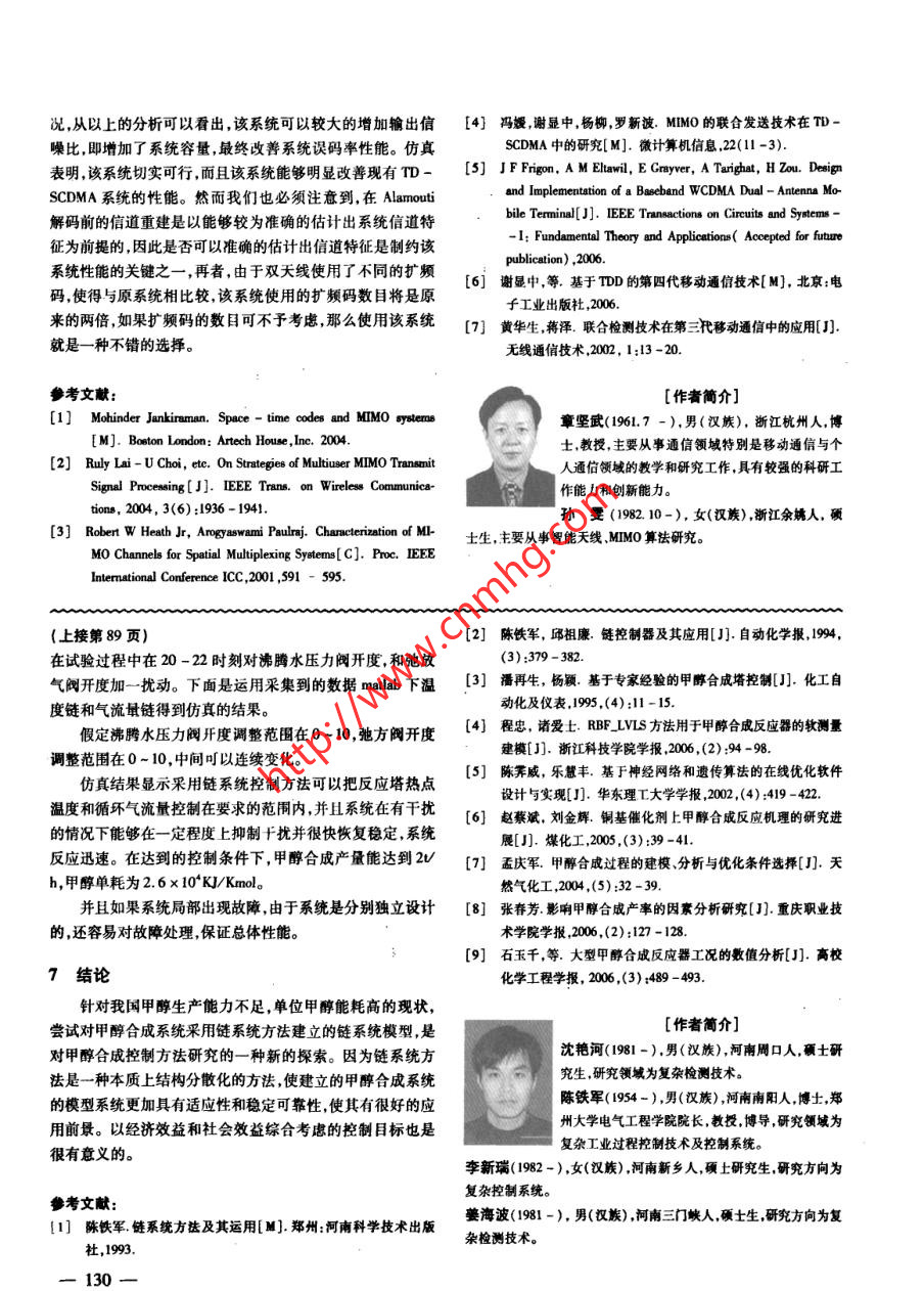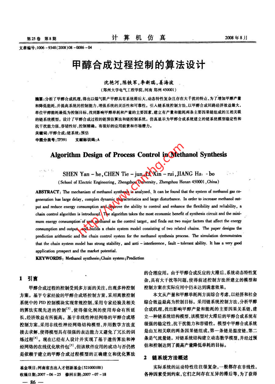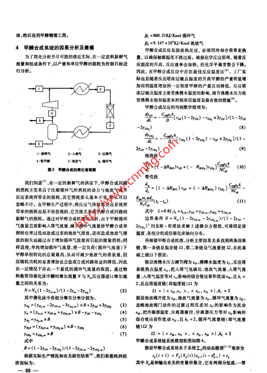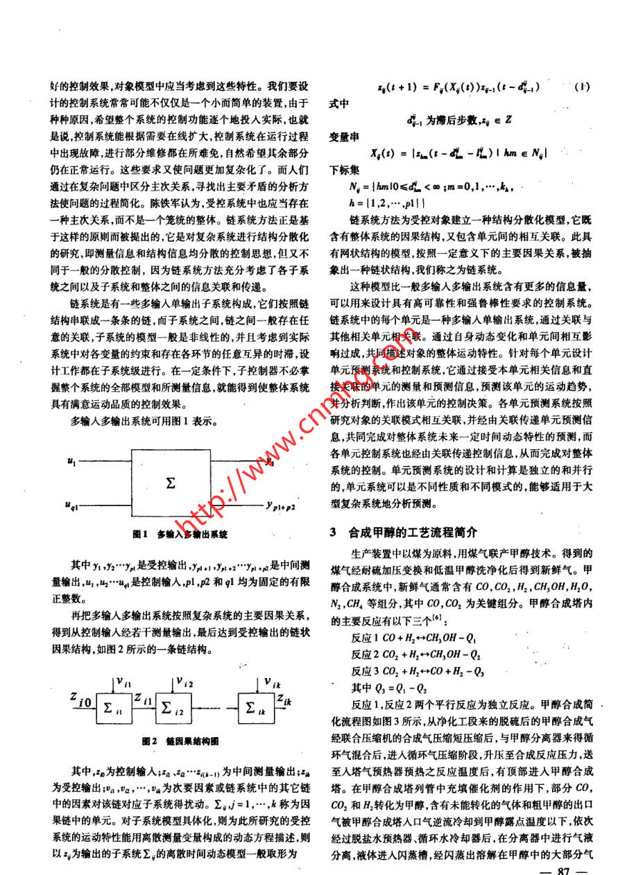 第25卷第8期計(jì)算機(jī)仿真2008年8月文章編號(hào):1006 -9348(2008)08 -0086 -04甲醇合成過(guò)程控制的算法設(shè)計(jì)沈艷河,陳鐵軍,李新瑞,姜海波(鄭州大學(xué)電氣工程學(xué)院,河南鄭州40001)摘要:分析了甲醇合成機(jī)理,得出以煤氣聯(lián)產(chǎn)甲醇具有系統(tǒng)滯后大,動(dòng)態(tài)特性復(fù)雜且存在大f擾的特點(diǎn),為了增加甲醇產(chǎn)量和降低能耗,并提高系統(tǒng)的控制能力,增強(qiáng)系統(tǒng)的靈活性和可靠性。引人鏈系統(tǒng)控制方法,以甲醇合成回路經(jīng)濟(jì)效益最大,單位甲醇能耗最低為控制目標(biāo),找到影響甲醇單耗和產(chǎn)量的主要因素,建立有產(chǎn)量和能耗兩條主要因果鏈組成的互相關(guān)聯(lián)的鏈系統(tǒng)模型。設(shè)計(jì)了甲醇合成過(guò)程的鏈預(yù)估算法和鏈控制系統(tǒng)。仿真顯示為甲醇合成系統(tǒng)建立的鏈系統(tǒng)模型穩(wěn)定性和抗干擾能力強(qiáng),容錯(cuò)性好,控制精確。有很好的應(yīng)用前景和市場(chǎng)潛力。關(guān)鍵詞:甲酶合成;鏈系統(tǒng);預(yù)估中團(tuán)分類(lèi)號(hào):TP391文獻(xiàn)標(biāo)識(shí)碼:AAlgorithm Design of Process Control in Methanol SynthesisSHEN Yan - he ,CHEN Tie - jun,LI Xin - rui ,JIANG Hal - bo(School of Electic Engineering, Zhenghou Univernity, Zhengzhou Henan 450001 ,China)ABSTRACT: The mechanism of methanol synthesis is analyzed. It can be found that the system of methanol gas cogeneration has large delay , complex dynamice characteristics and large disturbance. In order to increase methanol out-put and reduce energy consumption and improve the ability to control and enhance the flexibility and reliability, achain control algorithm is introduced. The algorithm takes the most economic beneft of syntheis circuit and the mini-mum energy consumption 'of unit methanol as the control target, and finds out two major factors that afet the energyconsumption and output, and builds' a chain system model consisting of two related chains. The paper designs theprediction arithmetic and the chain control system for the methanol syntheis process. The simulation demonstratesthat the chain system model has strong stability, and anti - interference, fault - tolerant ability. It has a very goodapplication prospect and the market potential.KEYWORDS: Methanol eynthesis ;Chain system;Prediction的合理應(yīng)用。由于甲醇合成反應(yīng)的大滯后系統(tǒng)動(dòng)態(tài)特性復(fù)1引言雜,具有大千擾等問(wèn)題,使得前述控制方法所建立的模型和甲醇合成過(guò)程的控制受到多方面的關(guān)注,出現(xiàn)多種控制控制方案在實(shí)際應(yīng)用中仍未達(dá)到滿(mǎn)意效果。方案。基于專(zhuān)家經(jīng)驗(yàn)的甲醇合成塔控制方案,采用離散控制本文從產(chǎn)量和甲醇單耗兩方面綜合考慮,以經(jīng)濟(jì)和社會(huì)系統(tǒng)中的PID控制模塊實(shí)現(xiàn)常規(guī)控制,采用專(zhuān)家經(jīng)驗(yàn)及相關(guān)綜合效益最高為控制目標(biāo)。采用鏈系統(tǒng)控制方法,分析甲醉的算法實(shí)現(xiàn)先進(jìn)的控制'),使得催化劑的使用壽命有所延合成機(jī)理,找出影響甲醇產(chǎn)量和能耗的主要因果關(guān)系鏈,建長(zhǎng),經(jīng)濟(jì)效益有所提高?;诜蔷€性神經(jīng)網(wǎng)絡(luò)的甲醇合成塔立一種鏈系統(tǒng)結(jié)構(gòu)模型,該模型對(duì)大滯后的甲醇合成系統(tǒng)有控制方案,采用非線性神經(jīng)網(wǎng)絡(luò)結(jié)構(gòu)模型,并用數(shù)學(xué)方法直很強(qiáng)的穩(wěn)定性,抗干擾能力和容錯(cuò)性。模型中甲醇合成系統(tǒng)接去求解,使得模型具有很強(qiáng)的表達(dá)能力又避免了冗長(zhǎng)的訓(xùn)是由互相關(guān)聯(lián)的兩條因果鏈組成,第- -條鏈?zhǔn)菧囟孺?第二練過(guò)程(4)?,F(xiàn)在已經(jīng)有人設(shè)計(jì)并實(shí)現(xiàn)了基于遺傳算法和神條是氣流量鏈。對(duì)鏈系統(tǒng)結(jié)構(gòu)建立動(dòng)態(tài)數(shù)學(xué)模型,并經(jīng)過(guò)預(yù)經(jīng)網(wǎng)絡(luò)的在線優(yōu)化軟件包[5] ,但該軟件應(yīng)用的成功與否仍然估和控制達(dá)到了提高產(chǎn)量降低單耗的目標(biāo)。是依賴(lài)于建立的甲醇合成過(guò)程模型的正確建立和優(yōu)化算法2鏈系統(tǒng)方法概述基金項(xiàng)目:河南省杰出人才創(chuàng)新基金(521000100)實(shí)際系統(tǒng)的運(yùn)動(dòng)特性往往很復(fù)雜,一般都存在非線性,收稿日期:2007-06-25修回日期:007 -07 -18各種因素受到約束,它們之間存在互異的滯后等,為了獲得--86一-好的控制效果,對(duì)象模型中應(yīng)當(dāng)考慮到這些特性。我們要設(shè)q(t+1) = F(X())5.(t-4)’(1)計(jì)的控制系統(tǒng)常??赡懿粌H僅是一個(gè)小面簡(jiǎn)單的裝置,由于式中種種原因,希望整個(gè)系統(tǒng)的控制功能逐個(gè)地投人實(shí)際,也就娘為滯后步敷,與e z是說(shuō),控制系統(tǒng)能根據(jù)需要在線擴(kuò)大,控制系統(tǒng)在運(yùn)行過(guò)程變量串中出現(xiàn)故障,進(jìn)行部分維修都在所難免,自然希望其余部分X(1) = {xm(t-4-L)1hme N|仍在正常運(yùn)行。這些要求又使問(wèn)題更加復(fù)雜化了。而人們下標(biāo)集通過(guò)在復(fù)雜問(wèn)題中區(qū)分主次關(guān)系,尋找出主要矛盾的分析方Ng= {hml0≤dL <∞;m=0,1,.k,法使問(wèn)題的過(guò)程簡(jiǎn)化。陳鐵軍認(rèn)為,受控系統(tǒng)中也應(yīng)當(dāng)存在h={1,2,*.,p1}{一種主次關(guān)系,