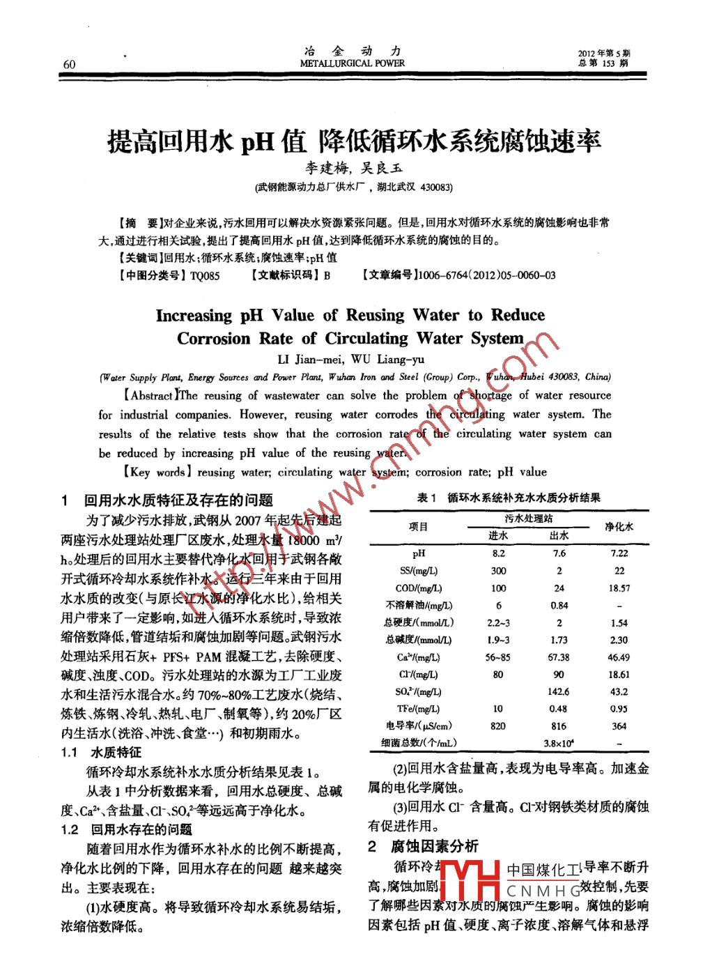 提高回用水pH值降低循環(huán)水系統(tǒng)腐蝕速率