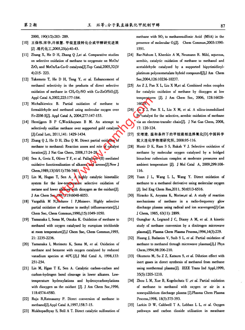 34天然氣化工(C1化學(xué)與化工)2013年第38卷分子氧直接氧化甲烷制甲醇王玨,朱麗華,徐鋒*(黑龍江科技大學(xué)安全工程學(xué)院,哈爾濱150027)摘要:從氣相氧化、液相氧化和等離子體轉(zhuǎn)化三個(gè)方面對(duì)分子氧直接氧化甲烷制甲醇的研究進(jìn)展進(jìn)行了分析和評(píng)述。關(guān)于氣相和液相轉(zhuǎn)化法,著重介紹了催化劑方面所取得的成果及對(duì)反應(yīng)性能的影響;關(guān)于低溫等離子體轉(zhuǎn)化法,主要討論了單一-等離子體反應(yīng)和等離子體催化耦合反應(yīng)的研究成果。基于分子氧直接氧化甲烷制甲醇的研究現(xiàn)狀,提出了今后研究的幾個(gè)重要方向。關(guān)鍵詞:分子氧;甲烷;甲醇;直接氧化中圄分類號(hào):TQ223.121 ;TQ031.7文獻(xiàn)標(biāo)識(shí)碼:A文章編號(hào):1001-9219(2013)02-84-05甲烷直接氧化合成甲醇可簡(jiǎn)化工藝,減少投資甲烷氣相均相氧化反應(yīng)機(jī)理一般認(rèn)為是自由和生產(chǎn)成本,裝置規(guī)模適應(yīng)范圍廣,因此- -直倍受基反應(yīng),因此反應(yīng)器的材料是影響甲烷轉(zhuǎn)化率和甲研究者的關(guān)注3。在甲烷氧化制甲醇的反應(yīng)中,由醇選擇性的一個(gè)很重要因素。惰性反應(yīng)器材料可以于容易發(fā)生過度氧化,因此許多研究者對(duì)氧化劑進(jìn)在一定程度上阻止產(chǎn)物的過度氧化。有研究者比較行了探討,試圖找出比較溫和的氧化劑,減少甲烷了玻璃、聚四氟乙烯、銀、銅和不銹鋼幾種材料制成的過度氧化4。從環(huán)境保護(hù)和原料來(lái)源角度考慮,分的反應(yīng)器對(duì)甲烷氣相均相氧化制甲醇的影響,證明子氧無(wú)疑是甲烷氧化制甲醇最理想的氧化劑。因在同等反應(yīng)條件下,使用玻璃襯里反應(yīng)器獲得的甲此,本文對(duì)分子氧直接氧化甲烷制甲醇的研究進(jìn)行烷轉(zhuǎn)化率和甲醇選擇性最高,而聚四氟乙烯襯里反了分析評(píng)述。應(yīng)器次之間。在CH-O2體系中添加催化劑可以提高甲烷的1氣相氧化反應(yīng)活性。NO, 是甲烷分子氧氧化制甲醇的良好催1985年,Gesser等人發(fā)現(xiàn),在高溫高壓、沒有化劑。在CH2O2體系中添加少量的NO,有利于甲催化劑的條件下甲烷和氧氣可以反應(yīng)生成甲醇,研醇的生成回。雖然在CH-O2體系中添加NO2后,甲究者利用具有及時(shí)將目標(biāo)產(chǎn)物從高溫反應(yīng)區(qū)轉(zhuǎn)移烷的轉(zhuǎn)化率和選擇性有所提高,但反應(yīng)不可避免地功能的驟冷脈沖式燃燒反應(yīng)器進(jìn)行甲烷轉(zhuǎn)化實(shí)驗(yàn)產(chǎn)生CO,和水,NO,和水存在時(shí)會(huì)對(duì)設(shè)備造成嚴(yán)重時(shí),甲烷的轉(zhuǎn)化率可達(dá)6.1%,而甲醇的選擇性約為的腐蝕!。由于目標(biāo)產(chǎn)物甲醇熱力學(xué)上的不穩(wěn)定性,29%6。Zhang等四利用自行設(shè)計(jì)的反應(yīng)器,在4309C~甲烷氧化制甲醇的催化劑必須同時(shí)兼顧高選擇性4709C. 5.0MPa Q.(CH/O2N)= 100/10/10 ml. min:'條和良好的穩(wěn)定性。國(guó)內(nèi)外學(xué)者對(duì)MoO/SiO2、V2OJ件下進(jìn)行了甲烷氣相均相選擇氧化制甲醇的研究,SiO2、MoO3●Cr2O2/SiO2、Fe-Mo、FePOJSiO2等多種催得到了甲醇收率為7%~8%,甲醇選擇性為60%的化劑進(jìn)行了廣泛的研究,都沒有取得令人滿意的結(jié)實(shí)驗(yàn)結(jié)果。近年美國(guó)開發(fā)了一種名為GasTechno⑧果。近期,Zhang"發(fā)現(xiàn), MoO/La-Co-O催化劑對(duì)甲醇的甲烷非催化--步氧化制甲醇新工藝圈,采用獨(dú)特的生成有較高的選擇性。用7%MoOJ/La-Co-0催化的工藝技術(shù),提高了其經(jīng)濟(jì)性。劑可以獲得60%的甲醇選擇性和6.7%的甲醇產(chǎn)率。Takemoto等凹揭示,在CH-OrNO,體系中添加收稿日期:2012-10-30;基金項(xiàng)目:國(guó)家自然科學(xué)基金項(xiàng)目Cu-ZnO/SiO2催化劑后甲醇的選擇性提高,當(dāng)Cu-(51004045),黑龍江省教育廳科學(xué)技術(shù)研究項(xiàng)目ZnO/SiO2催化劑中CuO:ZnO;SiO2的質(zhì)量比為3:7:(12511481),河北省資源勘測(cè)研究重點(diǎn)實(shí)驗(yàn)室開放基金項(xiàng)目90時(shí),得到的C;產(chǎn)物全是甲醇。Michalkiewicz在(2201206);作者簡(jiǎn)介:王玨(1987-),女,碩士研究生;*通訊作者:徐鋒(1979-), 男,副教授,碩士生導(dǎo)師,電話3509C~6509C、大氣壓條件下進(jìn)行甲烷分子氧催化氧15846610605 ,電郵xufeng79_ _79@163.com。化制甲醇的研究表明,使用Fe-HZSM-5催化劑能提第2期王玨等:分子氧直接氧化甲 烷制甲醇8高甲烷的轉(zhuǎn)化率,n(Si)/n(Fe)=22時(shí)轉(zhuǎn)化率最高,達(dá)2003年,Mukhopadhyay等網(wǎng)以PdCl-CuCl2 為31.51%;使用Fe-NaZSM-5催化劑能提高甲醇的選催化劑,在H2SO4溶液中通過SO2與CH4的作用合擇性,n(Si)n(Fe)=45時(shí),選擇性最高,達(dá)74.37%。最成了CHSO2H。近,Herejgers等叫考察了分子氧氣相選擇氧化甲烷2004年,Neumann等叫以[Pr (mebipym)Cl2]+-制甲醇反應(yīng)中,負(fù)載金的催化劑的作用。對(duì)于負(fù)載[HPV2MoroO40]-/SiO2為催化劑、H2SO4 或型貴金屬催化劑,提高其在載體上的分散度對(duì)改善HsPV2MonoOo的水溶液為溶劑,在50C、有氧條件下催化劑的性能意義重大。成功合成了甲醇。對(duì)于甲烷的氣固多相催化反應(yīng),催化劑的填放受生物氧化的啟發(fā),An等網(wǎng)于2006年,在.位置影響著甲醇的生成及產(chǎn)物分布。Zhang 等I等CFsCOOH介質(zhì)中,以Pd2+作為甲烷氧化的活性中將反應(yīng)劃分為“前反應(yīng)區(qū)”