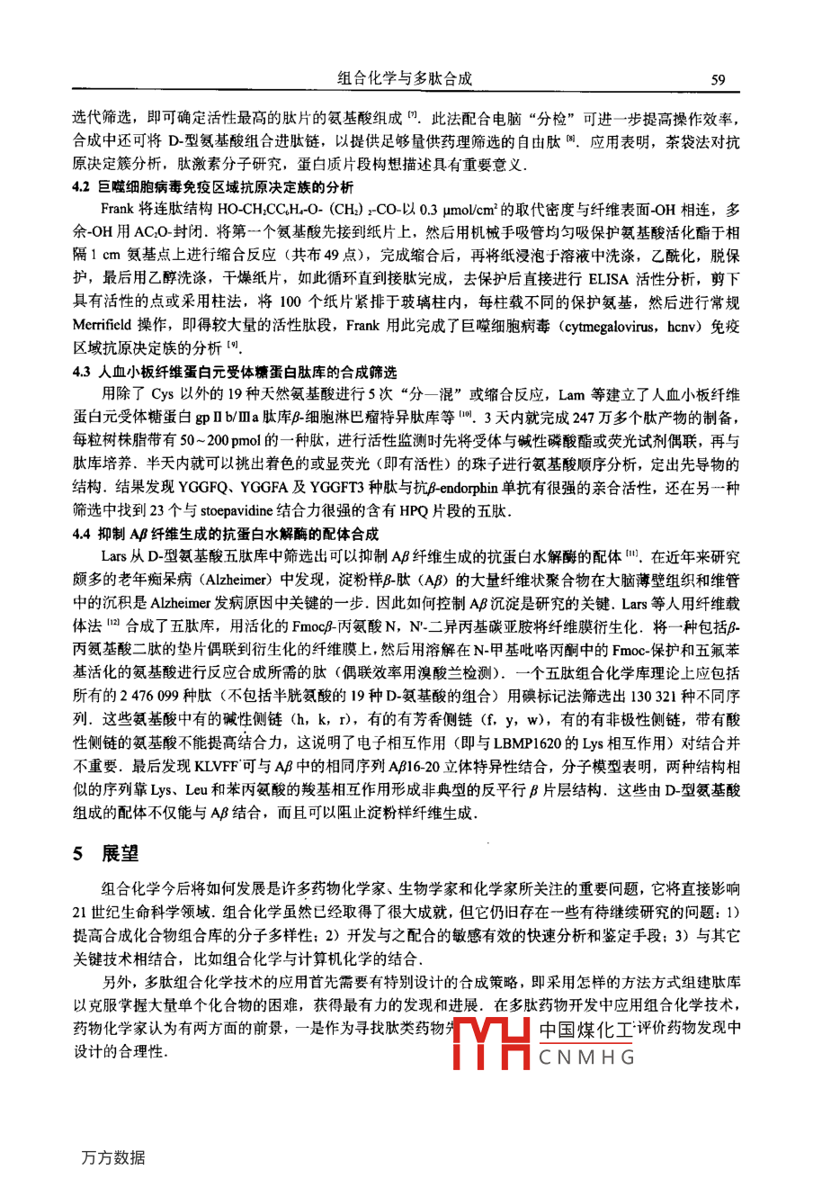 2004年2月.河北工業(yè)大學(xué)學(xué)報(bào)February 2004第33卷第1期JOURNAL OF HEBEI UNIVERSITY OF TECHNOLOGYVol.33 No.1文章編號: 1007-2373 (2004) 01-0055-06組合化學(xué)與多肽合成馬宇輝,趙靜波,趙繼全,鄭輝杰(河北工業(yè)大學(xué)化工學(xué)院,天津300130 )摘要:介紹了組合化學(xué)產(chǎn)生的背景和組合化學(xué)的定義以及組合庫的構(gòu)建和鑒別方法,并就其在多肽合成方面的應(yīng)用述以實(shí)例,最后對其發(fā)展方向作- -展望.關(guān)鍵詞:組合化學(xué);快速篩選;多肽庫; 功能多肽;多肽合成中圖分類號: 0621.3文獻(xiàn)標(biāo)識碼: A0引言進(jìn)入90年代以來,盡管新藥研究的投資不斷增長,但是新藥先導(dǎo)化合物(Lead compounds)出現(xiàn)速度卻越來越慢,如何最大限度地篩選各種新化合物及其異構(gòu)體,即“快速篩選”,從而首先找到具有藥效作用的先導(dǎo)化合物,是當(dāng)今化學(xué)正在努力解決的重要課題之- -.建立化合物庫進(jìn)行多模型篩選即組合化學(xué)的方法是國外各大醫(yī)藥公司普遍采用的方法.組合化學(xué)(Combinatorial chemistry)最早稱為同步多重合成(Simulaneous Multiples synthesis),合成肽組合庫(Synthetic peptide combinatorial Library),也稱組合合成(Combinatorial syothesis),組合庫(Combinatorial Library)和自動(dòng)合成法(Autosynthesis) 等,60年代初建立的固相多肽合成法為組合化學(xué)方法的建立奠定了基礎(chǔ).80年代中期建立的多中心合成法和茶葉袋法中首次引入了肽庫的概念,本文將結(jié)合功能多肽的篩選著重介紹有關(guān)組合化學(xué)的基本理論、組合庫的合成方法、目標(biāo)產(chǎn)物的篩選,并就組合化學(xué)今后的發(fā)展提出自己的觀點(diǎn)和意見,以期促進(jìn)組合化學(xué)在我國的推廣應(yīng)用.1組合化學(xué) 的基本理論所謂組合化學(xué)",就是將諸如氨基酸、核苷酸、有機(jī)小分子類的構(gòu)建單元按某種組合方式連接起來,合成出包含大量化合物的化學(xué)庫,并從中篩選出具有某種物理、化學(xué)或藥理活性化合物的一套合成策略和篩選方案.僅僅幾年時(shí)間,組合化學(xué)就發(fā)展成具有如下研究新內(nèi)容的交叉學(xué)科: 1)隨機(jī)肽,蛋白及非天然聚合體化學(xué)庫; 2) 寡糖及寡糖核苷酸庫; 3)小分子有機(jī)化合物庫: 4) 化學(xué)庫的設(shè)計(jì)、構(gòu)建及自動(dòng)化合成; 5) 分子標(biāo)記、分子骨架和構(gòu)件單元試劑盒; 6)快速及計(jì)算機(jī)篩選; 7) 化合物庫數(shù)據(jù)處理及軟件工具; 8)群集篩選方法的研究; 9)組合化學(xué)技術(shù)工業(yè).組合化學(xué)研究的3個(gè)基本階段為: 1) 分子多樣性化學(xué)庫的合成(包括設(shè)計(jì)模板分子、研究和優(yōu)化組合合成方法、選擇構(gòu)建單元、規(guī)定化學(xué)庫的容量,保證化學(xué)庫的再生,尋求化學(xué)庫的質(zhì)量監(jiān)控方法及優(yōu)化條件,完成自動(dòng)化合成等); 2)群集篩選(設(shè)定液相或固相篩選方法,即合成產(chǎn)物是掛在樹脂上還是切落于溶液中進(jìn)行篩選.選擇篩選模型,包括細(xì)胞功能性篩選,受體、抗體,基因表達(dá)蛋白篩選,采用的指示方法如染料染色、熒光標(biāo)記、同位素標(biāo)記以及自動(dòng)化篩選等); 3) 化學(xué)庫解析,譯碼(即確認(rèn)活性分子結(jié)構(gòu),有Houghten的逐位和二元定位理論、親和選擇法、檢索庫法、編碼化學(xué)庫等).中國煤化工收稿日期: 2003-07-02作者簡介:馬字輝(1978-), 女(漢族), 碩士生.MYHCNMHG5河北工業(yè)大學(xué)學(xué)報(bào)2004年第1期2組合庫的合成方法.組合化學(xué)研究的基本思想是合成分子多樣性化學(xué)庫.每-一個(gè)化學(xué)庫都具有分子的復(fù)雜性或稱為可變性和多樣性、復(fù)雜性代表了所有可變的位置;多樣性則反映了給定化學(xué)庫內(nèi)分子在生物化學(xué)性質(zhì)和化學(xué)結(jié)構(gòu)上非類似性,分子間沒有簡單的定量關(guān)系.組合庫的方法與傳統(tǒng)的合成方法存在顯著差異,以往的合成方法,一次只合成一種產(chǎn)物:而組合的方法,同時(shí)用n個(gè)單元與另-組n'個(gè)單元反應(yīng),得到所有組合的混合物,即n+n' 個(gè)構(gòu)建單元,產(chǎn)生nxn'個(gè)構(gòu)建單元,產(chǎn)生nxn'個(gè)化合物,如圖1.A+B-傳統(tǒng)?ABAl+ BAx+ B2A,+ B,組合合成+ AB, (所有可能的組合)nxn'個(gè)化合物A.+ B.圖1組合合成方法與傳統(tǒng)合成方法比較示意圖以肽類化合物為例,用20種天然氨基酸為構(gòu)建單元,二肽便有400 (20) 種組合,三肽有8 000(20)種組合.以此類推,到8肽將有25 600000000 (20)種組合.常見的組合庫構(gòu)建方法有混合-均分法(- -株-肽),迭代展開法,位置掃描法,光控定位合成法,茶葉袋法等等,現(xiàn)在就多肽合成為例列舉幾種組合庫的構(gòu)建方法.2.1混合- -均分法(一株-肽)混合-均分法是建立最早,應(yīng)用最廣泛的組合化學(xué)方法、“一株 一肽”合成法結(jié)合了“混合一均分”合成方法和生物篩選技術(shù)特點(diǎn),建立了Selectide使組合化學(xué)技術(shù)向前大大推動(dòng)了一步,成為今天基本方法之一.該法利用樹脂做載體,進(jìn)行隨機(jī)合成,可以同步合成上百萬個(gè)多肽分子.首先將19種保護(hù)的天然氨基酸(由于Cys易氧化成二硫鍵,故沒用)分別連在樹脂上,得到19種在樹脂上的氨基酸,混合脫除保護(hù),再分成19份,分別與19種保護(hù