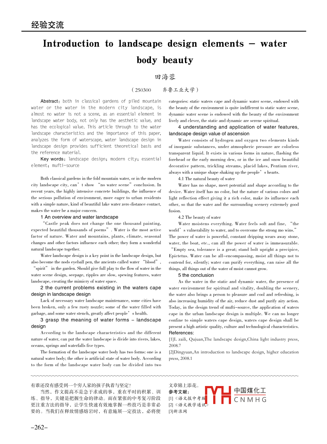 經(jīng)驗(yàn)交流Introduction to landscape design elements 一waterbody beauty田海蓉( 250300齊魯工業(yè)大學(xué))Abstract: both in classical gardens of piled mountain categories: static waters cape and dynamic water scene, endowed withwater or the water in the modern city landscape, is the beauty of the environment is quite idifferent to static water scene,almost no water is not a scene, as an essential element in dynamic water scene is endowed with the beauty of the environmentlandscape water body, not only has the aesthetic value, andlively and clever, the static and dynamic are serene spiritual.has the ecological value. This article through to the water4 understanding and application of water features,landscape characteristics and the importance of this paper, landscape design value of ascensionanalyzes the form of waterscape, water landscape design inWater consists of hydrogen and oxygen two elements kindslandscape design provides suff icient theoretical basis andof inorganic substances, under atmospheric pressure are colorlessthe reference material.transparent liquid. It exists in various forms in nature, flashing theKey words: landscape design; modern city; essential forehead or the early morning dew, or in the ice and snow beautifulelement; mufti- -sourcedecorative pattern, trickling streams, placid lakes, Pentium river,always with a unique shape shaking up the people' s hearts.Both classical gardens in the fold mountain water, or in the modern4.1 The natural beauty of waterrecent years, the highly intensive concrete buildings, the infuence of device. W ater itself has no color, but the nature of various colors andthe serious pollution of environment, more eager to urban residents light rflection efet giving it a rich color, make its influence eachwith a simple nature, kind of beautiful lake water zero distance contact, other, so that the water and the surrounding scenery extremely goodmakes the water be a major concern.fusion.1 An overview and water landscape“Castle peak does not change the one thousand painting,W ater moistens everything. Water feels soft and fine,“ theexpected beautiful thousands of poems”. Water is the most active world ’s vulnerability to water, and to overcome the strong mo wins."factor of nature. W ater and mountains, plants, climate, seasonal The power of water is powerful, constant dripping wears away stone,changes and other factors influence each other; they form a wonderfulnatural landscape together.“Empty sea, tolerance is a great; stand bolt upright a precipice,W ater landscape design is a key point in the landscape design, but Epictetus. W ater can be all-encompassing, moist all things not toalso become the nods eyeball pen, the ancients called water "blood” ,contend for, silently; water can purify everything, can raise all the“spirit” in the garden. Should give full play to the flow of water in thethings, all things out of the water of moist cannot grow.spew ing features, water5 the conclusionlandscape, creating the mimicry of water space.As the water in the statie and dynamic water, the presence of2 the current problems existing in the waters cape water environment for spiritual and vitality, doubling the scenery,design in landscape designthe water also brings a person to pleasure and cool and refreshing, isLack of necessary water landscape maintenance, some cities havealso increasing humidity of the air, reduce dust and purify airy action.been broken, only a few rusty nozzle; some of the water flled with Today, in the design trend of mufti- -souree, the application of watersgarbage, and some water stench, greatly afet people’s health.cape in the urban landscape design is multiple. We can no longer3 grasp the meaning of water forms - landscape confine to simple waters cape design, waters cape design shall bedesignpresent a high artistic quality, culture and technological characteristics.According to the landscape characteristics and the different References:nature of water, can put the water landscape is divide into rivers, lakes, [1]L zaili, Qujuan,The landscape design,China light industry press,oceans, springs and waterfalls five types.2008.7The formation of the landscape water body has two forms: one is a[2]Dingyuan,An introduction to landscape design, higher educationnatural water body; the other is artificial state of water body. Accordingpress, 2008.1to the form of the landscape water body can be divided into two有誰(shuí)還沒(méi)有感受到-個(gè)窮人家的孩子執(zhí)著與堅(jiān)定?文章錦上添花。當(dāng)然, 作文提高不是急于求成的事,重在平時(shí)的積累、訓(xùn)參考 文獻(xiàn):中國(guó)煤化工練、指導(dǎo),關(guān)鍵是把握生命的律動(dòng)。而在緊張的中考復(fù)習(xí)階段[1] 《語(yǔ)文報(bào)中考版,MYHCNMHG更注重方法的指導(dǎo),讓學(xué)生快速有效地掌握一些技巧是非常必 [2] 《語(yǔ)文教學(xué)通訊要的。當(dāng)我們?cè)卺尫徘楦腥蹘r時(shí),有意施展- -定技法, 必將使[3}新浪網(wǎng)-262-