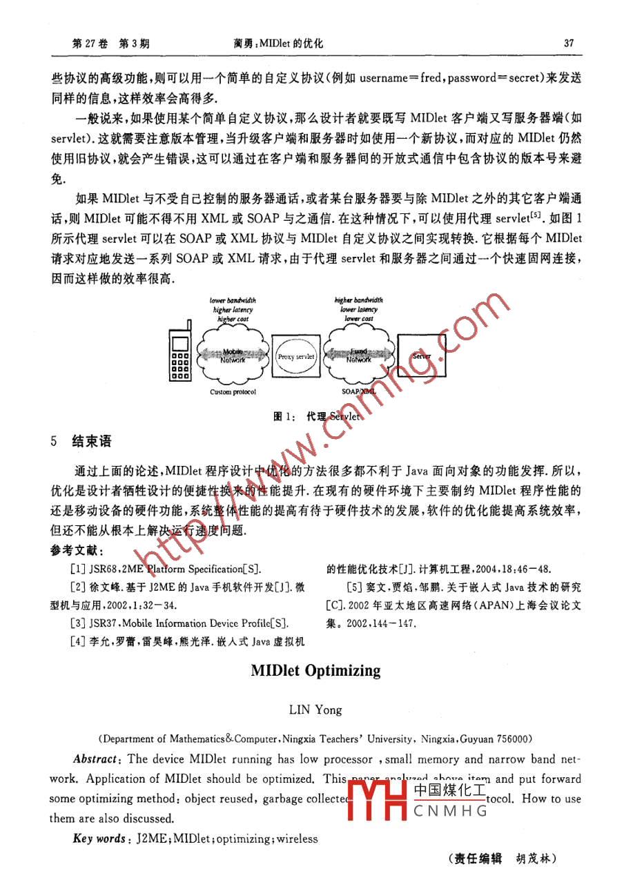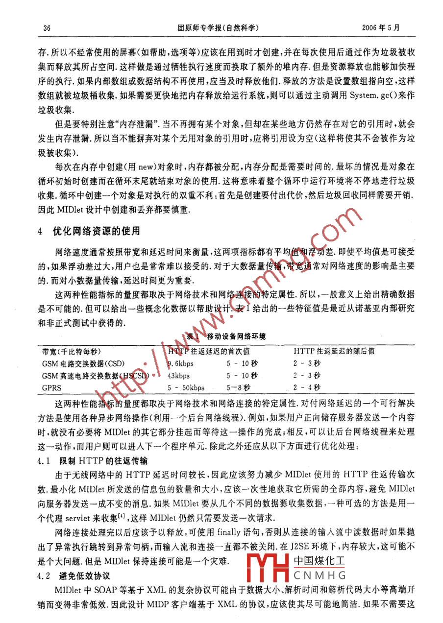 第27卷第3期固原師專學(xué)報(bào)(自然科學(xué))2006年5月. No.3 Vol.27Joumal of Guyuan Teachers College (Natural Science)May. 2006MIDlet的優(yōu)化藺勇(寧夏師范學(xué)院數(shù)學(xué)與計(jì)算機(jī)科學(xué)系,寧夏固原756000)摘要:MIDlet運(yùn)行在低速 、小內(nèi)存的設(shè)備和窄帶的網(wǎng)絡(luò)環(huán)境中,因此MIDlet程序設(shè)計(jì)中應(yīng)該有針對(duì)性地進(jìn)行優(yōu)化.文章分析了影響MIDlet運(yùn)行的各因素,提出了對(duì)象重用、主動(dòng)垃圾回收、使用高效協(xié)議等優(yōu)化方法,并討論了這些方法實(shí)施中需要解決的問(wèn)題,關(guān)鍵詞:J2ME;MIDlet;優(yōu)化;無(wú)線中圖分類號(hào):TP393. 19文獻(xiàn)標(biāo)識(shí)碼:A文章編號(hào):1001-0491(2006)03- -0034- -041引言J2ME是Java針對(duì)移動(dòng)設(shè)備的版本, MIDlet是指J2ME在手機(jī)、PDA上的應(yīng)用程序(又可稱作KJava程序).將信息管理系統(tǒng)擴(kuò)展到無(wú)線領(lǐng)域的諸多方案中,基于KJava的移動(dòng)客戶端是相對(duì)較好的選擇,因?yàn)椋梢灾С謴V泛的網(wǎng)絡(luò)協(xié)議,具有良好的安全性和平臺(tái)交叉的兼容性.這種跨平臺(tái)、設(shè)備無(wú)關(guān)的特點(diǎn)是目前所有的手機(jī)和PDA開發(fā)工具都不具有的特性.但是,J2ME在支持手機(jī)的CLDC規(guī)范中規(guī)定,該類設(shè)備有如下特征叫:●有128KB內(nèi)存供Java運(yùn)行;●32KB供運(yùn)行時(shí)分配的存儲(chǔ)空間;●受限制的用戶接口;●能量有限,主要以電池提供能量;●網(wǎng)絡(luò)連接可能是窄帶寬、不穩(wěn)定的、且以無(wú)線連接為主.這說(shuō)明MIDlet所運(yùn)行的硬件環(huán)境和網(wǎng)絡(luò)環(huán)境都無(wú)法與桌面系統(tǒng)比,MIDlet運(yùn)行的移動(dòng)設(shè)備是資源受限制的環(huán)境,這些限制可概括為:移動(dòng)設(shè)備的處理器運(yùn)算速度低;移動(dòng)設(shè)備內(nèi)存有限(-些移動(dòng)電話限制MIDlet程序?yàn)?0k);網(wǎng)絡(luò)連接速度慢.在這樣的系統(tǒng)上運(yùn)行的程序,如果不作任何優(yōu)化,就很難保證它既完成預(yù)期的功能又運(yùn)行流暢,所以優(yōu)化是J2ME程序設(shè)計(jì)必須的環(huán)節(jié).下面主要從運(yùn)算速度、內(nèi)存使用和網(wǎng)絡(luò)三方面討論優(yōu)化的方法.2為提高速度而作的優(yōu)化MIDlet在不同手機(jī)上的性能特性可能會(huì)有顯著的不同(在種手機(jī)卜姓能奶佳的實(shí)現(xiàn)方法,在.另一種手機(jī)上卻不一定是最好的.例如,在某種手機(jī)上,某中國(guó)煤化工va實(shí)現(xiàn),但在另一FYHCNMHG收稿日期:2005-12-09作者簡(jiǎn)介:藺勇(1973- -),男,寧夏固原人,碩士,講師。第27卷第3期藺勇:MIDlet的優(yōu)化35種手機(jī)上,該方法卻可能封裝了使用本機(jī)語(yǔ)言編寫的更快的方法.所以速度優(yōu)化的第一個(gè)原則就是盡量采用接近本機(jī)語(yǔ)言的方法,其次應(yīng)該從以下方面優(yōu)化:2.1使 用數(shù)組不使用對(duì)象數(shù)組通常比類和類集更快更小,在MIDlet中應(yīng)該盡可能使用數(shù)組以提高運(yùn)行速度. MIDlet中使用頻度比較高的類和類集有String 和StringBuffer以及Hashtable 和Vector3) ,下面分別討論他們與數(shù)組之間如何選擇.在處理字符時(shí),直接使用字符數(shù)組將比處理String和StringBuffer更有效. Strings 是Java中唯一把“+”操作重載的類,但每個(gè)字符串聯(lián),都將創(chuàng)建一個(gè)新的對(duì)象.所以如果在循環(huán)內(nèi)組裝-一個(gè)字符串,就應(yīng)該考慮引入StringBuffer ,從StringBuffer創(chuàng)建String 時(shí),String指向相同的字符數(shù)組,這樣不會(huì)增加系統(tǒng)的開銷.但是如果修改StringBuffer,則會(huì)從原來(lái)的數(shù)組通過(guò)復(fù)制創(chuàng)建一個(gè)新的字符數(shù)組.因而StringBuffer創(chuàng)建新對(duì)象時(shí)不是-一個(gè)嚴(yán)密的方法.所以,最好的優(yōu)化是完全不用String 和StringBuffer,而是用字符數(shù)組.但觱要注意的是,很多APIS要求Strings作為參數(shù)并以此作為返回值,所以采用數(shù)組后就要不停地在string和字符數(shù)組之間作大量的轉(zhuǎn)換.類集Vector和Hashtable使用簡(jiǎn)單有效,但卻附加著一些需要被精簡(jiǎn)的東西.Vector只是一個(gè)數(shù)組的包,所以如果能直接處理-個(gè)數(shù)組,那么就可以節(jié)省下一些內(nèi)存和處理器時(shí)間.同樣地,如果有一個(gè)簡(jiǎn)單的關(guān)鍵對(duì)象到有用對(duì)象之間的影射,則可以采用對(duì)象數(shù)組而不是Hashtable.如果一定要使用Hashtable或Vector,應(yīng)該在創(chuàng)建他們時(shí)準(zhǔn)確地確定其大小.這是因?yàn)閂ector和Hashtable會(huì)隨運(yùn)行需求改變內(nèi)存占用大小,帶來(lái)額外系統(tǒng)開銷.Vector和Hashtable都有構(gòu)造函數(shù)允許指定集合的初始大小.使用時(shí)應(yīng)該最精確地指定集合的大小,這樣才能最大限度地減少使用Hashtable或Vector帶來(lái)的運(yùn)算開銷.2.2使用具有緩沖的 I/O接口雖然流類提供了每次只寫一個(gè)字節(jié)的方法,但是應(yīng)盡量避免對(duì)這種方法的使用,不應(yīng)每次從流中只讀一個(gè)字節(jié),或者只向流中寫一個(gè)字節(jié),而是應(yīng)該建立緩沖同時(shí)讀寫一個(gè)數(shù)組的所有數(shù)據(jù),這樣更為有效. J2SE提供了BufferedReader 和BufferedWriter類,用