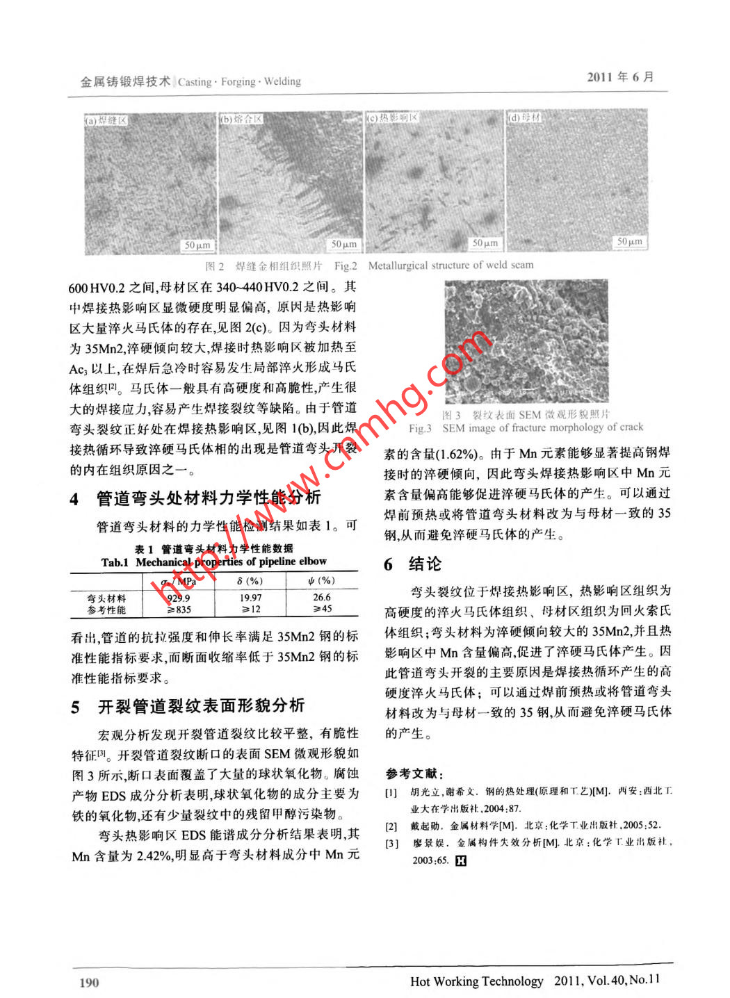 上半月出版Casting . Forging. WeldingN金屬鑄鍛焊技術(shù)●失效分析●甲醇輸送管道開(kāi)裂失效分析許萬(wàn)劍,丁毅,師紅旗,馬立群(南京工業(yè)大學(xué)材料科學(xué)與工程學(xué)院,江蘇南京210009)摘要:采用宏觀形貌分析、化學(xué)成分分析、金相顯微組織分析.SEM微觀形貌分析等手段,對(duì)某公司的甲醇輸送管道開(kāi)裂進(jìn)行了分析。結(jié)果表明,甲醇輸送管道開(kāi)裂為脆性開(kāi)裂,焊接熱循環(huán)產(chǎn)生的淬火馬氏體導(dǎo)致了該管道的開(kāi)裂。關(guān)鍵詞:甲醇輸送管道;淬火馬氏體;脆性開(kāi)裂.中圖分類號(hào):TG40文獻(xiàn)標(biāo)識(shí)碼:A文章編號(hào):1001-3814(2011)11-0189-02Failure Analysis on Crack of Methanol Transmission PipelineXU Wanjian, DING Yi, SHI Hongi, MA Liqun(College of Material Science and Engineering, Nanjing Univrsity of Technology, Nanjing 210009, China)Abstract: The crack of methanol transmission pipeline was analyzed based on macroscopic, chemical composition,microstructure, SEM fracture surface and EDS chemical composition. The results show that the methanol transmissionpipeline is brittle crack. The pipeline crack is caused by quenching marensite, which is produced by welding thermal cycle.Key words: methanol transmission pipeline ; quenching martensite ;britle crack某公司甲醇輸送管道使用一個(gè)月后發(fā)生開(kāi)裂。著平行 于焊縫的方向(周向)發(fā)展。其中1" 標(biāo)記處為該管道為地面管道,直管段材料為35鋼,彎頭材料為金相試樣的取樣位置,對(duì)2*樣斷裂表面進(jìn)行掃描電35Mn2。管道設(shè)計(jì)采用套管技術(shù),甲醇在內(nèi)管,外套管鏡(SEM)微觀形貌分析,并對(duì)斷裂表面腐蝕產(chǎn)物進(jìn)行用氮保壓,氮?dú)庠O(shè)計(jì)壓力報(bào)警。使用一個(gè)月后,氮?dú)釫DS成分分析。4"為拉伸試樣取樣位置,5*為光譜成壓力報(bào)警發(fā)現(xiàn)該管道漏氣,檢查發(fā)現(xiàn)漏氣位置在彎分分析試樣取樣位置。圖1(b)為1" 試樣低倍酸浸后頭附近。為了分析管道泄漏的原因,對(duì)開(kāi)裂管道進(jìn)行宏觀照片,圖中黑色區(qū)域內(nèi)灰色條紋為裂紋,黑色區(qū)了失效分析。域經(jīng)金相檢驗(yàn)為淬火馬氏體區(qū)。1管道宏觀分析2管道彎頭處化學(xué)成分分析圖1(a)是甲醇輸送管道彎頭裂紋處著色探傷后直讀光譜成分檢測(cè)結(jié)果表明,管道彎頭含碳量的宏觀照片。從照片中可以看出,裂紋位于管道彎頭為0.36%,并含有1.62%的Mn元素。根據(jù)光譜成分部緊靠熔合線的焊接熱影響區(qū),長(zhǎng)度約110mm,并沿檢測(cè)結(jié)果并與相關(guān)國(guó)家標(biāo)準(zhǔn)對(duì)比,.可以判斷管道彎頭材料為35Mn2鋼,與設(shè)計(jì)材料一致。管道彎頭材馬氏體區(qū)料中硫、磷含量均符合高級(jí)優(yōu)質(zhì)鋼標(biāo)準(zhǔn)。3管道彎頭處 顯微組織分析管道焊縫金相顯微組織照片見(jiàn)圖2。從圖2(a)裂紋可看出,管道焊縫區(qū)組織為鑄態(tài)組織,未見(jiàn)明顯焊接缺陷;從圖2(b)可看出,管道焊縫與母材熔合正常;圖1失效管道彎頭宏觀照片F(xiàn)ig.1 Macrograph of failure pipeline elbow從圖2(c)可看出,管道熱影響區(qū)組織為淬火馬氏體凹,可以看到板條狀馬氏體和細(xì)針狀馬氏體存在;從圖2(d)可看出,管道彎頭母材組織為回火索氏體收稿日期:2011-01-06作者簡(jiǎn)介:許萬(wàn)創(chuàng)(1987- ),男,江蘇鹽城人,碩士研究生,主要研究方向組織,表明管道彎頭經(jīng)過(guò)調(diào)質(zhì)處理。為耐蝕金屬材料;電話:15195860752;管道焊縫顯微硬度測(cè)試結(jié)果表明,焊縫區(qū)顯微E-mail:xuwanjian2008@126.com硬度在200- -300HV0.2之間,熱影響區(qū)在500~《熱加工工藝》2011年第40卷第11期189.金屬鑄鍛焊技術(shù)Casting. Forging . Welding2011年6月石)翠縫區(qū)b)路合區(qū)[9)熱影響區(qū)50umS50um50μm. S50μm J圖2焊縫 金相組織照片F(xiàn)ig.2 Meallurgical structure of weld sceam600HV0.2之間,母材區(qū)在340- 440HV0.2之間。其中焊接熱影響區(qū)顯微硬度明顯偏高,原因是熱影響區(qū)大量淬火馬氏體的存在,見(jiàn)圖2(c)。因?yàn)閺濐^材料為35Mn2,淬硬傾向較大,焊接時(shí)熱影響區(qū)被加熱至Ac以上,在焊后急冷時(shí)容易發(fā)生局部淬火形成馬氏體組織叫。馬氏體一般具有高硬度和高脆性,產(chǎn)生很大的焊接應(yīng)力,容易產(chǎn)生焊接裂紋等缺陷。由于管道圖3裂紋表面 SEM微觀形貌照片彎頭裂紋正好處在焊接熱影響區(qū),見(jiàn)圖1(b),因此焊Fig.3 SEM image of fracture morphology of crack接熱循環(huán)導(dǎo)致淬硬馬氏體相的出現(xiàn)是管道彎頭開(kāi)裂素的含量(1.62%)。由于Mn元素能夠顯著提高鋼焊的內(nèi)在組織原因之一。接時(shí)的淬硬傾向,因此彎頭焊接熱影響區(qū)中Mn元4管道彎頭處材料力學(xué)性能分析素含量偏高能夠促進(jìn)淬硬馬氏體的產(chǎn)生??梢酝ㄟ^(guò)管道彎頭材料的力學(xué)性能檢測(cè)結(jié)果如表1??珊盖邦A(yù)熱或?qū)⒐艿缽濐^材料改為與母材一致的35鋼,從而避免淬硬馬氏體的產(chǎn)生。表1管道彎頭材料力學(xué)性能數(shù)據(jù)Tab.1 Mechanical properties of pipeline elbow6結(jié)論o。/ MPaδ (%)ψ (%)彎頭材料929.919.9726.6彎頭裂紋位于焊接熱影響區(qū),熱影響區(qū)組織為參考性能≥835≥12≥45高硬度的淬火馬氏體組織、母材區(qū)組織為回火索氏看出,管道的抗拉強(qiáng)度和伸長(zhǎng)率滿足3SMn2鋼的標(biāo)體組織;彎頭材料為淬硬傾向