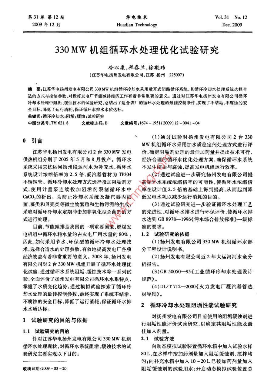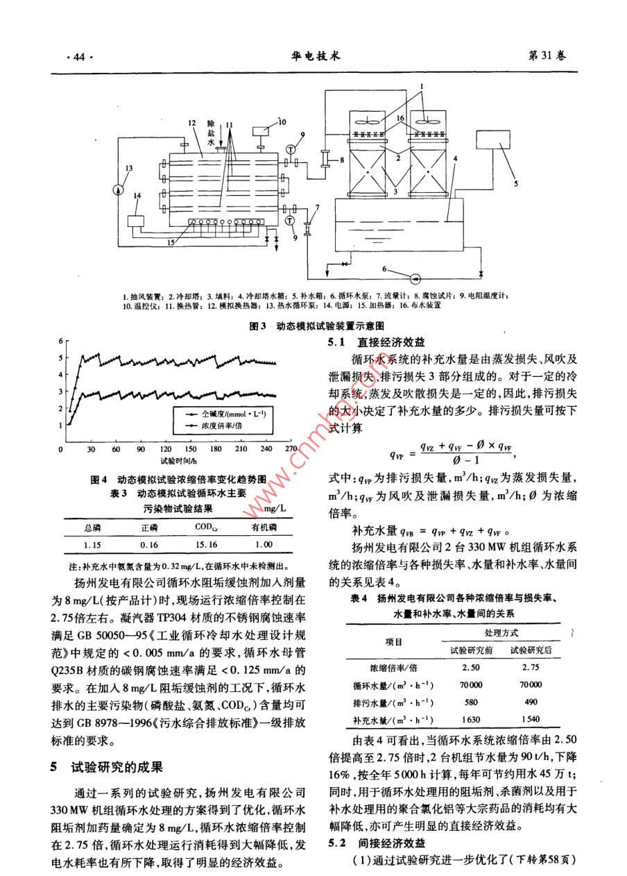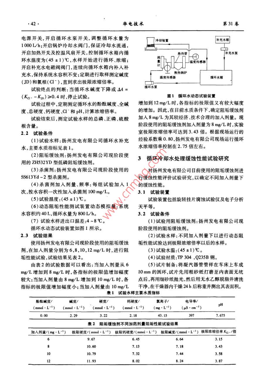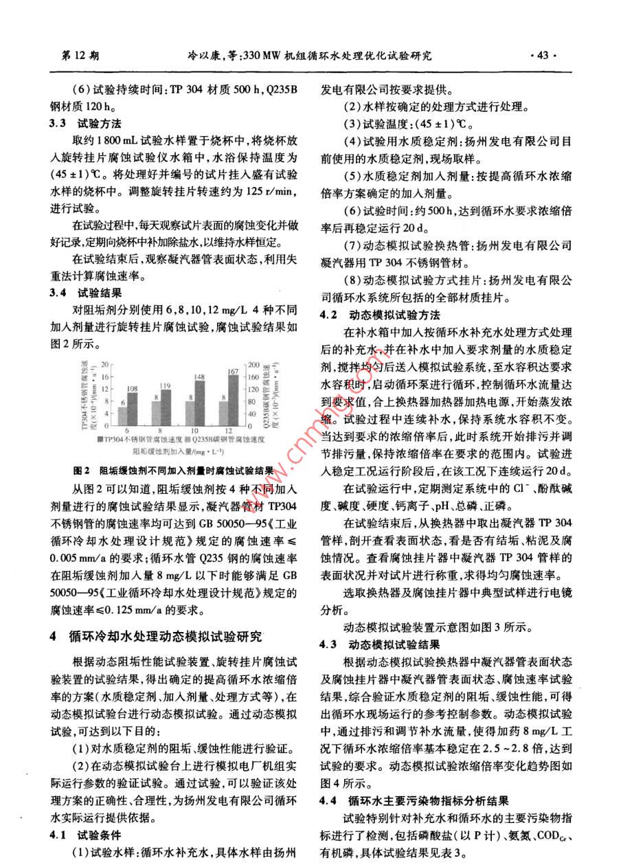第31卷第12期華電技術(shù)Vol 31 No 122009年12月Huadian TechnologyDec.2009330MW機(jī)組循環(huán)水處理優(yōu)化試驗(yàn)研究冷以康,程春蘭,徐敬瑋(江蘇華電揚(yáng)州發(fā)電有限公司,江蘇揚(yáng)州225007)摘要:江蘇華電揚(yáng)州發(fā)電有限公司330MW機(jī)組循環(huán)冷卻水釆用敞開(kāi)式閉路循環(huán)系統(tǒng),其循環(huán)冷卻水處理系統(tǒng)選擇合適的方式與控制參數(shù),對(duì)做好發(fā)電廠節(jié)能減排經(jīng)濟(jì)工作有著非常重要的意義。通過(guò)對(duì)江蘇華電揚(yáng)州發(fā)電有限公司循環(huán)冷卻水處理中阻垢緩蝕技術(shù)的試驗(yàn)研究,總結(jié)出了適合該廠的循環(huán)水處理的最佳控制條件,實(shí)現(xiàn)了不結(jié)垢、不腐蝕的安全目標(biāo)降低了運(yùn)行消耗保證循環(huán)水排水水質(zhì)達(dá)標(biāo)關(guān)鍵詞:循環(huán)冷卻水;阻垢;緩蝕;試驗(yàn)研究中圖分類號(hào):TM6218文獻(xiàn)標(biāo)志碼:B文章編號(hào):1674-1951(2009)12-0041-04引言(1)通過(guò)試驗(yàn)對(duì)揚(yáng)州發(fā)電有限公司2臺(tái)330MW機(jī)組循環(huán)水采用加水質(zhì)穩(wěn)定劑處理方式進(jìn)行評(píng)江蘇華電揚(yáng)州發(fā)電有限公司2臺(tái)330MW發(fā)電價(jià),確定阻垢劑處理的最佳加藥量并提出技術(shù)可行供熱機(jī)組分別于2005年5月和8月投產(chǎn)。循環(huán)水經(jīng)濟(jì)合理的循環(huán)水優(yōu)化處理方案,確保循環(huán)水系統(tǒng)系統(tǒng)采用京杭運(yùn)河揚(yáng)州段運(yùn)河水為補(bǔ)充水,循環(huán)水不發(fā)生結(jié)垢與腐蝕提高發(fā)電機(jī)組運(yùn)行效率。系統(tǒng)設(shè)計(jì)濃縮倍率為2.5倍,凝汽器管材為TP04(2)通過(guò)試驗(yàn)進(jìn)一步研究揚(yáng)州發(fā)電有限公司提不銹鋼管。循環(huán)冷卻水處理方式選擇投加阻垢劑方高循環(huán)水系統(tǒng)濃縮倍率的可能性,使循環(huán)水濃縮倍式,使用計(jì)量泵連續(xù)投加阻垢劑限制循環(huán)水中率在設(shè)計(jì)值2.5倍的基礎(chǔ)上得到提高,從而起到降CaCO3的析出。為防止冷卻水系統(tǒng)及凝汽器內(nèi)細(xì)低發(fā)電水耗以減少運(yùn)行消耗的目的菌、藻類和貝殼類等微生物繁殖和生物污泥的生成,(3)通過(guò)試驗(yàn)研究進(jìn)一步驗(yàn)證循環(huán)水處理工藝采取對(duì)循環(huán)冷卻水定期沖擊加非氧化型殺菌劑的方的先進(jìn)性,對(duì)循環(huán)水排水進(jìn)行環(huán)保評(píng)價(jià),使循環(huán)水排式進(jìn)行處理。水達(dá)到GB8978-1996《污水綜合排放標(biāo)準(zhǔn)》一級(jí)標(biāo)目前,節(jié)能減排是我國(guó)的一項(xiàng)重要國(guó)策,燃煤發(fā)準(zhǔn)的要求。電機(jī)組中循環(huán)水耗水量約占火電廠用水量的80%,1.2試驗(yàn)研究的依據(jù)因此,如何采用節(jié)水、環(huán)保型的循環(huán)冷卻水處理技(1)揚(yáng)州發(fā)電有限公司330MW機(jī)組循環(huán)水部術(shù),選擇合適水的處理參數(shù),有效地提高發(fā)電廠各項(xiàng)分工程設(shè)計(jì)說(shuō)明書。經(jīng)濟(jì)效益有著非常重要的意義。2008年,揚(yáng)州發(fā)電(2)揚(yáng)州發(fā)電有限公司近2年大運(yùn)河河水全分有限公司對(duì)2臺(tái)330MW機(jī)組開(kāi)展了循環(huán)水處理優(yōu)析報(bào)告?;囼?yàn),通過(guò)循環(huán)水系統(tǒng)阻垢、緩蝕技術(shù)等一系列試(3)GB5005095《工業(yè)循環(huán)冷卻水處理設(shè)計(jì)驗(yàn),全面評(píng)價(jià)了揚(yáng)州發(fā)電有限公司循環(huán)水水系特點(diǎn),規(guī)范》。掌握了水質(zhì)變化趨勢(shì),通過(guò)模擬試驗(yàn)探索了循環(huán)冷(4)D/T712-2000《火力發(fā)電廠凝汽器管選卻水處理的最佳控制參數(shù),最終實(shí)現(xiàn)了系統(tǒng)不結(jié)垢、材導(dǎo)則》。不腐蝕的安全目標(biāo),降低了運(yùn)行消耗,保證循環(huán)水排水水質(zhì)達(dá)標(biāo)。循環(huán)冷卻水處理阻垢性能試驗(yàn)研究1試驗(yàn)研究的目的與依據(jù)對(duì)揚(yáng)州發(fā)電有限公司目前使用的阻垢緩蝕劑進(jìn)行阻垢性能評(píng)價(jià)試驗(yàn)研究,以確定其阻垢性能及最1.1試驗(yàn)研究的目的佳加入劑量。針對(duì)江蘇華電揚(yáng)州發(fā)電有限公司330MW機(jī)組2.1試驗(yàn)方法循環(huán)水處理現(xiàn)狀,對(duì)循環(huán)水系統(tǒng)阻垢、緩蝕技術(shù)的試向動(dòng)態(tài)模擬試驗(yàn)裝置循環(huán)水箱中加入試驗(yàn)水樣驗(yàn)研究主要實(shí)現(xiàn)以下目的:L,在水樣中按加藥劑量加入阻垢緩蝕劑,攪拌均勻;向補(bǔ)充水箱中加入10~20L已按加藥劑量加入收稿日期:2009-03-20阻垢緩蝕劑的試驗(yàn)用水;開(kāi)啟動(dòng)態(tài)模擬試驗(yàn)裝置總42華電技術(shù)第31卷電源開(kāi)關(guān),開(kāi)啟循環(huán)水泵開(kāi)關(guān),調(diào)整循環(huán)水量為補(bǔ)充水箱1000Lh;開(kāi)啟鍋爐冷卻水閥門,保證冷卻水流通開(kāi)啟加熱開(kāi)關(guān)及控溫風(fēng)扇開(kāi)關(guān),控制循環(huán)水箱內(nèi)循環(huán)水溫度為(45±1)℃,水樣開(kāi)始進(jìn)行循環(huán)、濃縮;溫度傳感器開(kāi)啟補(bǔ)充水電磁閥閥門,連續(xù)向循環(huán)水箱內(nèi)補(bǔ)入補(bǔ)充水,保持系統(tǒng)水容積不變;定期進(jìn)行取樣測(cè)定堿度換熱鍋爐溫度傳感器循環(huán)水箱(JD)和氯根(Cl-),直到求出極限濃縮
