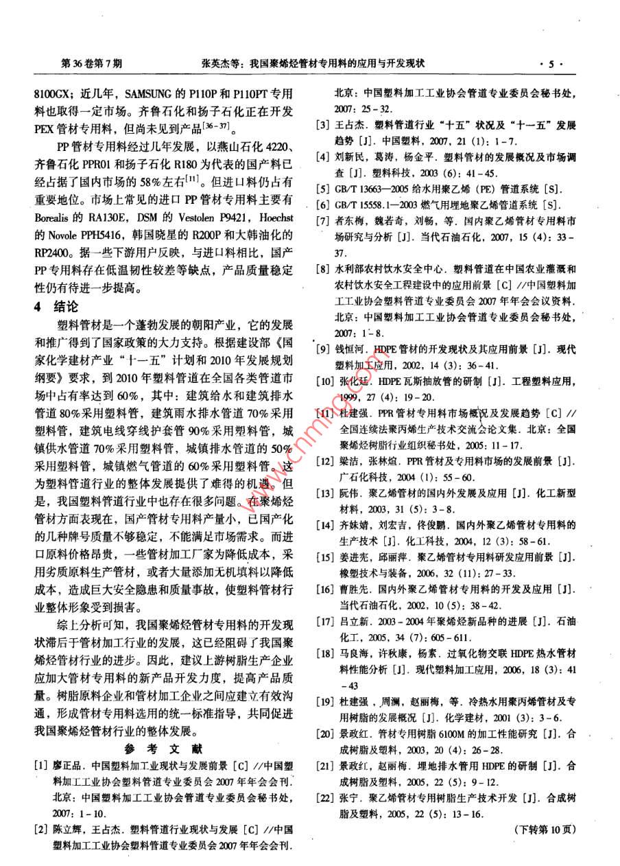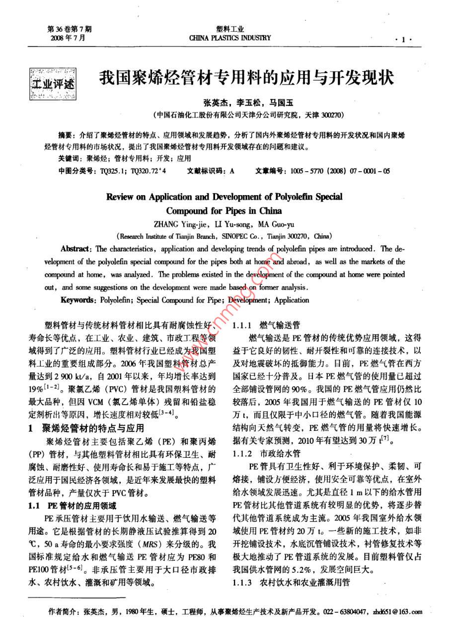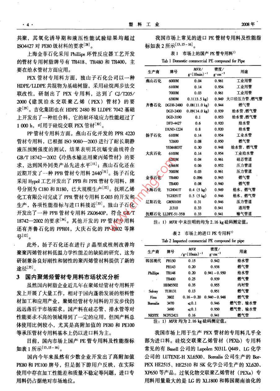 第36卷第7期塑料工業(yè)2008年7月CHINA PLASTICS INDUSTRY工業(yè)評述我國聚烯烴管材專用料的應(yīng)用與開發(fā)現(xiàn)狀張英杰,李玉松,馬國玉(中國石油化工股份有限公司天津分公司研究院,天津300270)摘要:介紹了聚烯烴管材的特點、應(yīng)用領(lǐng)域和發(fā)展趨勢,分析了國內(nèi)外聚烯烴管材專用料的開發(fā)狀況和國內(nèi)聚烯烴管材專用料的市場狀況,提出了我國聚烯烴管材專用料開發(fā)領(lǐng)城存在的問題和建議。關(guān)鍵詞:聚烯烴;管材專用料;開發(fā);應(yīng)用中圖分類號: TQ325.1; TQ320.72*4文獻標識碼: A文章編號: 1005- 5770 (2008) 07-0001 -05Review on Application and Development of Polyolefin SpecialCompound for Pipes in ChinaZHANG Ying-jie,U Yu-song,MA Guo-yu(Research Intitute of Tanjin Branch, SINOPEC Co., Tianjin 300270, China)Abstract: The characteristics, application and developing trends of polyolefin pipes are introduced. The de-velopment of the polyolefin special compound for the pipes both at home and abroad, as well as the markets of thecompound at home, was analyzed . The problems existed in the development of the compound at home were pointedout, and some suggestions on the development were made based on fomer analysis.Keywords: Polyolefin; Special Compound for Pipe; Development; Application塑料管材與傳統(tǒng)材料管材相比具有耐腐蝕性好、1.1.1 燃氣輸送管壽命長等優(yōu)點,在工業(yè)、農(nóng)業(yè)、建筑、市政工程等領(lǐng)燃氣輸送是PE管材的傳統(tǒng)優(yōu)勢應(yīng)用領(lǐng)域,這得域得到了廣泛的應(yīng)用。塑料管材行業(yè)已經(jīng)成為我國塑益于它良好的韌性、耐開裂性和可靠的連接技術(shù),以料工業(yè)的重要組成部分。2006年我國塑料管材總產(chǎn)及對地震破壞的抵御能力。日前,PE 燃氣管在西方量達到2 900 kVa,自2001年以來,年均增長率達到國家已經(jīng)十分普及。日本PE燃氣管的使用量已超過19%[1-2]。聚氯乙烯(PVC) 管材是我國塑料管材的全部鋪設(shè)管網(wǎng)的90%。我國的PE燃氣管應(yīng)用仍然比最大品種,但因VCM (氯乙烯單體)殘留和鉛鹽穩(wěn)較落后,2005年我國用于燃氣輸送的PE管材僅10定劑析出等原因,增長速度相對較低(3-4)。萬t,而且僅限于中小口徑的燃氣管。隨著我國能源1聚烯烴管材的特點與應(yīng)用結(jié)構(gòu)向天然氣轉(zhuǎn)變,PE 燃氣管的用量將快速增長。聚烯烴管材主要包括聚乙烯(PE) 和聚丙烯據(jù)有關(guān)專家預(yù)測,2010年有望達到30萬0]。(PP)管材,與其他塑料管材相比具有環(huán)保衛(wèi)生、耐1.1.2市政給水管腐蝕、耐磨性好、使用壽命長和易于施工等特點,廣PE管具有衛(wèi)生性好、利于環(huán)境保護、柔韌、可泛應(yīng)用于國民經(jīng)濟各領(lǐng)域,是近年來發(fā)展最快的塑料熔接,鋪設(shè)方便經(jīng)濟,使用安全可靠等優(yōu)點,在室外管材品種,產(chǎn)量僅次于PVC管材。給水領(lǐng)域發(fā)展迅速。尤其是直徑1 m以下的給水管用1.1 PE 管材的應(yīng)用領(lǐng)域PE管材比其他管道系統(tǒng)有較明顯的優(yōu)勢,將逐步替PE承壓管材主要用于飲用水輸送、燃氣輸送等代其他管道系統(tǒng)成為主流。2005 年我國室外給水領(lǐng)用途。它是根據(jù)管材的長期靜液壓試驗推算得到20域使用PE管材約20萬t。一些新的施工技術(shù),如非C, 50 a壽命的最小要求強度(MRS) 來分級的。我開挖鋪設(shè)技術(shù),水底沉管鋪設(shè)技術(shù),襯管修復(fù)技術(shù)等國標準規(guī)定給水和燃氣輸送PE管材應(yīng)為PE80和極大地推動了PE管道系統(tǒng)的發(fā)展。目前塑料管僅占PE100管材l5-6]。非承壓管主要用于大口徑市政排我國供水管網(wǎng)的5.2%,發(fā)展空間巨大。水、農(nóng)村飲水、灌溉和礦用等領(lǐng)域。1.1.3 農(nóng)村飲水和農(nóng)業(yè)灌溉用管作者簡介:張英杰,男,1980年生,碩士,工程師,從事聚烯烴生產(chǎn)技術(shù)及新產(chǎn)品開發(fā)。022 - 63804047, zhnd651@ 163.com●2塑料工業(yè)2008年農(nóng)村飲水和農(nóng)業(yè)灌溉用管是有待進一步 發(fā)展的巨段共聚聚丙烯)管為主。PPR 管材具有較高的耐熱溫大市場。截止2005年我國實現(xiàn)管道噴灌和微滴灌的度,PPB管材具有更好的低溫制性。PP管材1997年耕地面積僅占17.4%。而美國、瑞典等國家的噴微開始在我國生產(chǎn)和應(yīng)用,2005 年我國PP管材產(chǎn)量24灌面積已超過耕地面積的80%,PE 管材在國外已廣萬t,主要應(yīng)用于建筑內(nèi)的生活冷熱水輸送和飲用水泛用于耕地微滴噴灌。據(jù)專家估算[8],“十一五”期輸送,在我國還部分用于地板采暖領(lǐng)域。據(jù)北京塑料間我國用于農(nóng)業(yè)灌溉的塑料用管約35~45萬t。.協(xié)會統(tǒng)計,我國建筑內(nèi)冷熱水輸送領(lǐng)域中,PP管材農(nóng)村飲水安全是我國面臨的重要問題,目前農(nóng)村約占50%,其中PPR管材占40%。PP 管材的優(yōu)勢主集中式供水人口僅占38%,另外62%的人口處于飲要體現(xiàn)在較高耐熱溫度、 環(huán)剛度、可熱熔焊接性和衛(wèi)水不安全狀態(tài),對身體健康造成嚴重危害。據(jù)文獻介生性,在新建建筑中基本上取代了鍍鋅鋼管作為給水紹,“十一五”期間我國將規(guī)劃解決1.6億農(nóng)村居民管道。的飲水安全問題,供水工程需用塑料管材可達120 ~2聚烯烴管材專 用料的開發(fā)狀況170萬t8]。這為PE管材提供了巨大的發(fā)展機遇。與塑料工業(yè)其他應(yīng)用領(lǐng)
