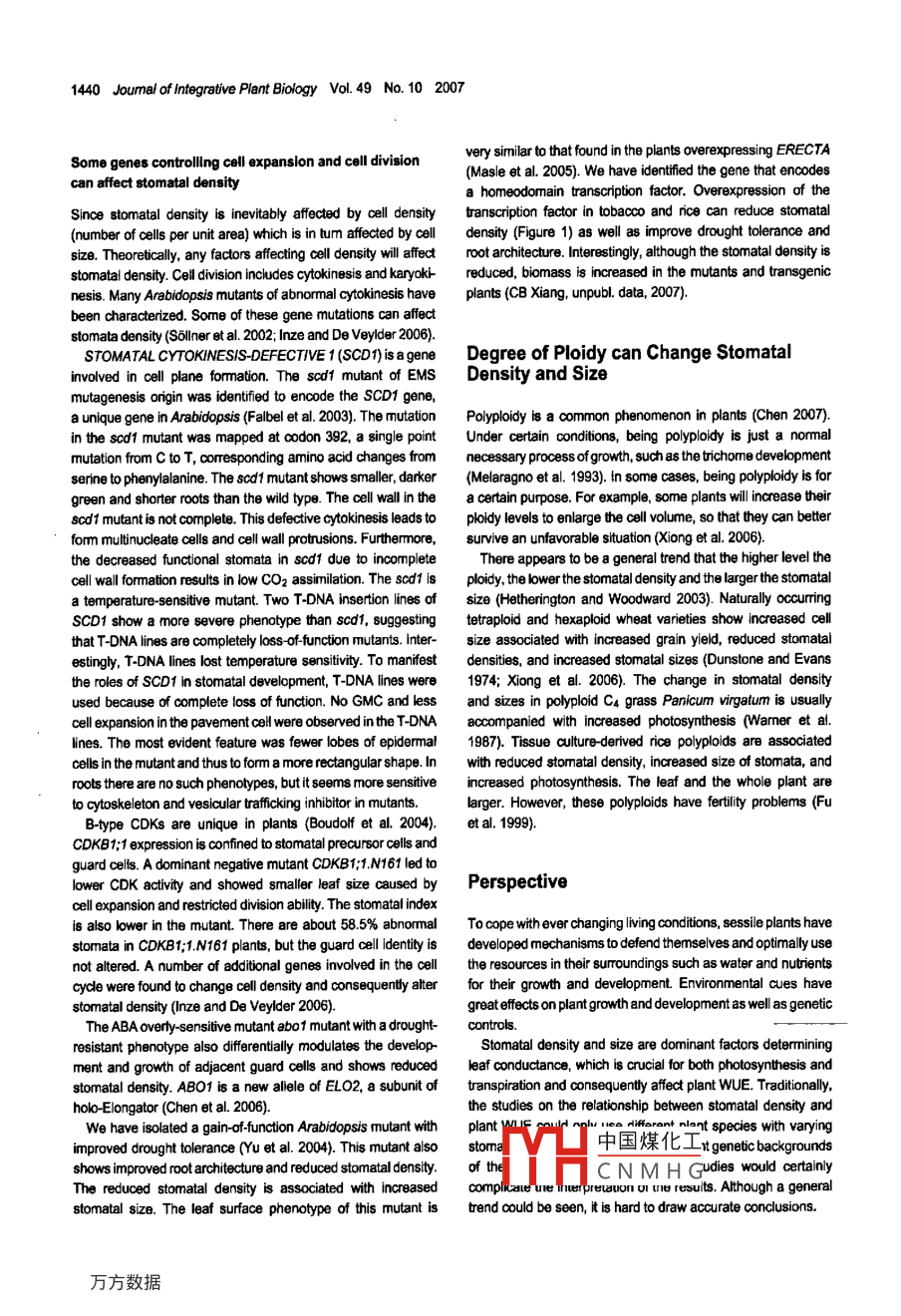 Joumal of Integratve Plant Biology 2007, 49 (10); 1435- 1444.Invited Review.Stomatal Density and Bio-water SavingYao Wang, Xi Chen and Cheng-Bin Xiang'(School o1 Life Sciences, Universty of Science and Technology of China, Hefei 230027, China)AbstractBio-water saving is to increase water use eficiency of crops or crop yield per unit of water input Plant water use efficiencyisdetermlned by photosynthesis and transpiration, for both of which stomata are crucial. Stomata are pores on leaf epidermisfor both water and carbon dioxide fuxes that are controlled by two major factors: stomatal behavior and density. Stomatalbehavlor has been the focus of intensive research, while less attention has been paid to stomatal density. Recently, anumber of genes controlling stomatal development have been ldentified. This review summarizes the recent progress onthe genes regulating stomatat density, and discusses the role of stomatal density in plant water use fficiency and thepossibility to increase plant water use eficiency, hence blo-water saving by genetically manipulating stomatal density.Key words: Arabidopsis; photosynthesis; stomata; stomatal density;: stomatal formation; transpiration; water use eficiency.Wang Y, Chen x, Xiang CB (2007). Stomatal density and bio-water saving. J Integr. Plant Biol, 49(10). 1435 1444.Available online at www. blackell-synergy.ocominstoc/jipb, www.jipb.netThere are two major ways to increase the water use eficiengy increase water use eficiency for the obvious reason of less inputin agriculture. One is the engineering-based cropping systemthan engineering-based methods.where modem irigation techniques play an important role. MuchBy definition, plant WUE is determined by both photosyn-progress has been made to increase water use eficiency by thesis and transpiration. Increasing photosynthesis and/or demanaging imigation (Kacira and Ling 2001; Jones 2004; Kangcreasing transpiration would elevate plant WUE. Stomata playand Zhang 2004; Bazzani 2005; Facchi et al. 2005; Sun et al.a crucial role in both processes and hold the keys to increase2005; Giordano et al. 2007). The other way is "biological waterplant WUE, and hence bio-water saving. The physiological andsaving" (bio-water saving) which was coined by Lun Shan inmolecular basis of bio-water saving is complicated and is highly1991 to emphasize the physiological and ecological bases of linked to drought tolerance mechanisms (Chaves and Oliveirawater saving by crops in agricuture (Shan 1991). The concept2004).of biowater saving was further developed by Yuanchun ShiStoma is one of the key factors affecting plant WUE. Stomaand defined as "more agricutural products output with the same as a specifc organ first appeared in trestrial land plants aboutor less water input by exploiting the physiological and genetic400 millin years ago to adapt new variable environmentspotential of organisms themselves" (Shi 1999). The core of(Edwards et al. 1998). Different plant species have evolvedbio water saving is to increase "water use eficiency' (WUE)diferent stomata with great variation of size, density (numberof plants, which is defined as a ratio of photosynthesis rateof stomata per unit area), and morphology. There are two typesto transpiration rate (Smith 1980) and used as an indicator forof stomata: dumb bllshaped and kidney-shaped stoma. Theplantwater saving capability. In contrast to the irigation method,former is often seen in monocotyledons, while the latter isbiological water saving is a more eficient and economic way tousually in dicots. It is believed that dumb-bell-shaped stomataare more evolutionarily advanced than the kidney-shaped onesRecered 29 May 2007 Acepted7 Jun. 2007because they can alter their width more easily when guardSupported by the Chinese Academy of Sciences (KSCX2- YW-N-012) andcells undergo a small change (Raschke 1979). This fast speedMOST (2003CB1 14305).opening and closing strategy can save energy and increase*Author for crorespondence.photosynthesis and water use eficiency (Granz and AssmannTel: +86 ()551 360 732;1991)中國煤化工also changed with aFax: +86 ()551 360 1443;millenstomatal densities be-E-mail: or .causefYHC N M H Gnd low cartbon dioxide◎2007 Institute of Botany, the Chinese Academy of Sciencesconcentration. Gymnosperm and angiosperm adapted to dryerdol: 111172 9072 205.5climnates have lower stomatal densities (Hil 1994).1436 Joumal of Integrative Plant Biology Vol. 49 No. 10 2007Stomata play pivotal roles in global water and carbon cyclesof plants in response to environmental changes (Httherington(Hetherington and Woodward 2003). Stomatal movement, den-and Woodward 2003). Due to dfferent species and livingsity, and distribution determine plant water and COz exchange,environment, the stomatal size and density vary to a great extenthence photosynthesis and transpiration. Both processes are(Willmer 1996). Plants with high stomatal density tend to haveessential for higher plants. Transpiration is required for nutrientsmall-sized stomata (Beering and Woodward 1997). However,absorption as well as maintaining the body temperature of plantsthe selection mechanisms of diferent densty-size pattemingwhile photosynthesis assimilates carbon dioxide into photosyn-are not wel understood. The stomatal size is highly correlated tothates. Through stomata on leaf epidemis, water and carbonthe drought senstivity of plants. Large stomata lead to a slowerdioxide exchange between air and plants. Therefore, watermovement, thus a slower response to dehydration (Hetheringtonloss is an unavoidable occurrence. When plants are lackingand Woodward 2003).water, stomata will close to minimize the water loss. ClosingCarbon dioxide concentration is another factor infuencingstomata reduces transpiration and saves water but restrictsstomatal density. Increasing CO2 concentration can reduceCO2 exchange, adversely afcting photosynthesis. This confictstomatal index and density (Woodward 1987; Woodward andbetween photosyn