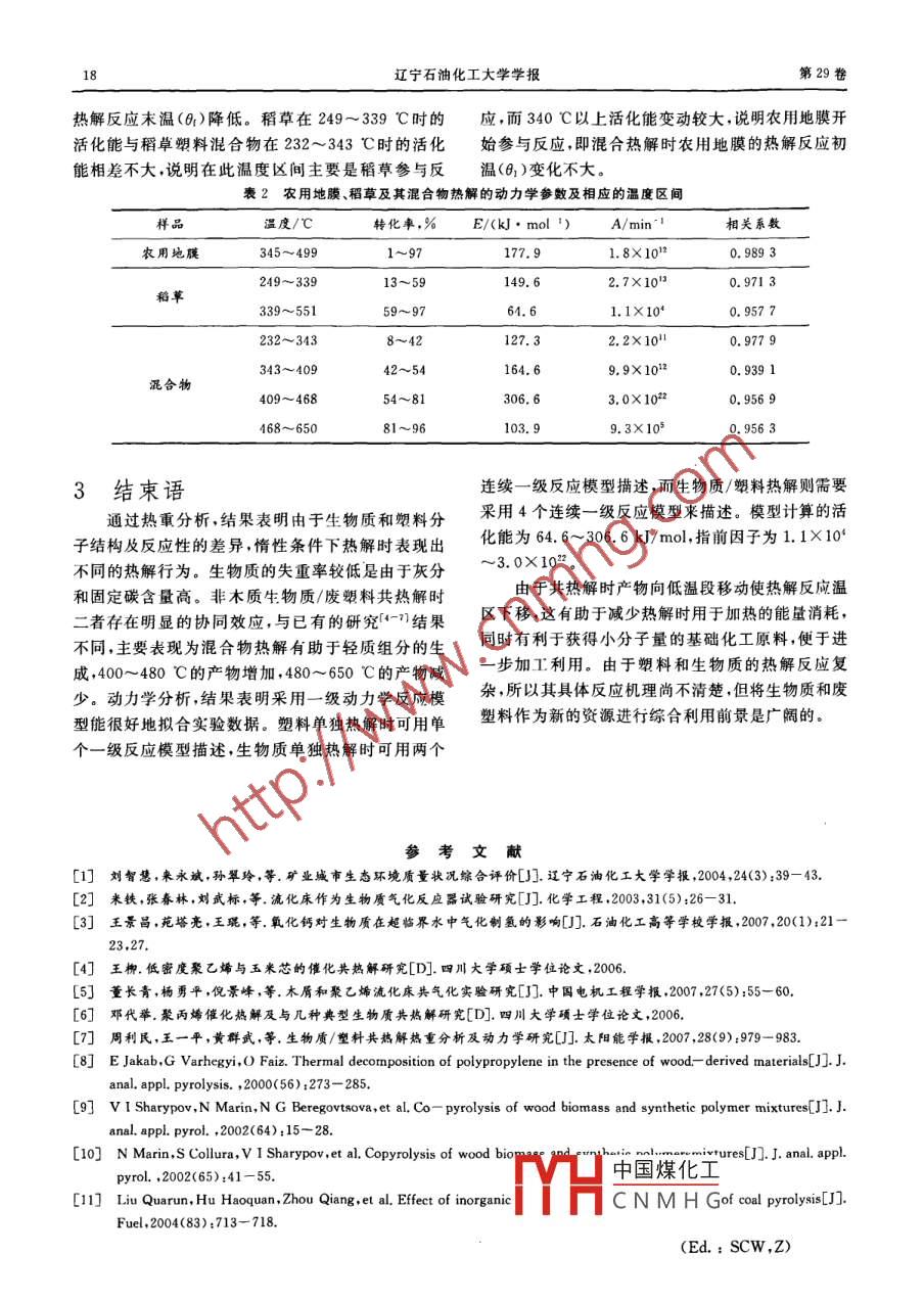 第29卷第2期遼寧石油化Vol 29 No. 22009 4F6 A JOURNAL OF LIAONING UNIVERSITY OF PETROLEUM & CHEMICAL TECHNOLOGY Jun 2009文章編號(hào):1672-6952(2009)02-0015-04非木質(zhì)生物質(zhì)/廢塑料共熱解熱重分析及動(dòng)力學(xué)研究趙宇,金文英,金珊,劉春生(遼寧石油化工大學(xué)石油化工學(xué)院,遼寧撫順113001)摘要:對(duì)非木質(zhì)生物質(zhì)(稻草)、廢塑料(農(nóng)用地膜》及其混合物的熱解行為進(jìn)行了研究。實(shí)驗(yàn)結(jié)果表明,非木質(zhì)生物質(zhì)的失重溫度區(qū)間較塑料的失重溫度區(qū)間寬,由于生物質(zhì)的灰分和固定碳含量高導(dǎo)致轉(zhuǎn)化率低于塑料。非木質(zhì)生物質(zhì)/廢塑料共熱解時(shí)二者存在明顯的協(xié)同效應(yīng),動(dòng)力學(xué)分析結(jié)果表明,采用一級(jí)反應(yīng)模型能很好地?cái)M合實(shí)驗(yàn)教據(jù)。塑料單獨(dú)熱解時(shí)可用1個(gè)一級(jí)反應(yīng)模型描逑,生物質(zhì)單獨(dú)熱解時(shí)可用2個(gè)連續(xù)一級(jí)反應(yīng)模型描迷,而生物質(zhì)/塑料熱解則需用4個(gè)連續(xù)一級(jí)反應(yīng)模型來(lái)描逑。其活化能為64.6~306.6kJ/mol,指前因子為1.1×104~3.0關(guān)鍵詞;生物質(zhì);塑料;熱解;動(dòng)力學(xué)中圖分類(lèi)號(hào):TQ530.2文獻(xiàn)標(biāo)識(shí)碼:ATG Analysis and Kinetics of non-Woody biomssand Waste plastic Co- PyrolysisZHAO Yu, JIN Wen-ying, JIN Shan, LiU Cht( School of Petrochemical Engineering, Liaoning University of Petroleum Chemical TechnologyFushun Liaoning 113001, P R China)Received 12 December 2008: received 19 January 2009: accepted 1 March 2009Abstract: Thermal decomposition behaviours of no woody biomass (straw) and waste plastic agricultural film)wereinvestigated using TGA. The results showe that the biomass is decomposed at a wider temperature range than plastics, and thetransfer efficiency of biomass is lowest because of the high content of ash and fixcarbon. It is exhibited significant synergisticeffect created more the light component between biomass and plastic during co-pyrolysis. The kinetic analysis indicates thathe pyrolytic processes can be described as first order reactions model, a quite good fitting of experimental data was obtained forall samples studied. The only plastic can be described as the one model, and the only biomass be described as the twoconsecutive models, than the biomass/ plastic co-pyrolysis need be described as the four consecutive models. The activationenergies were found to be in the rang of 64.6- 306. 6 kJ/mol, and the pre-exponential factors were 1.1X10-3. 0X10Key words: Biomass: Plastic: Pyrolysis: Kinetics*CorrespondingauthorTel.:+86-413-6864404;fax:+86-413-6860658;e-mail;jinshan57@@126.com隨著煤、石油和天然氣等不可再生化石燃料可越多的科學(xué)家所關(guān)注開(kāi)采量的日益減少和人們對(duì)環(huán)境保護(hù)的日益關(guān)注,塑料熱解時(shí)可向生物質(zhì)供氫,從而對(duì)熱解反應(yīng)生物質(zhì)作為一種理想的綠色可再生資源得到了世界產(chǎn)生重要影響,塑料在熱解時(shí)形成氣相和液相烴類(lèi)。各國(guó)的普遍重視山。生物質(zhì)一般包括木材及其加工一些生物質(zhì)和塑料共熱解的研究證實(shí)生物質(zhì)與廢料(如木屑)、農(nóng)作物及其廢料(如秸稈、谷糠、稻殼塑料共熱解時(shí)具有明顯的協(xié)同作用,但目前大多數(shù)和甘蔗渣)等2-。另外,在農(nóng)業(yè)生產(chǎn)中會(huì)產(chǎn)生地研究都集中在木質(zhì)生物質(zhì)和塑料的熱解上。因此對(duì)膜等度塑料,在域市固體垃圾中也有大廢塑作為行v中國(guó)煤化工本質(zhì)生物質(zhì)和廢料。所以生物質(zhì)資源以及廢塑料的綜合利用被越來(lái)塑料再生資源的綜合利用CNMH義,收稿日期:2008-12-12近年來(lái),對(duì)木質(zhì)生物質(zhì)和塑料的熱解行為的相作者簡(jiǎn)介:趙宇(1983—),男,遼寧錦州市,在讀碩士關(guān)的研究-1比較多,而對(duì)于非木質(zhì)生物質(zhì)/廢塑通訊聯(lián)系人。16遼寧石油化工大學(xué)學(xué)報(bào)第29卷料共熱解時(shí)的相互作用及動(dòng)力學(xué)研究則少有報(bào)道稻草本文用熱重分析的方法考察了非木質(zhì)生物質(zhì)(稻草農(nóng)用地膜混合物與廢塑料(農(nóng)用地膜)在單獨(dú)熱解及共熱解時(shí)的熱解行為,并給出了相應(yīng)的動(dòng)力學(xué)參數(shù),為優(yōu)化非木質(zhì)生物質(zhì)/廢塑料共轉(zhuǎn)化工藝提供了理論基礎(chǔ)。實(shí)驗(yàn)部分1.1原料及儀器17415121827524194%53620所選非木質(zhì)生物質(zhì)樣品為稻草,干燥粉碎后選取低于60目的顆粒,廢塑料為塑料農(nóng)用地膜(不含1稻草、農(nóng)用地膜及其混合物的失重率隨溫度變化聚氯乙烯),粉碎為小于0.5mm×0.5mm的碎片圖2是熱解的失重速率隨溫度變化曲線(xiàn)。共熱SDT2960差熱一熱重聯(lián)用分析儀(美國(guó)TA解的曲線(xiàn)出現(xiàn)兩個(gè)峰,位于低溫區(qū)的第一個(gè)峰是稻Instruments熱分析儀器公司)草分解峰,高溫區(qū)的第二個(gè)峰則主要是農(nóng)用地膜脫1.2熱解揮發(fā)分峰。兩峰存在小部分重疊,重疊程度的大小實(shí)驗(yàn)裝樣量約10mg,廢塑料與稻草混合的質(zhì)與熱解條件、混合物中非木質(zhì)生物質(zhì)和廢塑料的混量比為1:3。保護(hù)氣為N2,流量為50mL/min,以合比例及樣品的種類(lèi)有關(guān)。雖然稻草和農(nóng)用地膜單20℃/min升溫至650℃。實(shí)驗(yàn)在隋性氣氛下進(jìn)獨(dú)熱解時(shí)的失重峰主體不