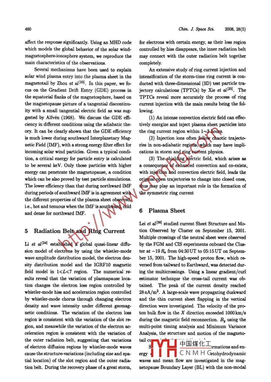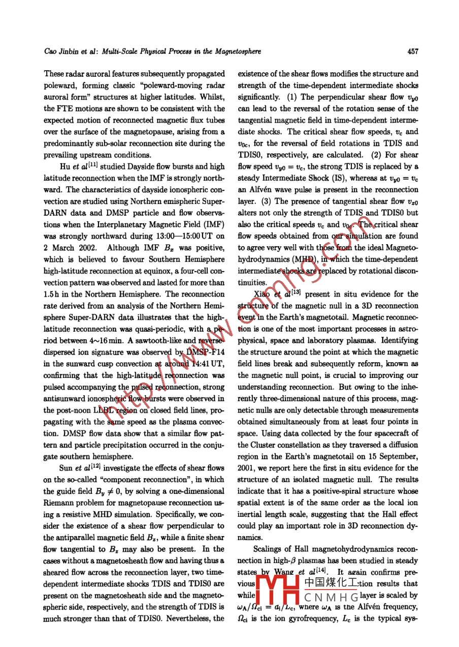 0254-6124/2008/28(5)-454-14Chin. J. Space Sci.Cao Jinbin, Liu Zhenxing. Multi-scale physical proces in the magnetoephere. Chin. J. Space Sei, 2008, 28(6): 454~467Multi-Scale Physical Process in the Magnetosphere*CAO JinbinLIU Zhenxing(State Key Labonatory for Space Weather, Center for Space Sciences and Applied Reseanch,Chinese Academy of Sciences, Beijing 100190)Abstract The brief report presents a part of the research results of the magnetospheric pbysicsresearches in China during the period of 2006- -2008. During the past two years, China-ESA cooperation DSP (Double Star Program) satellites were basically operating normally in its extendedlifetime. The DSP and Cluster missions provide Chinese space physicists high quality data to studymulti-scale physical process in the magnetosphere. The work made based on the data of DSP ispresented in the paper of“Progress of Double Star Program" of this issue.Key words Magnetosphere, Progres1 Geomagnetic Stormsnightside had the nearly same waveforms a8 those ob-served on the ground in the H (northward) compo-Wang et al[1 make a statistical survey of Interplane-ent. We suggest that the SCs observed by Oerstedtary (IP) shocks and Storm Sudden Commencements on the nightside were dominantly c8used by the en-(SSCs) observed between 1995 and 2004. We find hanced magnetopause currents, which were transmit-that 75% of sSCs are associated with shocks, consis-ted by the compressional bydromagnetic waves, andtent with previous work. We use this survey to inves the efectst of the lonospheric Current (IC) were neg-tigate the efect of the interplanetary shock strength ligible on the nightside. The SC waveforms observedand orientation on the SSC rise time. We find that by Oersted on the dayside were apparently diferentthe higher the speed of an IP shock, the less timefrom those observed on the ground. Near the Day-it takes to sweep by the magnetosphere, and thus side Dip Equator (DDE), corresponding to Prelimi-the shorter the rise time of the corresponding SsC.nary Reverse Impulses (PRIs) observed in the groundThe orientation of an IP shock also efectse the SsC H component, Oersted always observed positive im-rise time. Generally speaking, a highly oblique shock pulses in the B11 component, which suggest that thecauses asymmetric compression of the magnetosphere PRIs at the DDE are generated by westward IC8. Onwith respect to the noon -midnight meridian, takes the dayside, corresponding to positive Main Impulsesmore time to sweep by magnetosphere, and thus re(MIs) of SCs observed in the ground H component,sults in a longer rise time of the SSC.the Oersted B11 component always presented clearOersted is a low-altitude (638~849km) polar-decreases, which implies that an eastward IC was ex-orbiting setllite. Using vector magnetic field mea- cited after the PRI. The generation mechanism forsurements obtained from Oersted, Han et al[2the westward and eastward ICs are discussed accord-identified more than 20 geomagnetic Sudden Com-ing to previously proposed models. On the dayside,mencement (SC) events on both dayside (06:00- we suggest that the waveforms observed both on the18:00MLT) and nightside (18:00- -06:00MLT). The ground and at Oersted during the time period of PRIunique properties reflected by these events have never and Nincident compres-been reported before. The SC& observed by Oer-sional中國(guó)煤化工d caused by thested in the B11 (compressional) component on the IC8. 1YHCNMHGedjustabovethe* Supported by the National Natural Science Foundation of China (40390153, 40523006) and 973 Program (2006CB806305)Received 2008-05-10Cao Jinbin et al: Multi- Scale Physical Proce8s in the Magnetophere455ionosphere are significant complementary to our em- by the LANL-97A satllite on 14 June 1998 is 7.1 Re,pirical knowledge for SCs.and the injection time agrees well with the substormonset time identified by the Polar Utraviolet Imager.The method has been applied to an event happened at2 Magnetospheric Substorms22:54 UT on 11 March 1998, when both the satellitesThe properties of proton (0eV < E < 40keV) in the(1991-080 and LANL-97A) observed the dispersion-less character. The results indicate that the radialplasma sheet are examined by He et al3] by meansdistance of injection source locates at 8.1 Re at mag-of a superposed epoch analysis, using 115 magneto-netotail, and particles move earthward from magnetail plasma injection events which are identifed fromtotail into inner magnetosphere at 22:30UT.Cluster magnetotail orbit time in between 2001 andBasing on the data from three stllites of Clus-2004. All events distribute in magnetic local timefrom 20:00UT to 04:00UT. Five clases of magneto-ter (C1, C3 and C4) in the year of 2001 and 2002, Matail injection events are found to be similar with theet al5 examine the relationship between the Rapidgeosynchronous observation: (1) pure ion injections;Convection Event (RCE) and substorm. The observa-(2) ion injections followed a few minutes later by antion of RCE measured by single satellite is not exactlyelectron injection; (3) simultaneous ion and electronwhat happened in the magnetotail. Both C1 and C3injections; (4) electron injections followed a few min-observed the event occurring on July 25, 2002, bututes later by an ion injection; (5) pure electron in-C4 did not. Among the 306 RCEs jointly measuredjections. Proton shows a significant increase in tem-by three satellites, 215 ones were obeerved by C1.perature and density at the onset, and injects earth-C3 and C4 obtained 266 and 227 ones respectively.ward with an increasing velocity more than the pre-The average duration of RCE in the magnetosphereinjection average one. Superposed epoch analysis oncan't be really represented by the outcome surveyedthe simultaneous observation data of dusk -dawn elec-by single satellite. So our analysis has shown thattric field from the EFW (Electric Field and Waves)RCE transports more fractions of energy and mag-instrument, we found two