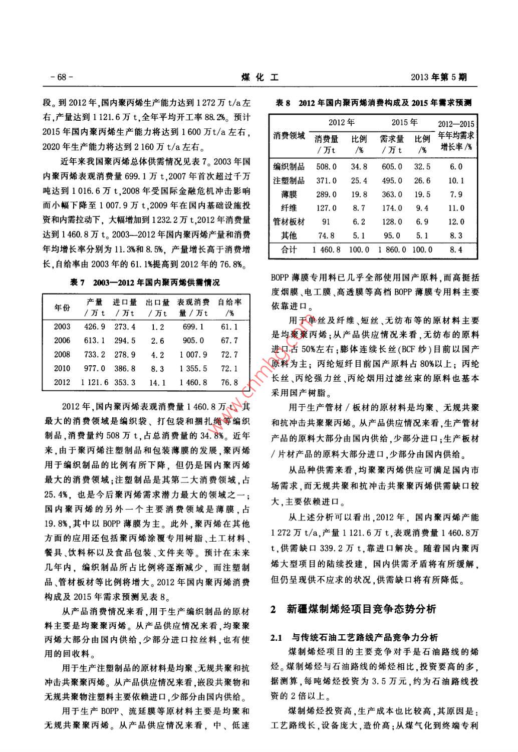 2013年10月孟磊等:國內(nèi)烯烴 市場綜述及新疆H煤制烯烴產(chǎn)品競爭力分析67 -表22012 年國內(nèi)HDPE消費構(gòu)成及2015年需求預(yù)測表42012 年國內(nèi)LDPE消費構(gòu)成及2015年需求預(yù)測2012年2015年2012- -2015年年均需消費領(lǐng)域消費量比例需求量比例求增長率消費量比例需求量比例年年均需求/萬t /% /萬t /9/9增長率/%吹塑制品135.0 20.4 168.0 20. 77. 5包裝膜190.0 57.4 207.0 55. 52.9包裝膜114.0 17.3 147.0 18. 28.8農(nóng)膜23.0 7.0 18. 03.0 0.5 3.0 0. ,0.0擠出成型30.2 9.1 40.0 10.79.8注塑及中空制品114.0 17.3 140.0 17.37.1涂層制品37. 18.9板片管材140.0 21.2 172.0 21.2注塑成型27.2 8.2 33. 06.7電線電纜22.0 3.3 27.0 3.3其他23.3 7.1 27.0 7.2單絲和編織產(chǎn)品82.0 12.4 98.0 12.6.1合計330.8 100.0 373.0 100.04.150.17.6 55.0 6.83. 2660.1 100.0 810.0 100. 0表52003- -2012年國內(nèi)LLDPE供需情況由表2可知,預(yù)計2015年國內(nèi)HDPE需求量將達(dá)到年份產(chǎn)量進口量出口量表觀消費自給率/萬t/萬t/萬t量/萬t/%810萬t左右,2012- -2015 年年均需求增長率7.1%。,2003141.8 104.0 0.1245. 757. 71.1.2 LDPE 市場分析及預(yù)測2006 216.3 154.0 0. 5369. 858. 52003- -2012 年國內(nèi)LDPE供需情況見表3。由表32008 243.4 147.6 1. 0390. 062. 4可知,2003年國內(nèi)LDPE產(chǎn)量98.8萬t,消費量243.4萬2010 391.9 247.8 1. 8637. 961.4t。到2012年,國內(nèi)LDPE產(chǎn)量達(dá)到193.4萬t,消費量2012 338.3 207.4 8. 3537.4.63. 0達(dá)到330.8萬t。2003- -2012 年產(chǎn)量和消費年均增長率分別為7.7%和3.5%,產(chǎn)量增長高于消費增長,自給.63. 0%。LLDPE主要用于薄膜制品,此外,還用于擠出成型率由2003年的40. 6%提高到2012年的58. 5%。制品等其他領(lǐng)域。2012 年國內(nèi)LLDPE消費構(gòu)成及表32003- -2012 年國內(nèi)LDPE供需情況2015年需求預(yù)測見表6。產(chǎn)量進口量 出口量表觀消費自給率表62012 年國內(nèi)LLDPE消費構(gòu)成及2015年需求預(yù)測/萬t /萬t /萬t量/萬t /%98.8 145.3 0. 7243.440. 62006 156.6 93. 21.5248. 363. 12008 190.9 70. 81. 7260. 0.73. 4/萬t/%2010198.6 138.4 7. 9329. 160.3338.0 62.9 402.0 63. 83.02012 193.4 144.9 7. 5330. 8122.0 22.7 140.0 22. 24. 7擠出成型31.2 5.8 36.0 5.7 4. 9薄膜是LDPE主要消費領(lǐng)域,此外,還用于涂層制46.2 8.6 52.0 8.4.0品、注塑制品等領(lǐng)域。2012 年國內(nèi)LDPE消費構(gòu)成及537.4 100.0 630.0 100. 05.42015年需求預(yù)測見表4。由表4可知,預(yù)計2015年國內(nèi)LDPE需求量將達(dá)到由表6可知,預(yù)計2015年國內(nèi)LLDPE需求量將達(dá)373萬t左右,2012- -2015 年年均需求增長率5. 0%。到630萬t左右,2012- -2015 年年均需求增長率5.4%。1.1.3 LLDPE 市場情況及預(yù)測從各品種未來需求變化情況看,國內(nèi)LLDPE及.2003- 2012 年國內(nèi)LLDPE供需情況見表5。由表HDPE的需求增長要高于同期的LDPE年均需求增長速5可知,2003年國內(nèi)LLDPE產(chǎn)量141.8萬t,消費量度。隨著國內(nèi)一些聚乙烯大型項目的陸續(xù)建成投產(chǎn),245.7萬t。到2012年,國內(nèi)LLDPE產(chǎn)量達(dá)到338.3萬供需矛盾將有所緩解,但仍呈現(xiàn)供不應(yīng)求的狀況,供t,消費量達(dá)到537.4萬t。2003- -2012 年產(chǎn)量和消費需缺口將有所降低,缺口較大的品種是HDPE。年均增長率分別為10. 1%和9.1%,產(chǎn)量增長高于消費1.2聚丙烯細(xì)分 市場情況增長,自給率由2003年的57.7%提高到2012年的2000年以來,國內(nèi)聚丙烯的生產(chǎn)進入了快速發(fā)展階-68-煤化工2013年第5期段。到2012年,國內(nèi)聚丙烯生產(chǎn)能力達(dá)到1272萬t/a左表8 2012 年國內(nèi)聚丙烯消費構(gòu)成及2015年需求預(yù)測右,產(chǎn)量達(dá)到1121.6萬t, 全年平均開工率88.2%。預(yù)計2012年2015年2012- -20152015年國內(nèi)聚丙烯生產(chǎn)能力將達(dá)到1600萬t/a左右,消費領(lǐng)域.消費量比例需求量比例年年均需求2020年生產(chǎn)能力將達(dá)到2160萬t/a左右。1萬t/%/萬t /%增長率/%近年來我國聚丙烯總體供需情況見表7。2003年國.編織制品508.0 34. 8605.0 32. 56.0內(nèi)聚丙烯表觀消費量699.1萬t ,2007年首次超過千萬注塑制品371.0 25.4 495.0 26. 610. 1噸達(dá)到1016.6萬t,2008年受國際金融危機沖擊影響薄膜289. 019.8363.0 19. 57.9而小幅下降至1007.9萬t,2009年在國內(nèi)基礎(chǔ)設(shè)施投維127. 08.7174.0 9. 411. 0資和內(nèi)需拉動下,大幅增加到1232.2萬t,2012年消費量管材板材916.2128.0 6.12. 0達(dá)到1 460.8萬t。2003- -2012 年國內(nèi)聚丙烯產(chǎn)量和消費其他74. 85.195.0 5.18.3年均增長率分別為11. 3%和8.5%,產(chǎn)量增長高于消費增合計1 460.8 100.0 1 860.0 100.08.4長,自給率由2003年的61.1%提高到2012年的76.8%。BOPP薄膜專用料已幾乎全部使用國產(chǎn)原料,而高挺括表72003- -2012 年國內(nèi)聚丙烯供需情況度煙膜、電工膜、高透膜等高檔BOPP薄膜專用料主要年份產(chǎn)量進口量 出口量表觀消費自給率依靠進口。/萬t /萬t /萬t量/萬t用于單絲及纖維、短絲、無紡布等的原材料主要2003426.9 273.4 1. 2699. 1.61.1是均聚聚丙烯;從產(chǎn)品供應(yīng)情況來看,無紡布的原料2006613.1 294.5 2. 6905. 067.7進口占50%左右;膨體連續(xù)長絲(BCF紗)目前以國產(chǎn)2008733.2 278. 94.21007.972. 7原料為主;丙綸短纖目前國產(chǎn)原料占80%以上;丙綸2010 977.0 386.8 8.3 1 355.5 72. 12012 1 121.6 353.3 14. 11 460. 876. 8長絲、丙綸強力絲、丙綸煙用過濾絲束的原料也基本采用國產(chǎn)樹脂。2012年,國內(nèi)聚丙烯表觀消費量1 460.8萬t。其用于生產(chǎn)管材/板材的原材料是均聚、