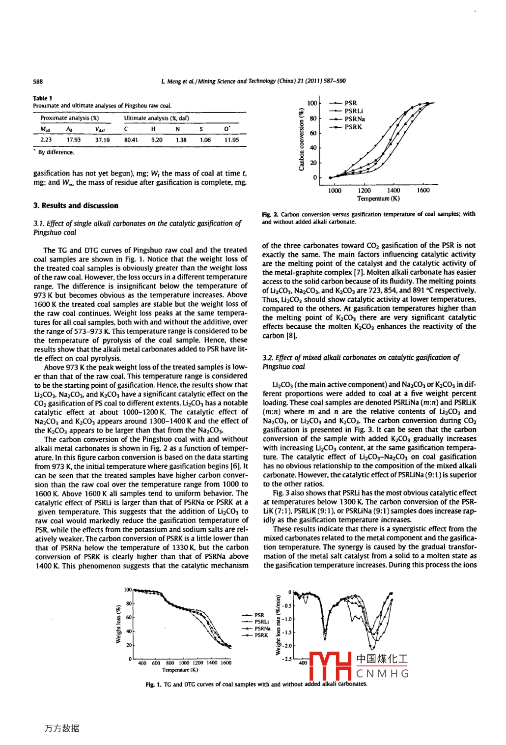 Mining Science and Technology( china )21(2011)587-590Contents lists available at Science DirectMining Science and Technology( China)ELSEVIERjournalhomepagewww.elsevier.com/locate/mstcCatalytic effect of alkali carbonates on CO2 gasification of pingshuo coalMeng Lili, Wang Meijun, Yang Huimin, Ying Hongyan, Chang LipingKey Laboratory of Coal Science and Technology. Taiyuan University of Technology, Taiyuan 030024, ChinaARTICLE INFOA BSTRACTArticle historyNa COj. Li2 CO,. and K2 Co were used as additives to Pingshuo(PS)coal that was subsequently gasifiedReceived 5 December 2010deceived in revised form 2 January 2011under a COz stream. The catalytic gasification of coal samples by Co2 in the presence single or mixedalkali carbonates was investigated by thermogravimetric analysis. the experimental results indicate thatepted 30 January 2011Available online 23 July 2011the catalytic effect of Li2 CO, is significantly larger than that of Na2 CO, or K_ CO]. The catalytic effect of themixed,bi-metal carbonate containing Li2CO, and Na2,, or LiD CO3, and K 2 CO, is related to the compo-sition of the catalyst and the proportion of the two components. The bi-metal carbonates having a moieratio of 9: 1(Li: X)has the largest catalytic effect for PS coal gasification. A synergistic effect between Ligasificationand K or Na, carbonate appears at temperatures greater than 1300 K An un-reacted shrinking core modelAlkali carbonatesis suitable for kinetic analysis of catalytic gasification of coal samples in the presence of alkali carbonates.CatalysisIt is inappropriate. however, to evaluate the catalytic effect only by the activation energy obtained fromthe kinetic calculationso 2011 Published by Elsevier B V. on behalf of China University of Mining Technology1 Introductionthe Pingshuo(PS)mine in Shanxi province of China either singlyor as mixed metal salts. The catalytic effects on COz gasificationCoal is Chinas primary source of energy. However, the utiliza- of the PS coal were then investigated systematically and a kinetiction techniques are relatively backward and this causes serious analysis of catalytic gasification was carried out. An experimentalenvironmental pollution. A clean, efficient, and comprehensive uti- and theoretical basis for clean coal technology, especially the cata-lization of coal is the only way to effectively improve the atmo- lytic gasification of coal, is provided.spheric environment and energy efficiency ( 1]. Coal gasification isthe foundation of, and is key to, successful implementation of sucha technology. However, the development of coal gasification suffers 2. Experimentalfrom several drawbacks including high reaction temperatures andenergy consumption, the difficult purification of the gaseous prodPingshuo raw coal(PSR)was collected, ground and screeneducts formed, stringent requirements on the process equipment, and a particle size of 0.12-0. 15 mm. This was used as the experimentalserious environmental pollution. The catalytic gasification of coal sample. The proximate and ultimate analyses of the raw coal arecan effectively improve the reaction rate and conversion efficiency given in Table 1. The lithium, sodium or potassium carbonate werecompared to conventional gasification techniques. This provides an evenly mixed with the coal at a loading of five weight percent. Theenergy source. Some investigators have shown that hydroxides PSRNa, PSRLi, and PSRK, respectively.and oxides of alkali metals, alkaline earth metals, or partial transiThe gasification tests were carried out using a STA409C thermo-tion metals have catalytic affects on coal gasification (2, 3]. There- gravimetric analyzer (Germany Netzsch Company). Approximatelyfore, using these alkali metal salts as catalysts has become one of 20 mg of sample was put into the crucible and heated from roomthe research hotspots in the coal gasification areatemperature to 1673 K at a 10 K/min heating rate. High purity nitro-In general, phosphates, borates, and silicates will form poly- gen was used as the carrier gas at a flow rate of 80 mL/ min the gasmeric compounds in a glassy state at the gasification temperature, ification agent was CO2 at a flow rate of 20 mL/min.which inhibits their performance Other weakly acidic salts of alka-In this study carbon conversion, X, is expressed byli metals are good catalysts for coal gasification, however 14.5).this study, Na2CO, Li, CO3 and K2CO, were added to coal from x=Wo-Ws%Corresponding author. Tel +86 351 6010482where Wo is theE-mail address: lpchangetyut.edu. cn(L Chang).tion (at the terH中國煤化工ierature of gasifica-1674-5264s- see front matter o 2011 Published by Elsevier B V on behalf of China University of MiningCNMHGdoi:101016/mstc201101001L Meng et aL/ Mining Science and Technology( dhina) 21(2011)587-590Table 1Proximate and ultimate analyses of Lingshou raw coal.Proximate analysis(%Ultimate analysis(‰dan員o一PRK2.23179337.1980415.201.381061195By difference.gasification has not yet begun), mg: W the mass of coal at time t,mg: and woo the mass of residue after gasification is complete mg100000Temperature( K)3. Results and discussionFig 2 Carbon conversion versus gasification temperature of coal samples; with3.1. Efect of single alkali carbonates on the catalytic gasification of and without added alkali carbonatePingshuo coalThe TG and DTG curves of Pingshuo raw coal and the treated of the three carbonates toward CO2 gasification of the PSr is notcoal samples are shown in Fig. 1. Notice that the weight loss of exactly the same. The main factors influencing catalytic activitythe treated coal samples is obviously greater than the weight loss are the melting point of the catalyst and the catalytic activity ofof the raw coal However the loss occurs in a different temperaturethe metal-graphite complex[7]. Molten alkali carbonate has easierrange. The difference is insignificant below the temperature of access to the solid carbon because of its fluidity. The melting points