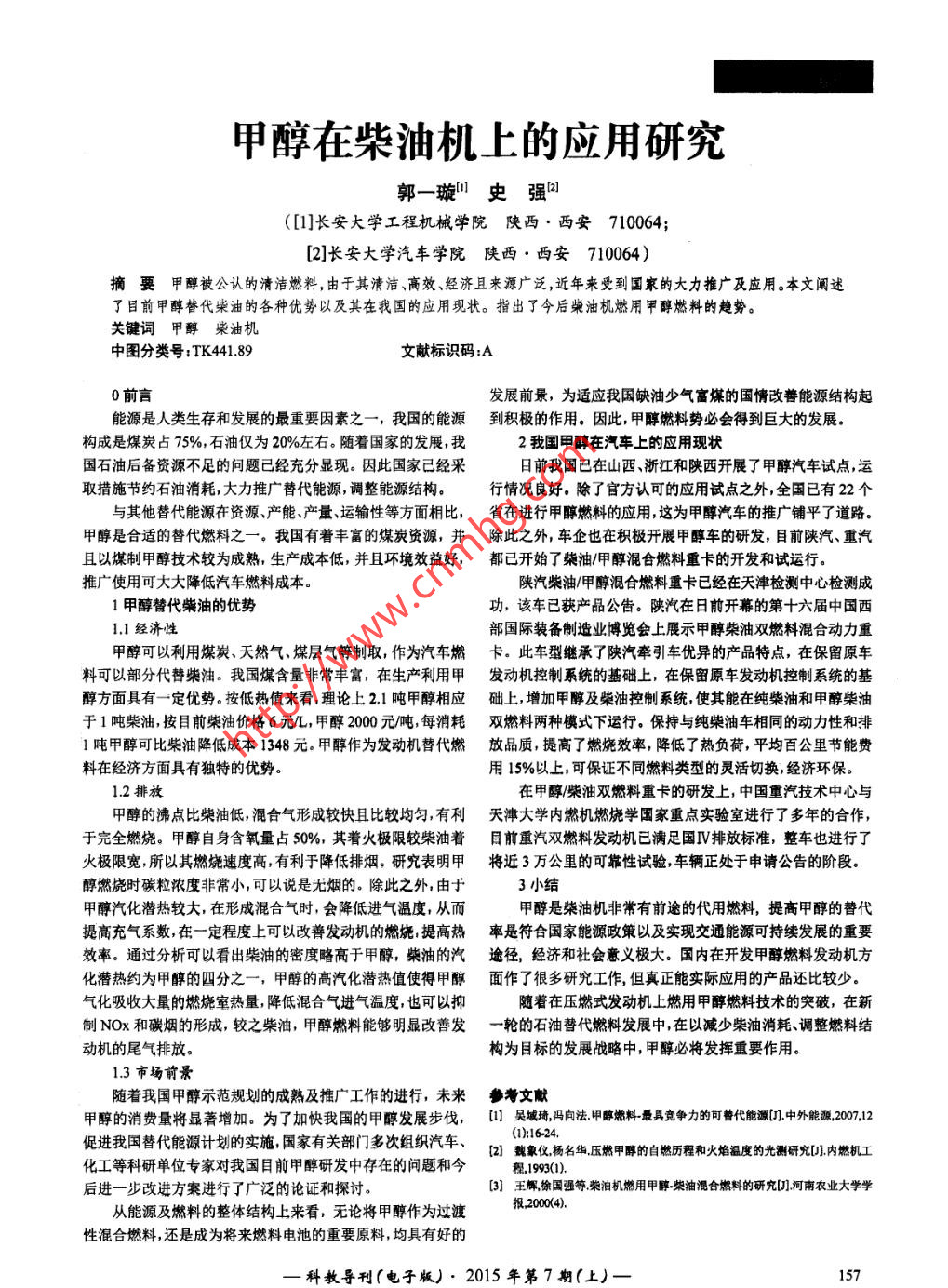 甲醇在柴油機(jī)上的應(yīng)用研究郭一璇"史強(qiáng)*([1]長安大學(xué)工程機(jī)械學(xué)院陜西 ●西安710064;[2]長安大學(xué)汽車學(xué)院陜西. 西安710064)摘要甲醇被公認(rèn)的清潔燃料,由于其清潔、高效、經(jīng)濟(jì)且來源廣泛,近年來受到國家的大力推廣及應(yīng)用。本文闡述了目前甲醇替代柴油的各種優(yōu)勢以及其在我國的應(yīng)用現(xiàn)狀。指出了今后柴油機(jī)燃用甲醇燃料的趨勢。關(guān)鍵詞甲醇柴油機(jī)中圖分類號:TK441.89文獻(xiàn)標(biāo)識碼:A0前言發(fā)展前景,為適應(yīng)我國缺油少氣富煤的國情改善能源結(jié)構(gòu)起能源是人類生存和發(fā)展的最重要因素之- -, 我國的能源到積極的作用。 因此,甲醇燃料勢必會得到巨大的發(fā)展。構(gòu)成是煤炭占75%,石油僅為20%左右。隨著國家的發(fā)展,我2我國甲醇在汽車上的應(yīng)用現(xiàn)狀國石油后備資源不足的問題已經(jīng)充分顯現(xiàn)。因此國家已經(jīng)采目前我國已在山西、浙江和陜西開展了甲醇汽車試點(diǎn),運(yùn)取措施節(jié)約石油消耗,大力推廣替代能源,調(diào)整能源結(jié)構(gòu)。行情況良好。除了官方認(rèn)可的應(yīng)用試點(diǎn)之外,全國已有22個與其他替代能源在資源、產(chǎn)能、產(chǎn)量、運(yùn)輸性等方面相比,省在進(jìn)行甲醇燃料的應(yīng)用,這為甲醇汽車的推廣鋪平了道路。甲醇是合適的替代燃料之一。我國有著豐富的煤炭資源,并除此之 外,車企也在積極開展甲醇車的研發(fā),目前陜汽、重汽且以煤制甲醇技術(shù)較為成熟,生產(chǎn)成本低,并且環(huán)境效益好,都已開始了柴油/甲醇混合燃料重卡的開發(fā)和試運(yùn)行。推廣使用可大大降低汽車燃料成本。陜汽柴油/甲醇混合燃料重卡已經(jīng)在天津檢測中心檢測成1甲醇替代柴油的優(yōu)勢功,該車已獲產(chǎn)品公告。陜汽在日前開幕的第十六屆中國西1.1經(jīng)濟(jì)性部國際裝備制造業(yè)博覽會上展示甲醇柴油雙燃料混合動力重甲醇可以利用煤炭、天然氣、煤層氣等制取,作為汽車燃卡。此車型繼承了陜汽牽引車優(yōu)異的產(chǎn)品特點(diǎn),在保留原車料可以部分代替柴油。我國煤含量非常豐富,在生產(chǎn)利用甲發(fā)動機(jī)控制系統(tǒng)的基礎(chǔ) 上,在保留原車發(fā)動機(jī)控制系統(tǒng)的基醇方面具有一-定優(yōu)勢。按低熱值來看.理論上2.1噸甲醇相應(yīng)礎(chǔ)上,增加甲醇及柴油控制系統(tǒng),使其能在純柴油和甲醇柴油于1噸柴油,按目前柴油價格6元/L,甲醇2000元/噸,每消耗雙燃料兩種模式 下運(yùn)行。保持與純柴油車相同的動力性和排1噸甲醇可比柴油降低成本1348元.甲醇作為發(fā)動機(jī)替代燃放品質(zhì),提高了燃燒效率,降低了熱負(fù)荷,平均百公里節(jié)能費(fèi)料在經(jīng)濟(jì)方面具有獨(dú)特的優(yōu)勢。用15%以上,可保證不同燃料類型的靈活切換,經(jīng)濟(jì)環(huán)保。1.2排放在甲醇/柴油雙燃料重卡的研發(fā)上,中國重汽技術(shù)中心與甲醇的佛點(diǎn)比柴油低,混合氣形成較快且比較均勻,有利天津大學(xué) 內(nèi)燃機(jī)燃燒學(xué)國家重點(diǎn)實(shí)驗(yàn)室進(jìn)行了多年的合作,于完全燃燒。甲醇自身含氧量占50%,其著火極限較柴油著目前重汽雙燃料發(fā)動機(jī)已滿足國IV排放標(biāo)準(zhǔn),整車也進(jìn)行了火極限寬,所以其燃燒速度高,有利于降低排煙。研究表明甲將近 3萬公里的可靠性試驗(yàn),車輛正處于申請公告的階段。醇燃燒時碳粒濃度非常小,可以說是無煙的。除此之外,由于3小結(jié)甲醇汽化潛熱較大,在形成混合氣時,會降低進(jìn)氣溫度,從而甲醇是柴油機(jī)非常有前途的代用燃料,提高甲醇的替代提高充氣系數(shù),在一定程度上可以改善發(fā)動機(jī)的燃燒,提高熱率是符 合國家能源政策以及實(shí)現(xiàn)交通能源可持續(xù)發(fā)展的重要效率。通過分析可以看出柴油的密度略高于甲醇,柴油的汽途徑, 經(jīng)濟(jì)和社會意義極大。國內(nèi)在開發(fā)甲醇燃料發(fā)動機(jī)方化潛熱約為甲醇的四分之一,甲醇的高汽化潛熱值使得甲醇面作了很多研究工作,但真正能實(shí)際應(yīng)用的產(chǎn)品還比較少。氣化吸收大量的燃燒室熱量,降低混合氣進(jìn)氣溫度,也可以抑隨著在壓燃式發(fā)動機(jī).上燃用甲醇燃料技術(shù)的突破,在新制NOx和碳煙的形成,較之柴油,甲醇燃料能夠明顯改善發(fā)一輪的石油 替代燃料發(fā)展中在以減少柴油消耗、調(diào)整燃料結(jié)動機(jī)的尾氣排放。構(gòu)為目標(biāo)的發(fā)展戰(zhàn)略中,甲醇必將發(fā)揮重要作用。1.3市場前景隨著我國甲醇示范規(guī)劃的成熟及推廣"工作的進(jìn)行,未來參考文獻(xiàn)甲醇的消費(fèi)量將顯著增加。為了加快我國的甲醇發(fā)展步伐,W 吳城琦,馮向法甲靜燃料:最具競爭力的可著代能源(0.中外能.007012(1):16-24.促進(jìn)我國替代能源計劃的實(shí)施,國家有關(guān)部門多次組織汽車、[2] 魏象儀,楊名華,壓燃 甲醇的自燃?xì)v程和火焰溫度的光測研究[D].內(nèi)燃機(jī)工化工等科研單位專家對我國目前甲醇研發(fā)中存在的問題和今程1993().后進(jìn)一步改進(jìn)方案進(jìn)行了廣泛的論證和探討。[3] 王輝徐國強(qiáng)等.柴油機(jī)燃用 甲醇柴油混合燃料的研究[]河南農(nóng)業(y