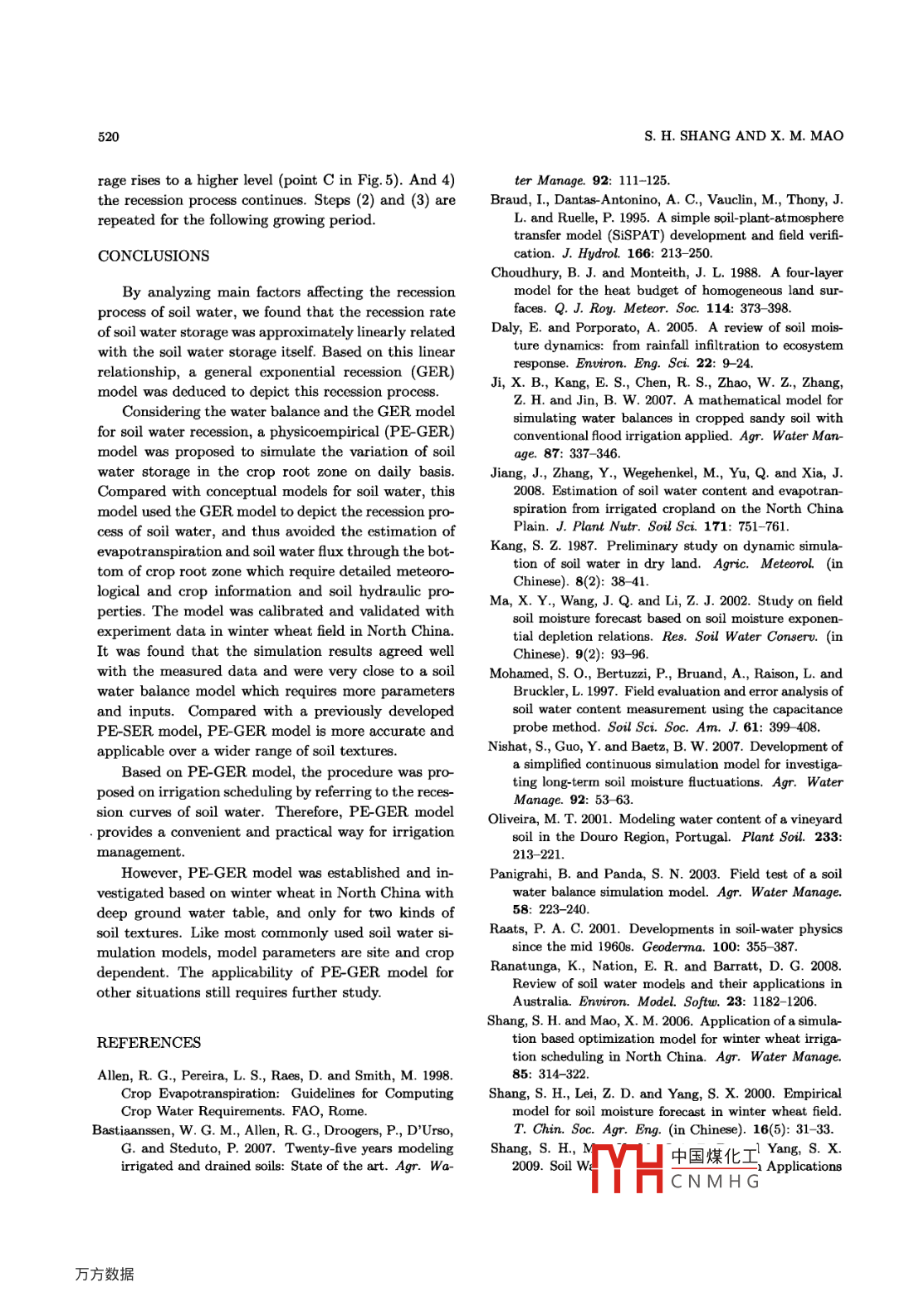 Pedosphene 21(4): 512- -521, 2011ISSN 1002-0160/CN 32-1315/PPEDOSPHERE回2011 Soil Science Society of ChinaPublished by Elsevier B.V. and Science Presswww .elsevier com/locate/pedosphereA Physicoempirical Model for Soil Water Simulationin Crop Root Zone*lSHANG Song -Hao1,*2 and MAO Xiao-Min21 State Key Laboratory of Hydroscience and Engineering, Department of Hydraulic Engineering, Tsinghua University, Beijing100084 (China)2 Center for Agricultural Water Research in China, College of Water Conservancy and Civril Engineering, China AgriculturalUniversity, Beijing 100083 (China)(Received September 13, 2010; revised May 5, 2011)ABSTRACTTo predict soil water variation in the crop root zone, a general exponential recession (GER) model was developed todepict the ecession process of soil water storage. Incorporating the GER model into the mass balance model for soil water,a GER-based physicoempirical (PE-GER) model was proposed for simulating soil water variation in the crop root zone. ThePE GER model was calibrated and validated with experimental data of winter wheat in North China. Simulation resultsagreed well with the field experiment results, as well as were consistentdeveloped soil water balance model which required more detailed parameters and inputs. Compared with a previouslydeveloped simple exponential recession (SER) based physicoempirical (PE -SER) model, PE-GER was more suitable forapplication in a broad range of soil texture, from light soil to heavy soil. Practical application of PE-GER showed thatPE-GER could provide a convenient way to simulate and predict the variation of soil water storage in the crop root zone,especially in case of insufficient data for conceptual or hydrodynamic models.Key Words: general exponential recession model, irrigation scheduling, recession process, soil textureCitation: Shang, S. H. and Mao, X. M. 2011. A physicoempirical model for soil water simulation in crop root zone.Pedosphere. 21(4): 512- -521.INTRODUCTIONgement to predict soil water content in the crop rootzone (Panigrahi and Panda, 2003; Ranatunga et al,Soil water is the main source for crop root uptake in2008). The soil water dynamics is mainly influencedthe field and usually taken as a key index for field waterby meteorological, soil and crop factors. Various simu-management. Soil water dynamics also has great infue-lation models have been proposed with different setsnce on nutrients and contaminants transport in soils,of model parameters, inputs and outputs (Ranatungaplant growth, meteorological processes and groundwa-et al, 2008; Shang et al, 2009), which can be classi-ter dynamics (Daly and Porporato, 2005). Therefore,fied into three types, i.e., empirical models, conceptualresearch on soil water has aroused the interest of soilmodels and hydrodynamic models (Shang et al, 2009).scientist, agronomist, hydrologist, meteorologist, etC.,Empirical models are usually data-driven black-boxand greatly facilitated the development of theoreticalbasis and application of soil water models (Raats, 2001;and outputs. Examples of empirical models for soil wa-Bastiaanssen et al, 2007; Shang et al, 2009).ter simulation include regression model (Kang, 1987),Because long-term in situ monitoring of soil watersupport vector machines model (Wu et al, 2008), arti-is time consuming and costly, the simulation-modelingficial neural networks model (Shang et al, 2009), andapproach was widely used in agricultural water mana-time series analysis model (Wu et al, 1997; Oliveira,*lSupported by the National Natural Science Foundation of China (Nos. 50879041 and 50939004) and the Program for NewCentury Excellent Talents in University of the Ministry of Education of China (Nim 7F-9059中國煤化工*2Corresponding author. E mail: shangsh@tsinghua.edu.cn.TYHCNMHGPHYSICOEMPIRICAL MODEL FOR SOIL WATER SIMULATION5132001). These empirical models are not established onmodels require fewer inputs and can be easily usedthe physical mechanism of the soil water flow and relyin practice, but they consider little of the mechanismheavily on field observation results at specified site andgoverning soil water flow. Therefore, a physicormpiri-weather conditions. However, they benefit from hav-cal model that combines the advantages of conceptualing fewer parameters and requiring fewer inputs thanmodel and empirical model may be more appropriate :hydrodynamic or conceptual models, and are thereforefor modeling soil water variation in case of insuficientmore convenient to be used in specified conditions.data. Shang et al. (2000) proposed a physicoempiri-Conceptual models are based on the mass bala~cal model, which considered the principle of soil waternce of soil water in the crop root zone (e.g, Shangbalance and used a simple exponential recession (SER)and Mao, 2006; Nishat et al, 2007; Jiang et al,curve to depict the recession process of soil water in2008),where soil water variations were derived fromthe crop root zone. This SER model based physicoem-other measured or estimated water balance compo-pirical (PE-SER) model can avoid the estimation ofnents, such 88 precipitation, irrigation, evapotranspi-evapotranspiration and require fewer inputs to simu-ration, and deep percolation. These models mainlylate the dynamic variation of soil water in the cropconsider the soil water quantity in the root zone, whilezone. It has been validated with field data for lightthe mechanism of soil water flow was not fully consi-soils (Shang et al, 2000; Ma et al, 2002), but its ap-dered. They are more widely used in agricultural waterplicability for heavy soils is still questionable.The main purposes of this study were to extend thequire fewer inputs and can be easily used at the fieldSER model to a general exponential recession (GER)scale (Panigrahi and Panda, 2003).model and to develop a GER model based physicoem-Hydrodynamic models, or physically-based models,pirical (PE-GER) model to simulate the variation ofare based on general laws of the physical me