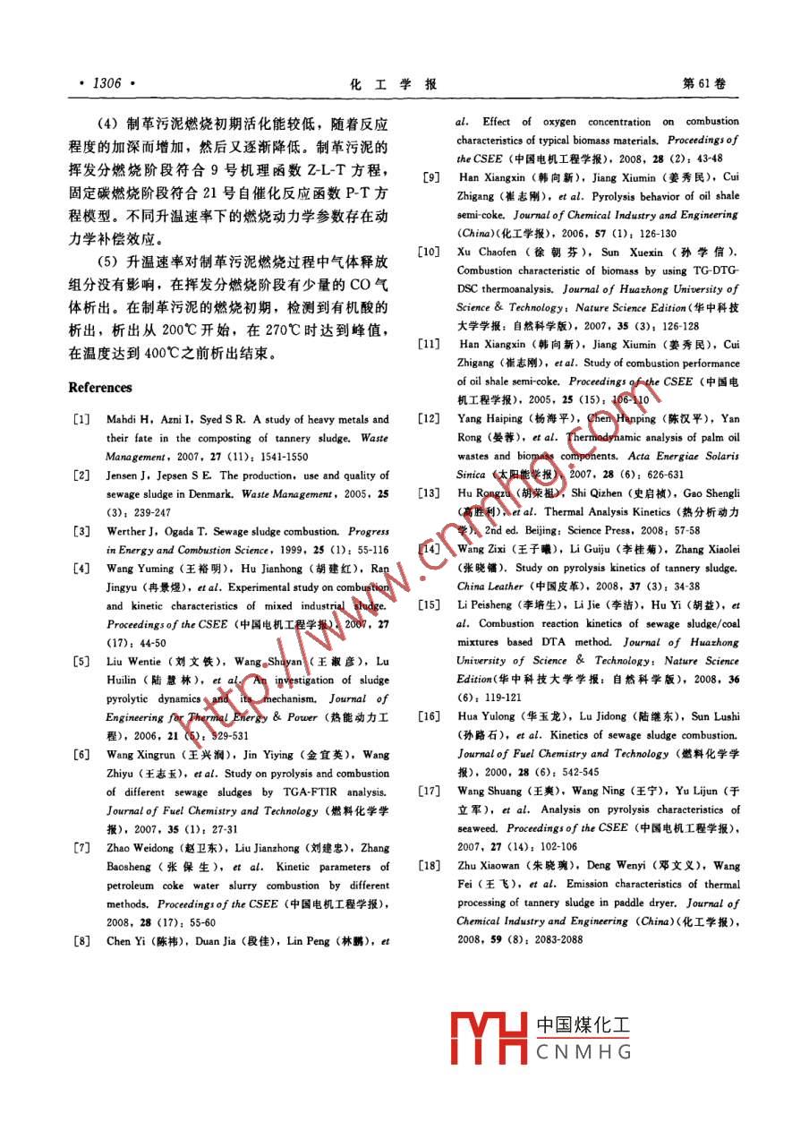 第61卷第5期化工學報Vol 61 No 52010年5月CIESC JournalMay 2010研究論文熱重-紅外聯(lián)用分析制革污泥的燃燒特性李春雨',蔣旭光1,費振偉',安春國,池涌1,嚴建華1,俞愷2,傅娟娟2,潘金華2,施政2(能源清潔利用國家重點實驗室(浙江大學),浙江杭州310027;2湖州市工業(yè)和醫(yī)療廢物處置中心有限公司,浙江湖州313000摘要:利用 TG-FTIR對制革污泥的燃燒特性和燃燒過程氣體釋放情況進行了研究。研究發(fā)現(xiàn),制革污泥揮發(fā)分和灰分含量較高,固定碳含量低、熱值低。不同升溫速率下,制革污泥的燃燒在800℃時已經(jīng)比較充分,隨著升溫速率的增加,制革污泥碳燃燒的失重速率和峰值溫度有所增加,運用 Ozawa法進行活化能計算表明,制革污泥燃燒所需活化能隨著反應(yīng)程度的深入而增加。制革污泥的揮發(fā)分燃燒階段符合三維擴散的ZLT方程反應(yīng)模型,固定碳燃燒階段符合自催化反應(yīng)的PT方程反應(yīng)模型,且制革污泥在不同升溫速率下燃燒動力學參數(shù)存在動力學補償效應(yīng)。 TG-FTIR分析表明,不同升溫速率對氣體析出基本特征沒有影響,在低溫階段,制革污泥的燃燒產(chǎn)物中有少量的有機酸組分析出關(guān)鍵詞:制革污泥;熱重紅外聯(lián)用;燃燒;動力學特性;活化能中圖分類號:X705文獻標識碼:A文章編號:0438-1157(2010)05-1301-06TG-FtiR analysis on combustion characteristics of tannery sludgeLI Chunyu, JIANG Xuguang, FEl Zhenwei, AN Chunguo, CHI Yong,YAN Jianhua,YU Kai, FU Juanjuan, PAN Jinhua, SHI Zheng.( State Key Laboratory of Clean Energy Utilization, Zhejiang University, Hangzhou 310027, Zhejiang, China;2 Huzhou Industry and Hospital Waste Treatment Center Co, Ltd, Huzhou 313000, Zhejiang, ChinaAbstract: The combustion and emission characteristics of tannery sludge at different heating rates wereinvestigated by using thermogravimetric analysis- Fourier transform infrared spectrometer(TG-FTIR). Itwas found that the original tannery sludge contained high contents of volatile mater and ash while lowcontent of fixed carbon, and had a low calorific value The combustion of combustible matter in tannerysludge almost finished before 800C. The Ozawa method was used to analyze the activation energy oftannery sludge combustion, and it was found that the activation energy in the tannery sludge combustionprocess increased with the extent of combustion reaction. The combustion of volatile matter in tannerysludge followed the three-dimensional diffusion model and Z-L-T equation was the most probable kineticfunction, and the combustion of fixed carbon followed the self-catalyzed reaction and P-T equation wasthe most probable kinetic function. It was found that kinetic compensation relationship existed between2009-10-25收到初稿,2010—01-07收到修改稿Received date: 2009-10-25聯(lián)系人:蔣旭光。第一作者:李春爾(1980-),男,博士研Corresponding author: Prof. JIANG Xuguang, jiangxg基金項目;國家高技術(shù)研究發(fā)展計劃重點項(2007AA061302,2007AA06236);浙江省重大科技專項De2007C13084);浙江省自然科學基金項目(X506312,R107532)YHsupPorted by the High-tech Research and中國煤化工02,200A06236)CNMHG浙江省科技計劃項目(2008C23090);教育部新世紀優(yōu)秀人才支持計劃(NCET050524)1302化工學報第61卷combustion activation energy and pre-exponential factor at different heating rates. Some organic gaseousd at the lotKey words: tannery sludge; thermogravimetric analysis-Fourier transform infrared spectrometer;combustion; kinetic characteristics; activation energy引言FTIR氣體池分析。污泥樣品在105℃下烘干后研磨,試樣工業(yè)分2008年我國成品革產(chǎn)量64億平方米,占世析和元素分析如表1所示??梢园l(fā)現(xiàn),制革污泥中界20%左右,制革行業(yè)年廢水排放量約1.2億噸,含有較高的揮發(fā)分和灰分,但固定碳含量較低,導大量制革污泥需要處理。由于含有豐富的有機質(zhì),致制革污泥的熱值較低。熱重實驗中放入試樣15制革污泥曾被廣泛用作農(nóng)業(yè)肥料,但污泥中的重金mg左右,空氣流量60ml·min1,升溫速率采用屬會對土壤造成嚴重污染口,隨著環(huán)境政策越來越10、30、50℃·min1,實驗溫度范圍50~950℃。嚴格,采用堆肥處理的污泥將越來越少2。焚燒已經(jīng)成為最有發(fā)展前景的污泥處置方法,焚燒不但2實驗結(jié)果與分析可以徹底消除污泥中的有機物和病原體,在實現(xiàn)污2.1TG實驗結(jié)果分析泥的減量化、無害化處理的同時,還可以實現(xiàn)部分由于升溫速率對燃燒有重要影響1,所以熱能的回收。污泥通常具有較高的揮發(fā)分和灰分含本文在10、30、50℃·min1三個升溫速率下對制量,雖然熱值較低,但具有較好的著火和燃盡特革污泥的燃燒進行研究,圖1是制革污泥在不同升性,研究發(fā)現(xiàn)污泥的燃燒過程中起主要作用的是溫速率下失重( thermogravimetric,TG)曲線,揮發(fā)分的燃燒,由于灰分含量較高,污泥燃燒高可以發(fā)現(xiàn)隨著升溫速率的提高,制革污泥的燃燒過溫階段存在明顯的無機鹽分解6程有向高溫區(qū)偏移的趨勢。在三個升溫速率下,制通過熱重實驗研究來判斷燃料特性,并進行動革污泥燃燒最終失重份額幾乎完全相同,熱重分析力學分析已經(jīng)成為燃料特性研究的一種重要手顯示,在800℃時制革污泥燃燒反應(yīng)程度已經(jīng)達段10,但目前對制革污泥燃燒特性的研究尚少。到98%。浙江省是皮革生產(chǎn)大省,堆積的大量制革污泥已經(jīng)圖2是制革污泥燃燒失重速率( differential成為環(huán)境隱患,本文利用熱重紅外聯(lián)用方法對