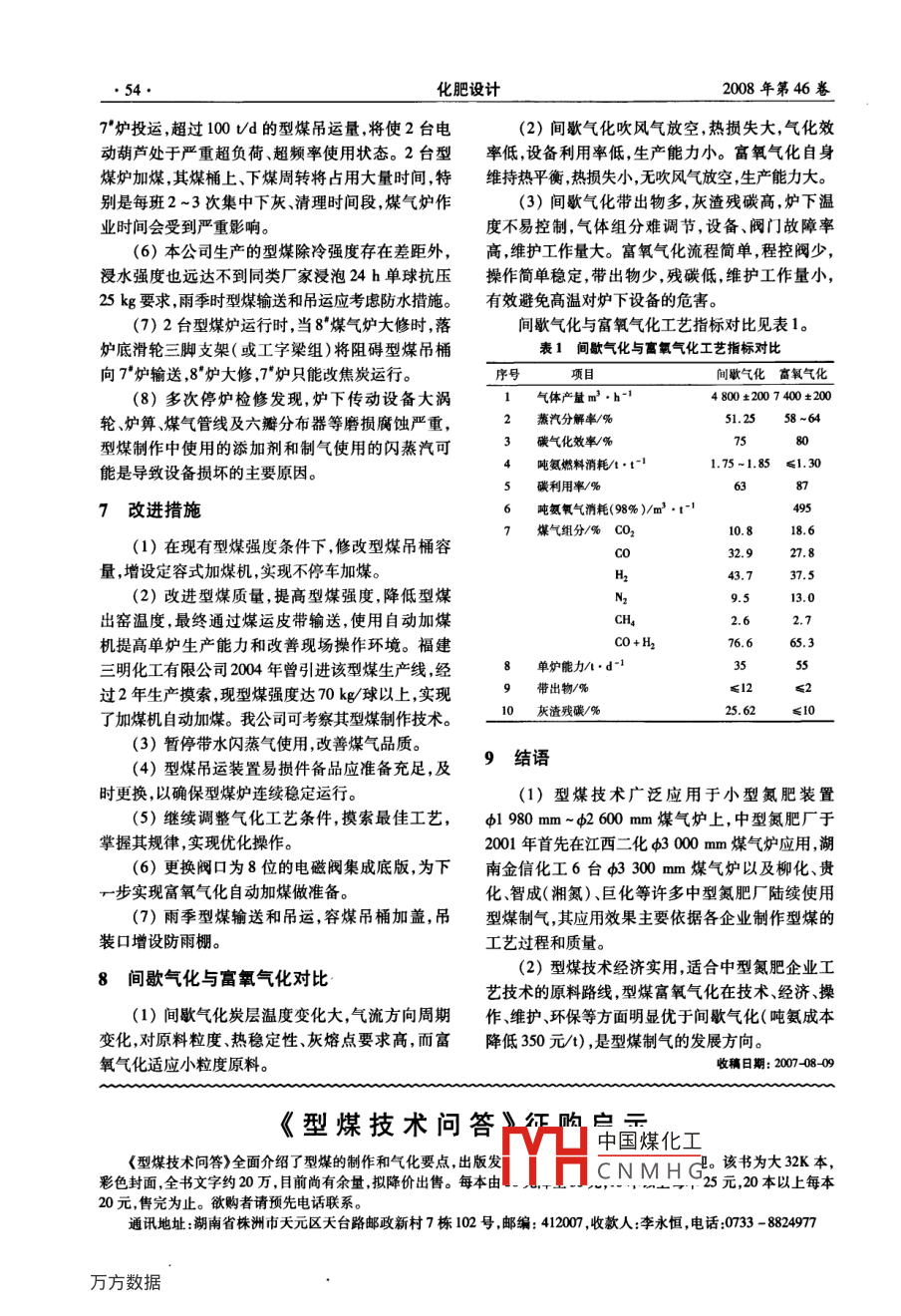 第46卷第1期化肥設(shè)計Feb. 20082008年2月Chemical Fertilizer Design●51.型煤氣化工藝在合成氨廠的運用陸軍(安徽淮化集團合成氨- -廠,安徽淮南232038)摘要:介紹了型煤制作過程 中粘結(jié)劑和工藝流程的選定;分析了固定層間歇氣化工藝條件的選擇要領(lǐng)和爐上溫度控制指標;從氣化爐出口溫度、灰渣殘?zhí)己?、氣體組分和氧含量的控制等方面,論迷了型堞富氧氣化試燒過程;對比了間歇氣化和富氧氣化的優(yōu)缺點,提出了型謀氣化存在的問題及改進措施。關(guān)鍵詞:型煤氣化;粘結(jié)劑;間歇氣化;富氧氣化中圖分類號: TQ113. 254文獻標識碼: B文章編號:1004 - 8901 (2008)01 -0000 -04Utilization of Shaped Coal Gasification Process in Ammonia Synthesis PlantLU Jun(The Pint Ammonia Syntheis Plant, Anhui Huairua Group, Huainan Anhui 232038 China)Abstract: Author has intoduced the selections of both the cohesive agent and proces flow during preparing shaped coal; analyzed the selecting gistfor itermitent grificaion procese conditions in the faxed bed and the temperature control index of gaifier; discused the trial combusion proceas for richoaxygen gasification of shaped coal; compared the advantages and sbortages between the intermittent gaification and the rich oxygen gasification, and pre-ented the existing problems of the shaped coal gaifcation and is improved measures.Key words: shaped coal gaification; cohesive agent; itrmitent gaification; rich orxygen gasification綜觀現(xiàn)有中小型氮肥企業(yè)原料路線的技術(shù)改1型煤制氣技術(shù)的使用 背景造,采用粉煤制氣是核心,采用粉煤資源加工成型安徽淮化集團公司合成氨- -廠醇氨生產(chǎn)能力煤代替目前焦炭及塊煤制氣是可行之路。經(jīng)過幾為180 kV/a,采用常壓固定層間歇或富氧制氣, UCI十年發(fā)展,型煤制氣技術(shù)已日趨成熟。公司經(jīng)過多煤氣爐8臺,常壓流化床氣化粉煤爐1臺。固定層方考察調(diào)研和測算,確認型煤自產(chǎn)價格可以達到系統(tǒng)氣化原料主要以本公司自產(chǎn)焦炭為主,以篩焦560元/t,遂決定采用型煤制氣技術(shù),以進一步降 低及外購洗小塊白煤為輔。近幾年來,國內(nèi)煤炭供應生產(chǎn)成本。.市場發(fā)生了很大的變化,尤其是山西晉城優(yōu)質(zhì)塊煤2型煤制作日趨緊張,加之運輸成本上升,進廠煤價持續(xù)攀升, .人爐價格達800元/t以上,已接近公司自產(chǎn)焦炭價2.1粘結(jié)劑的選擇格。合成氨一廠自1990年開始陸續(xù)進行原料路線氣化所用原料煤產(chǎn)地不同,品種多變,煤的彈多元化嘗試,中塊白煤間歇、富氧氣化,小塊白煤、性和塑性存在很大差異,同時由于灰分中化學組成小籽焦(篩焦)富氧氣化相繼試燒成功,為公司實現(xiàn)存在差別,與粘結(jié)劑相融性也不相同,采用一種粘原料煤綜合利用奠定了基礎(chǔ)。隨著我國采煤機械合劑難以適應復雜多變的煤種,故使用膨潤土、腐化程度的提高,塊煤生產(chǎn)率下降,無法滿足造氣對植酸鹽及洗精煤等多成分復合粘結(jié)劑。塊煤的要求,而篩出的大量煤粉卻因利用率低而長2.2 工藝流程期積壓,造成資源浪費。原料煤由落煤斗經(jīng)皮帶輸送機送人粉碎機,粉2003年公司粉煤流化床氣化爐投產(chǎn),由于粉煤碎至- -定粒度后落人雙軸攪拌機,在攪拌機內(nèi)按工干燥及輸送系統(tǒng)產(chǎn)生粉塵污染,裝置至今仍處于停藝要求中國煤化工潤土及當?shù)叵串a(chǎn)整改階段。國內(nèi)外其他許多成熟的粉煤直接氣精煤,MYHCNMHG混合后轉(zhuǎn)入制化技術(shù)因初期投資巨大、技術(shù)不成熟、運行成本較高等原因,企業(yè)難以承受。公司焦爐爐齡即將到作者簡介:陸軍(1968年-),男,上海人,1988年畢業(yè)于安徽淮南聯(lián)期,合成氨老系統(tǒng)原料路線改造已迫在眉睫。合大學化學工程專業(yè),工程師,從事合成氨廠造氣生產(chǎn)技術(shù)管理工作?;试O(shè)計2008年第46卷球。由落煤斗經(jīng)皮帶機送人煤球成型機制成煤球移趨勢,此時會使型煤受熱膨脹導致破碎粉化,因后,經(jīng)篩子分離碎煤,由皮帶輸送機送至烘干工序。.此時間不能過長。煤球在烘干機的爐排.上由鏈條牽引在烘干室內(nèi),利(2)下吹時,蒸汽吸收爐面熱量,同時將氣化用熱風爐產(chǎn)生的高溫煙氣將煤球烘干,落人烘干爐層高熱量移向炭層底部,不但減少氣體帶出的熱損底煤斗的煤球由排渣電瓶車分批送至造氣系統(tǒng)型失,對穩(wěn)定氣化層高溫區(qū)十分有利。但若時間過煤專用氣化爐,用于制取合成氨原料氣。長,氣化層高溫區(qū)下移,爐底溫度將持續(xù)上升,煤氣帶出顯熱增加,特別危害爐箅、爐下中心管、三叉3工藝路線的選定管,尤其是鑄鐵材質(zhì)的下吹管線。100 kt/a 腐植酸鹽型煤生產(chǎn)線試運行期間,合(3)與氣化塊煤及焦炭類似,型煤上吹比例要成氨廠組織部分降溫型煤(烘干窯溫度過高)從煤少于下吹比例,而且.還要掌握下吹時間和下吹蒸汽運皮帶系統(tǒng)進行輸送測試。由于型煤粘結(jié)劑配方用量的匹配。上下吹比例及其蒸汽用量是否合適,尚處于摸索調(diào)試階段及煤運系統(tǒng)折返落差過大,型可以通過觀察爐況的變化、上下吹蒸汽分解率分析煤破碎率達50%以上,煤氣爐無法正常氣化。本著得以驗證。根據(jù)型煤的煤質(zhì)分析合理調(diào)整上、下吹適用、經(jīng)濟、效益最大化的原則,在現(xiàn)有裝置不做大比例以避免氣化層超溫。150 s循環(huán)時間,吹風及制幅調(dià