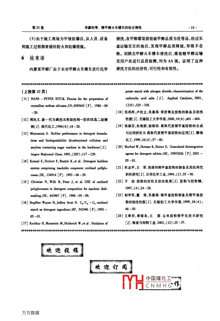 實(shí)周拉術(shù)清洗世界第23卷第7期Cleaning World2007年7月文章編號(hào):1671-8909(2007)07-0012-04精甲醇火車槽車的組合清洗李勰鈞王忠太邵瑜徐生軍(中國(guó)藍(lán)星集團(tuán)總公司西北分公司,甘肅蘭州70060)摘要:敘述精甲醇火車槽車啟用前進(jìn)行清洗的必要性。采用組合清洗工藝對(duì)槽豐內(nèi)壁進(jìn)行清洗,達(dá)到了非常好的效果。關(guān)鍵詞:甲醇;槽車;組合清洗中圖分類號(hào):TE976文獻(xiàn)標(biāo)識(shí)碼BCombined type cleaning for train tanker of purifying methanolLI Xiejun, WANG Zhongtai, SHAo Yu, XU shengjunNorthwest Co., Bluestar Co, Ltd., Lanzhou, Gansa 730060, China)Abstract: The cleaning necessity of new train tanker of purifying methanol were discribed. The com-bined type cleaning process used to cleaning inner surace of train tanker to achieve very good resultsey words: methanol陜北某甲醇裝置一期規(guī)劃建設(shè)規(guī)模20萬(wàn)ta,1清洗工藝與方案由于地處毛烏素沙漠邊緣,冬季氣溫常達(dá)到-30℃左右,霜凍期長(zhǎng)達(dá)5個(gè)月,一遇到下雪路面就結(jié)冰,在常規(guī)的化學(xué)清洗工藝中清洗的步驟一般為:嚴(yán)重時(shí)導(dǎo)致道理癱瘓給公路運(yùn)輸帶來(lái)了很大不便。水沖洗堿洗一水沖洗一酸洗一水沖洗一漂洗一中為保證成品精甲醇的順利運(yùn)輸,生產(chǎn)商購(gòu)置了156和、鈍化。對(duì)于火車槽車一類設(shè)備,既可采用全充滿式清洗也可采用噴淋式清洗。如果火車槽車的清臺(tái)75G型火車槽車來(lái)進(jìn)行精甲醇的安全運(yùn)輸。洗采用全充滿常規(guī)工藝,存在以下的缺點(diǎn)這種火車槽內(nèi)壁在制造過(guò)程中存在較多油脂、(1)從工期上考慮常規(guī)工藝所花費(fèi)的時(shí)間較防銹漆、鐵銹等雜質(zhì)。在精甲醇的質(zhì)量指標(biāo)中,最易長(zhǎng)。清洗一臺(tái)槽車,一般為堿洗8-10h,酸洗6~8受到貯存運(yùn)輸過(guò)程影響的指標(biāo)有外觀色度、水分b,漂洗2h,中和鈍化4-8h。如果再加上水沖洗等而鐵銹油分、防銹漆、水分及其它化學(xué)成份是影時(shí)間則清洗一臺(tái)槽車需要近40h。這么長(zhǎng)的清洗響精甲醇品質(zhì)的主要因素。因此要保證精甲醇長(zhǎng)工期,是不可行的。途運(yùn)輸后的品質(zhì),僅對(duì)火車槽車進(jìn)行簡(jiǎn)單的化學(xué)清(2)火車槽車僅在頂部有一個(gè)人孔。若采用充洗是不夠的需要采用與一般清洗不同的工藝。YH中國(guó)煤化工,廢液很難排出CNMHG收稿日期:2007-06-14作者簡(jiǎn)介:李勰鉤(1974-)男山東掖縣人,化學(xué)清洗技師主要從事化學(xué)清洗工作。第23卷李勰鉤等.精甲醇火車槽車的組合清洗13而且從廢液處理上考慮,一臺(tái)槽車要產(chǎn)生大約400(3)干燥后的槽車內(nèi)壁還有可能附著有細(xì)小的m3的清洗廢水。從環(huán)保和污水處理角度考慮也是灰塵及其它微小顆粒。為保證成品精甲醇的品質(zhì),不可行的。對(duì)干燥后的槽車內(nèi)壁要再使用物理處理的方法,徹(3)采用此方法成本也大。底消除影響精甲醇品質(zhì)的所有因素保證成品精甲通過(guò)實(shí)驗(yàn)發(fā)現(xiàn)若單純使用噴淋清洗或物理處醇的品質(zhì)。理的方法難以達(dá)到較長(zhǎng)時(shí)間貯存精甲醇的要求2循環(huán)噴林清洗的回路設(shè)計(jì)(4)設(shè)備在建造、安裝等過(guò)程中不可避免地會(huì)有油脂附著在金屬壁面上?;疖嚥圮図敳咳丝走€刷有出于安全的考慮,在制造時(shí)火車槽車底部不設(shè)防銹漆,這層油脂及防銹漆不僅影響酸洗、鈍化的效閥門法蘭?;瘜W(xué)清洗時(shí),只能通過(guò)頂部人孔將清洗果,在火車運(yùn)輸過(guò)程中由于車體的晃動(dòng)還會(huì)導(dǎo)致精液抽出。清洗液與火車槽車內(nèi)壁發(fā)生化學(xué)反應(yīng)后,甲醇與其接觸而影響精甲醇的色度。清除這些油產(chǎn)生的雜質(zhì)顆粒會(huì)沉積在槽車底部用普通潛水泵脂及防銹漆有三種方法:來(lái)排出廢液可能影響其正常運(yùn)行。因此清洗回路使用堿性脫脂液脫脂但這種方法需要加熱而設(shè)計(jì)中選用與清洗泵流量相近的耐腐蝕濁流泵作施工現(xiàn)場(chǎng)不具備加熱條件;為回液泵使用有機(jī)溶劑擦拭脫脂但這種方法所需時(shí)間1清洗設(shè)備較長(zhǎng)、價(jià)格昂貴,并且具有一定的毒性;清洗設(shè)備包括清洗箱、清洗泵、回液泵、三維立物理處理方法簡(jiǎn)單、方便。經(jīng)局部試驗(yàn)可將防體旋轉(zhuǎn)噴淋器、Y型過(guò)濾器和連接管銹漆徹底清除。2.2循環(huán)系統(tǒng)因此選擇用物理處理的方法除去防銹漆,在化在清洗箱內(nèi)按比例配制好清洗液,用清洗泵將學(xué)清洗時(shí)添加表面活性劑等助劑除去槽車金屬壁面液輸送至槽車頂部通過(guò)三維立體旋轉(zhuǎn)噴淋器將清上的油脂的綜合清洗方案。洗液體均勻地噴灑到糟車內(nèi)壁表面;液體受重力作槽車化學(xué)清洗的具體工藝流程設(shè)計(jì)為:物理處用從槽車內(nèi)壁頂部流到底部液位達(dá)到一定高度后,理一水沖洗一噴淋化學(xué)清洗一干燥一二次物理處開(kāi)啟回液泵將清洗液體抽回清洗箱內(nèi)進(jìn)行循環(huán)噴理。這是因?yàn)橐韵略?。淋清洗。在回液管上設(shè)置過(guò)濾器,以防止雜質(zhì)進(jìn)入(1)化學(xué)清洗后的金屬表面會(huì)形成致密的保護(hù)清洗箱而堵塞清洗泵。清洗液體與槽車內